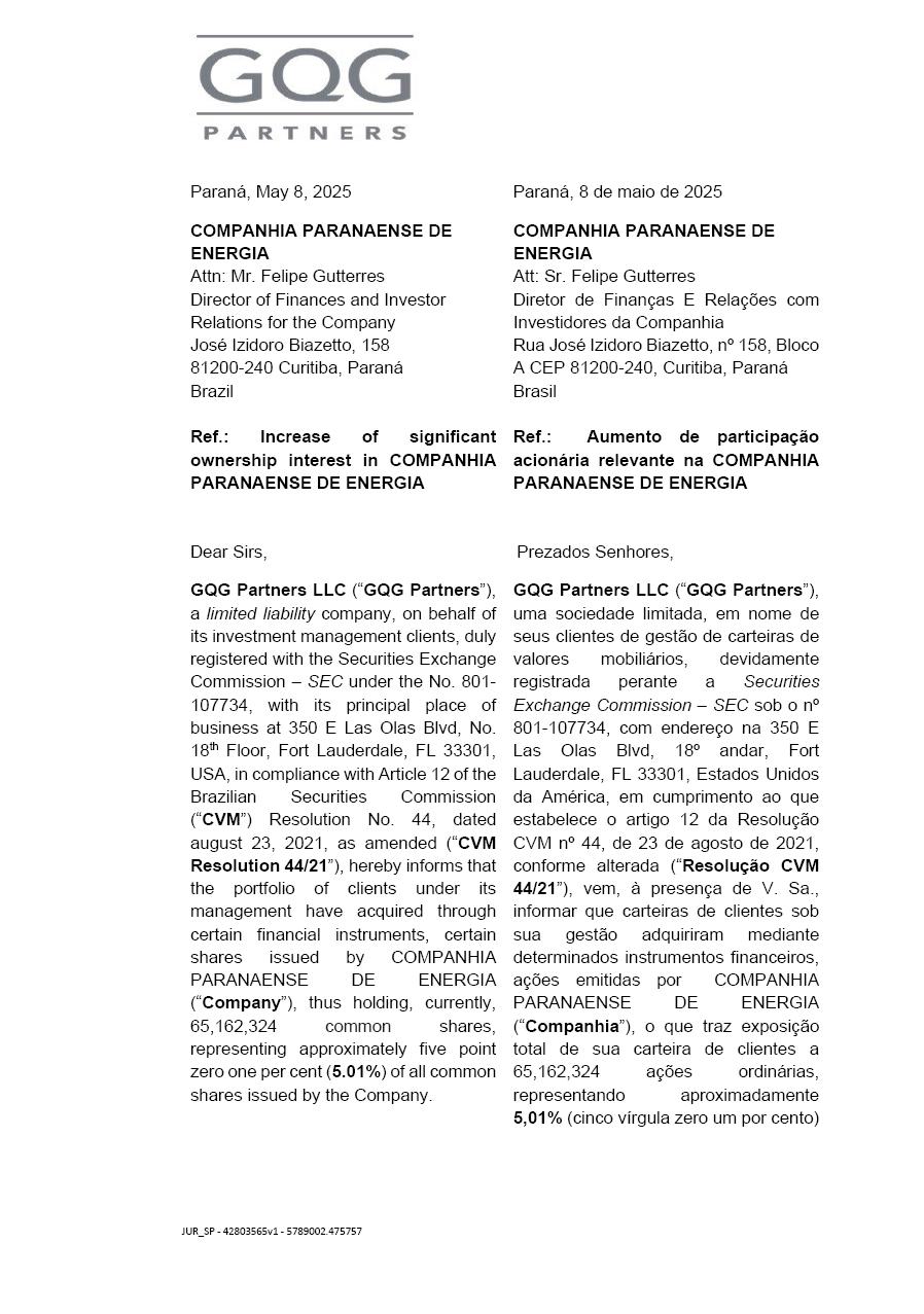 COPEL (“Company”) hereby informs its shareholders and the market in general that, in compliance with CVM Resolution No. 44/2021, as amended by CVM Resolution No. 60/2022, it received information from GQG Partners LLC. (“GQG”) that, through the portfolios managed by GQG, it increased its shareholding to 65,162,324 common shares, representing 5.01% of the total common shares issued by the Company, as per the correspondence below.