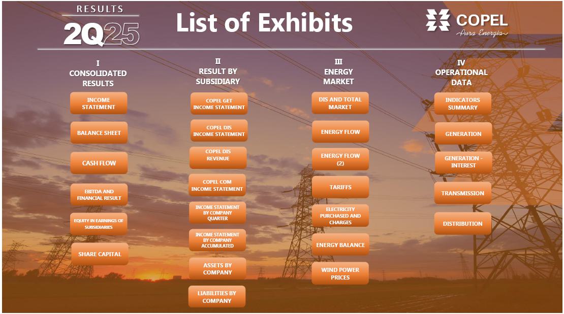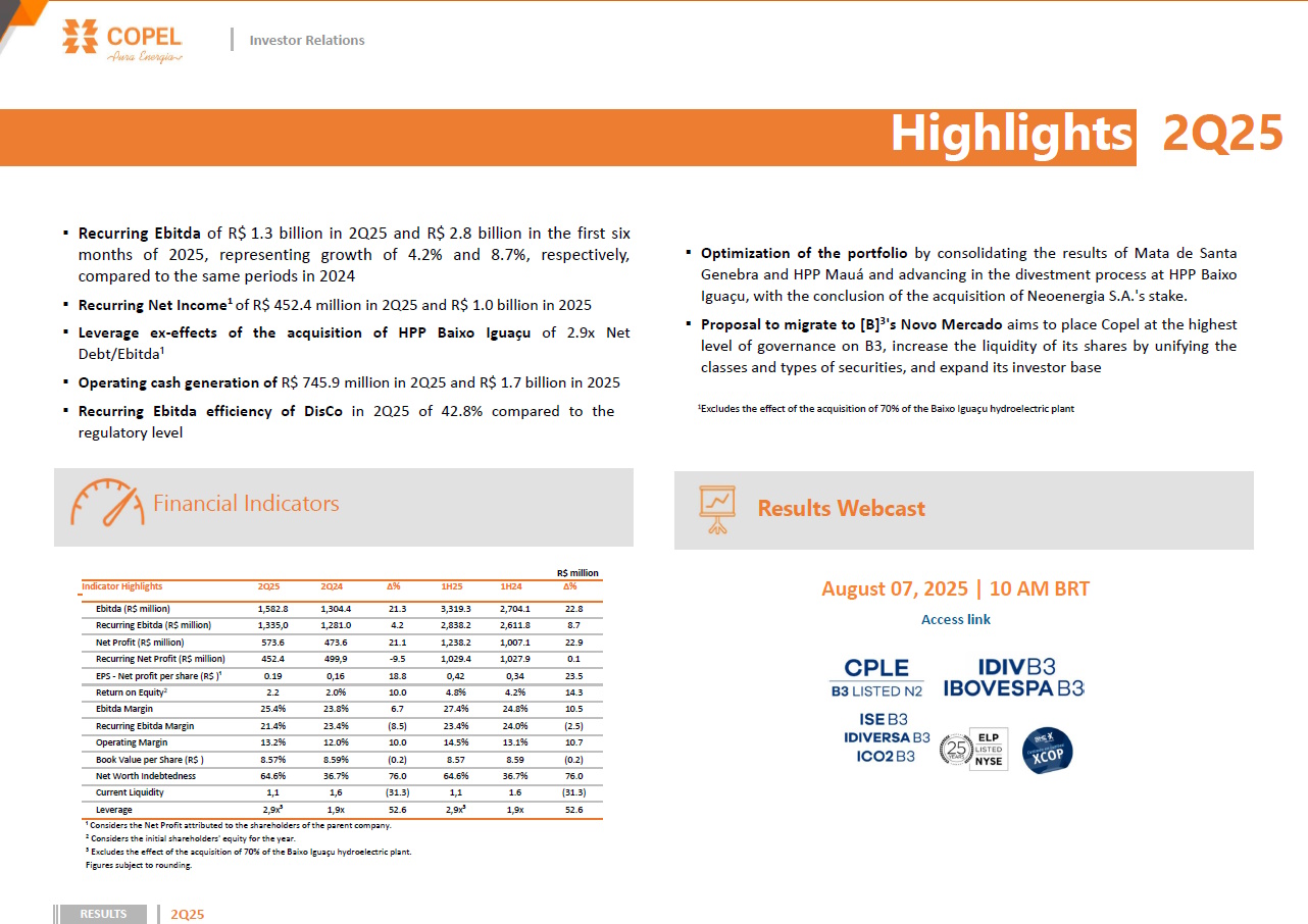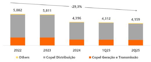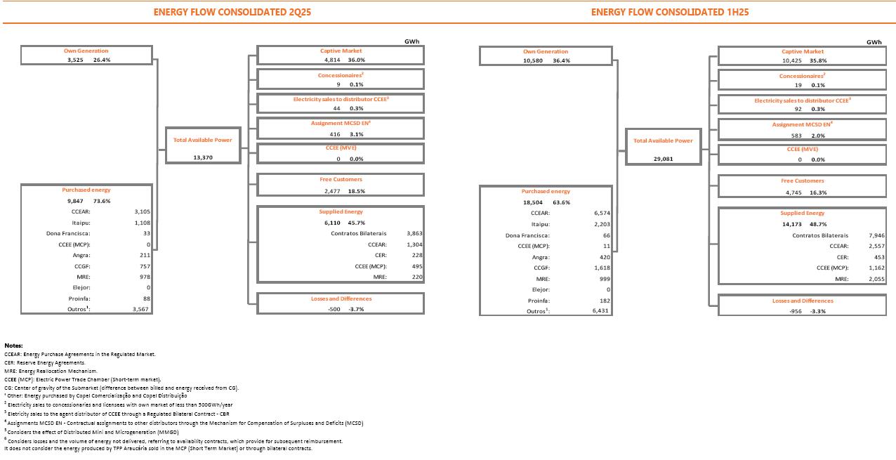 The consolidated result is made up of Copel (Holding), Copel Geração e Transmissão (GenCo), Copel Distribuição (DisCo), Copel Comercialização (TradeCo) and other equity holdings[1] . The following analyses refer to the second quarter of 2025 (2Q25) compared to the same period in 2024 (2Q24) and, where applicable, to the accumulated periods of the first six months of 2024 and 2025 (1H24 and 1H25, respectively).
