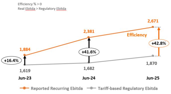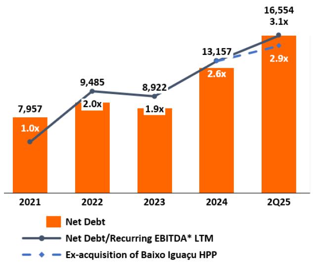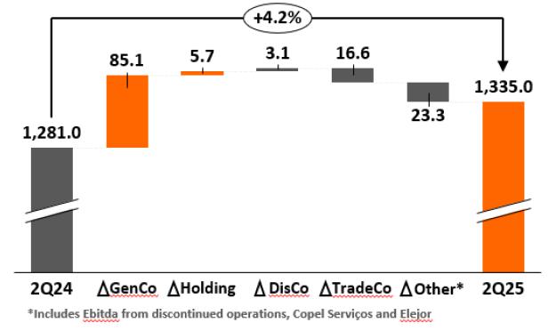 Copel Recurring Ebitda[2] amounted R$ 1,335.0 million in 2Q25, 4.2% higher than the R$ 1,281.0 million recorded in 2Q24, reflecting the good performance and resilience of our assets and the Company's operational and commercial efficiency. GenCo and TradeCo accounted for approximately 58.4% of this result, while DisCo accounted for 42.6%.[3]