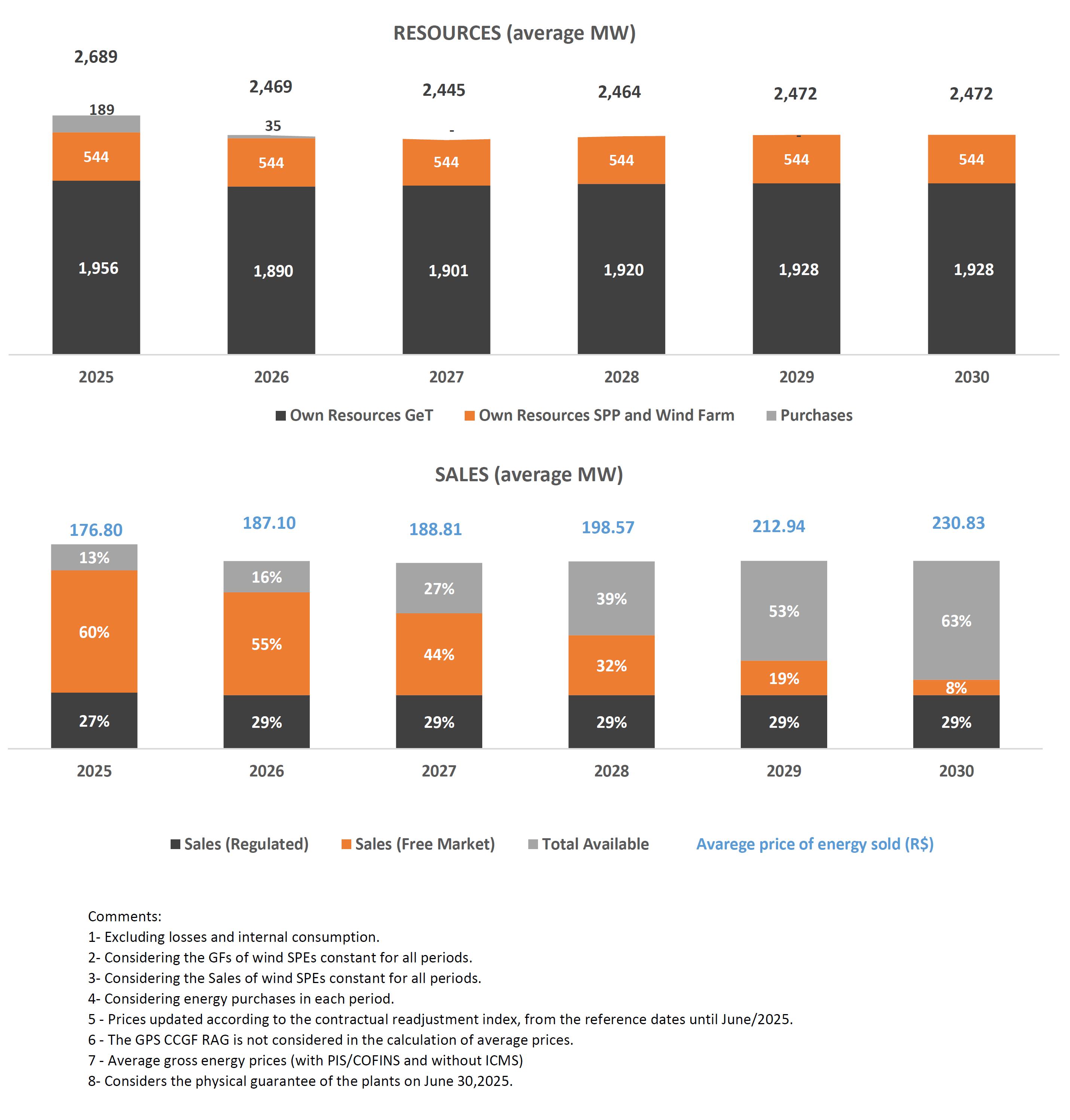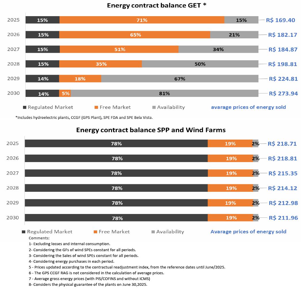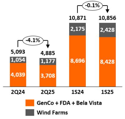 (i)GenCo's Ebitda, which grew by 12.6% (+R$ 85.1 million) compared to 2Q24, totaling R$ 761.4 million, mainly because of the following factors: i. an increase of R$ 45.4 million, due to better results in transactions carried out on the short-term market; ii. an increase of 17.2% in wind power generation caused by a wind volume above certification, enabling a lower deviation of R$ 18.9 million (-45.8% compared to 2Q24), despite the higher curtailment between periods (12.1% vs. 7.6% in 2Q24); iii. R$ 16.9 million increase in revenue from the availability of the electricity grid, explained mainly by the incorporation of the Mata de Santa Genebra S.A. (MSG) transmission company; and iv. Ebitda from discontinued operations, which was negative R$ 13.8 million in 2Q24, absent in 2Q25;