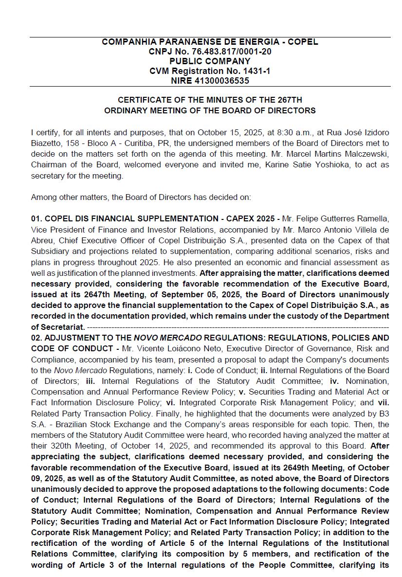 COMPANHIA PARANAENSE DE ENERGIA - COPEL CNPJ No. 76.483.817/0001-20 PUBLIC COMPANY CVM Registration No. 1431-1 NIRE 41300036535 CERTIFICATE OF THE MINUTES OF THE 267TH ORDINARY MEETING OF THE BOARD OF DIRECTORS I certify, for all intents and purposes, that on October 15, 2025, at 8:30 a.m., at Rua José Izidoro Biazetto, 158 - Bloco A - Curitiba, PR, the undersigned members of the Board of Directors met to decide on the matters set forth on the agenda of this meeting. Mr. Marcel Martins Malczewski, Chairman of the Board, welcomed everyone and invited me, Karine Satie Yoshioka, to act as secretary for the meeting. Among other matters, the Board of Directors has decided on: 01. COPEL DIS FINANCIAL SUPPLEMENTATION - CAPEX 2025 - Mr. Felipe Gutterres Ramella, Vice President of Finance and Investor Relations, accompanied by Mr. Marco Antonio Villela de Abreu, Chief Executive Officer of Copel Distribuição S.A., presented data on the Capex of that Subsidiary and projections related to supplementation, comparing additional scenarios, risks and plans in progress throughout 2025. He also presented an economic and financial assessment as well as justification of the planned investments. After appraising the matter, clarifications deemed necessary provided, considering the favorable recommendation of the Executive Board, issued at its 2647th Meeting, of September 05, 2025, the Board of Directors unanimously decided to approve the financial supplementation to the Capex of Copel Distribuição S.A., as recorded in the documentation provided, which remains under the custody of the Department of Secretariat. --------------------------------------------------------------------------------------------------------------- 02. ADJUSTMENT TO THE NOVO MERCADO REGULATIONS: REGULATIONS, POLICIES AND CODE OF CONDUCT - Mr. Vicente Loiácono Neto, Executive Director of Governance, Risk and Compliance, accompanied by his team, presented a proposal to adapt the Company's documents to the Novo Mercado Regulations, namely: i. Code of Conduct; ii. Internal Regulations of the Board of Directors; iii. Internal Regulations of the Statutory Audit Committee; iv. Nomination, Compensation and Annual Performance Review Policy; v. Securities Trading and Material Act or Fact Information Disclosure Policy; vi. Integrated Corporate Risk Management Policy; and vii. Related Party Transaction Policy. Finally, he highlighted that the documents were analyzed by B3 S.A. - Brazilian Stock Exchange and the Company’s areas responsible for each topic. Then, the members of the Statutory Audit Committee were heard, who recorded having analyzed the matter at their 320th Meeting, of October 14, 2025, and recommended its approval to this Board. After appreciating the subject, clarifications deemed necessary provided, and considering the favorable recommendation of the Executive Board, issued at its 2649th Meeting, of October 09, 2025, as well as of the Statutory Audit Committee, as noted above, the Board of Directors unanimously decided to approve the proposed adaptations to the following documents: Code of Conduct; Internal Regulations of the Board of Directors; Internal Regulations of the Statutory Audit Committee; Nomination, Compensation and Annual Performance Review Policy; Securities Trading and Material Act or Fact Information Disclosure Policy; Integrated Corporate Risk Management Policy; and Related Party Transaction Policy; in addition to the rectification of the wording of Article 5 of the Internal Regulations of the Institutional Relations Committee, clarifying its composition by 5 members, and rectification of the wording of Article 3 of the Internal regulations of the People Committee, clarifying its