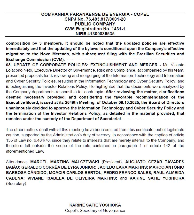 composition by 3 members. It should be noted that the updated policies are effective immediately and that the updating of the bylaws is conditional upon the Company's effective migration to the Novo Mercado, with subsequent filing with the Brazilian Securities and Exchange Commission (CVM). --------------------------------------------------------------------------------------- 03. UPDATE OF CORPORATE POLICIES: EXTINGUISHMENT AND MERGER - Mr. Vicente Loiácono Neto, Executive Director of Governance, Risk and Compliance, accompanied by his team, presented proposals for: i. reviewing and mergerging of the Information Technology and Information and Cyber Security Policies, resulting in the Information Technology and Cyber Security Policy; and ii. extinguishing the Investor Relations Policy. He highlighted that the documents were analyzed by the Company departments responsible for each topic. After reviewing the matter, clarifications deemed necessary provided, and considering the favorable recommendation of the Executive Board, issued at its 2649th Meeting, of October 09.10.2025, the Board of Directors unanimously decided to approve the Information Technology and Cyber Security Policy and the termination of the Investor Relations Policy, as detailed in the material provided, that remains under the custody of the Department of Secretariat. --------------------------------------------- The other matters dealt with at this meeting have been omitted from this certificate, out of legitimate caution, supported by the Administration’s duty of secrecy, in accordance with the caption of article 155 of Law no. 6.404/76, since they relate to interests that are merely internal to the Company, and therefore fall outside the scope of the rule contained in paragraph 1 of article 142 of the aforementioned Law. Attendance: MARCEL MARTINS MALCZEWSKI (President); AUGUSTO CEZAR TAVARES BAIÃO; GERALDO CORRÊA DE LYRA JUNIOR; JACILDO LARA MARTINS; MARCO ANTÔNIO BARBOSA CÂNDIDO; MOACIR CARLOS BERTOL; PEDRO FRANCO SALES; RAUL ALMEIDA CADENA; VIVIANE ISABELA DE OLIVEIRA MARTINS; and KARINE SATIE YOSHIOKA (Secretary). KARINE SATIE YOSHIOKA Copel’s Secretary of Governance