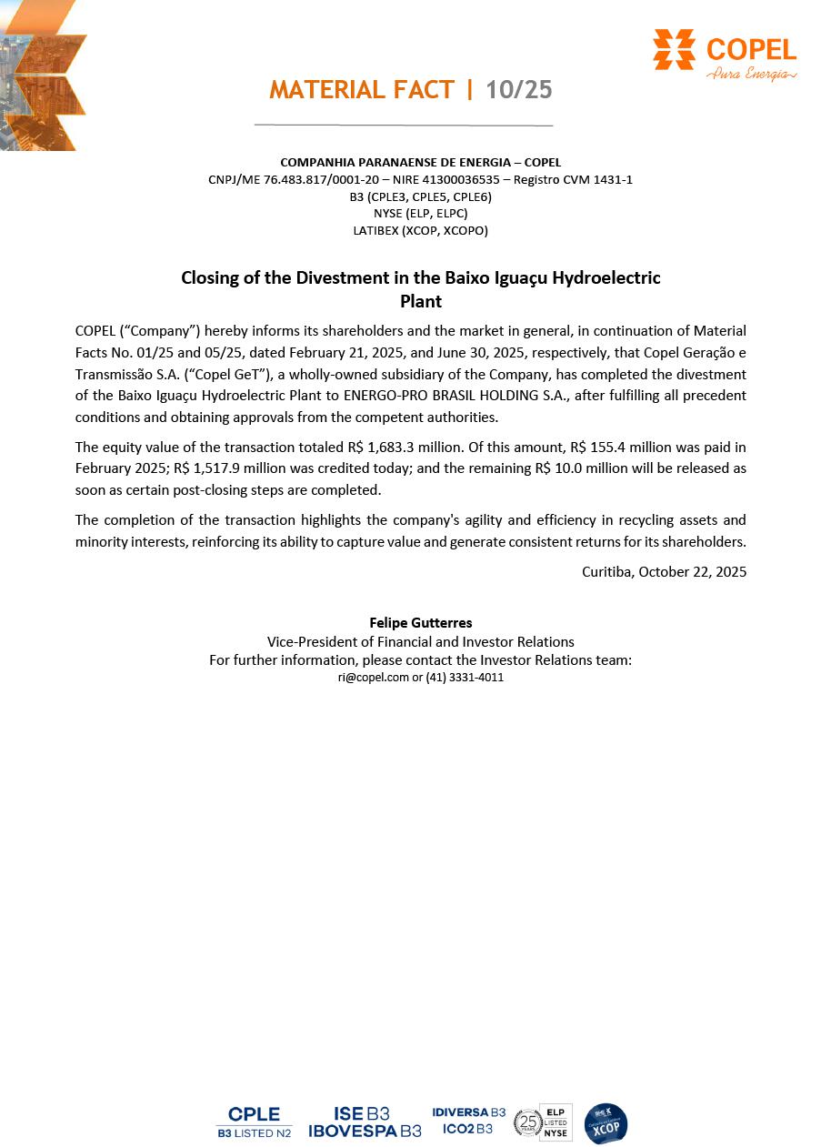 MATERIAL FACT | 10/25 COMPANHIA PARANAENSE DE ENERGIA – COPEL CNPJ/ME 76.483.817/0001-20 – NIRE 41300036535 – Registro CVM 1431-1 B3 (CPLE3, CPLE5, CPLE6) NYSE (ELP, ELPC) LATIBEX (XCOP, XCOPO) Closing of the Divestment in the Baixo Iguaçu Hydroelectric Plant COPEL (“Company”) hereby informs its shareholders and the market in general, in continuation of Material Facts No. 01/25 and 05/25, dated February 21, 2025, and June 30, 2025, respectively, that Copel Geração e Transmissão S.A. (“Copel GeT”), a wholly-owned subsidiary of the Company, has completed the divestment of the Baixo Iguaçu Hydroelectric Plant to ENERGO-PRO BRASIL HOLDING S.A., after fulfilling all precedent conditions and obtaining approvals from the competent authorities. The equity value of the transaction totaled R$ 1,683.3 million. Of this amount, R$ 155.4 million was paid in February 2025; R$ 1,517.9 million was credited today; and the remaining R$ 10.0 million will be released as soon as certain post-closing steps are completed. The completion of the transaction highlights the company's agility and efficiency in recycling assets and minority interests, reinforcing its ability to capture value and generate consistent returns for its shareholders. Curitiba, October 22, 2025 Felipe Gutterres Vice-President of Financial and Investor Relations For further information, please contact the Investor Relations team: ri@copel.com or (41) 3331-4011
