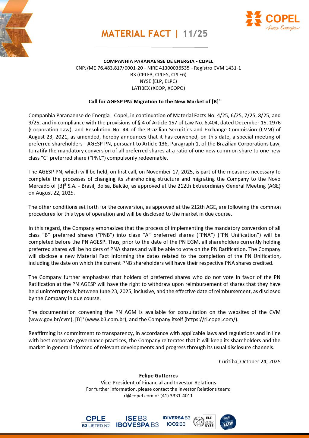 MATERIAL FACT | 11/25 COMPANHIA PARANAENSE DE ENERGIA - COPEL CNPJ/ME 76.483.817/0001-20 - NIRE 41300036535 - Registro CVM 1431-1 B3 (CPLE3, CPLE5, CPLE6) NYSE (ELP, ELPC) LATIBEX (XCOP, XCOPO) Call for AGESP PN: Migration to the New Market of [B]³ Companhia Paranaense de Energia - Copel, in continuation of Material Facts No. 4/25, 6/25, 7/25, 8/25, and 9/25, and in compliance with the provisions of § 4 of Article 157 of Law No. 6,404, dated December 15, 1976 (Corporation Law), and Resolution No. 44 of the Brazilian Securities and Exchange Commission (CVM) of August 23, 2021, as amended, hereby announces that it has convened, on this date, a special meeting of preferred shareholders - AGESP PN, pursuant to Article 136, Paragraph 1, of the Brazilian Corporations Law, to ratify the mandatory conversion of all preferred shares at a ratio of one new common share to one new class “C” preferred share (“PNC”) compulsorily redeemable. The AGESP PN, which will be held, on first call, on November 17, 2025, is part of the measures necessary to complete the processes of changing its shareholding structure and migrating the Company to the Novo Mercado of [B]³ S.A. - Brasil, Bolsa, Balcão, as approved at the 212th Extraordinary General Meeting (AGE) on August 22, 2025. The other conditions set forth for the conversion, as approved at the 212th AGE, are following the common procedures for this type of operation and will be disclosed to the market in due course. In this regard, the Company emphasizes that the process of implementing the mandatory conversion of all class “B” preferred shares (“PNB”) into class “A” preferred shares (“PNA”) (“PN Unification”) will be completed before the PN AGESP. Thus, prior to the date of the PN EGM, all shareholders currently holding preferred shares will be holders of PNA shares and will be able to vote on the PN Ratification. The Company will disclose a new Material Fact informing the dates related to the completion of the PN Unification, including the date on which the current PNB shareholders will have their respective PNA shares credited. The Company further emphasizes that holders of preferred shares who do not vote in favor of the PN Ratification at the PN AGESP will have the right to withdraw upon reimbursement of shares that they have held uninterruptedly between June 23, 2025, inclusive, and the effective date of reimbursement, as disclosed by the Company in due course. The documentation convening the PN AGM is available for consultation on the websites of the CVM (www.gov.br/cvm), [B]³ (www.b3.com.br), and the Company itself (https://ri.copel.com/). Reaffirming its commitment to transparency, in accordance with applicable laws and regulations and in line with best corporate governance practices, the Company reiterates that it will keep its shareholders and the market in general informed of relevant developments and progress through its usual disclosure channels. Curitiba, October 24, 2025 Felipe Gutterres Vice-President of Financial and Investor Relations For further information, please contact the Investor Relations team: ri@copel.com or (41) 3331-4011