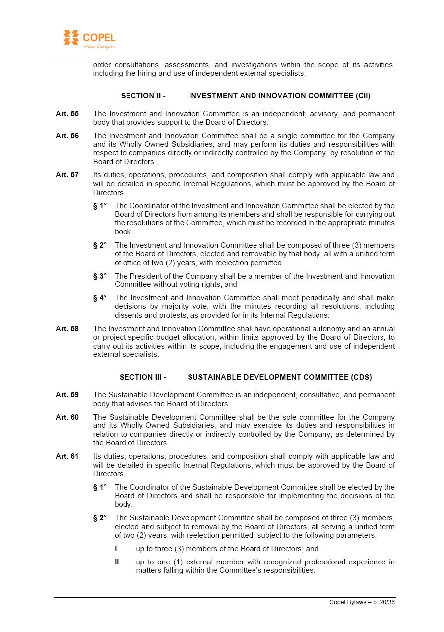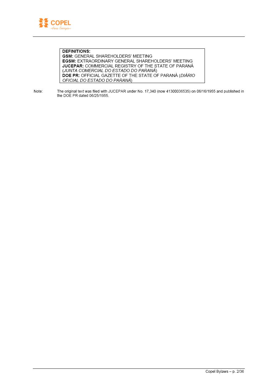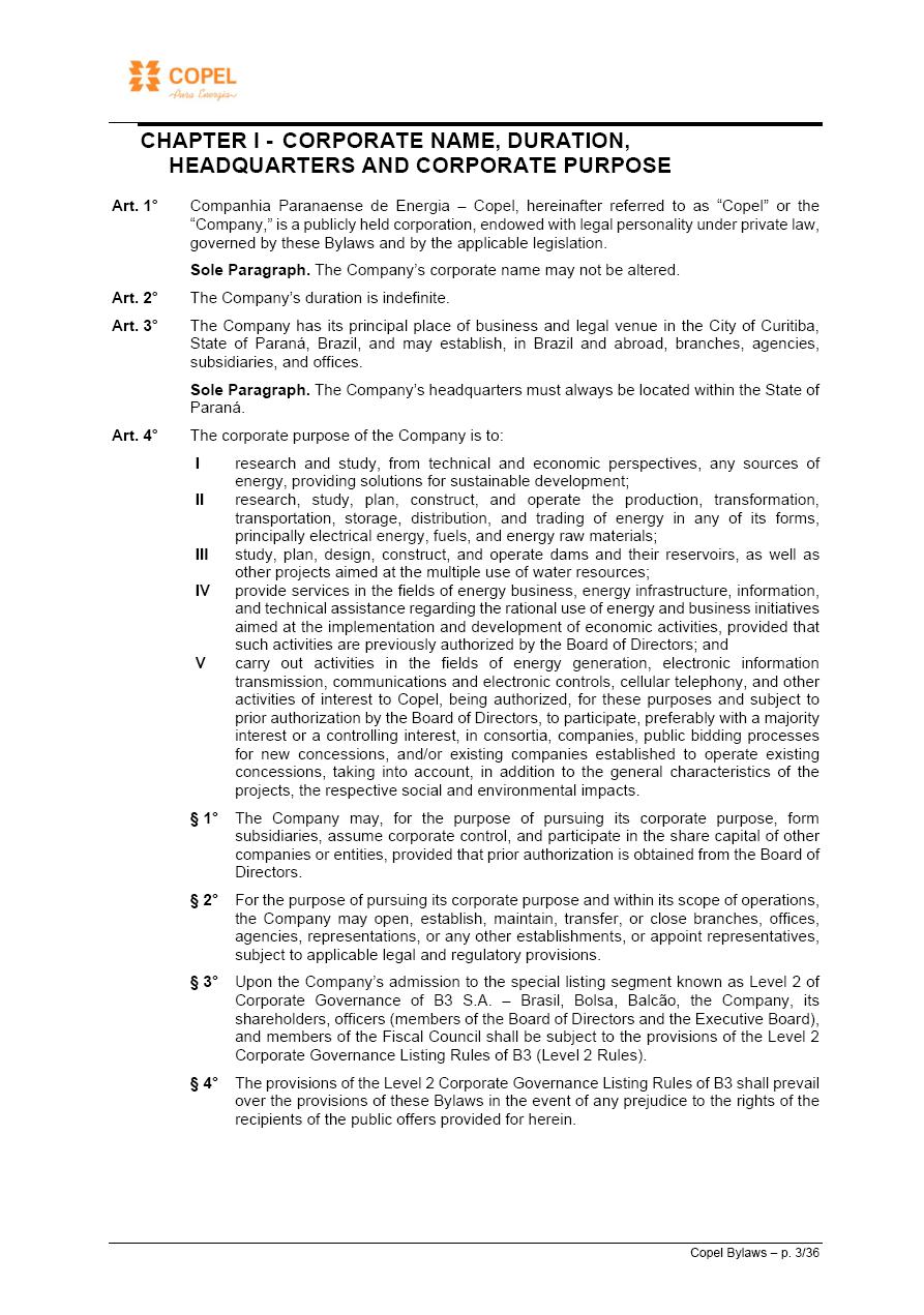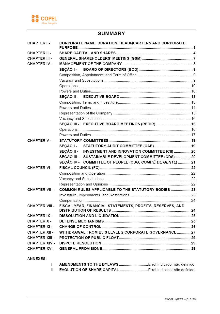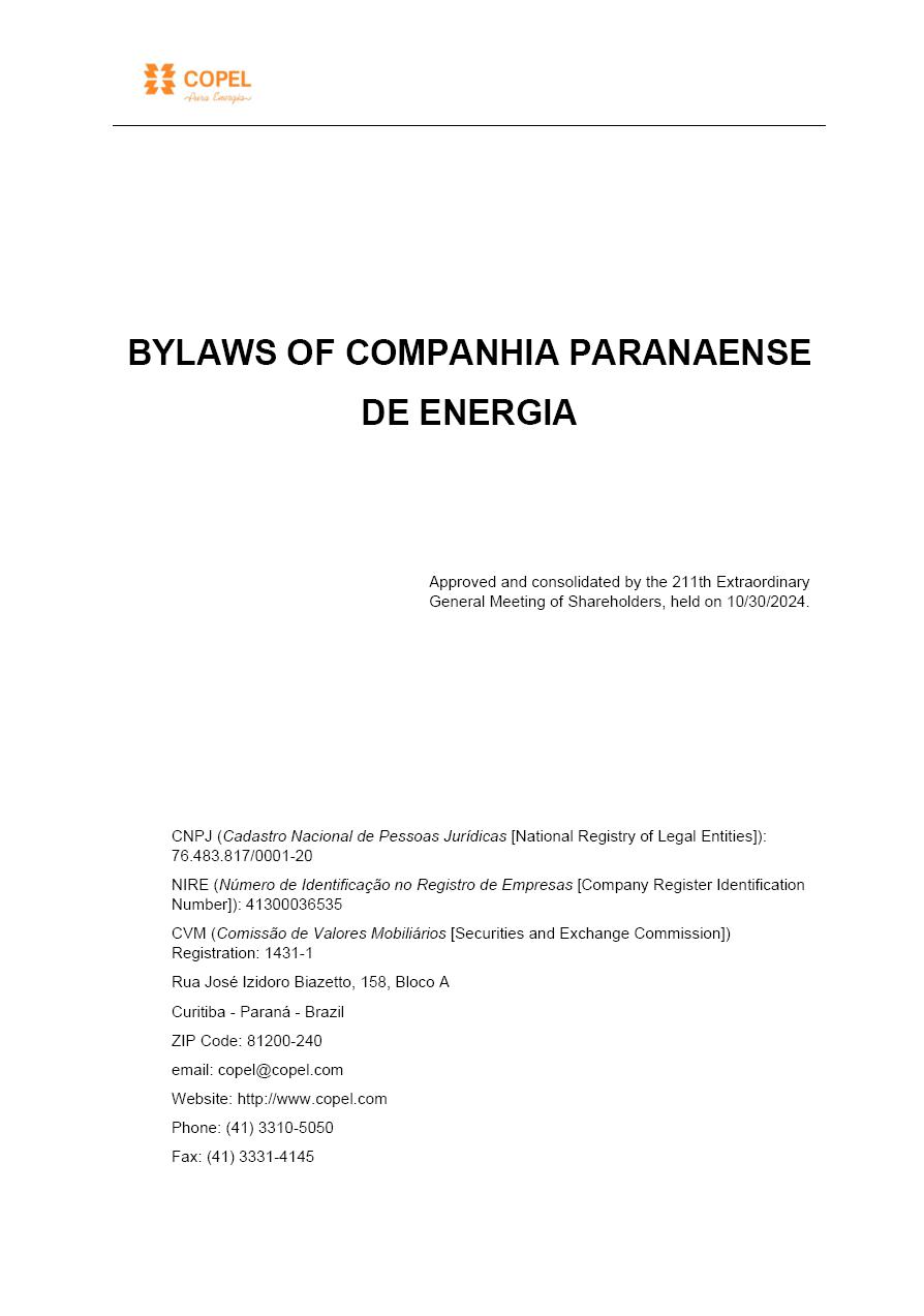 BYLAWS OF COMPANHIA PARANAENSE DE ENERGIA Approved and consolidated by the 211th Extraordinary General Meeting of Shareholders, held on 10/30/2024. CNPJ (Cadastro Nacional de Pessoas Jurídicas [National Registry of Legal Entities]): 76.483.817/0001-20 NIRE (Número de Identificação no Registro de Empresas [Company Register Identification Number]): 41300036535 CVM (Comissão de Valores Mobiliários [Securities and Exchange Commission]) Registration: 1431-1 Rua José Izidoro Biazetto, 158, Bloco A Curitiba - Paraná - Brazil ZIP Code: 81200-240 email: copel@copel.com Website: http://www.copel.com Phone: (41) 3310-5050 Fax: (41) 3331-4145 Copel Bylaws – p. 1/36 SUMMARY CHAPTER I - CORPORATE NAME, DURATION, HEADQUARTERS AND CORPORATE PURPOSE .............................................................................................................. 3 CHAPTER II - SHARE CAPITAL AND SHARES .......................................................................... 4 CHAPTER III - GENERAL SHAREHOLDERS’ MEETING (GSM) ................................................. 7 CHAPTER IV - MANAGEMENT OF THE COMPANY .................................................................... 8 SEÇÃO I - BOARD OF DIRECTORS (BOD) .................................................... 9 Composition, Appointment, and Term of Office ..................................................... 9 Vacancy and Substitutions ..................................................................................... 9 Operations ............................................................................................................ 10 Powers and Duties ................................................................................................ 10 SEÇÃO II - EXECUTIVE BOARD .................................................................... 13 Composition, Term, and Investiture ...................................................................... 13 Powers and Duties ................................................................................................ 14 Representation of the Company ........................................................................... 15 Vacancy and Substitution ..................................................................................... 16 SEÇÃO III - EXECUTIVE BOARD MEETINGS (REDIR) ................................. 16 Operations ............................................................................................................ 16 Powers and Duties ................................................................................................ 17 CHAPTER V - STATUTORY COMMITTEES ............................................................................... 19 SEÇÃO I - STATUTORY AUDIT COMMITTEE (CAE) ................................... 19 SEÇÃO II - INVESTMENT AND INNOVATION COMMITTEE (CII) ................ 20 SEÇÃO III - SUSTAINABLE DEVELOPMENT COMMITTEE (CDS) ............... 20 SEÇÃO IV - COMMITTEE OF PEOPLE (CDG, COMITÊ DE GENTE) ............ 21 CHAPTER VI - FISCAL COUNCIL (FC) ....................................................................................... 22 Composition and Operation .................................................................................. 22 Vacancy and Substitutions ................................................................................... 22 Representation and Opinions ............................................................................... 22 CHAPTER VII - COMMON RULES APPLICABLE TO THE STATUTORY BODIES ................... 23 Investiture, Impediments, and Restrictions .......................................................... 23 Compensation ....................................................................................................... 24 CHAPTER VIII - FISCAL YEAR, FINANCIAL STATEMENTS, PROFITS, RESERVES, AND DISTRIBUTION OF RESULTS ............................................................................ 24 CHAPTER IX - DISSOLUTION AND LIQUIDATION .................................................................... 25 CHAPTER X - DEFENSE MECHANISMS ................................................................................... 25 CHAPTER XI - CHANGE OF CONTROL ..................................................................................... 26 CHAPTER XII - WITHDRAWAL FROM B3’S LEVEL 2 CORPORATE GOVERNANCE ............. 27 CHAPTER XIII - PROTECTION OF PUBLIC FLOAT ..................................................................... 29 CHAPTER XIV - DISPUTE RESOLUTION ..................................................................................... 29 CHAPTER XV - GENERAL PROVISIONS ..................................................................................... 29 ANNEXES: I AMENDMENTS TO THE BYLAWS ............................ Erro! Indicador não definido. II EVOLUTION OF SHARE CAPITAL ........................... Erro! Indicador não definido. Copel Bylaws – p. 2/36 DEFINITIONS: GSM: GENERAL SHAREHOLDERS’ MEETING EGSM: EXTRAORDINARY GENERAL SHAREHOLDERS’ MEETING JUCEPAR: COMMERCIAL REGISTRY OF THE STATE OF PARANÁ (JUNTA COMERCIAL DO ESTADO DO PARANÁ) DOE PR: OFFICIAL GAZETTE OF THE STATE OF PARANÁ (DIÁRIO OFICIAL DO ESTADO DO PARANÁ) Note: The original text was filed with JUCEPAR under No. 17,340 (now 41300036535) on 06/16/1955 and published in the DOE PR dated 06/25/1955. Copel Bylaws – p. 3/36 CHAPTER I - CORPORATE NAME, DURATION, HEADQUARTERS AND CORPORATE PURPOSE Art. 1° Companhia Paranaense de Energia – Copel, hereinafter referred to as “Copel” or the “Company,” is a publicly held corporation, endowed with legal personality under private law, governed by these Bylaws and by the applicable legislation. Sole Paragraph. The Company’s corporate name may not be altered. Art. 2° The Company’s duration is indefinite. Art. 3° The Company has its principal place of business and legal venue in the City of Curitiba, State of Paraná, Bra
