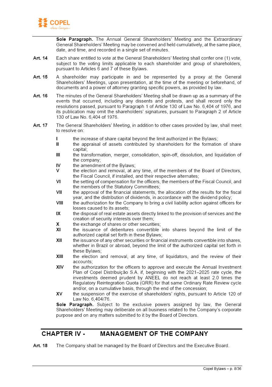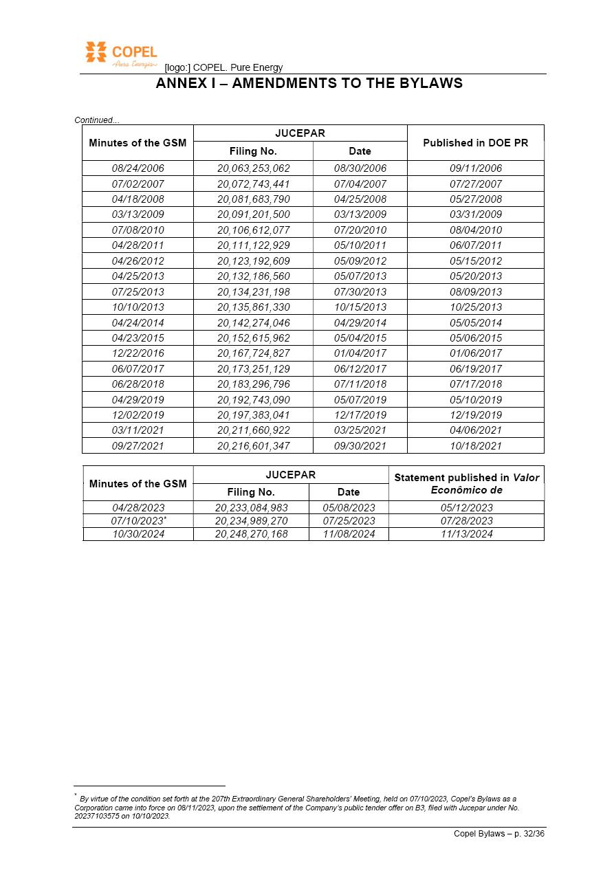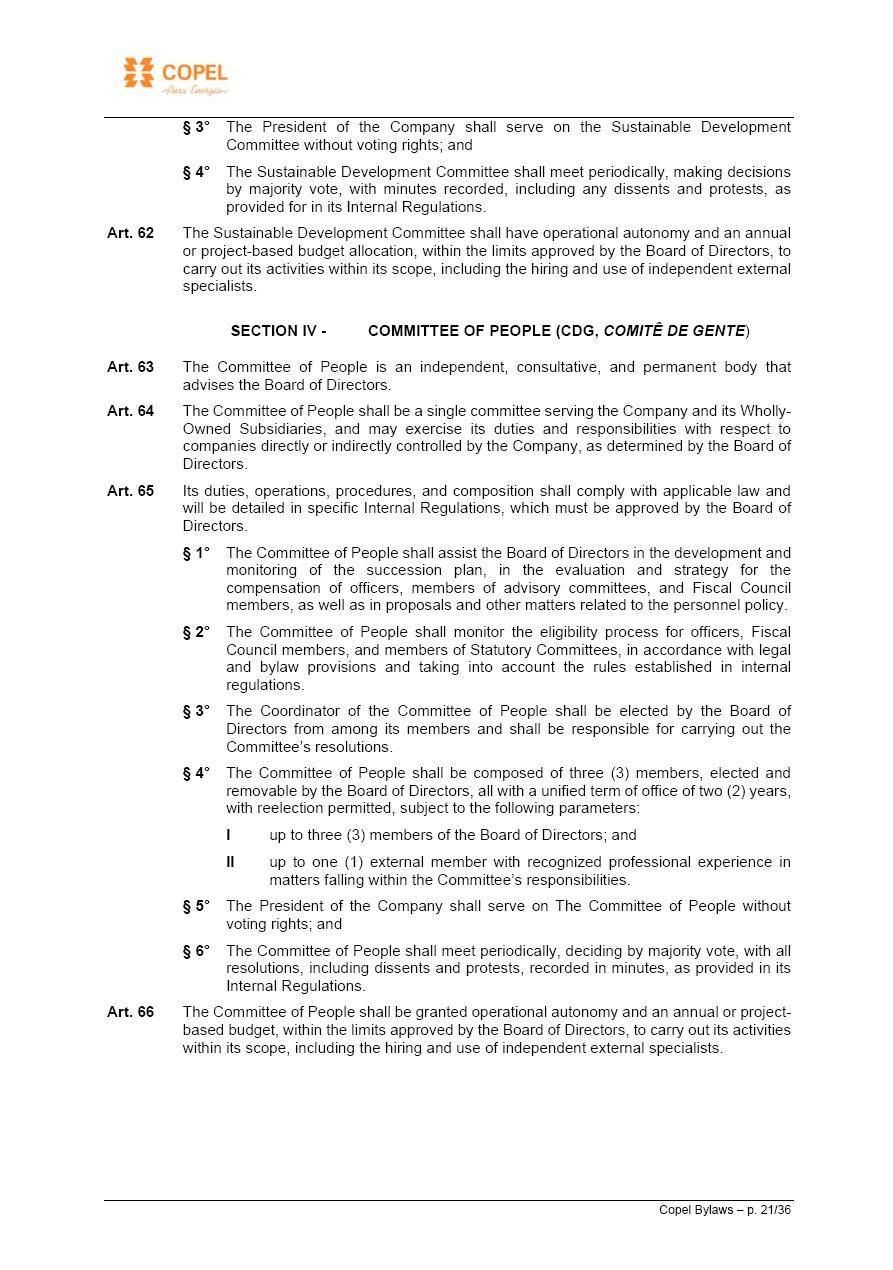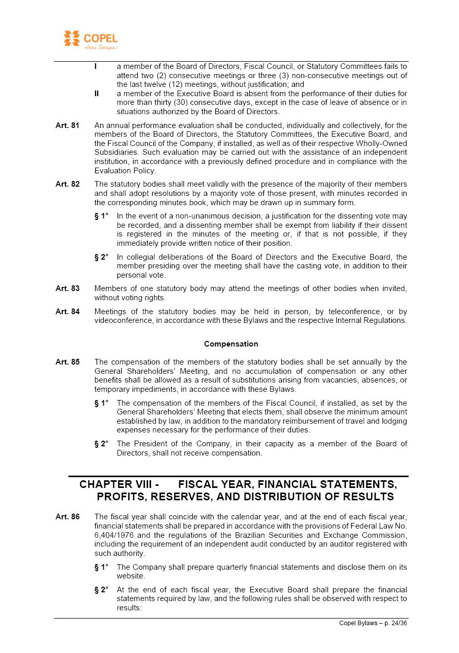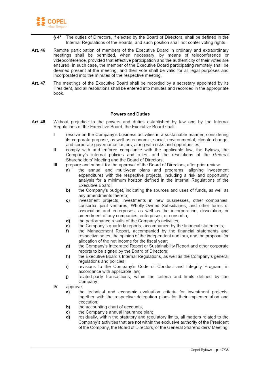 BYLAWS OF COMPANHIA PARANAENSE DE ENERGIA Approved and consolidated by the 211th Extraordinary General Meeting of Shareholders, held on 10/30/2024. CNPJ (Cadastro Nacional de Pessoas Jurídicas [National Registry of Legal Entities]): 76.483.817/0001-20 NIRE (Número de Identificação no Registro de Empresas [Company Register Identification Number]): 41300036535 CVM (Comissão de Valores Mobiliários [Securities and Exchange Commission]) Registration: 1431-1 Rua José Izidoro Biazetto, 158, Bloco A Curitiba - Paraná - Brazil ZIP Code: 81200-240 email: copel@copel.com Website: http://www.copel.com Phone: (41) 3310-5050 Fax: (41) 3331-4145 Copel Bylaws – p. 1/36 SUMMARY CHAPTER I - CORPORATE NAME, DURATION, HEADQUARTERS AND CORPORATE PURPOSE .............................................................................................................. 3 CHAPTER II - SHARE CAPITAL AND SHARES .......................................................................... 4 CHAPTER III - GENERAL SHAREHOLDERS’ MEETING (GSM) ................................................. 7 CHAPTER IV - MANAGEMENT OF THE COMPANY .................................................................... 8 SEÇÃO I - BOARD OF DIRECTORS (BOD) .................................................... 9 Composition, Appointment, and Term of Office ..................................................... 9 Vacancy and Substitutions ..................................................................................... 9 Operations ............................................................................................................ 10 Powers and Duties ................................................................................................ 10 SEÇÃO II - EXECUTIVE BOARD .................................................................... 13 Composition, Term, and Investiture ...................................................................... 13 Powers and Duties ................................................................................................ 14 Representation of the Company ........................................................................... 15 Vacancy and Substitution ..................................................................................... 16 SEÇÃO III - EXECUTIVE BOARD MEETINGS (REDIR) ................................. 16 Operations ............................................................................................................ 16 Powers and Duties ................................................................................................ 17 CHAPTER V - STATUTORY COMMITTEES ............................................................................... 19 SEÇÃO I - STATUTORY AUDIT COMMITTEE (CAE) ................................... 19 SEÇÃO II - INVESTMENT AND INNOVATION COMMITTEE (CII) ................ 20 SEÇÃO III - SUSTAINABLE DEVELOPMENT COMMITTEE (CDS) ............... 20 SEÇÃO IV - COMMITTEE OF PEOPLE (CDG, COMITÊ DE GENTE) ............ 21 CHAPTER VI - FISCAL COUNCIL (FC) ....................................................................................... 22 Composition and Operation .................................................................................. 22 Vacancy and Substitutions ................................................................................... 22 Representation and Opinions ............................................................................... 22 CHAPTER VII - COMMON RULES APPLICABLE TO THE STATUTORY BODIES ................... 23 Investiture, Impediments, and Restrictions .......................................................... 23 Compensation ....................................................................................................... 24 CHAPTER VIII - FISCAL YEAR, FINANCIAL STATEMENTS, PROFITS, RESERVES, AND DISTRIBUTION OF RESULTS ............................................................................ 24 CHAPTER IX - DISSOLUTION AND LIQUIDATION .................................................................... 25 CHAPTER X - DEFENSE MECHANISMS ................................................................................... 25 CHAPTER XI - CHANGE OF CONTROL ..................................................................................... 26 CHAPTER XII - WITHDRAWAL FROM B3’S LEVEL 2 CORPORATE GOVERNANCE ............. 27 CHAPTER XIII - PROTECTION OF PUBLIC FLOAT ..................................................................... 29 CHAPTER XIV - DISPUTE RESOLUTION ..................................................................................... 29 CHAPTER XV - GENERAL PROVISIONS ..................................................................................... 29 ANNEXES: I AMENDMENTS TO THE BYLAWS ............................ Erro! Indicador não definido. II EVOLUTION OF SHARE CAPITAL ........................... Erro! Indicador não definido. Copel Bylaws – p. 2/36 DEFINITIONS: GSM: GENERAL SHAREHOLDERS’ MEETING EGSM: EXTRAORDINARY GENERAL SHAREHOLDERS’ MEETING JUCEPAR: COMMERCIAL REGISTRY OF THE STATE OF PARANÁ (JUNTA COMERCIAL DO ESTADO DO PARANÁ) DOE PR: OFFICIAL GAZETTE OF THE STATE OF PARANÁ (DIÁRIO OFICIAL DO ESTADO DO PARANÁ) Note: The original text was filed with JUCEPAR under No. 17,340 (now 41300036535) on 06/16/1955 and published in the DOE PR dated 06/25/1955. Copel Bylaws – p. 3/36 CHAPTER I - CORPORATE NAME, DURATION, HEADQUARTERS AND CORPORATE PURPOSE Art. 1° Companhia Paranaense de Energia – Copel, hereinafter referred to as “Copel” or the “Company,” is a publicly held corporation, endowed with legal personality under private law, governed by these Bylaws and by the applicable legislation. Sole Paragraph. The Company’s corporate name may not be altered. Art. 2° The Company’s duration is indefinite. Art. 3° The Company has its principal place of business and legal venue in the City of Curitiba, State of Paraná, Bra