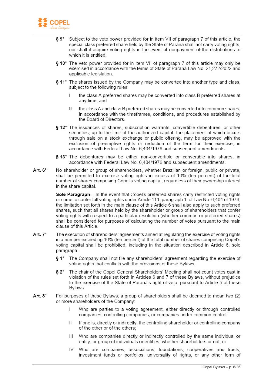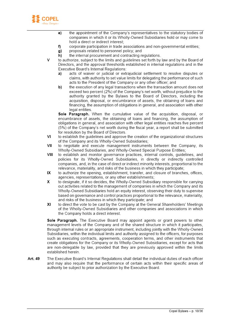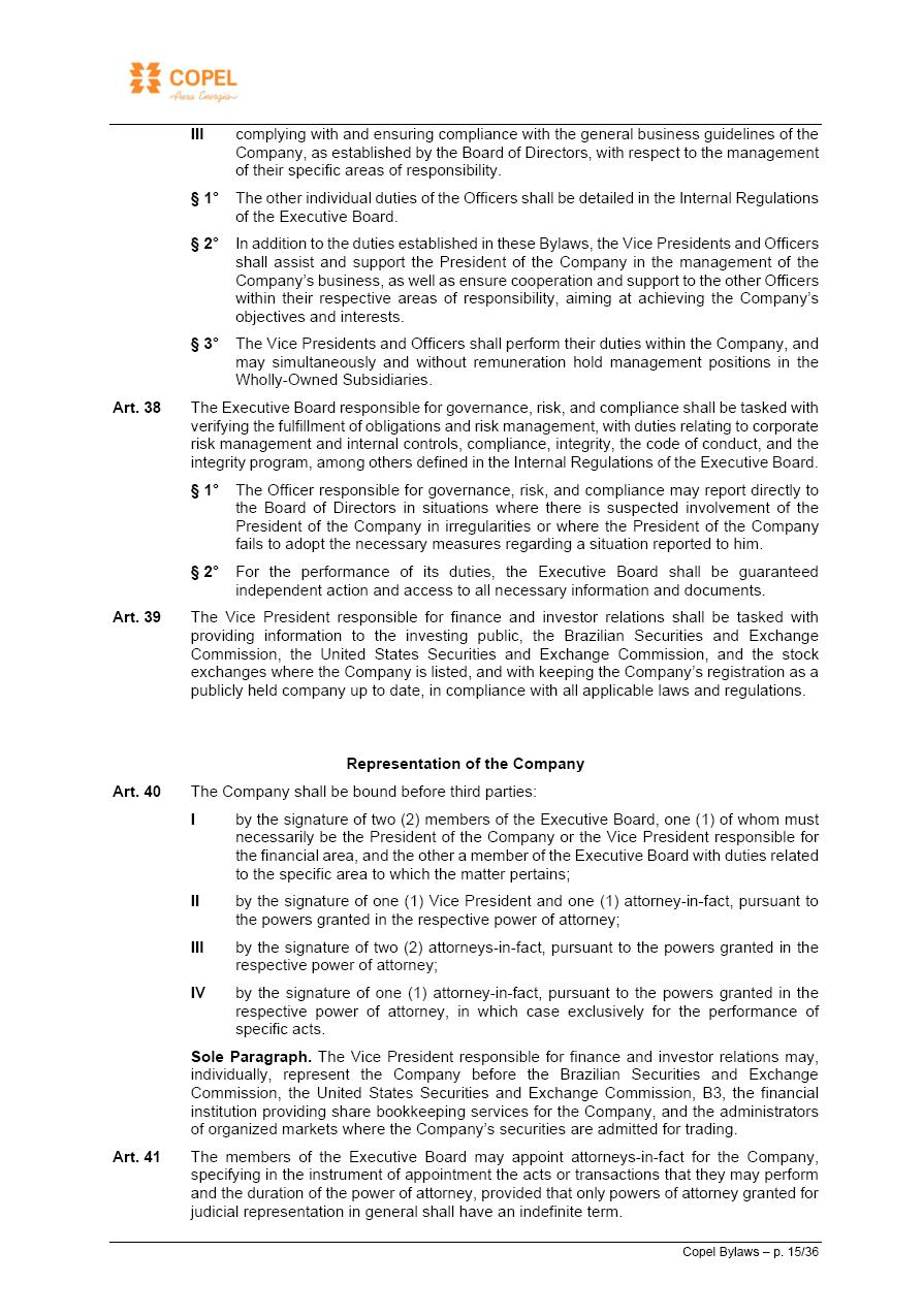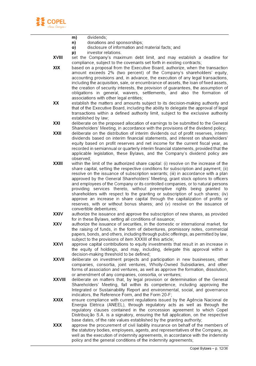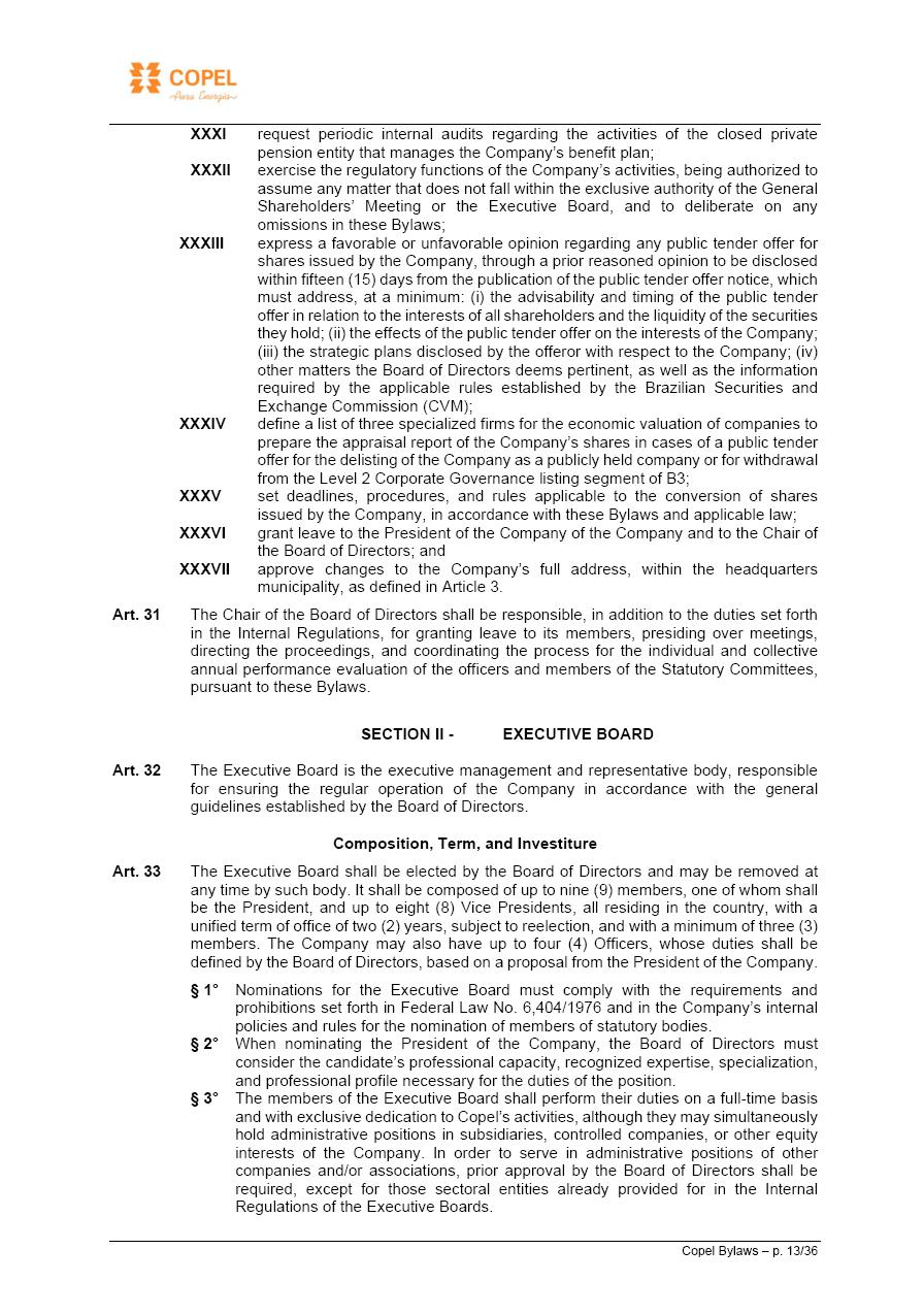 BYLAWS OF COMPANHIA PARANAENSE DE ENERGIA Approved and consolidated by the 211th Extraordinary General Meeting of Shareholders, held on 10/30/2024. CNPJ (Cadastro Nacional de Pessoas Jurídicas [National Registry of Legal Entities]): 76.483.817/0001-20 NIRE (Número de Identificação no Registro de Empresas [Company Register Identification Number]): 41300036535 CVM (Comissão de Valores Mobiliários [Securities and Exchange Commission]) Registration: 1431-1 Rua José Izidoro Biazetto, 158, Bloco A Curitiba - Paraná - Brazil ZIP Code: 81200-240 email: copel@copel.com Website: http://www.copel.com Phone: (41) 3310-5050 Fax: (41) 3331-4145 Copel Bylaws – p. 1/36 SUMMARY CHAPTER I - CORPORATE NAME, DURATION, HEADQUARTERS AND CORPORATE PURPOSE .............................................................................................................. 3 CHAPTER II - SHARE CAPITAL AND SHARES .......................................................................... 4 CHAPTER III - GENERAL SHAREHOLDERS’ MEETING (GSM) ................................................. 7 CHAPTER IV - MANAGEMENT OF THE COMPANY .................................................................... 8 SEÇÃO I - BOARD OF DIRECTORS (BOD) .................................................... 9 Composition, Appointment, and Term of Office ..................................................... 9 Vacancy and Substitutions ..................................................................................... 9 Operations ............................................................................................................ 10 Powers and Duties ................................................................................................ 10 SEÇÃO II - EXECUTIVE BOARD .................................................................... 13 Composition, Term, and Investiture ...................................................................... 13 Powers and Duties ................................................................................................ 14 Representation of the Company ........................................................................... 15 Vacancy and Substitution ..................................................................................... 16 SEÇÃO III - EXECUTIVE BOARD MEETINGS (REDIR) ................................. 16 Operations ............................................................................................................ 16 Powers and Duties ................................................................................................ 17 CHAPTER V - STATUTORY COMMITTEES ............................................................................... 19 SEÇÃO I - STATUTORY AUDIT COMMITTEE (CAE) ................................... 19 SEÇÃO II - INVESTMENT AND INNOVATION COMMITTEE (CII) ................ 20 SEÇÃO III - SUSTAINABLE DEVELOPMENT COMMITTEE (CDS) ............... 20 SEÇÃO IV - COMMITTEE OF PEOPLE (CDG, COMITÊ DE GENTE) ............ 21 CHAPTER VI - FISCAL COUNCIL (FC) ....................................................................................... 22 Composition and Operation .................................................................................. 22 Vacancy and Substitutions ................................................................................... 22 Representation and Opinions ............................................................................... 22 CHAPTER VII - COMMON RULES APPLICABLE TO THE STATUTORY BODIES ................... 23 Investiture, Impediments, and Restrictions .......................................................... 23 Compensation ....................................................................................................... 24 CHAPTER VIII - FISCAL YEAR, FINANCIAL STATEMENTS, PROFITS, RESERVES, AND DISTRIBUTION OF RESULTS ............................................................................ 24 CHAPTER IX - DISSOLUTION AND LIQUIDATION .................................................................... 25 CHAPTER X - DEFENSE MECHANISMS ................................................................................... 25 CHAPTER XI - CHANGE OF CONTROL ..................................................................................... 26 CHAPTER XII - WITHDRAWAL FROM B3’S LEVEL 2 CORPORATE GOVERNANCE ............. 27 CHAPTER XIII - PROTECTION OF PUBLIC FLOAT ..................................................................... 29 CHAPTER XIV - DISPUTE RESOLUTION ..................................................................................... 29 CHAPTER XV - GENERAL PROVISIONS ..................................................................................... 29 ANNEXES: I AMENDMENTS TO THE BYLAWS ............................ Erro! Indicador não definido. II EVOLUTION OF SHARE CAPITAL ........................... Erro! Indicador não definido. Copel Bylaws – p. 2/36 DEFINITIONS: GSM: GENERAL SHAREHOLDERS’ MEETING EGSM: EXTRAORDINARY GENERAL SHAREHOLDERS’ MEETING JUCEPAR: COMMERCIAL REGISTRY OF THE STATE OF PARANÁ (JUNTA COMERCIAL DO ESTADO DO PARANÁ) DOE PR: OFFICIAL GAZETTE OF THE STATE OF PARANÁ (DIÁRIO OFICIAL DO ESTADO DO PARANÁ) Note: The original text was filed with JUCEPAR under No. 17,340 (now 41300036535) on 06/16/1955 and published in the DOE PR dated 06/25/1955. Copel Bylaws – p. 3/36 CHAPTER I - CORPORATE NAME, DURATION, HEADQUARTERS AND CORPORATE PURPOSE Art. 1° Companhia Paranaense de Energia – Copel, hereinafter referred to as “Copel” or the “Company,” is a publicly held corporation, endowed with legal personality under private law, governed by these Bylaws and by the applicable legislation. Sole Paragraph. The Company’s corporate name may not be altered. Art. 2° The Company’s duration is indefinite. Art. 3° The Company has its principal place of business and legal venue in the City of Curitiba, State of Paraná, Bra