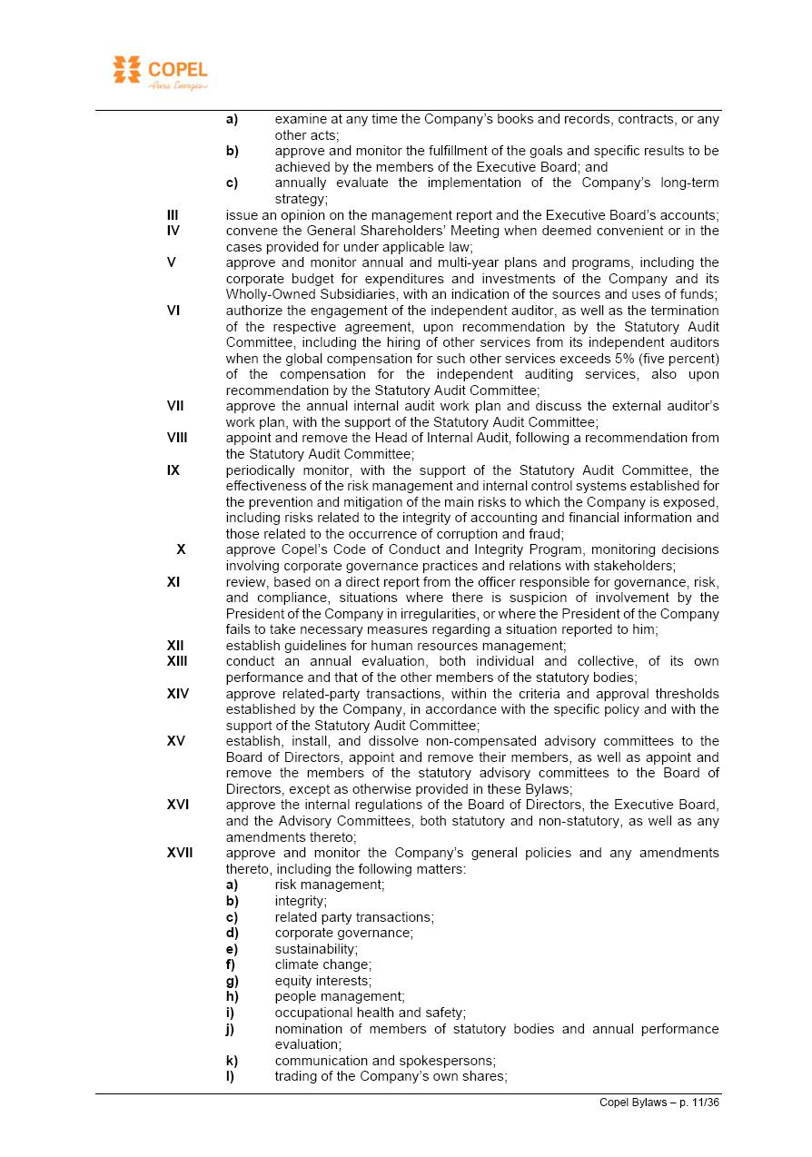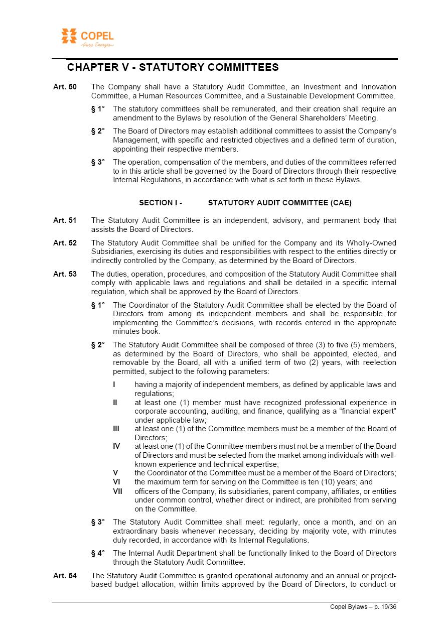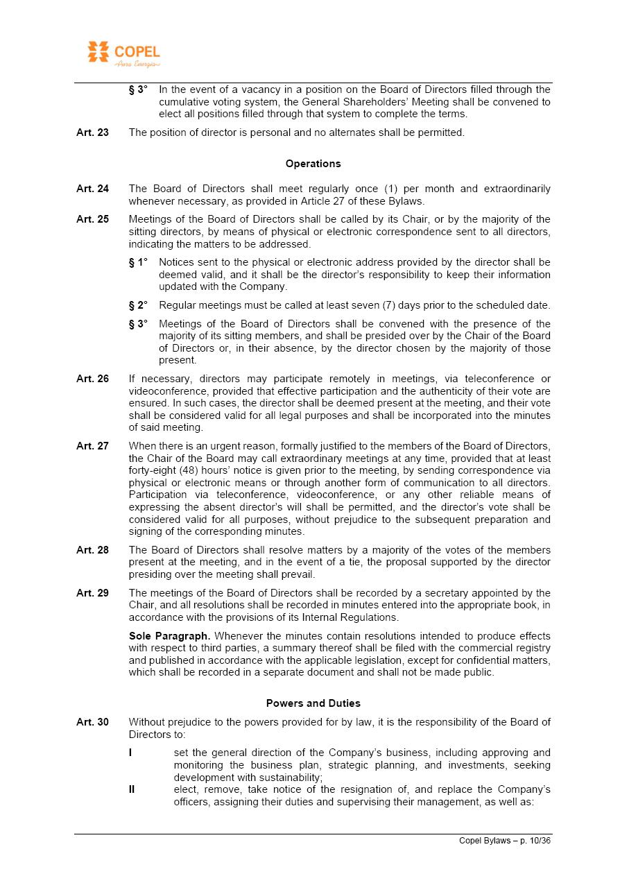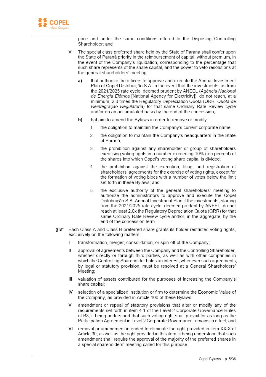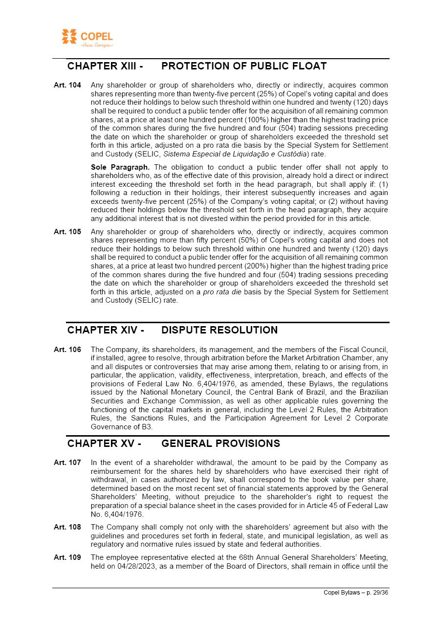 BYLAWS OF COMPANHIA PARANAENSE DE ENERGIA Approved and consolidated by the 211th Extraordinary General Meeting of Shareholders, held on 10/30/2024. CNPJ (Cadastro Nacional de Pessoas Jurídicas [National Registry of Legal Entities]): 76.483.817/0001-20 NIRE (Número de Identificação no Registro de Empresas [Company Register Identification Number]): 41300036535 CVM (Comissão de Valores Mobiliários [Securities and Exchange Commission]) Registration: 1431-1 Rua José Izidoro Biazetto, 158, Bloco A Curitiba - Paraná - Brazil ZIP Code: 81200-240 email: copel@copel.com Website: http://www.copel.com Phone: (41) 3310-5050 Fax: (41) 3331-4145 Copel Bylaws – p. 1/36 SUMMARY CHAPTER I - CORPORATE NAME, DURATION, HEADQUARTERS AND CORPORATE PURPOSE .............................................................................................................. 3 CHAPTER II - SHARE CAPITAL AND SHARES .......................................................................... 4 CHAPTER III - GENERAL SHAREHOLDERS’ MEETING (GSM) ................................................. 7 CHAPTER IV - MANAGEMENT OF THE COMPANY .................................................................... 8 SEÇÃO I - BOARD OF DIRECTORS (BOD) .................................................... 9 Composition, Appointment, and Term of Office ..................................................... 9 Vacancy and Substitutions ..................................................................................... 9 Operations ............................................................................................................ 10 Powers and Duties ................................................................................................ 10 SEÇÃO II - EXECUTIVE BOARD .................................................................... 13 Composition, Term, and Investiture ...................................................................... 13 Powers and Duties ................................................................................................ 14 Representation of the Company ........................................................................... 15 Vacancy and Substitution ..................................................................................... 16 SEÇÃO III - EXECUTIVE BOARD MEETINGS (REDIR) ................................. 16 Operations ............................................................................................................ 16 Powers and Duties ................................................................................................ 17 CHAPTER V - STATUTORY COMMITTEES ............................................................................... 19 SEÇÃO I - STATUTORY AUDIT COMMITTEE (CAE) ................................... 19 SEÇÃO II - INVESTMENT AND INNOVATION COMMITTEE (CII) ................ 20 SEÇÃO III - SUSTAINABLE DEVELOPMENT COMMITTEE (CDS) ............... 20 SEÇÃO IV - COMMITTEE OF PEOPLE (CDG, COMITÊ DE GENTE) ............ 21 CHAPTER VI - FISCAL COUNCIL (FC) ....................................................................................... 22 Composition and Operation .................................................................................. 22 Vacancy and Substitutions ................................................................................... 22 Representation and Opinions ............................................................................... 22 CHAPTER VII - COMMON RULES APPLICABLE TO THE STATUTORY BODIES ................... 23 Investiture, Impediments, and Restrictions .......................................................... 23 Compensation ....................................................................................................... 24 CHAPTER VIII - FISCAL YEAR, FINANCIAL STATEMENTS, PROFITS, RESERVES, AND DISTRIBUTION OF RESULTS ............................................................................ 24 CHAPTER IX - DISSOLUTION AND LIQUIDATION .................................................................... 25 CHAPTER X - DEFENSE MECHANISMS ................................................................................... 25 CHAPTER XI - CHANGE OF CONTROL ..................................................................................... 26 CHAPTER XII - WITHDRAWAL FROM B3’S LEVEL 2 CORPORATE GOVERNANCE ............. 27 CHAPTER XIII - PROTECTION OF PUBLIC FLOAT ..................................................................... 29 CHAPTER XIV - DISPUTE RESOLUTION ..................................................................................... 29 CHAPTER XV - GENERAL PROVISIONS ..................................................................................... 29 ANNEXES: I AMENDMENTS TO THE BYLAWS ............................ Erro! Indicador não definido. II EVOLUTION OF SHARE CAPITAL ........................... Erro! Indicador não definido. Copel Bylaws – p. 2/36 DEFINITIONS: GSM: GENERAL SHAREHOLDERS’ MEETING EGSM: EXTRAORDINARY GENERAL SHAREHOLDERS’ MEETING JUCEPAR: COMMERCIAL REGISTRY OF THE STATE OF PARANÁ (JUNTA COMERCIAL DO ESTADO DO PARANÁ) DOE PR: OFFICIAL GAZETTE OF THE STATE OF PARANÁ (DIÁRIO OFICIAL DO ESTADO DO PARANÁ) Note: The original text was filed with JUCEPAR under No. 17,340 (now 41300036535) on 06/16/1955 and published in the DOE PR dated 06/25/1955. Copel Bylaws – p. 3/36 CHAPTER I - CORPORATE NAME, DURATION, HEADQUARTERS AND CORPORATE PURPOSE Art. 1° Companhia Paranaense de Energia – Copel, hereinafter referred to as “Copel” or the “Company,” is a publicly held corporation, endowed with legal personality under private law, governed by these Bylaws and by the applicable legislation. Sole Paragraph. The Company’s corporate name may not be altered. Art. 2° The Company’s duration is indefinite. Art. 3° The Company has its principal place of business and legal venue in the City of Curitiba, State of Paraná, Bra