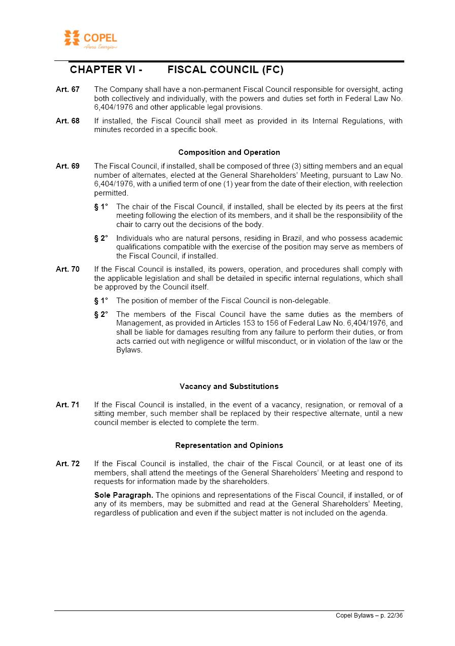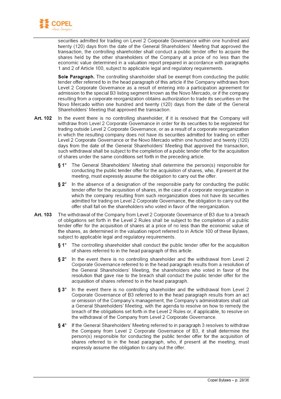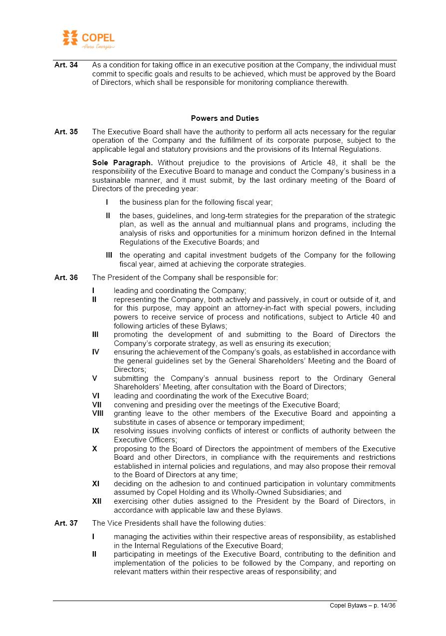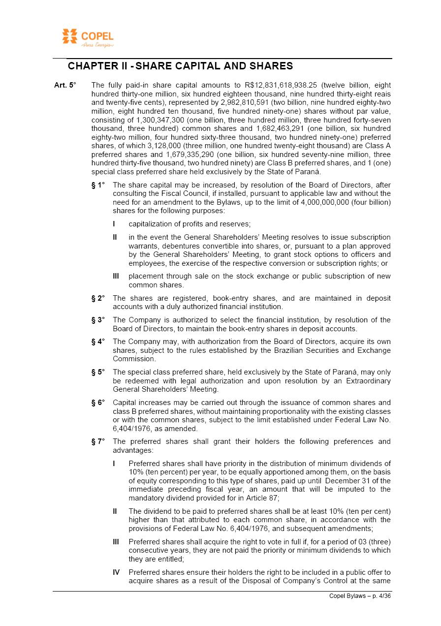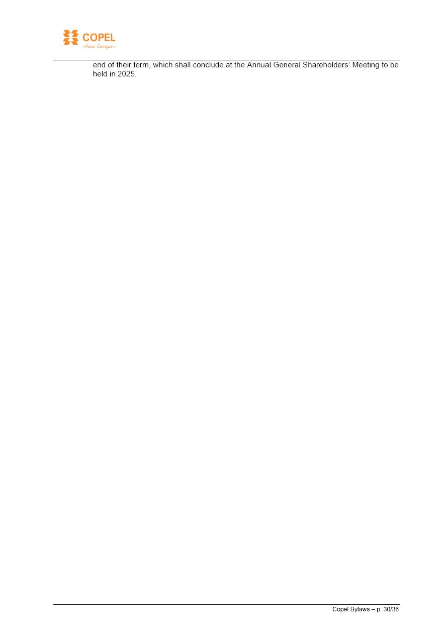 BYLAWS OF COMPANHIA PARANAENSE DE ENERGIA Approved and consolidated by the 211th Extraordinary General Meeting of Shareholders, held on 10/30/2024. CNPJ (Cadastro Nacional de Pessoas Jurídicas [National Registry of Legal Entities]): 76.483.817/0001-20 NIRE (Número de Identificação no Registro de Empresas [Company Register Identification Number]): 41300036535 CVM (Comissão de Valores Mobiliários [Securities and Exchange Commission]) Registration: 1431-1 Rua José Izidoro Biazetto, 158, Bloco A Curitiba - Paraná - Brazil ZIP Code: 81200-240 email: copel@copel.com Website: http://www.copel.com Phone: (41) 3310-5050 Fax: (41) 3331-4145 Copel Bylaws – p. 1/36 SUMMARY CHAPTER I - CORPORATE NAME, DURATION, HEADQUARTERS AND CORPORATE PURPOSE .............................................................................................................. 3 CHAPTER II - SHARE CAPITAL AND SHARES .......................................................................... 4 CHAPTER III - GENERAL SHAREHOLDERS’ MEETING (GSM) ................................................. 7 CHAPTER IV - MANAGEMENT OF THE COMPANY .................................................................... 8 SEÇÃO I - BOARD OF DIRECTORS (BOD) .................................................... 9 Composition, Appointment, and Term of Office ..................................................... 9 Vacancy and Substitutions ..................................................................................... 9 Operations ............................................................................................................ 10 Powers and Duties ................................................................................................ 10 SEÇÃO II - EXECUTIVE BOARD .................................................................... 13 Composition, Term, and Investiture ...................................................................... 13 Powers and Duties ................................................................................................ 14 Representation of the Company ........................................................................... 15 Vacancy and Substitution ..................................................................................... 16 SEÇÃO III - EXECUTIVE BOARD MEETINGS (REDIR) ................................. 16 Operations ............................................................................................................ 16 Powers and Duties ................................................................................................ 17 CHAPTER V - STATUTORY COMMITTEES ............................................................................... 19 SEÇÃO I - STATUTORY AUDIT COMMITTEE (CAE) ................................... 19 SEÇÃO II - INVESTMENT AND INNOVATION COMMITTEE (CII) ................ 20 SEÇÃO III - SUSTAINABLE DEVELOPMENT COMMITTEE (CDS) ............... 20 SEÇÃO IV - COMMITTEE OF PEOPLE (CDG, COMITÊ DE GENTE) ............ 21 CHAPTER VI - FISCAL COUNCIL (FC) ....................................................................................... 22 Composition and Operation .................................................................................. 22 Vacancy and Substitutions ................................................................................... 22 Representation and Opinions ............................................................................... 22 CHAPTER VII - COMMON RULES APPLICABLE TO THE STATUTORY BODIES ................... 23 Investiture, Impediments, and Restrictions .......................................................... 23 Compensation ....................................................................................................... 24 CHAPTER VIII - FISCAL YEAR, FINANCIAL STATEMENTS, PROFITS, RESERVES, AND DISTRIBUTION OF RESULTS ............................................................................ 24 CHAPTER IX - DISSOLUTION AND LIQUIDATION .................................................................... 25 CHAPTER X - DEFENSE MECHANISMS ................................................................................... 25 CHAPTER XI - CHANGE OF CONTROL ..................................................................................... 26 CHAPTER XII - WITHDRAWAL FROM B3’S LEVEL 2 CORPORATE GOVERNANCE ............. 27 CHAPTER XIII - PROTECTION OF PUBLIC FLOAT ..................................................................... 29 CHAPTER XIV - DISPUTE RESOLUTION ..................................................................................... 29 CHAPTER XV - GENERAL PROVISIONS ..................................................................................... 29 ANNEXES: I AMENDMENTS TO THE BYLAWS ............................ Erro! Indicador não definido. II EVOLUTION OF SHARE CAPITAL ........................... Erro! Indicador não definido. Copel Bylaws – p. 2/36 DEFINITIONS: GSM: GENERAL SHAREHOLDERS’ MEETING EGSM: EXTRAORDINARY GENERAL SHAREHOLDERS’ MEETING JUCEPAR: COMMERCIAL REGISTRY OF THE STATE OF PARANÁ (JUNTA COMERCIAL DO ESTADO DO PARANÁ) DOE PR: OFFICIAL GAZETTE OF THE STATE OF PARANÁ (DIÁRIO OFICIAL DO ESTADO DO PARANÁ) Note: The original text was filed with JUCEPAR under No. 17,340 (now 41300036535) on 06/16/1955 and published in the DOE PR dated 06/25/1955. Copel Bylaws – p. 3/36 CHAPTER I - CORPORATE NAME, DURATION, HEADQUARTERS AND CORPORATE PURPOSE Art. 1° Companhia Paranaense de Energia – Copel, hereinafter referred to as “Copel” or the “Company,” is a publicly held corporation, endowed with legal personality under private law, governed by these Bylaws and by the applicable legislation. Sole Paragraph. The Company’s corporate name may not be altered. Art. 2° The Company’s duration is indefinite. Art. 3° The Company has its principal place of business and legal venue in the City of Curitiba, State of Paraná, Bra