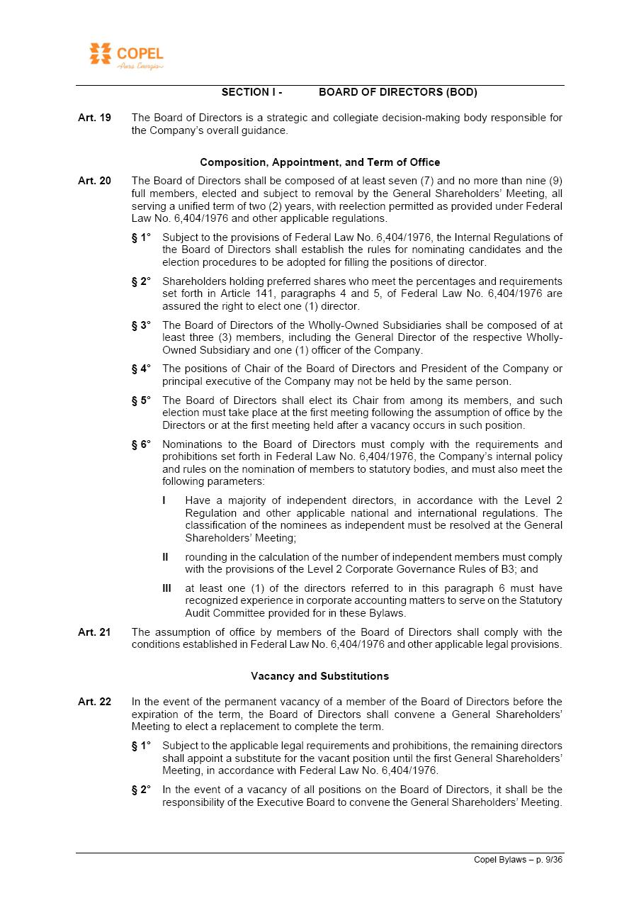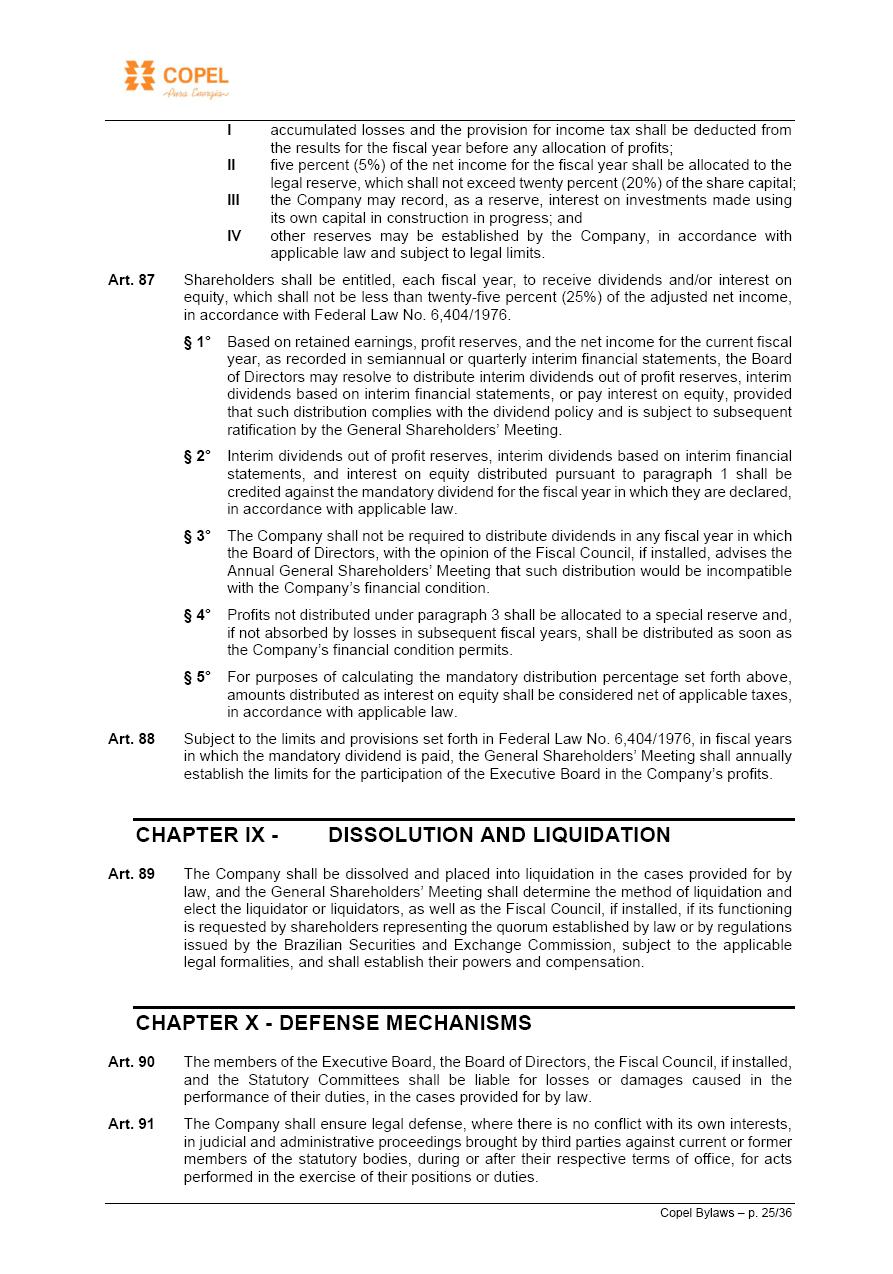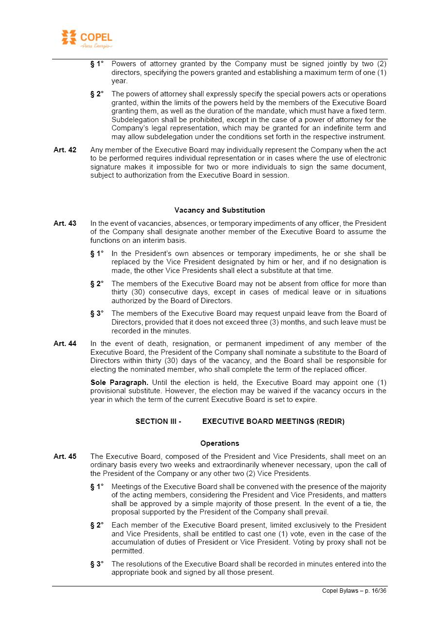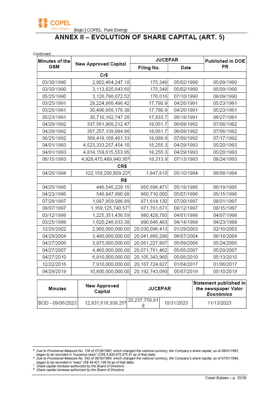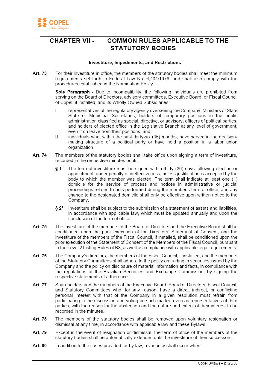 BYLAWS OF COMPANHIA PARANAENSE DE ENERGIA Approved and consolidated by the 211th Extraordinary General Meeting of Shareholders, held on 10/30/2024. CNPJ (Cadastro Nacional de Pessoas Jurídicas [National Registry of Legal Entities]): 76.483.817/0001-20 NIRE (Número de Identificação no Registro de Empresas [Company Register Identification Number]): 41300036535 CVM (Comissão de Valores Mobiliários [Securities and Exchange Commission]) Registration: 1431-1 Rua José Izidoro Biazetto, 158, Bloco A Curitiba - Paraná - Brazil ZIP Code: 81200-240 email: copel@copel.com Website: http://www.copel.com Phone: (41) 3310-5050 Fax: (41) 3331-4145 Copel Bylaws – p. 1/36 SUMMARY CHAPTER I - CORPORATE NAME, DURATION, HEADQUARTERS AND CORPORATE PURPOSE .............................................................................................................. 3 CHAPTER II - SHARE CAPITAL AND SHARES .......................................................................... 4 CHAPTER III - GENERAL SHAREHOLDERS’ MEETING (GSM) ................................................. 7 CHAPTER IV - MANAGEMENT OF THE COMPANY .................................................................... 8 SEÇÃO I - BOARD OF DIRECTORS (BOD) .................................................... 9 Composition, Appointment, and Term of Office ..................................................... 9 Vacancy and Substitutions ..................................................................................... 9 Operations ............................................................................................................ 10 Powers and Duties ................................................................................................ 10 SEÇÃO II - EXECUTIVE BOARD .................................................................... 13 Composition, Term, and Investiture ...................................................................... 13 Powers and Duties ................................................................................................ 14 Representation of the Company ........................................................................... 15 Vacancy and Substitution ..................................................................................... 16 SEÇÃO III - EXECUTIVE BOARD MEETINGS (REDIR) ................................. 16 Operations ............................................................................................................ 16 Powers and Duties ................................................................................................ 17 CHAPTER V - STATUTORY COMMITTEES ............................................................................... 19 SEÇÃO I - STATUTORY AUDIT COMMITTEE (CAE) ................................... 19 SEÇÃO II - INVESTMENT AND INNOVATION COMMITTEE (CII) ................ 20 SEÇÃO III - SUSTAINABLE DEVELOPMENT COMMITTEE (CDS) ............... 20 SEÇÃO IV - COMMITTEE OF PEOPLE (CDG, COMITÊ DE GENTE) ............ 21 CHAPTER VI - FISCAL COUNCIL (FC) ....................................................................................... 22 Composition and Operation .................................................................................. 22 Vacancy and Substitutions ................................................................................... 22 Representation and Opinions ............................................................................... 22 CHAPTER VII - COMMON RULES APPLICABLE TO THE STATUTORY BODIES ................... 23 Investiture, Impediments, and Restrictions .......................................................... 23 Compensation ....................................................................................................... 24 CHAPTER VIII - FISCAL YEAR, FINANCIAL STATEMENTS, PROFITS, RESERVES, AND DISTRIBUTION OF RESULTS ............................................................................ 24 CHAPTER IX - DISSOLUTION AND LIQUIDATION .................................................................... 25 CHAPTER X - DEFENSE MECHANISMS ................................................................................... 25 CHAPTER XI - CHANGE OF CONTROL ..................................................................................... 26 CHAPTER XII - WITHDRAWAL FROM B3’S LEVEL 2 CORPORATE GOVERNANCE ............. 27 CHAPTER XIII - PROTECTION OF PUBLIC FLOAT ..................................................................... 29 CHAPTER XIV - DISPUTE RESOLUTION ..................................................................................... 29 CHAPTER XV - GENERAL PROVISIONS ..................................................................................... 29 ANNEXES: I AMENDMENTS TO THE BYLAWS ............................ Erro! Indicador não definido. II EVOLUTION OF SHARE CAPITAL ........................... Erro! Indicador não definido. Copel Bylaws – p. 2/36 DEFINITIONS: GSM: GENERAL SHAREHOLDERS’ MEETING EGSM: EXTRAORDINARY GENERAL SHAREHOLDERS’ MEETING JUCEPAR: COMMERCIAL REGISTRY OF THE STATE OF PARANÁ (JUNTA COMERCIAL DO ESTADO DO PARANÁ) DOE PR: OFFICIAL GAZETTE OF THE STATE OF PARANÁ (DIÁRIO OFICIAL DO ESTADO DO PARANÁ) Note: The original text was filed with JUCEPAR under No. 17,340 (now 41300036535) on 06/16/1955 and published in the DOE PR dated 06/25/1955. Copel Bylaws – p. 3/36 CHAPTER I - CORPORATE NAME, DURATION, HEADQUARTERS AND CORPORATE PURPOSE Art. 1° Companhia Paranaense de Energia – Copel, hereinafter referred to as “Copel” or the “Company,” is a publicly held corporation, endowed with legal personality under private law, governed by these Bylaws and by the applicable legislation. Sole Paragraph. The Company’s corporate name may not be altered. Art. 2° The Company’s duration is indefinite. Art. 3° The Company has its principal place of business and legal venue in the City of Curitiba, State of Paraná, Bra