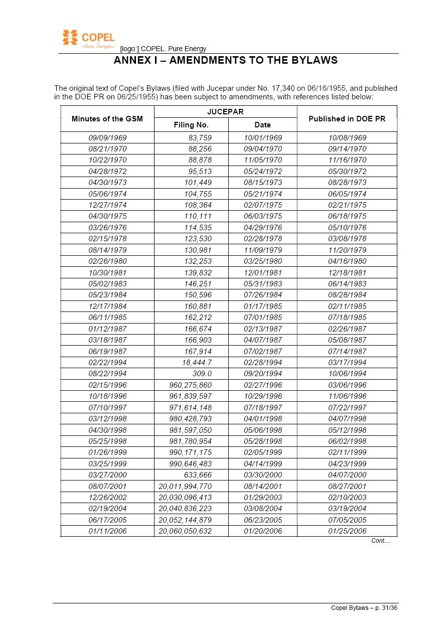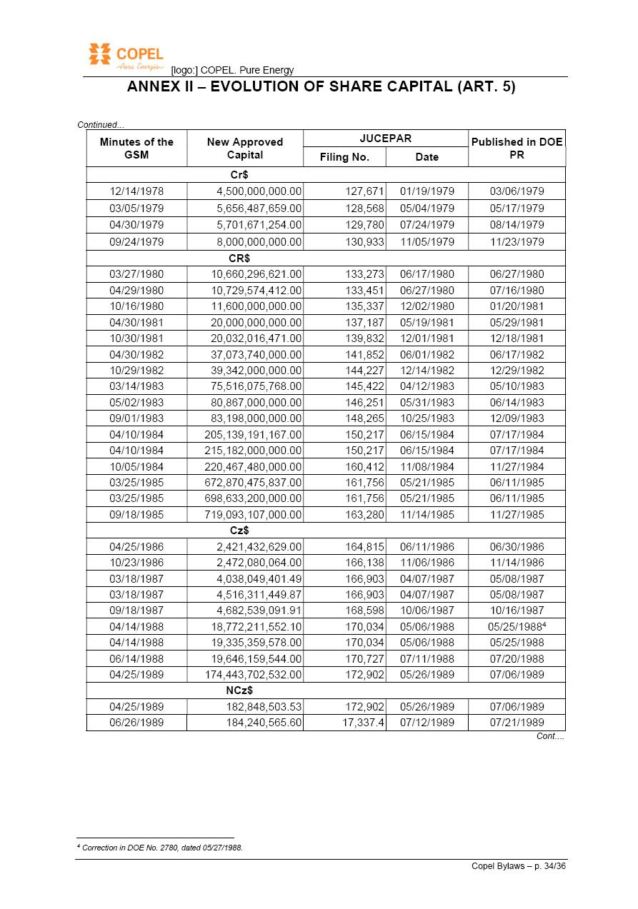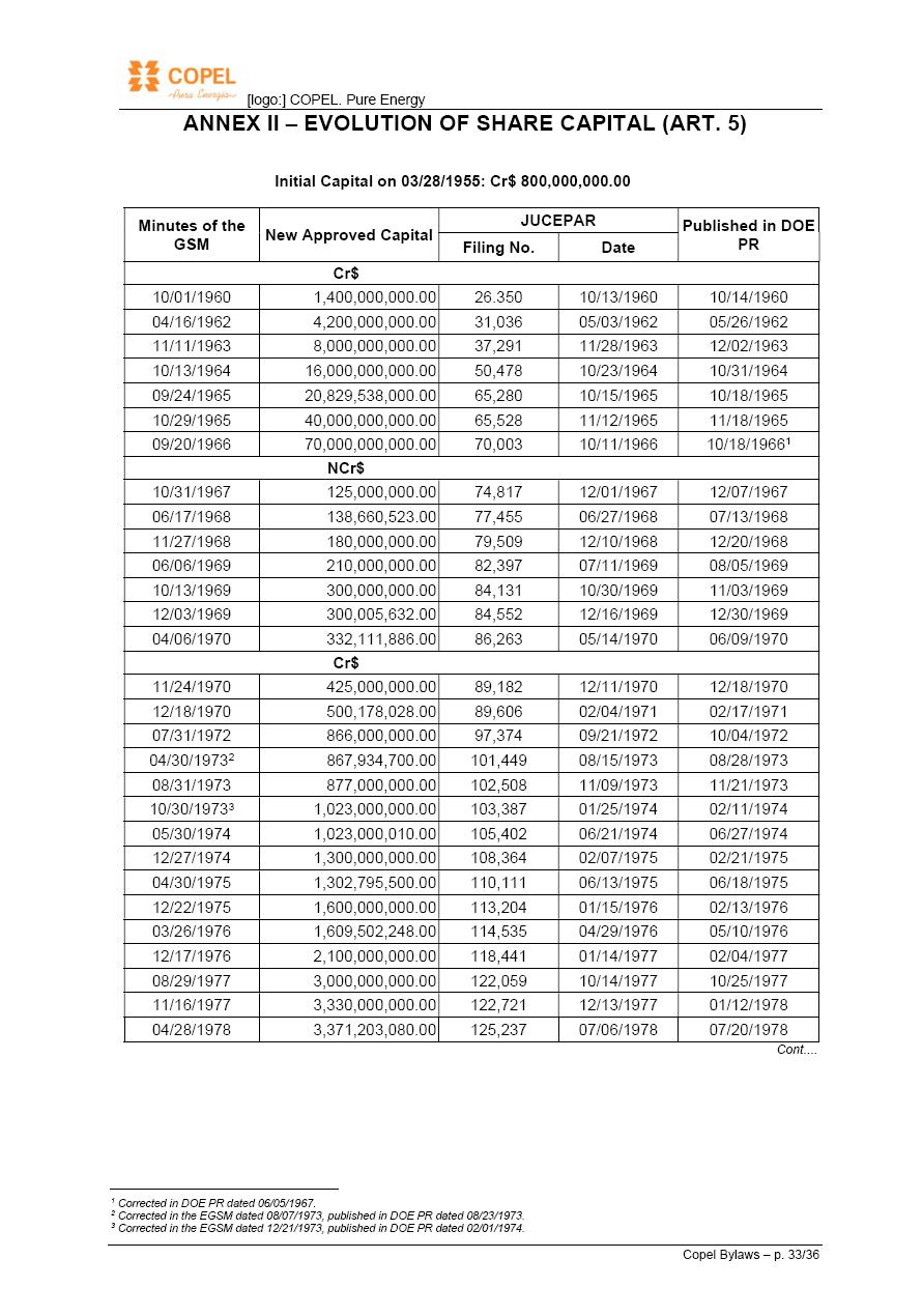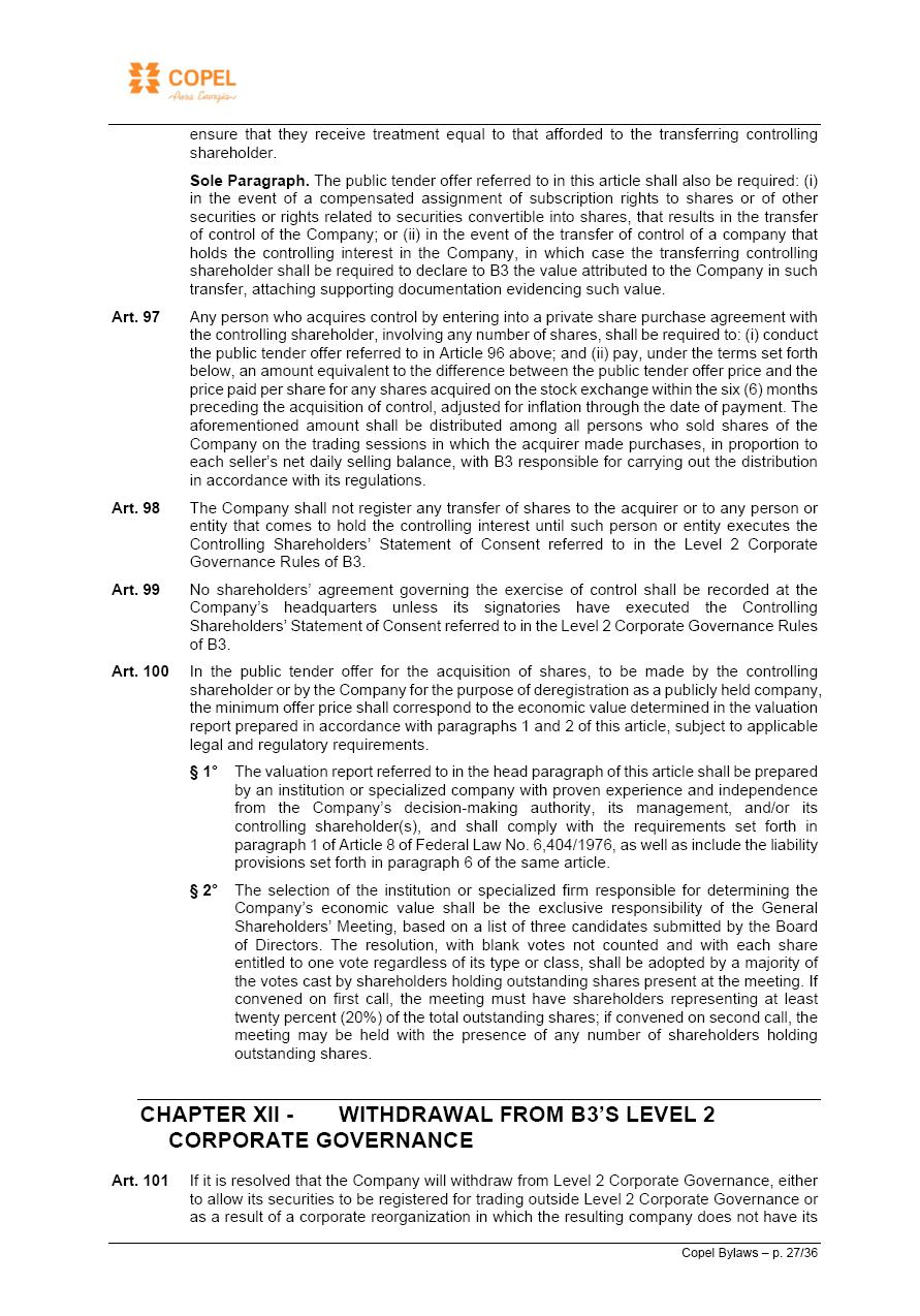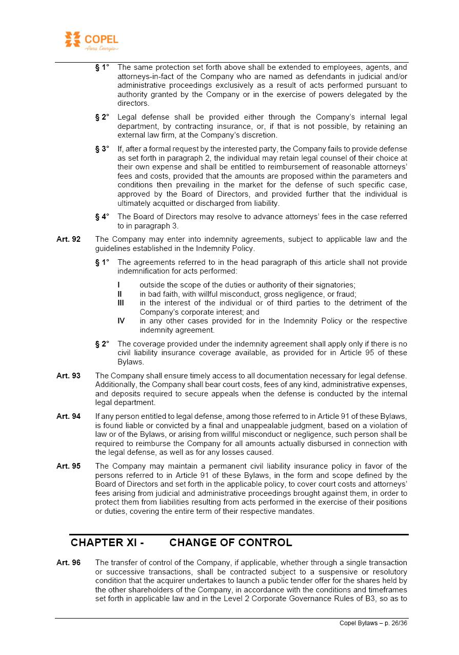BYLAWS OF COMPANHIA PARANAENSE DE ENERGIA Approved and consolidated by the 211th Extraordinary General Meeting of Shareholders, held on 10/30/2024. CNPJ (Cadastro Nacional de Pessoas Jurídicas [National Registry of Legal Entities]): 76.483.817/0001-20 NIRE (Número de Identificação no Registro de Empresas [Company Register Identification Number]): 41300036535 CVM (Comissão de Valores Mobiliários [Securities and Exchange Commission]) Registration: 1431-1 Rua José Izidoro Biazetto, 158, Bloco A Curitiba - Paraná - Brazil ZIP Code: 81200-240 email: copel@copel.com Website: http://www.copel.com Phone: (41) 3310-5050 Fax: (41) 3331-4145 Copel Bylaws – p. 1/36 SUMMARY CHAPTER I - CORPORATE NAME, DURATION, HEADQUARTERS AND CORPORATE PURPOSE .............................................................................................................. 3 CHAPTER II - SHARE CAPITAL AND SHARES .......................................................................... 4 CHAPTER III - GENERAL SHAREHOLDERS’ MEETING (GSM) ................................................. 7 CHAPTER IV - MANAGEMENT OF THE COMPANY .................................................................... 8 SEÇÃO I - BOARD OF DIRECTORS (BOD) .................................................... 9 Composition, Appointment, and Term of Office ..................................................... 9 Vacancy and Substitutions ..................................................................................... 9 Operations ............................................................................................................ 10 Powers and Duties ................................................................................................ 10 SEÇÃO II - EXECUTIVE BOARD .................................................................... 13 Composition, Term, and Investiture ...................................................................... 13 Powers and Duties ................................................................................................ 14 Representation of the Company ........................................................................... 15 Vacancy and Substitution ..................................................................................... 16 SEÇÃO III - EXECUTIVE BOARD MEETINGS (REDIR) ................................. 16 Operations ............................................................................................................ 16 Powers and Duties ................................................................................................ 17 CHAPTER V - STATUTORY COMMITTEES ............................................................................... 19 SEÇÃO I - STATUTORY AUDIT COMMITTEE (CAE) ................................... 19 SEÇÃO II - INVESTMENT AND INNOVATION COMMITTEE (CII) ................ 20 SEÇÃO III - SUSTAINABLE DEVELOPMENT COMMITTEE (CDS) ............... 20 SEÇÃO IV - COMMITTEE OF PEOPLE (CDG, COMITÊ DE GENTE) ............ 21 CHAPTER VI - FISCAL COUNCIL (FC) ....................................................................................... 22 Composition and Operation .................................................................................. 22 Vacancy and Substitutions ................................................................................... 22 Representation and Opinions ............................................................................... 22 CHAPTER VII - COMMON RULES APPLICABLE TO THE STATUTORY BODIES ................... 23 Investiture, Impediments, and Restrictions .......................................................... 23 Compensation ....................................................................................................... 24 CHAPTER VIII - FISCAL YEAR, FINANCIAL STATEMENTS, PROFITS, RESERVES, AND DISTRIBUTION OF RESULTS ............................................................................ 24 CHAPTER IX - DISSOLUTION AND LIQUIDATION .................................................................... 25 CHAPTER X - DEFENSE MECHANISMS ................................................................................... 25 CHAPTER XI - CHANGE OF CONTROL ..................................................................................... 26 CHAPTER XII - WITHDRAWAL FROM B3’S LEVEL 2 CORPORATE GOVERNANCE ............. 27 CHAPTER XIII - PROTECTION OF PUBLIC FLOAT ..................................................................... 29 CHAPTER XIV - DISPUTE RESOLUTION ..................................................................................... 29 CHAPTER XV - GENERAL PROVISIONS ..................................................................................... 29 ANNEXES: I AMENDMENTS TO THE BYLAWS ............................ Erro! Indicador não definido. II EVOLUTION OF SHARE CAPITAL ........................... Erro! Indicador não definido. Copel Bylaws – p. 2/36 DEFINITIONS: GSM: GENERAL SHAREHOLDERS’ MEETING EGSM: EXTRAORDINARY GENERAL SHAREHOLDERS’ MEETING JUCEPAR: COMMERCIAL REGISTRY OF THE STATE OF PARANÁ (JUNTA COMERCIAL DO ESTADO DO PARANÁ) DOE PR: OFFICIAL GAZETTE OF THE STATE OF PARANÁ (DIÁRIO OFICIAL DO ESTADO DO PARANÁ) Note: The original text was filed with JUCEPAR under No. 17,340 (now 41300036535) on 06/16/1955 and published in the DOE PR dated 06/25/1955. Copel Bylaws – p. 3/36 CHAPTER I - CORPORATE NAME, DURATION, HEADQUARTERS AND CORPORATE PURPOSE Art. 1° Companhia Paranaense de Energia – Copel, hereinafter referred to as “Copel” or the “Company,” is a publicly held corporation, endowed with legal personality under private law, governed by these Bylaws and by the applicable legislation. Sole Paragraph. The Company’s corporate name may not be altered. Art. 2° The Company’s duration is indefinite. Art. 3° The Company has its principal place of business and legal venue in the City of Curitiba, State of Paraná, Bra