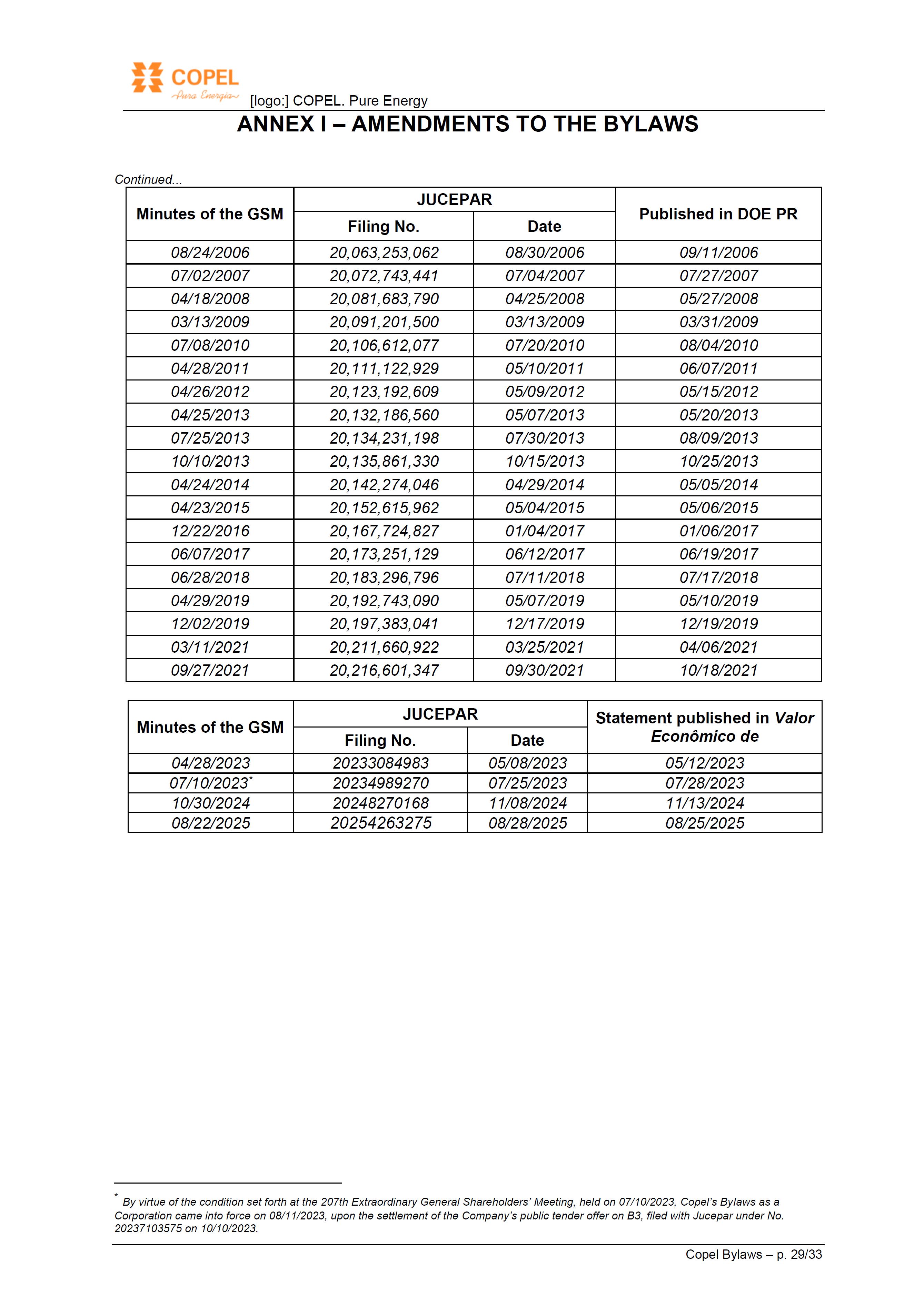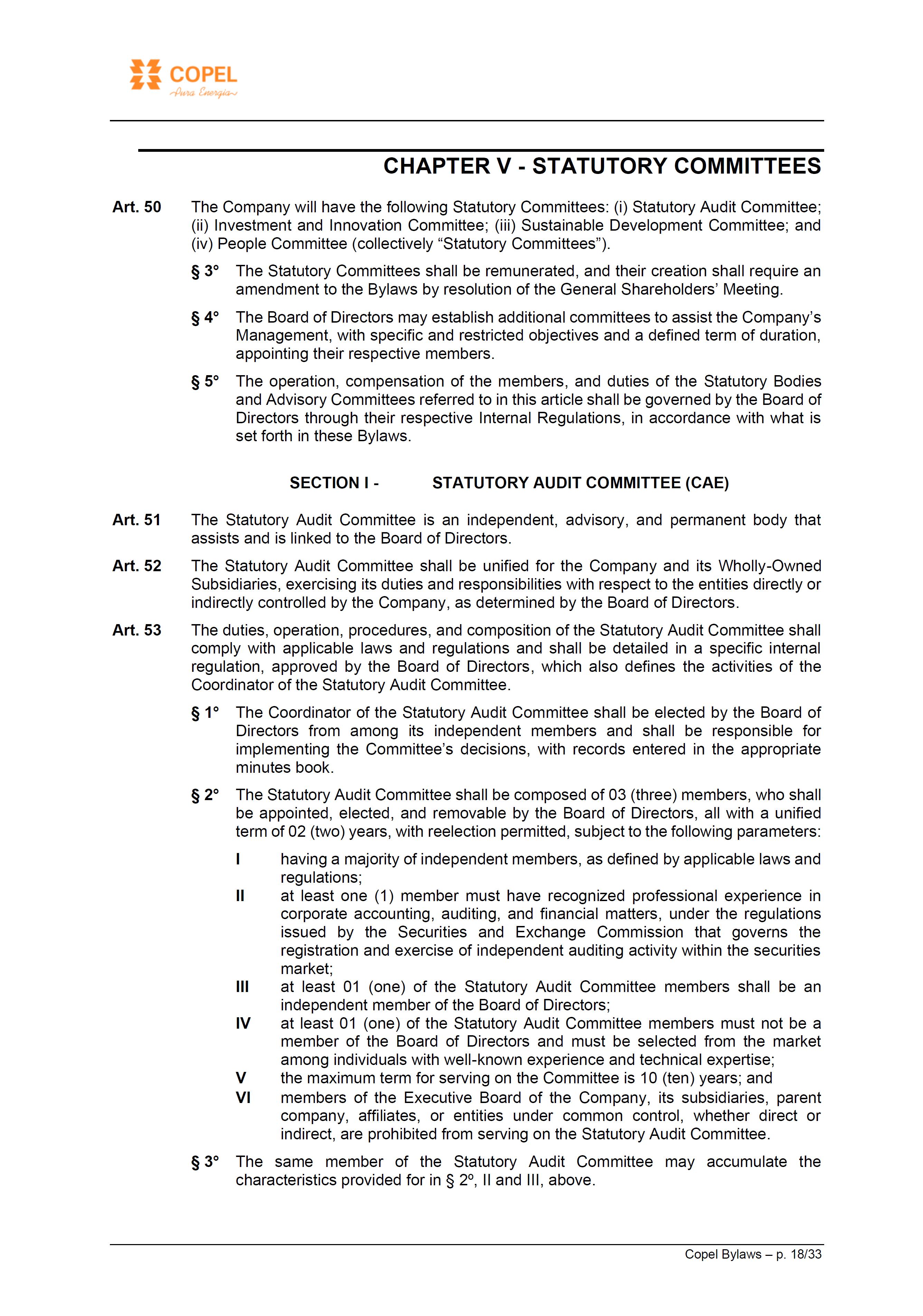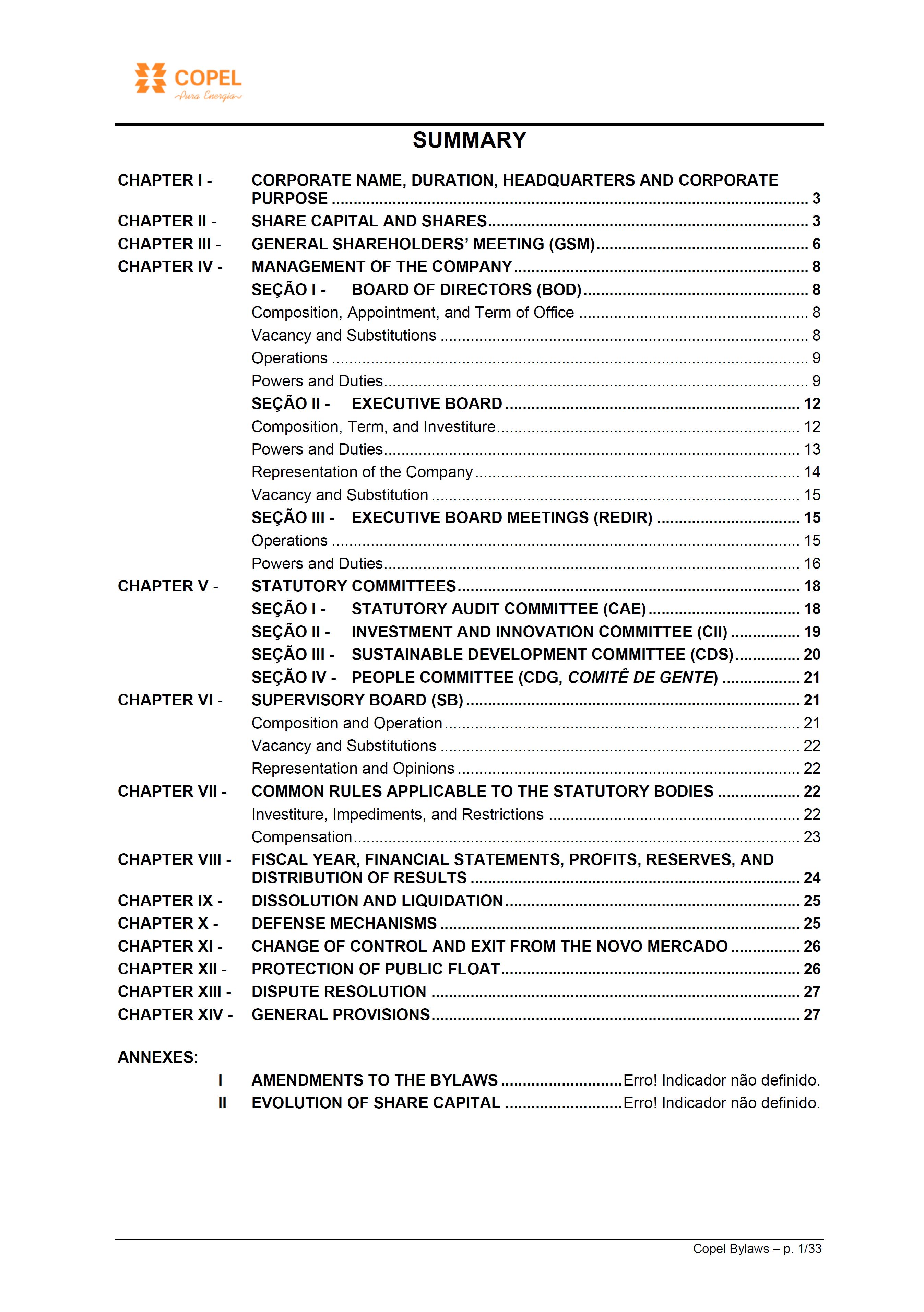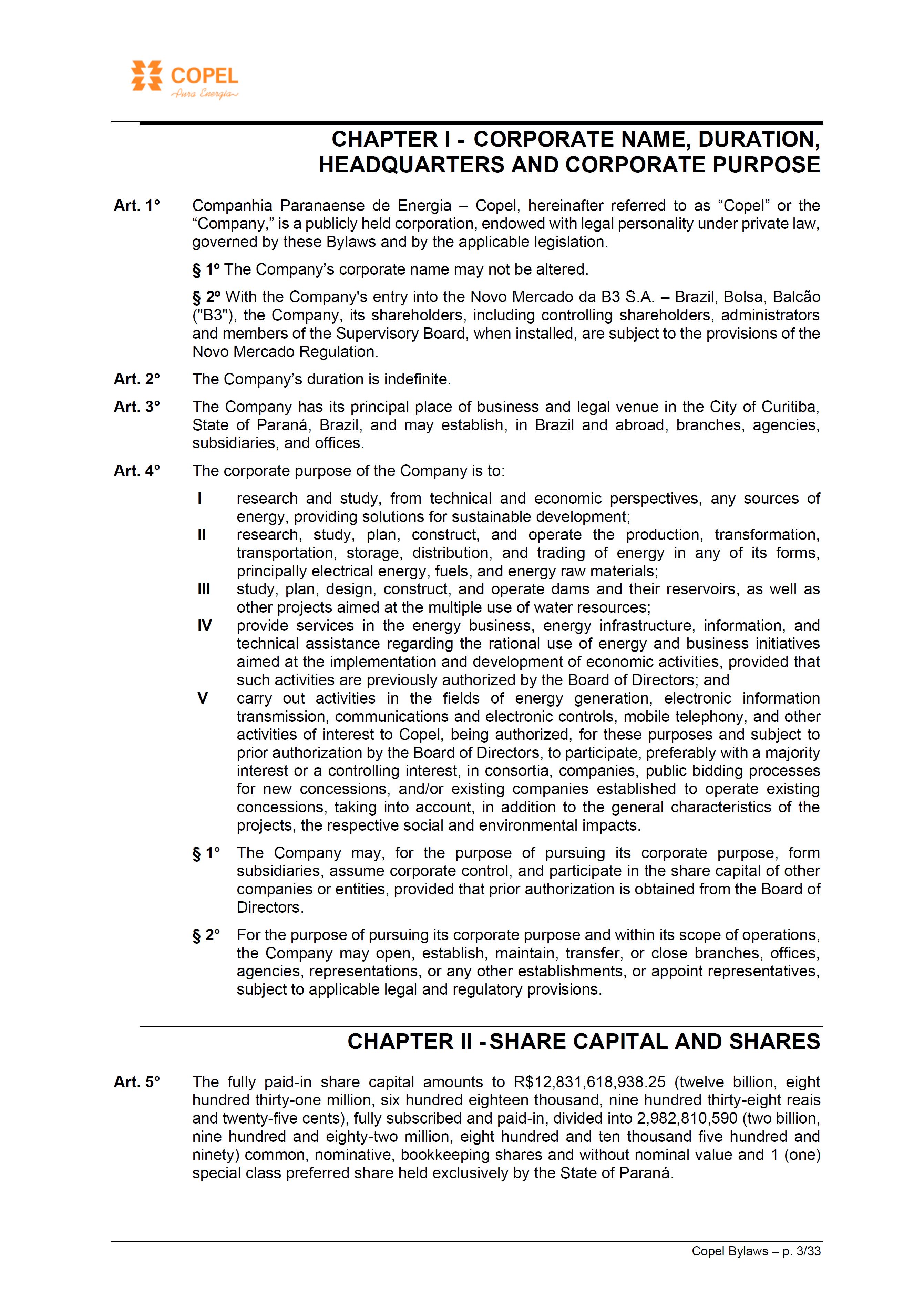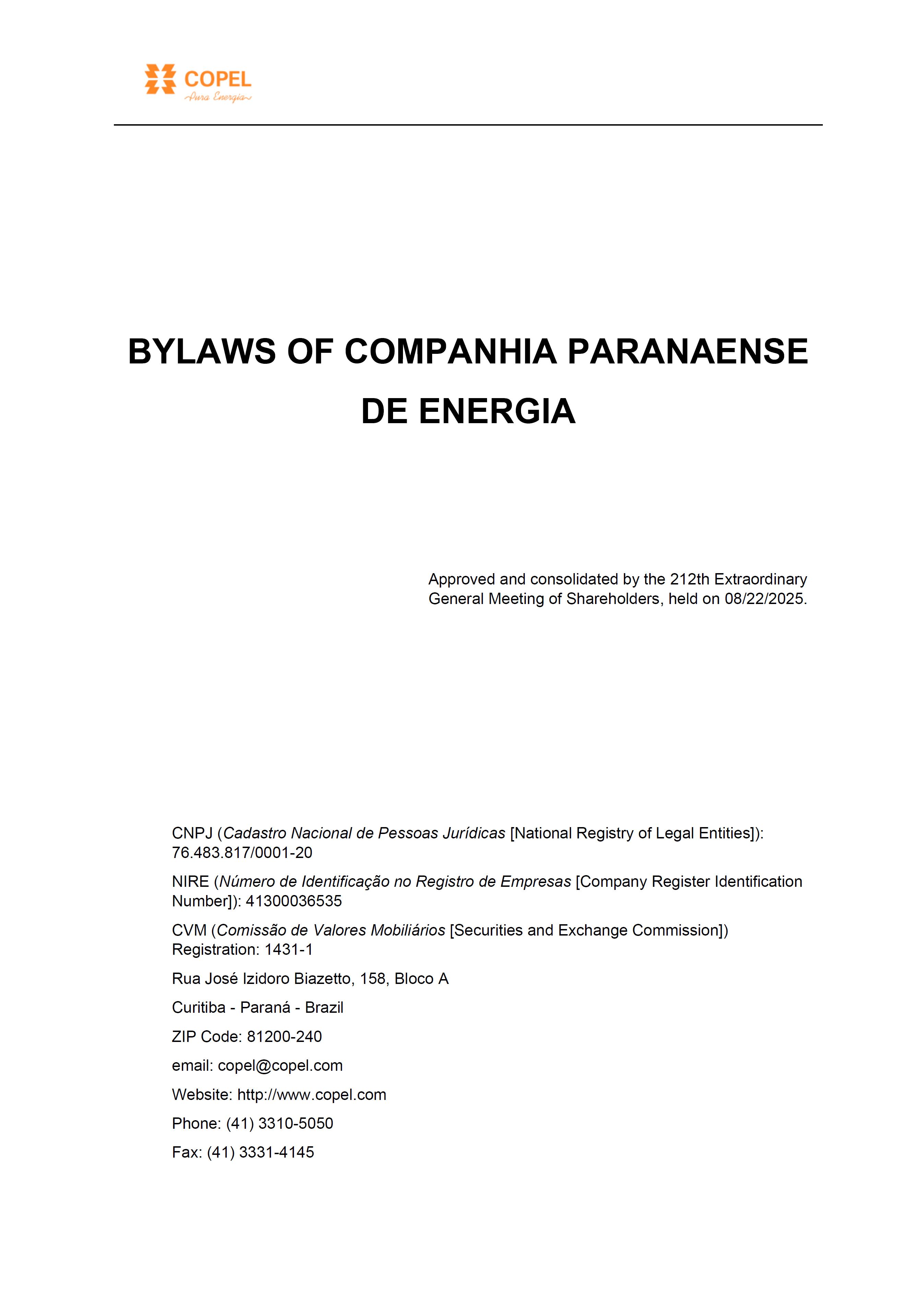 BYLAWS OF COMPANHIA PARANAENSE DE ENERGIA Approved and consolidated by the 212th Extraordinary General Meeting of Shareholders, held on 08/22/2025. CNPJ (Cadastro Nacional de Pessoas Jurídicas [National Registry of Legal Entities]): 76.483.817/0001-20 NIRE (Número de Identificação no Registro de Empresas [Company Register Identification Number]): 41300036535 CVM (Comissão de Valores Mobiliários [Securities and Exchange Commission]) Registration: 1431-1 Rua José Izidoro Biazetto, 158, Bloco A Curitiba - Paraná - Brazil ZIP Code: 81200-240 email: copel@copel.com Website: http://www.copel.com Phone: (41) 3310-5050 Fax: (41) 3331-4145 Copel Bylaws – p. 1/33 SUMMARY CHAPTER I - CORPORATE NAME, DURATION, HEADQUARTERS AND CORPORATE PURPOSE .............................................................................................................. 3 CHAPTER II - SHARE CAPITAL AND SHARES .......................................................................... 3 CHAPTER III - GENERAL SHAREHOLDERS’ MEETING (GSM) ................................................. 6 CHAPTER IV - MANAGEMENT OF THE COMPANY .................................................................... 8 SEÇÃO I - BOARD OF DIRECTORS (BOD) .................................................... 8 Composition, Appointment, and Term of Office ..................................................... 8 Vacancy and Substitutions ..................................................................................... 8 Operations .............................................................................................................. 9 Powers and Duties .................................................................................................. 9 SEÇÃO II - EXECUTIVE BOARD .................................................................... 12 Composition, Term, and Investiture ...................................................................... 12 Powers and Duties ................................................................................................ 13 Representation of the Company ........................................................................... 14 Vacancy and Substitution ..................................................................................... 15 SEÇÃO III - EXECUTIVE BOARD MEETINGS (REDIR) ................................. 15 Operations ............................................................................................................ 15 Powers and Duties ................................................................................................ 16 CHAPTER V - STATUTORY COMMITTEES ............................................................................... 18 SEÇÃO I - STATUTORY AUDIT COMMITTEE (CAE) ................................... 18 SEÇÃO II - INVESTMENT AND INNOVATION COMMITTEE (CII) ................ 19 SEÇÃO III - SUSTAINABLE DEVELOPMENT COMMITTEE (CDS) ............... 20 SEÇÃO IV - PEOPLE COMMITTEE (CDG, COMITÊ DE GENTE) .................. 21 CHAPTER VI - SUPERVISORY BOARD (SB) ............................................................................. 21 Composition and Operation .................................................................................. 21 Vacancy and Substitutions ................................................................................... 22 Representation and Opinions ............................................................................... 22 CHAPTER VII - COMMON RULES APPLICABLE TO THE STATUTORY BODIES ................... 22 Investiture, Impediments, and Restrictions .......................................................... 22 Compensation ....................................................................................................... 23 CHAPTER VIII - FISCAL YEAR, FINANCIAL STATEMENTS, PROFITS, RESERVES, AND DISTRIBUTION OF RESULTS ............................................................................ 24 CHAPTER IX - DISSOLUTION AND LIQUIDATION .................................................................... 25 CHAPTER X - DEFENSE MECHANISMS ................................................................................... 25 CHAPTER XI - CHANGE OF CONTROL AND EXIT FROM THE NOVO MERCADO ................ 26 CHAPTER XII - PROTECTION OF PUBLIC FLOAT ..................................................................... 26 CHAPTER XIII - DISPUTE RESOLUTION ..................................................................................... 27 CHAPTER XIV - GENERAL PROVISIONS ..................................................................................... 27 ANNEXES: I AMENDMENTS TO THE BYLAWS ............................ Erro! Indicador não definido. II EVOLUTION OF SHARE CAPITAL ........................... Erro! Indicador não definido. Copel Bylaws – p. 2/33 DEFINITIONS: GSM: GENERAL SHAREHOLDERS’ MEETING EGSM: EXTRAORDINARY GENERAL SHAREHOLDERS’ MEETING JUCEPAR: COMMERCIAL REGISTRY OF THE STATE OF PARANÁ (JUNTA COMERCIAL DO ESTADO DO PARANÁ) DOE PR: OFFICIAL GAZETTE OF THE STATE OF PARANÁ (DIÁRIO OFICIAL DO ESTADO DO PARANÁ) Note: The original text was filed with JUCEPAR under No. 17,340 (now 41300036535) on 06/16/1955 and published in the DOE PR dated 06/25/1955. Copel Bylaws – p. 3/33 CHAPTER I - CORPORATE NAME, DURATION, HEADQUARTERS AND CORPORATE PURPOSE Art. 1° Companhia Paranaense de Energia – Copel, hereinafter referred to as “Copel” or the “Company,” is a publicly held corporation, endowed with legal personality under private law, governed by these Bylaws and by the applicable legislation. § 1º The Company’s corporate name may not be altered. § 2º With the Company's entry into the Novo Mercado da B3 S.A. – Brazil, Bolsa, Balcão ("B3"), the Company, its shareholders, including controlling shareholders, administrators and members of the Supervisory Board, when installed, are subject to the provisions of the Novo Mercado Regulation. A
