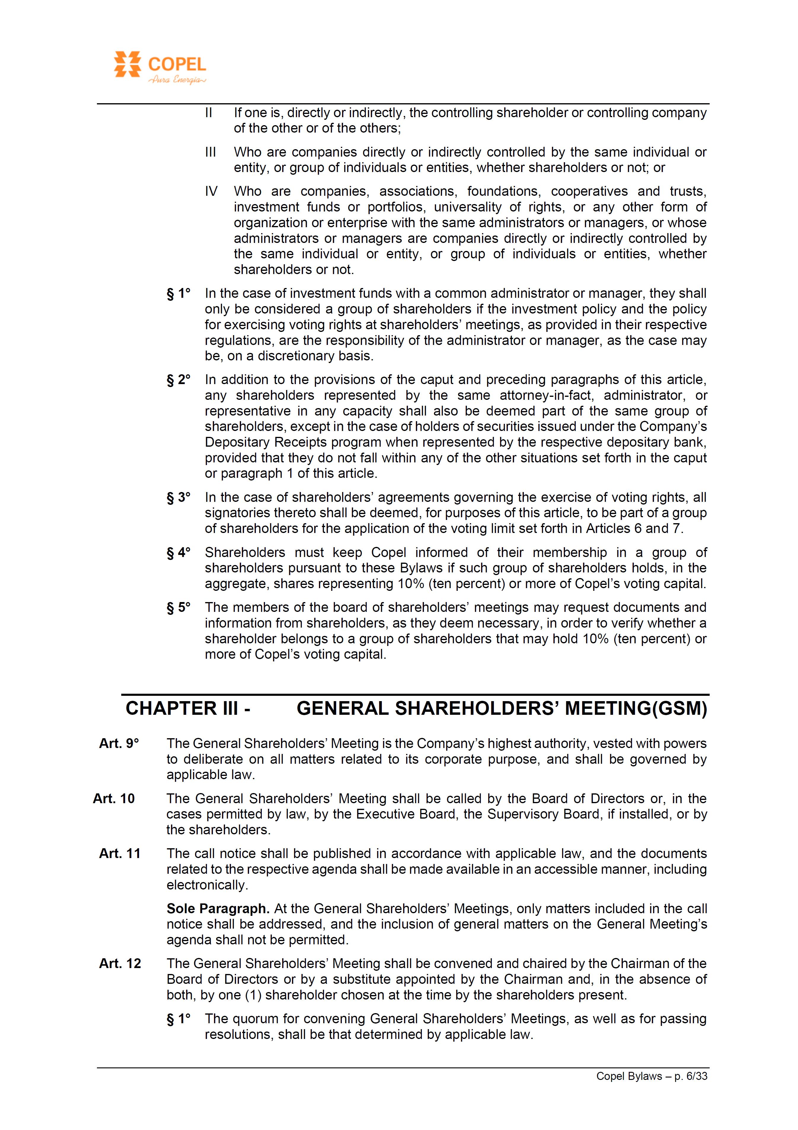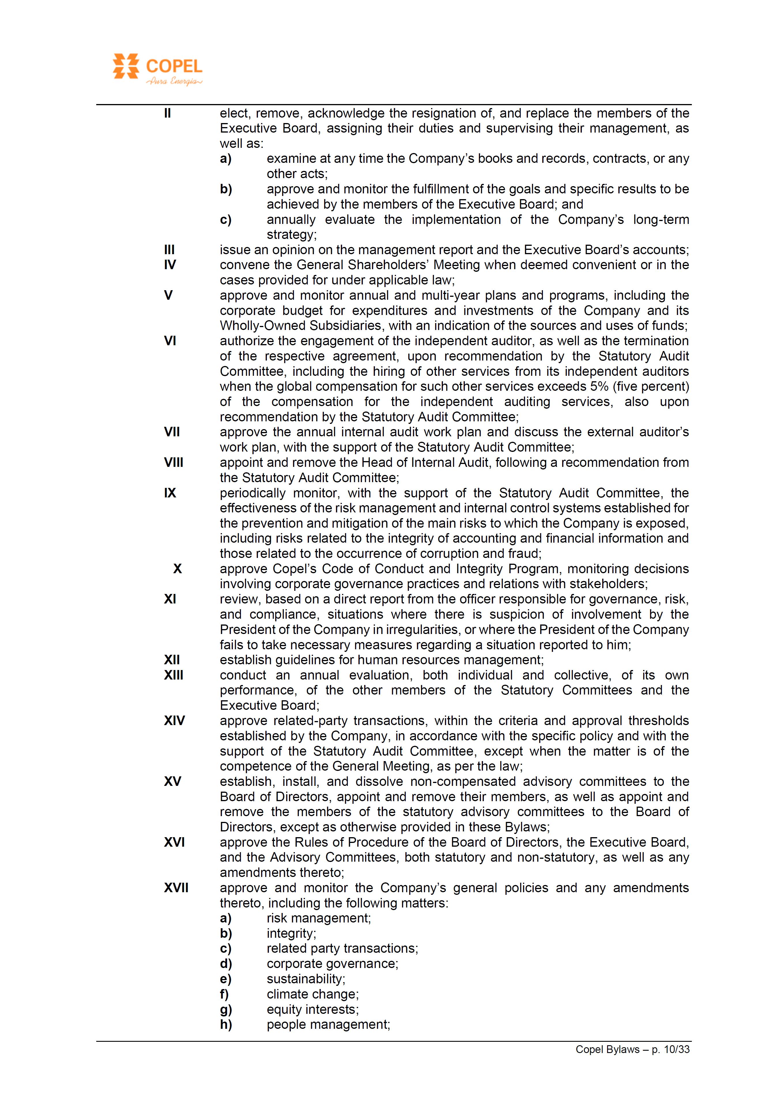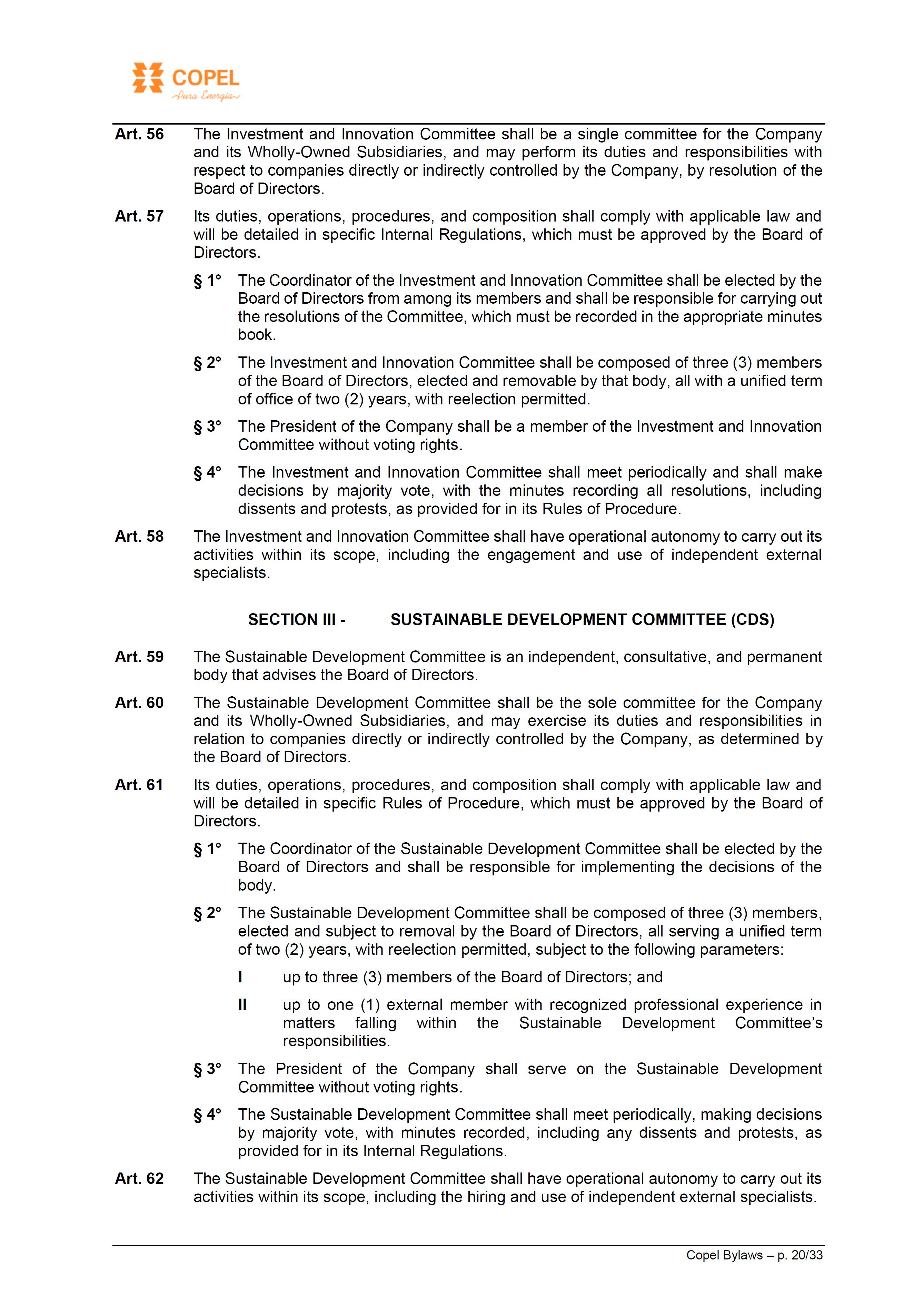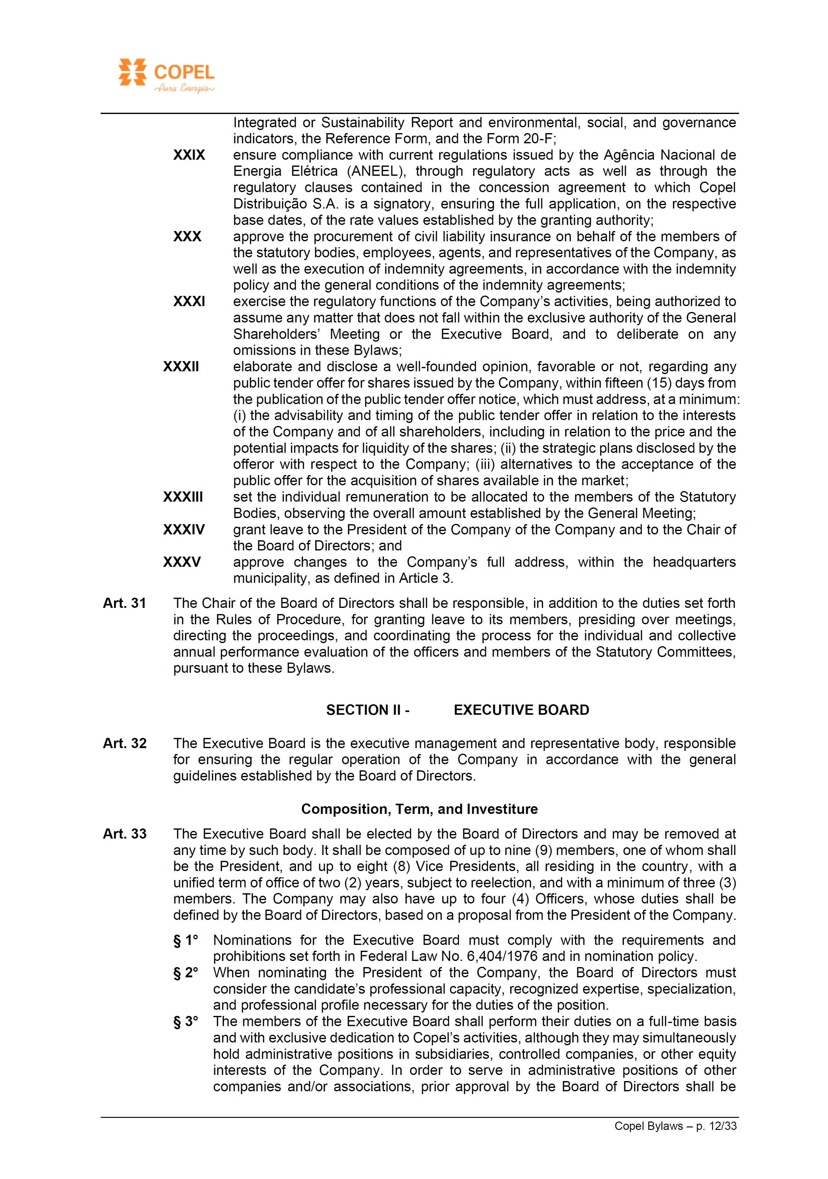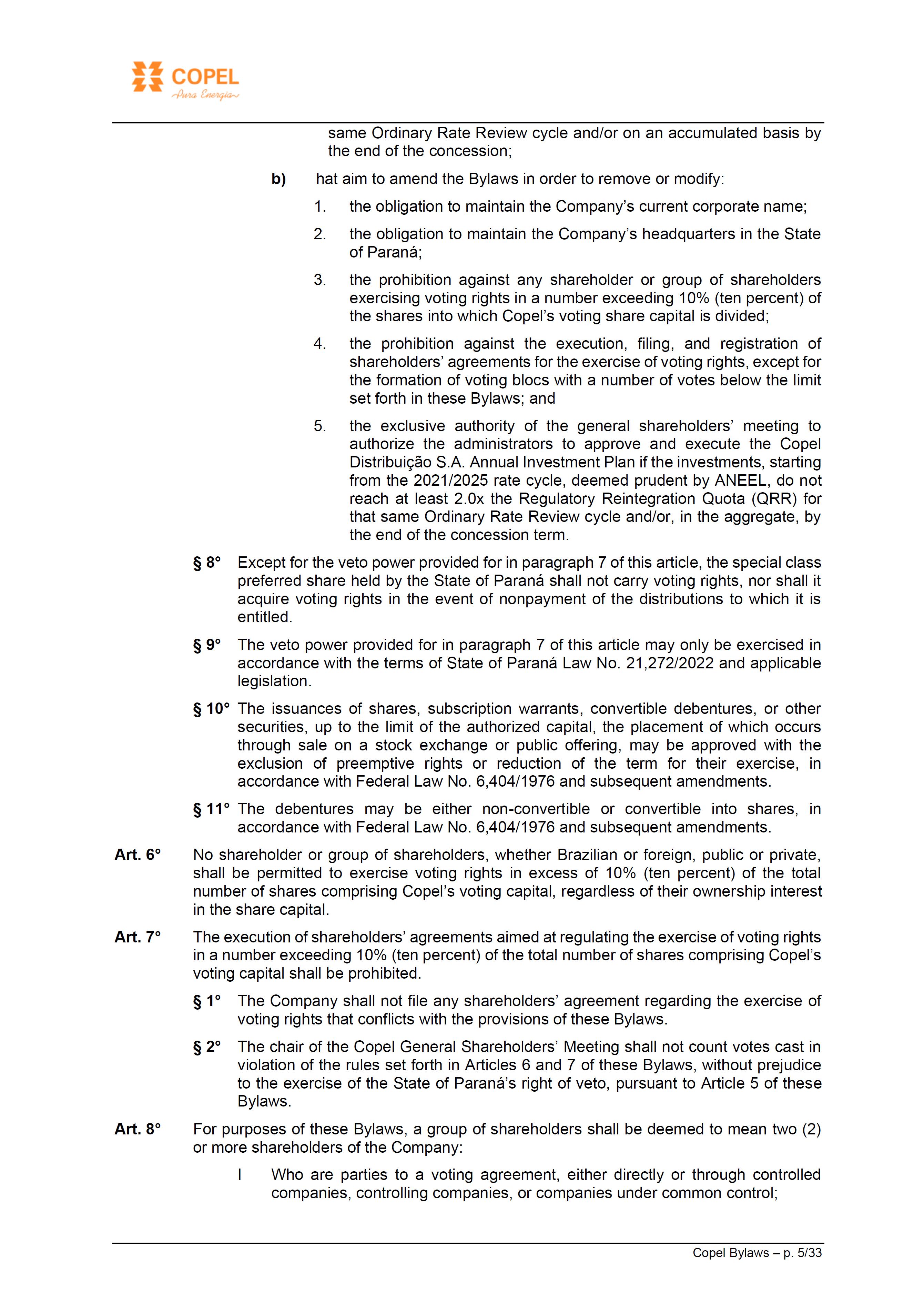 BYLAWS OF COMPANHIA PARANAENSE DE ENERGIA Approved and consolidated by the 212th Extraordinary General Meeting of Shareholders, held on 08/22/2025. CNPJ (Cadastro Nacional de Pessoas Jurídicas [National Registry of Legal Entities]): 76.483.817/0001-20 NIRE (Número de Identificação no Registro de Empresas [Company Register Identification Number]): 41300036535 CVM (Comissão de Valores Mobiliários [Securities and Exchange Commission]) Registration: 1431-1 Rua José Izidoro Biazetto, 158, Bloco A Curitiba - Paraná - Brazil ZIP Code: 81200-240 email: copel@copel.com Website: http://www.copel.com Phone: (41) 3310-5050 Fax: (41) 3331-4145 Copel Bylaws – p. 1/33 SUMMARY CHAPTER I - CORPORATE NAME, DURATION, HEADQUARTERS AND CORPORATE PURPOSE .............................................................................................................. 3 CHAPTER II - SHARE CAPITAL AND SHARES .......................................................................... 3 CHAPTER III - GENERAL SHAREHOLDERS’ MEETING (GSM) ................................................. 6 CHAPTER IV - MANAGEMENT OF THE COMPANY .................................................................... 8 SEÇÃO I - BOARD OF DIRECTORS (BOD) .................................................... 8 Composition, Appointment, and Term of Office ..................................................... 8 Vacancy and Substitutions ..................................................................................... 8 Operations .............................................................................................................. 9 Powers and Duties .................................................................................................. 9 SEÇÃO II - EXECUTIVE BOARD .................................................................... 12 Composition, Term, and Investiture ...................................................................... 12 Powers and Duties ................................................................................................ 13 Representation of the Company ........................................................................... 14 Vacancy and Substitution ..................................................................................... 15 SEÇÃO III - EXECUTIVE BOARD MEETINGS (REDIR) ................................. 15 Operations ............................................................................................................ 15 Powers and Duties ................................................................................................ 16 CHAPTER V - STATUTORY COMMITTEES ............................................................................... 18 SEÇÃO I - STATUTORY AUDIT COMMITTEE (CAE) ................................... 18 SEÇÃO II - INVESTMENT AND INNOVATION COMMITTEE (CII) ................ 19 SEÇÃO III - SUSTAINABLE DEVELOPMENT COMMITTEE (CDS) ............... 20 SEÇÃO IV - PEOPLE COMMITTEE (CDG, COMITÊ DE GENTE) .................. 21 CHAPTER VI - SUPERVISORY BOARD (SB) ............................................................................. 21 Composition and Operation .................................................................................. 21 Vacancy and Substitutions ................................................................................... 22 Representation and Opinions ............................................................................... 22 CHAPTER VII - COMMON RULES APPLICABLE TO THE STATUTORY BODIES ................... 22 Investiture, Impediments, and Restrictions .......................................................... 22 Compensation ....................................................................................................... 23 CHAPTER VIII - FISCAL YEAR, FINANCIAL STATEMENTS, PROFITS, RESERVES, AND DISTRIBUTION OF RESULTS ............................................................................ 24 CHAPTER IX - DISSOLUTION AND LIQUIDATION .................................................................... 25 CHAPTER X - DEFENSE MECHANISMS ................................................................................... 25 CHAPTER XI - CHANGE OF CONTROL AND EXIT FROM THE NOVO MERCADO ................ 26 CHAPTER XII - PROTECTION OF PUBLIC FLOAT ..................................................................... 26 CHAPTER XIII - DISPUTE RESOLUTION ..................................................................................... 27 CHAPTER XIV - GENERAL PROVISIONS ..................................................................................... 27 ANNEXES: I AMENDMENTS TO THE BYLAWS ............................ Erro! Indicador não definido. II EVOLUTION OF SHARE CAPITAL ........................... Erro! Indicador não definido. Copel Bylaws – p. 2/33 DEFINITIONS: GSM: GENERAL SHAREHOLDERS’ MEETING EGSM: EXTRAORDINARY GENERAL SHAREHOLDERS’ MEETING JUCEPAR: COMMERCIAL REGISTRY OF THE STATE OF PARANÁ (JUNTA COMERCIAL DO ESTADO DO PARANÁ) DOE PR: OFFICIAL GAZETTE OF THE STATE OF PARANÁ (DIÁRIO OFICIAL DO ESTADO DO PARANÁ) Note: The original text was filed with JUCEPAR under No. 17,340 (now 41300036535) on 06/16/1955 and published in the DOE PR dated 06/25/1955. Copel Bylaws – p. 3/33 CHAPTER I - CORPORATE NAME, DURATION, HEADQUARTERS AND CORPORATE PURPOSE Art. 1° Companhia Paranaense de Energia – Copel, hereinafter referred to as “Copel” or the “Company,” is a publicly held corporation, endowed with legal personality under private law, governed by these Bylaws and by the applicable legislation. § 1º The Company’s corporate name may not be altered. § 2º With the Company's entry into the Novo Mercado da B3 S.A. – Brazil, Bolsa, Balcão ("B3"), the Company, its shareholders, including controlling shareholders, administrators and members of the Supervisory Board, when installed, are subject to the provisions of the Novo Mercado Regulation. A