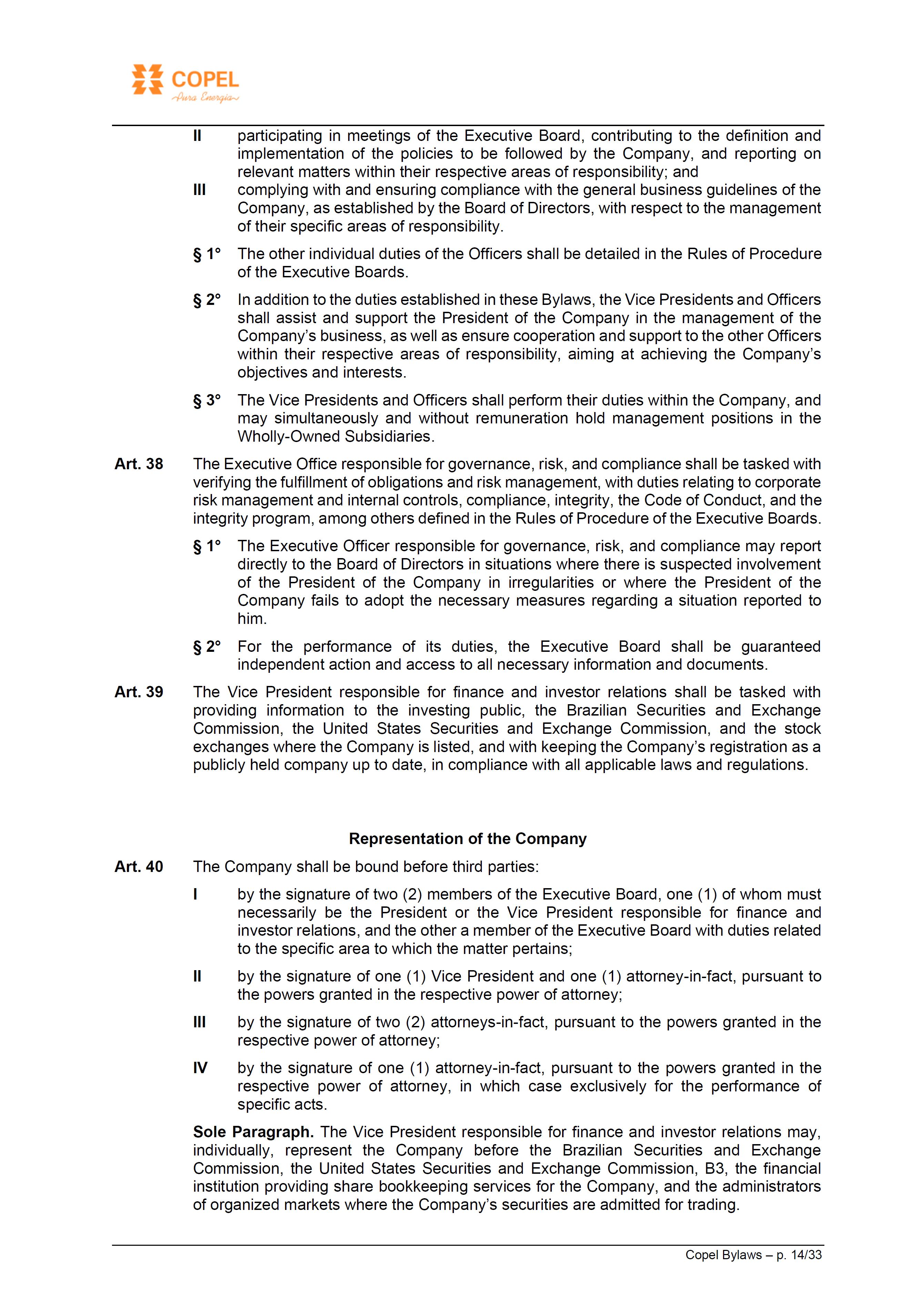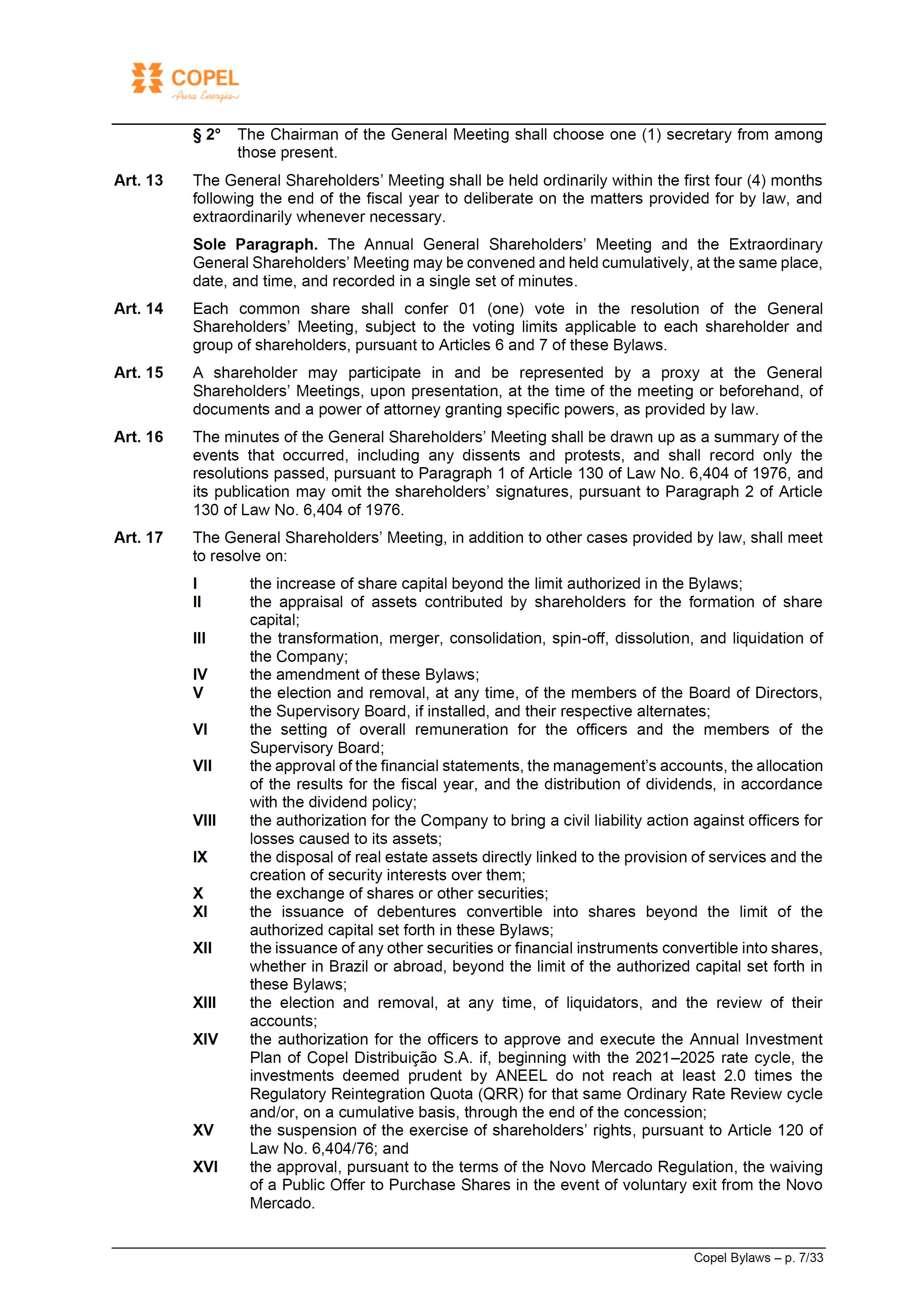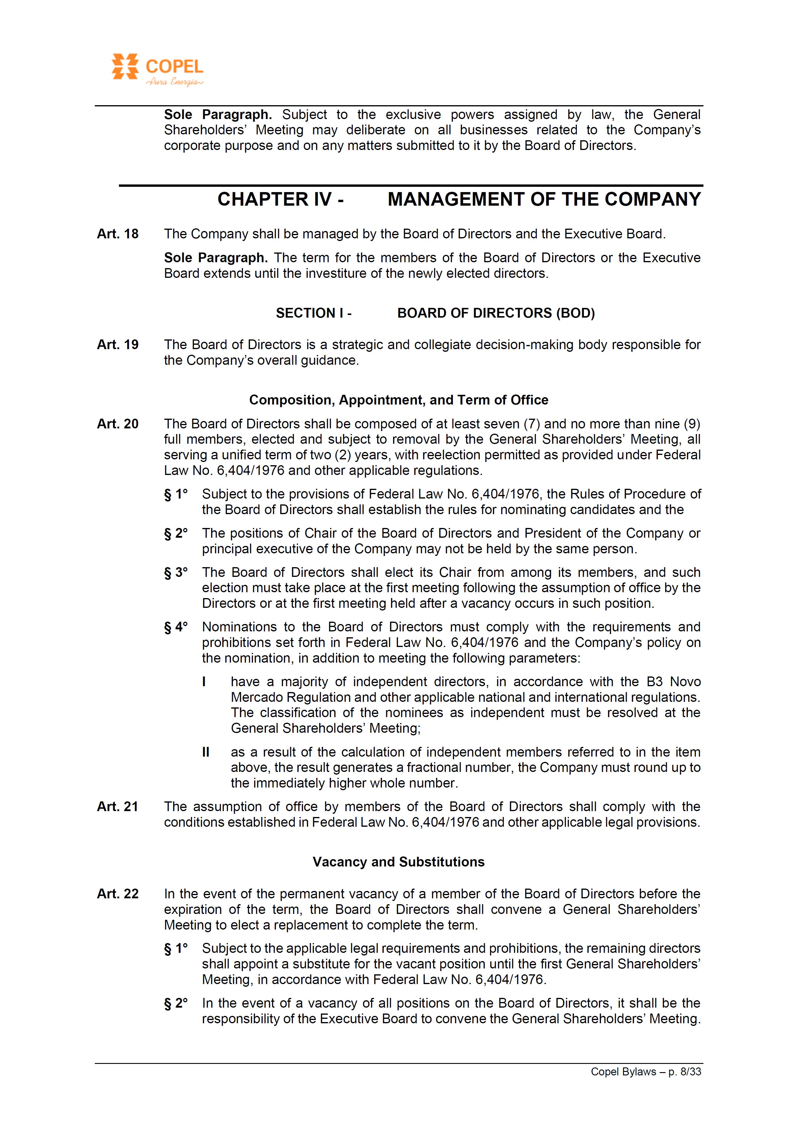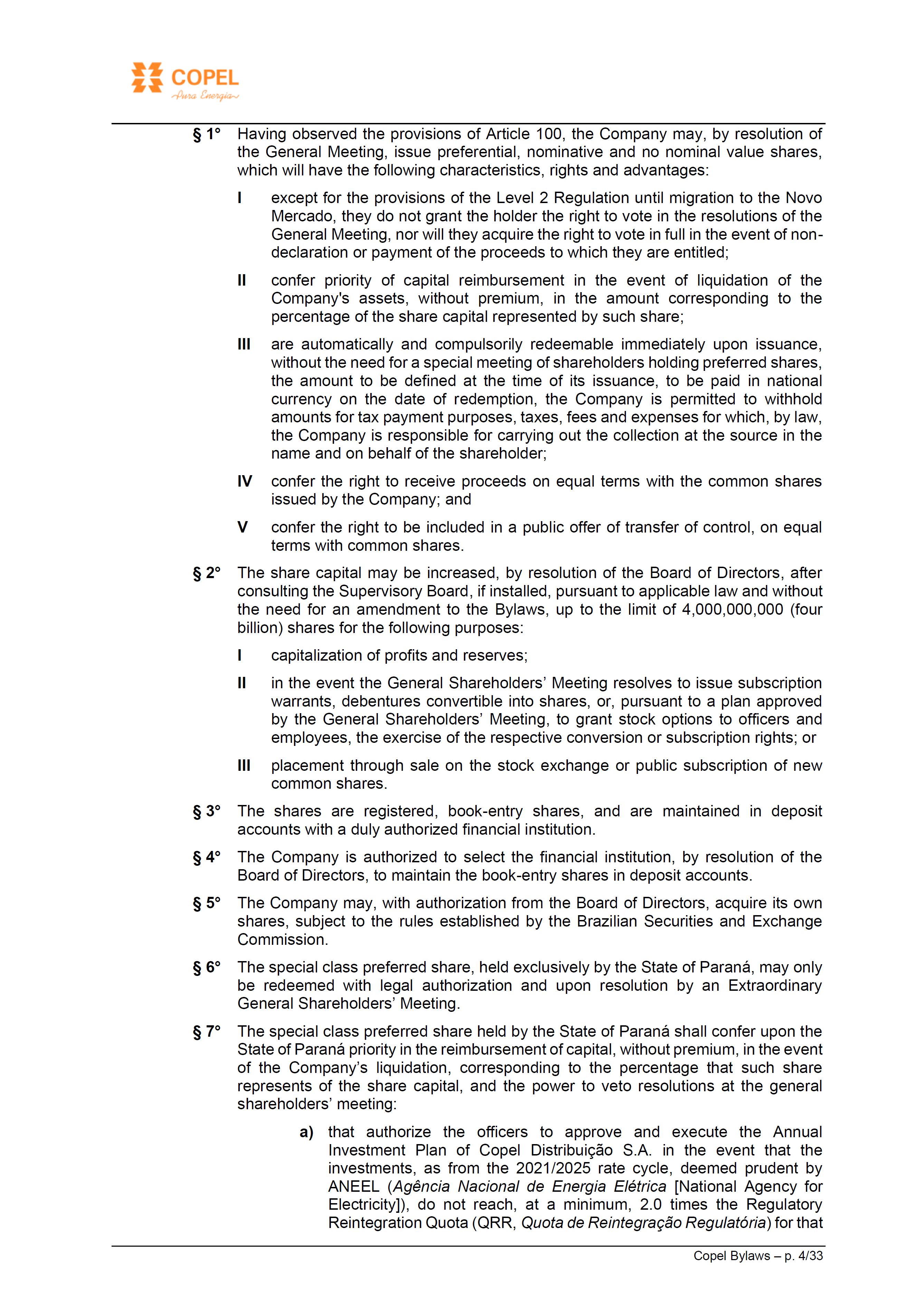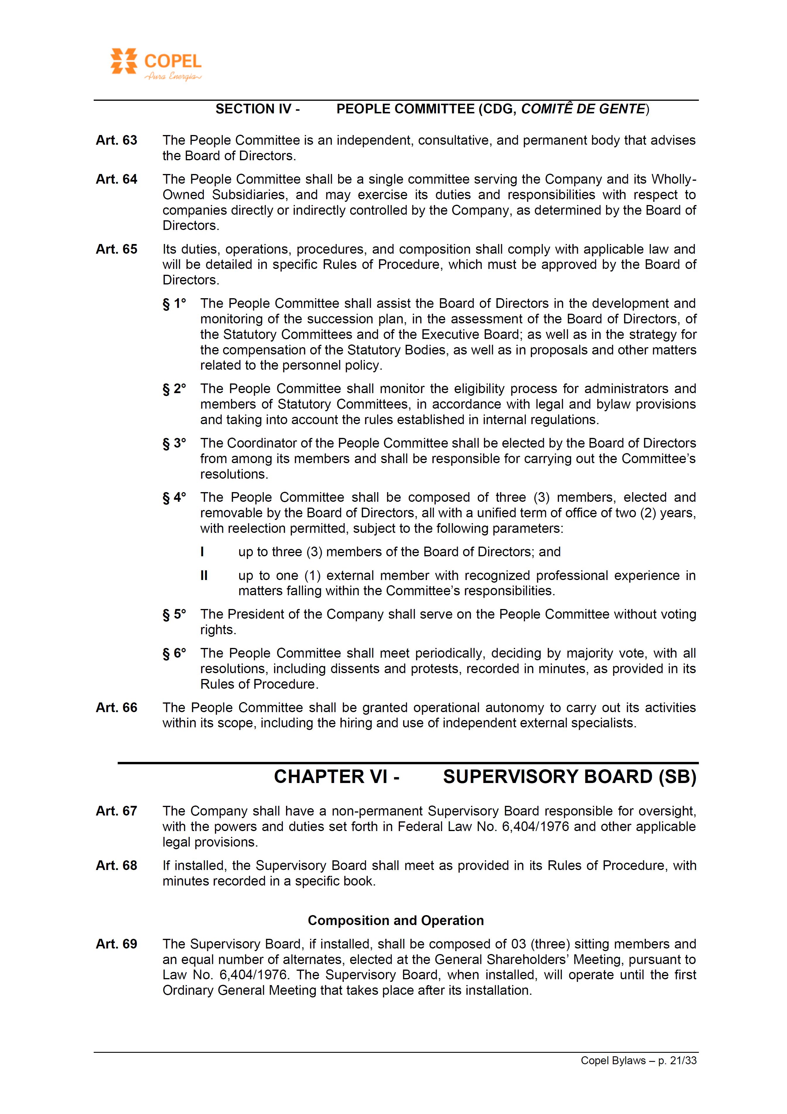 BYLAWS OF COMPANHIA PARANAENSE DE ENERGIA Approved and consolidated by the 212th Extraordinary General Meeting of Shareholders, held on 08/22/2025. CNPJ (Cadastro Nacional de Pessoas Jurídicas [National Registry of Legal Entities]): 76.483.817/0001-20 NIRE (Número de Identificação no Registro de Empresas [Company Register Identification Number]): 41300036535 CVM (Comissão de Valores Mobiliários [Securities and Exchange Commission]) Registration: 1431-1 Rua José Izidoro Biazetto, 158, Bloco A Curitiba - Paraná - Brazil ZIP Code: 81200-240 email: copel@copel.com Website: http://www.copel.com Phone: (41) 3310-5050 Fax: (41) 3331-4145 Copel Bylaws – p. 1/33 SUMMARY CHAPTER I - CORPORATE NAME, DURATION, HEADQUARTERS AND CORPORATE PURPOSE .............................................................................................................. 3 CHAPTER II - SHARE CAPITAL AND SHARES .......................................................................... 3 CHAPTER III - GENERAL SHAREHOLDERS’ MEETING (GSM) ................................................. 6 CHAPTER IV - MANAGEMENT OF THE COMPANY .................................................................... 8 SEÇÃO I - BOARD OF DIRECTORS (BOD) .................................................... 8 Composition, Appointment, and Term of Office ..................................................... 8 Vacancy and Substitutions ..................................................................................... 8 Operations .............................................................................................................. 9 Powers and Duties .................................................................................................. 9 SEÇÃO II - EXECUTIVE BOARD .................................................................... 12 Composition, Term, and Investiture ...................................................................... 12 Powers and Duties ................................................................................................ 13 Representation of the Company ........................................................................... 14 Vacancy and Substitution ..................................................................................... 15 SEÇÃO III - EXECUTIVE BOARD MEETINGS (REDIR) ................................. 15 Operations ............................................................................................................ 15 Powers and Duties ................................................................................................ 16 CHAPTER V - STATUTORY COMMITTEES ............................................................................... 18 SEÇÃO I - STATUTORY AUDIT COMMITTEE (CAE) ................................... 18 SEÇÃO II - INVESTMENT AND INNOVATION COMMITTEE (CII) ................ 19 SEÇÃO III - SUSTAINABLE DEVELOPMENT COMMITTEE (CDS) ............... 20 SEÇÃO IV - PEOPLE COMMITTEE (CDG, COMITÊ DE GENTE) .................. 21 CHAPTER VI - SUPERVISORY BOARD (SB) ............................................................................. 21 Composition and Operation .................................................................................. 21 Vacancy and Substitutions ................................................................................... 22 Representation and Opinions ............................................................................... 22 CHAPTER VII - COMMON RULES APPLICABLE TO THE STATUTORY BODIES ................... 22 Investiture, Impediments, and Restrictions .......................................................... 22 Compensation ....................................................................................................... 23 CHAPTER VIII - FISCAL YEAR, FINANCIAL STATEMENTS, PROFITS, RESERVES, AND DISTRIBUTION OF RESULTS ............................................................................ 24 CHAPTER IX - DISSOLUTION AND LIQUIDATION .................................................................... 25 CHAPTER X - DEFENSE MECHANISMS ................................................................................... 25 CHAPTER XI - CHANGE OF CONTROL AND EXIT FROM THE NOVO MERCADO ................ 26 CHAPTER XII - PROTECTION OF PUBLIC FLOAT ..................................................................... 26 CHAPTER XIII - DISPUTE RESOLUTION ..................................................................................... 27 CHAPTER XIV - GENERAL PROVISIONS ..................................................................................... 27 ANNEXES: I AMENDMENTS TO THE BYLAWS ............................ Erro! Indicador não definido. II EVOLUTION OF SHARE CAPITAL ........................... Erro! Indicador não definido. Copel Bylaws – p. 2/33 DEFINITIONS: GSM: GENERAL SHAREHOLDERS’ MEETING EGSM: EXTRAORDINARY GENERAL SHAREHOLDERS’ MEETING JUCEPAR: COMMERCIAL REGISTRY OF THE STATE OF PARANÁ (JUNTA COMERCIAL DO ESTADO DO PARANÁ) DOE PR: OFFICIAL GAZETTE OF THE STATE OF PARANÁ (DIÁRIO OFICIAL DO ESTADO DO PARANÁ) Note: The original text was filed with JUCEPAR under No. 17,340 (now 41300036535) on 06/16/1955 and published in the DOE PR dated 06/25/1955. Copel Bylaws – p. 3/33 CHAPTER I - CORPORATE NAME, DURATION, HEADQUARTERS AND CORPORATE PURPOSE Art. 1° Companhia Paranaense de Energia – Copel, hereinafter referred to as “Copel” or the “Company,” is a publicly held corporation, endowed with legal personality under private law, governed by these Bylaws and by the applicable legislation. § 1º The Company’s corporate name may not be altered. § 2º With the Company's entry into the Novo Mercado da B3 S.A. – Brazil, Bolsa, Balcão ("B3"), the Company, its shareholders, including controlling shareholders, administrators and members of the Supervisory Board, when installed, are subject to the provisions of the Novo Mercado Regulation. A