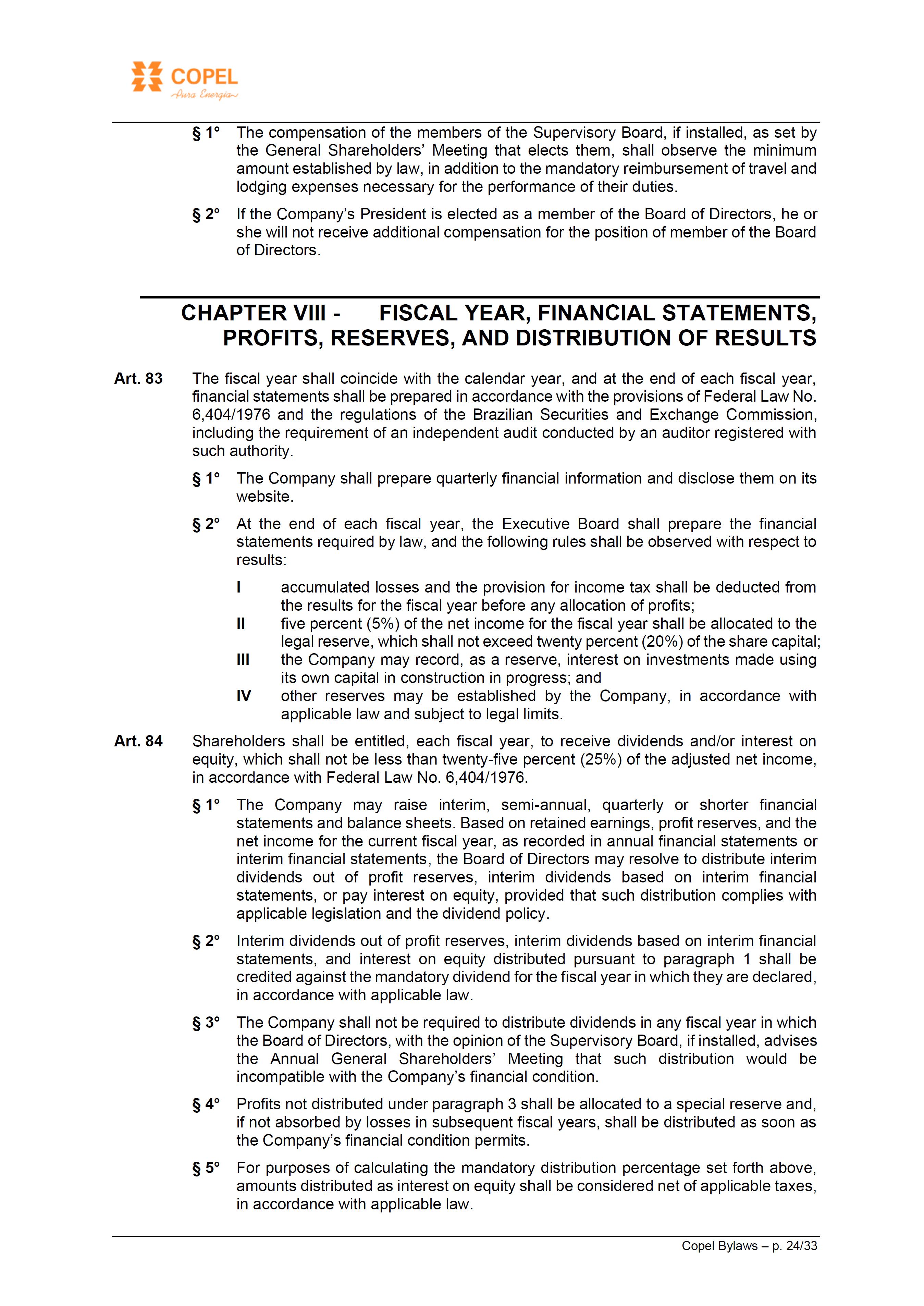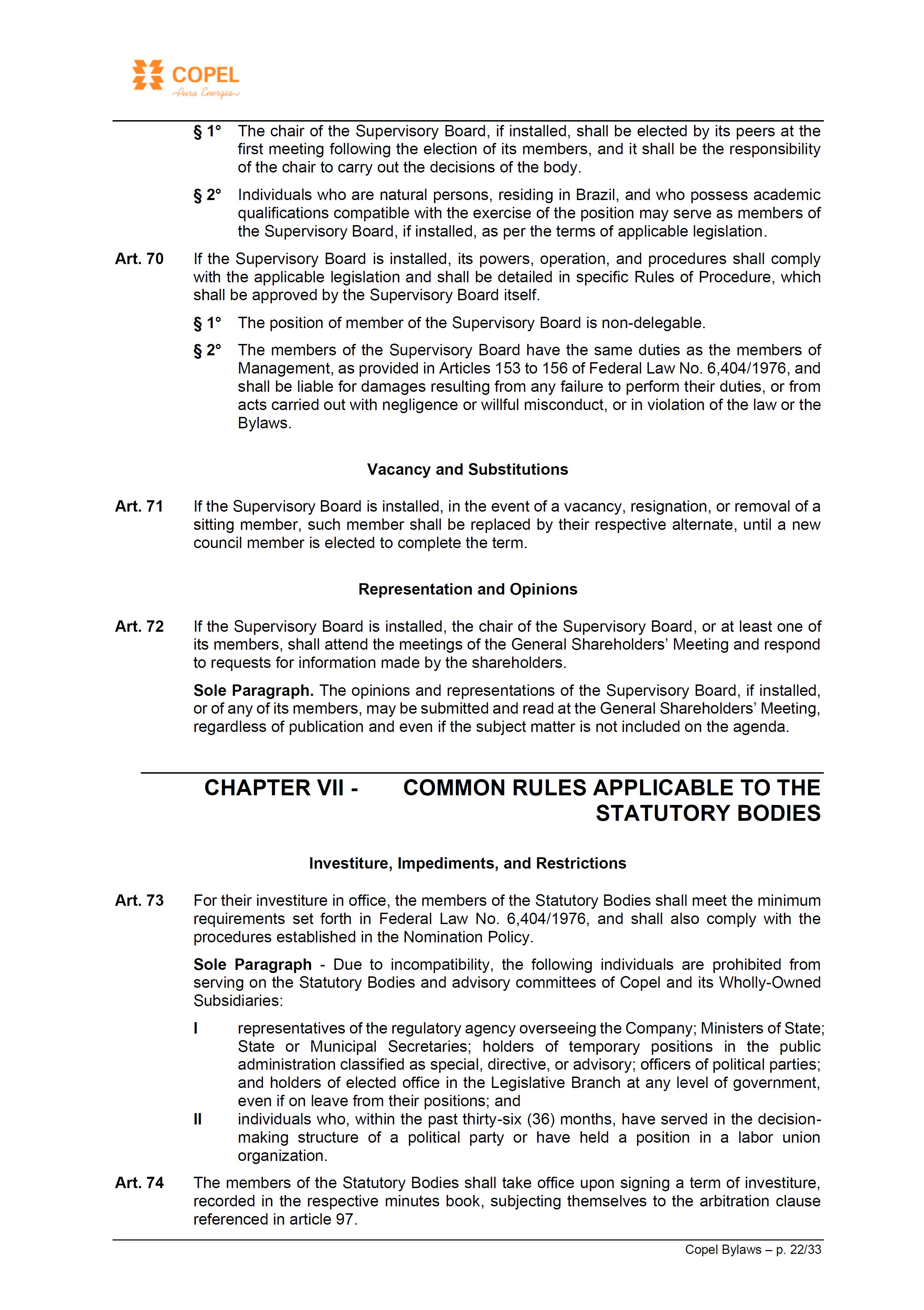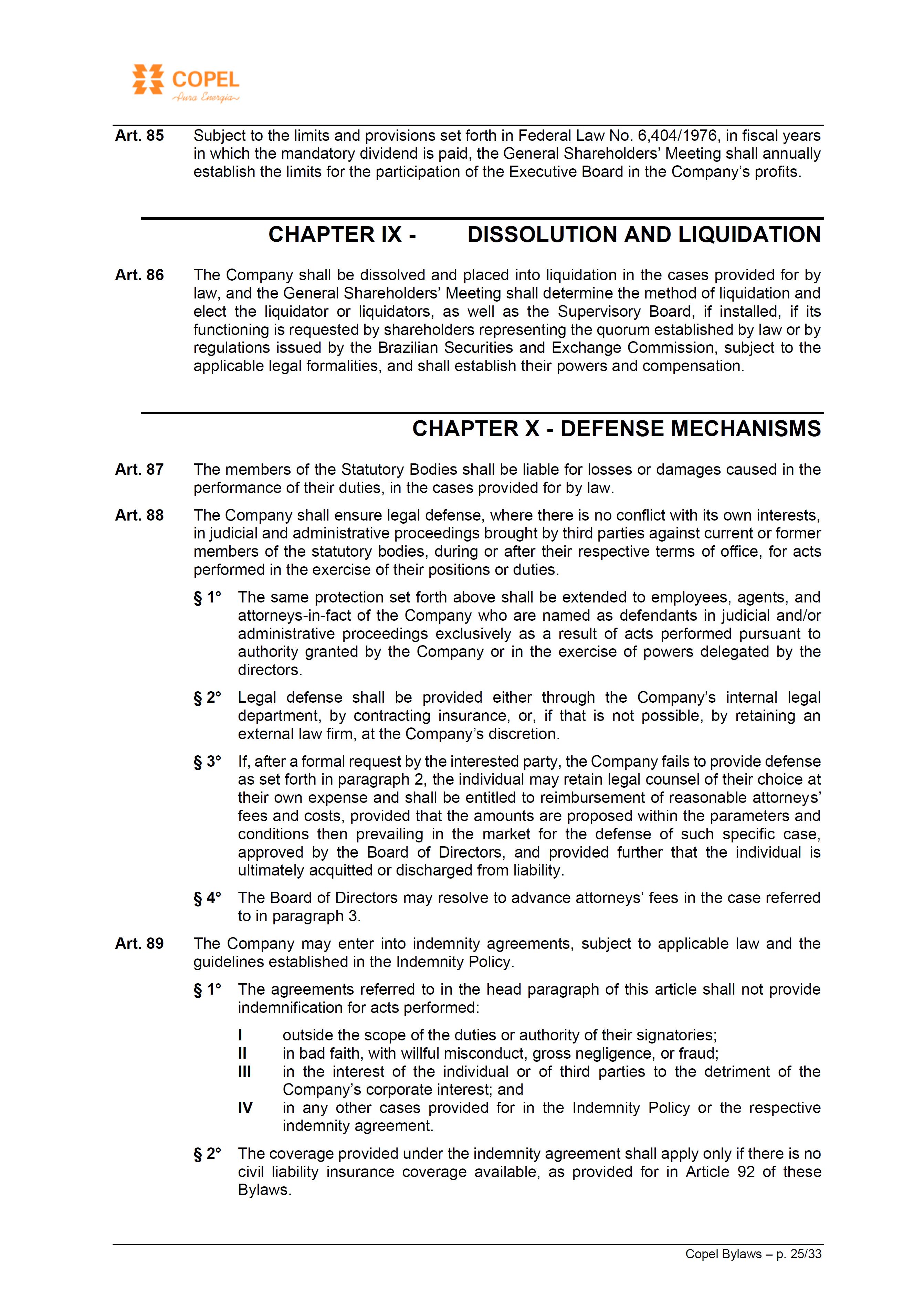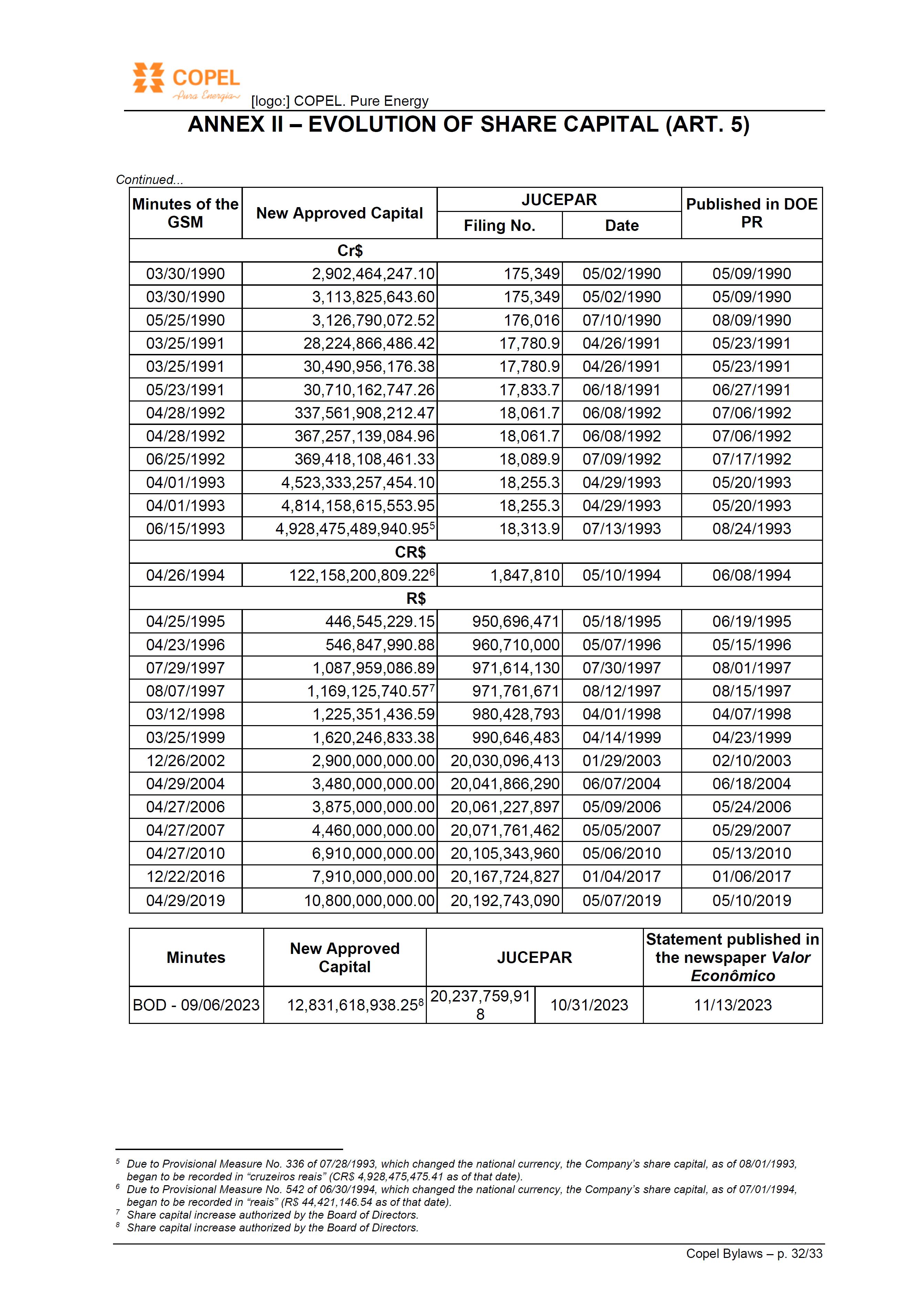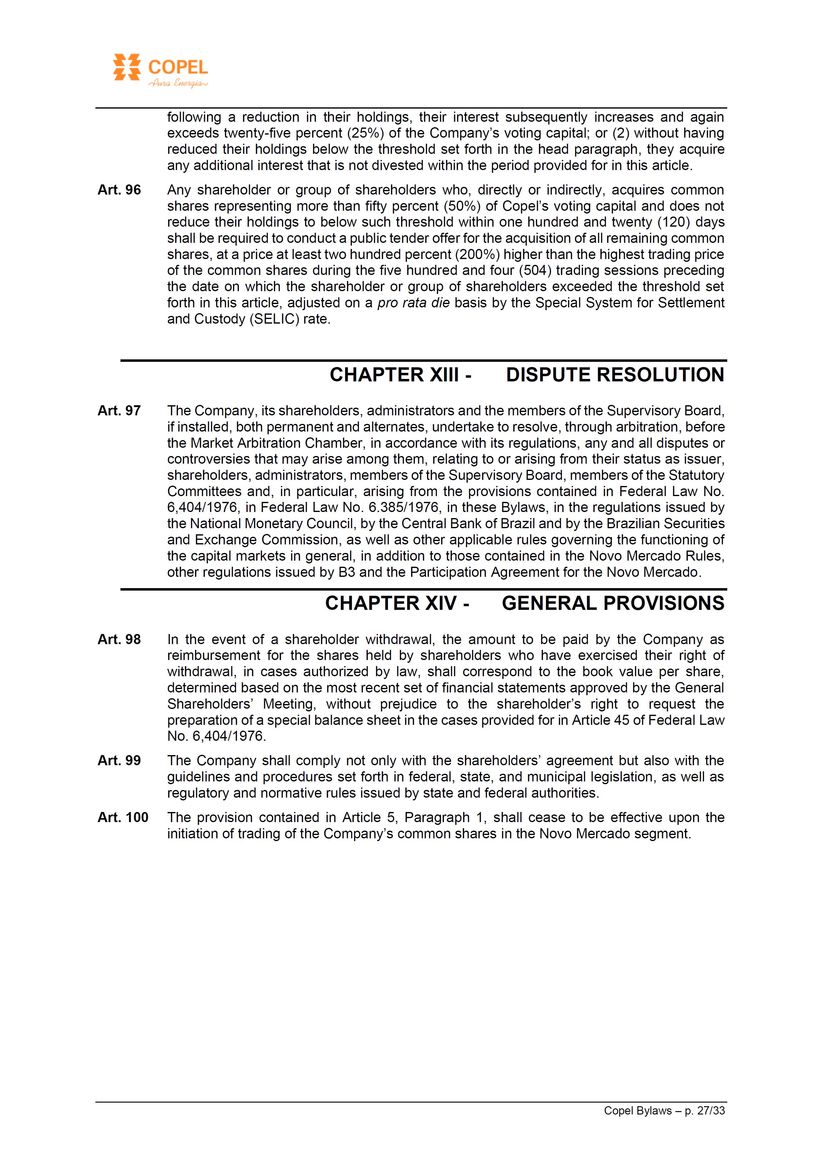 BYLAWS OF COMPANHIA PARANAENSE DE ENERGIA Approved and consolidated by the 212th Extraordinary General Meeting of Shareholders, held on 08/22/2025. CNPJ (Cadastro Nacional de Pessoas Jurídicas [National Registry of Legal Entities]): 76.483.817/0001-20 NIRE (Número de Identificação no Registro de Empresas [Company Register Identification Number]): 41300036535 CVM (Comissão de Valores Mobiliários [Securities and Exchange Commission]) Registration: 1431-1 Rua José Izidoro Biazetto, 158, Bloco A Curitiba - Paraná - Brazil ZIP Code: 81200-240 email: copel@copel.com Website: http://www.copel.com Phone: (41) 3310-5050 Fax: (41) 3331-4145 Copel Bylaws – p. 1/33 SUMMARY CHAPTER I - CORPORATE NAME, DURATION, HEADQUARTERS AND CORPORATE PURPOSE .............................................................................................................. 3 CHAPTER II - SHARE CAPITAL AND SHARES .......................................................................... 3 CHAPTER III - GENERAL SHAREHOLDERS’ MEETING (GSM) ................................................. 6 CHAPTER IV - MANAGEMENT OF THE COMPANY .................................................................... 8 SEÇÃO I - BOARD OF DIRECTORS (BOD) .................................................... 8 Composition, Appointment, and Term of Office ..................................................... 8 Vacancy and Substitutions ..................................................................................... 8 Operations .............................................................................................................. 9 Powers and Duties .................................................................................................. 9 SEÇÃO II - EXECUTIVE BOARD .................................................................... 12 Composition, Term, and Investiture ...................................................................... 12 Powers and Duties ................................................................................................ 13 Representation of the Company ........................................................................... 14 Vacancy and Substitution ..................................................................................... 15 SEÇÃO III - EXECUTIVE BOARD MEETINGS (REDIR) ................................. 15 Operations ............................................................................................................ 15 Powers and Duties ................................................................................................ 16 CHAPTER V - STATUTORY COMMITTEES ............................................................................... 18 SEÇÃO I - STATUTORY AUDIT COMMITTEE (CAE) ................................... 18 SEÇÃO II - INVESTMENT AND INNOVATION COMMITTEE (CII) ................ 19 SEÇÃO III - SUSTAINABLE DEVELOPMENT COMMITTEE (CDS) ............... 20 SEÇÃO IV - PEOPLE COMMITTEE (CDG, COMITÊ DE GENTE) .................. 21 CHAPTER VI - SUPERVISORY BOARD (SB) ............................................................................. 21 Composition and Operation .................................................................................. 21 Vacancy and Substitutions ................................................................................... 22 Representation and Opinions ............................................................................... 22 CHAPTER VII - COMMON RULES APPLICABLE TO THE STATUTORY BODIES ................... 22 Investiture, Impediments, and Restrictions .......................................................... 22 Compensation ....................................................................................................... 23 CHAPTER VIII - FISCAL YEAR, FINANCIAL STATEMENTS, PROFITS, RESERVES, AND DISTRIBUTION OF RESULTS ............................................................................ 24 CHAPTER IX - DISSOLUTION AND LIQUIDATION .................................................................... 25 CHAPTER X - DEFENSE MECHANISMS ................................................................................... 25 CHAPTER XI - CHANGE OF CONTROL AND EXIT FROM THE NOVO MERCADO ................ 26 CHAPTER XII - PROTECTION OF PUBLIC FLOAT ..................................................................... 26 CHAPTER XIII - DISPUTE RESOLUTION ..................................................................................... 27 CHAPTER XIV - GENERAL PROVISIONS ..................................................................................... 27 ANNEXES: I AMENDMENTS TO THE BYLAWS ............................ Erro! Indicador não definido. II EVOLUTION OF SHARE CAPITAL ........................... Erro! Indicador não definido. Copel Bylaws – p. 2/33 DEFINITIONS: GSM: GENERAL SHAREHOLDERS’ MEETING EGSM: EXTRAORDINARY GENERAL SHAREHOLDERS’ MEETING JUCEPAR: COMMERCIAL REGISTRY OF THE STATE OF PARANÁ (JUNTA COMERCIAL DO ESTADO DO PARANÁ) DOE PR: OFFICIAL GAZETTE OF THE STATE OF PARANÁ (DIÁRIO OFICIAL DO ESTADO DO PARANÁ) Note: The original text was filed with JUCEPAR under No. 17,340 (now 41300036535) on 06/16/1955 and published in the DOE PR dated 06/25/1955. Copel Bylaws – p. 3/33 CHAPTER I - CORPORATE NAME, DURATION, HEADQUARTERS AND CORPORATE PURPOSE Art. 1° Companhia Paranaense de Energia – Copel, hereinafter referred to as “Copel” or the “Company,” is a publicly held corporation, endowed with legal personality under private law, governed by these Bylaws and by the applicable legislation. § 1º The Company’s corporate name may not be altered. § 2º With the Company's entry into the Novo Mercado da B3 S.A. – Brazil, Bolsa, Balcão ("B3"), the Company, its shareholders, including controlling shareholders, administrators and members of the Supervisory Board, when installed, are subject to the provisions of the Novo Mercado Regulation. A