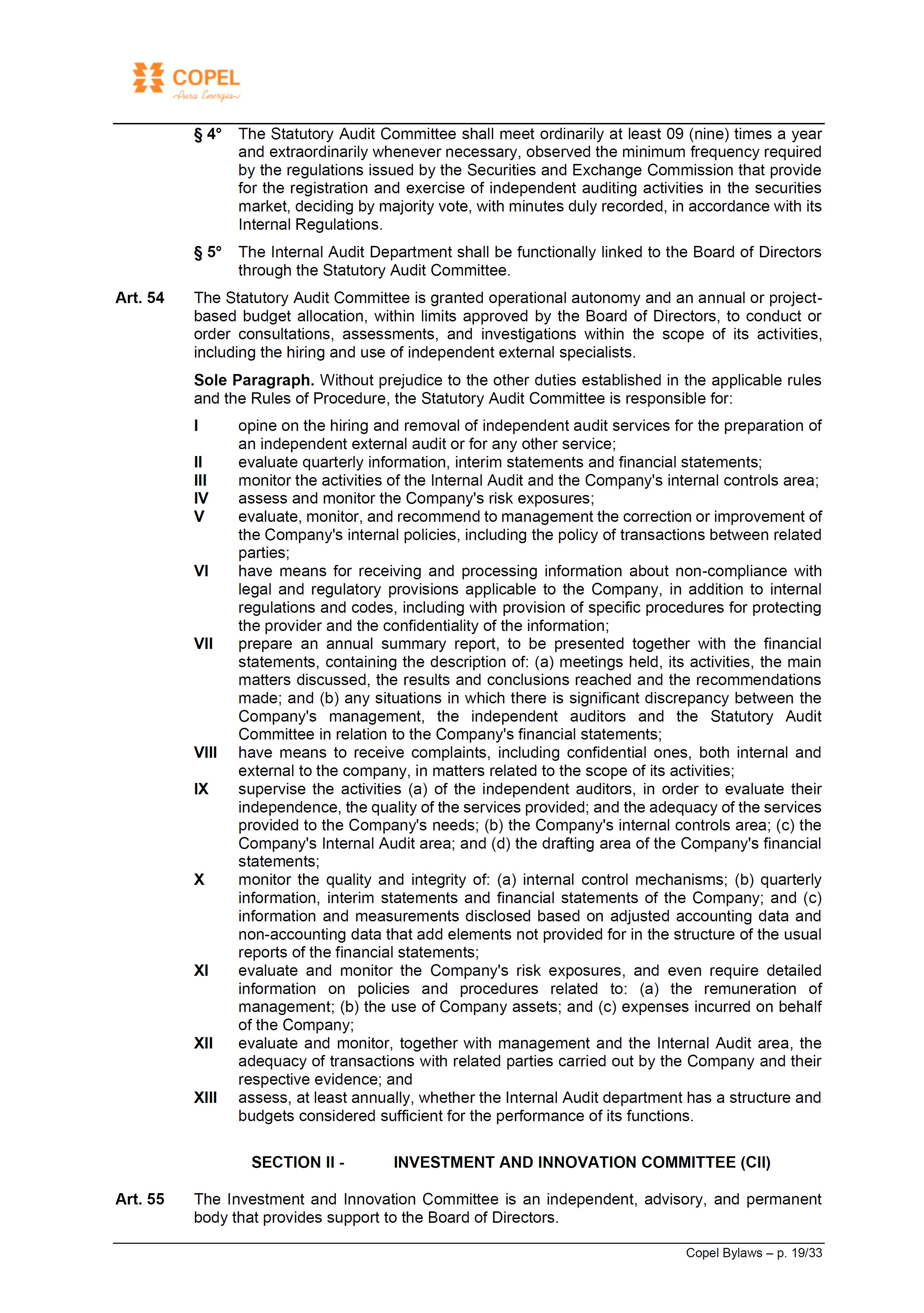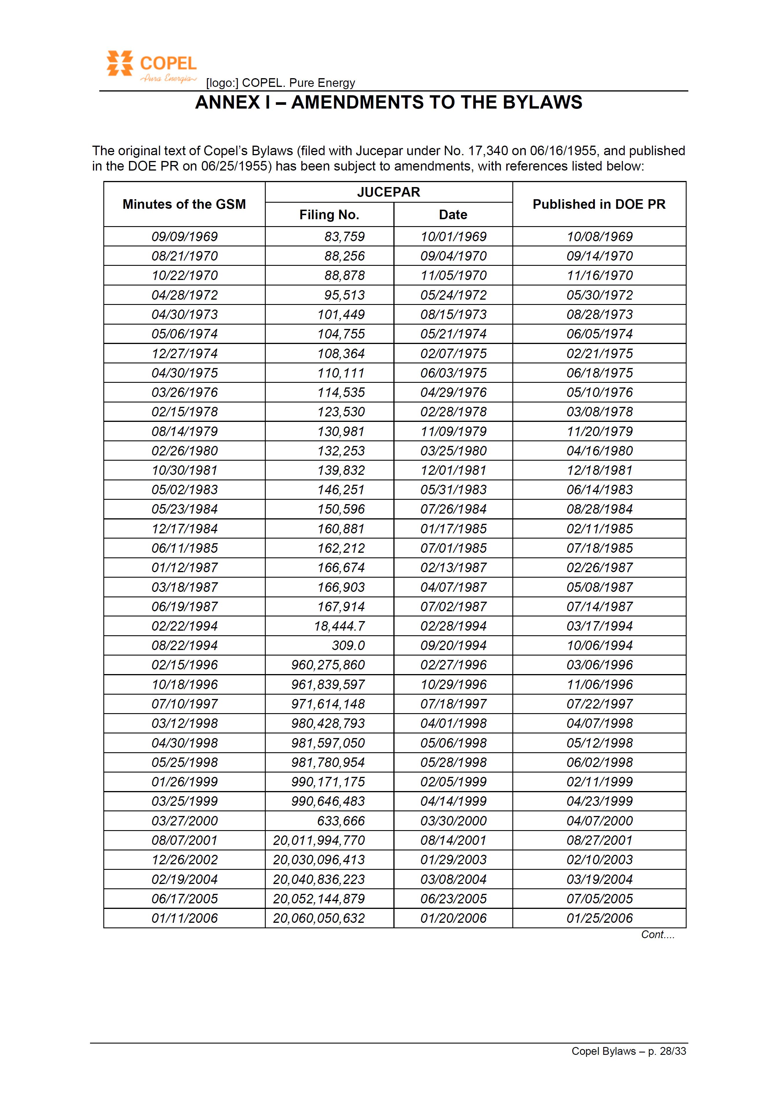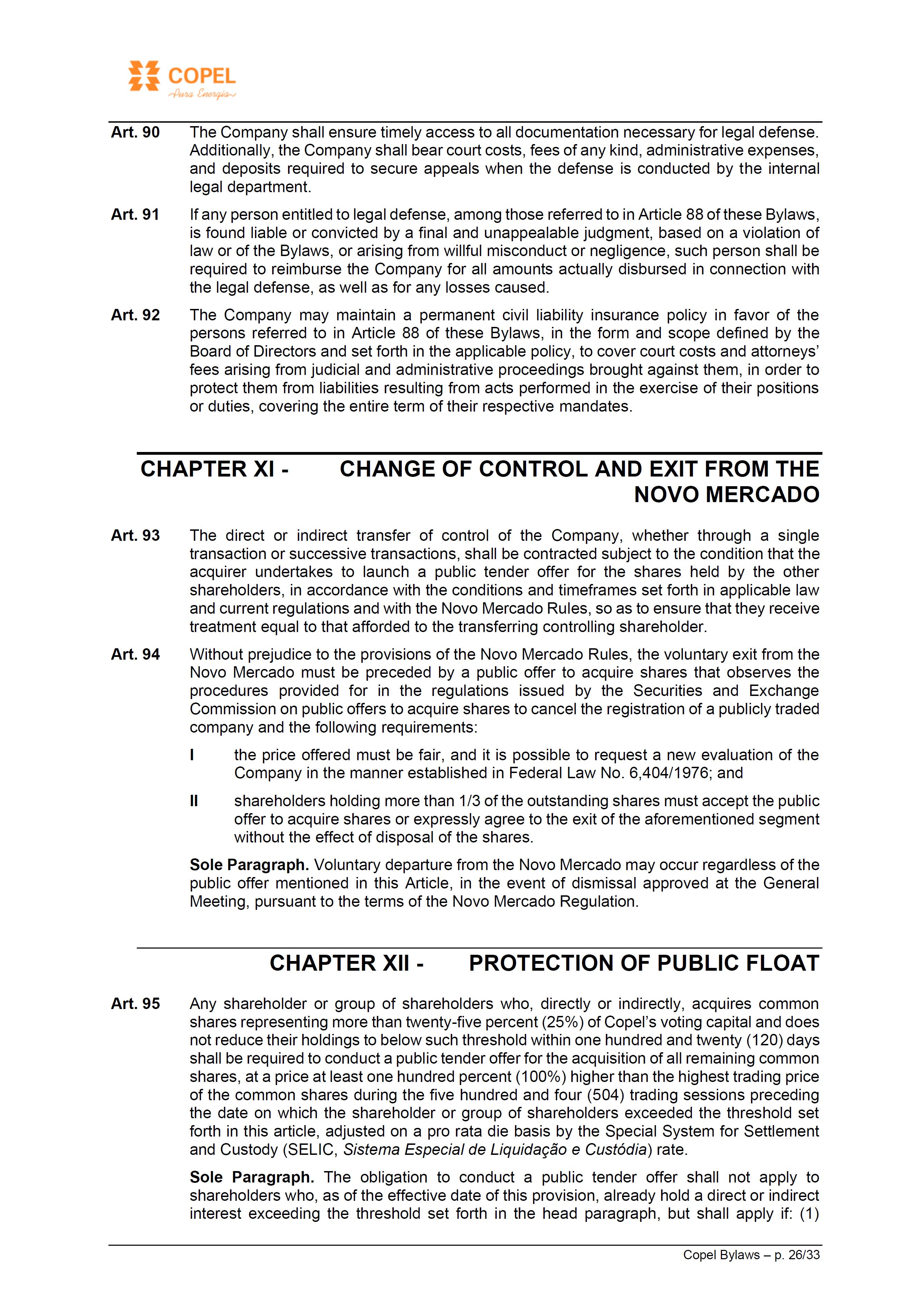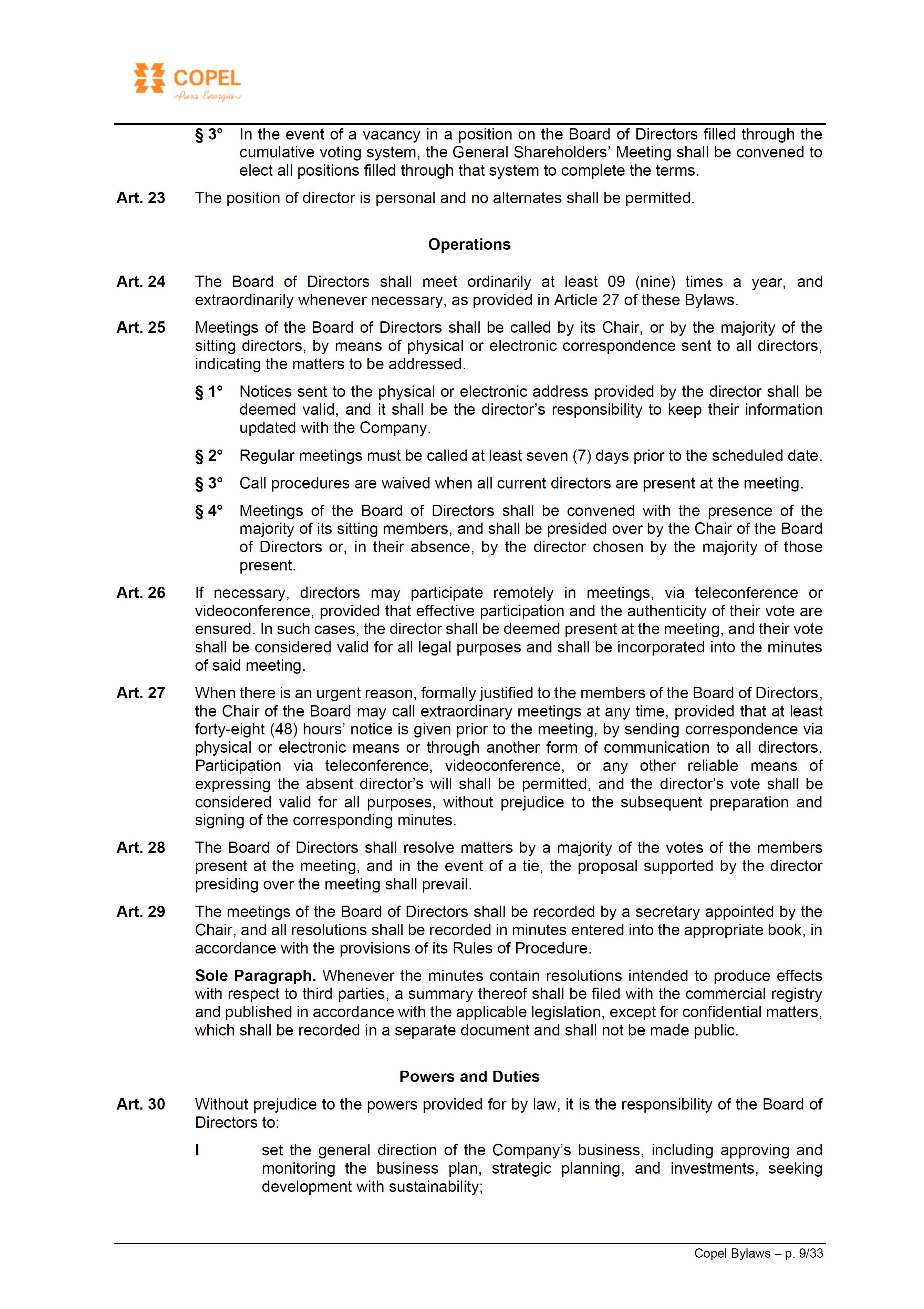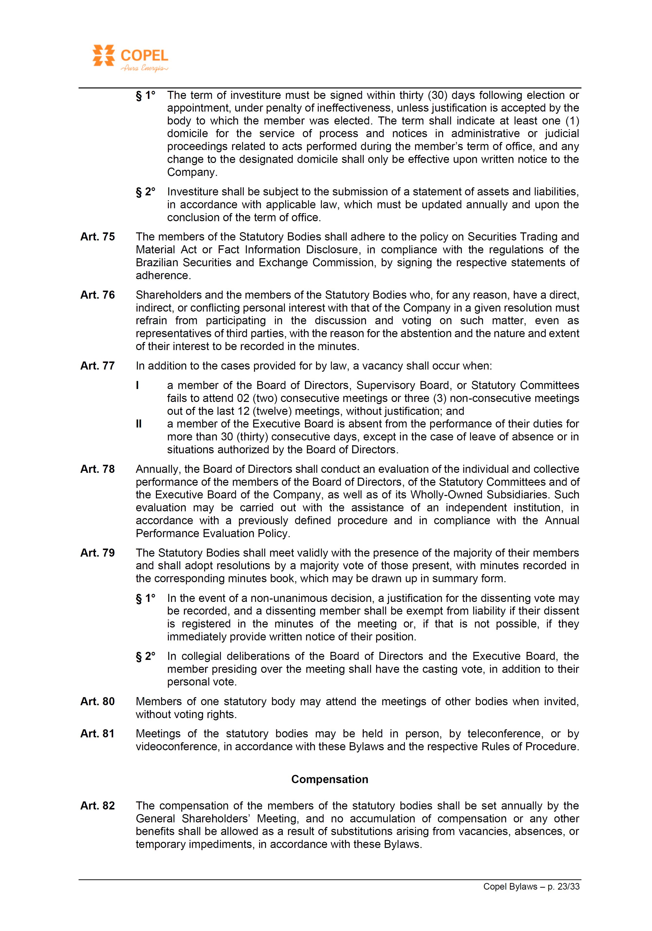 BYLAWS OF COMPANHIA PARANAENSE DE ENERGIA Approved and consolidated by the 212th Extraordinary General Meeting of Shareholders, held on 08/22/2025. CNPJ (Cadastro Nacional de Pessoas Jurídicas [National Registry of Legal Entities]): 76.483.817/0001-20 NIRE (Número de Identificação no Registro de Empresas [Company Register Identification Number]): 41300036535 CVM (Comissão de Valores Mobiliários [Securities and Exchange Commission]) Registration: 1431-1 Rua José Izidoro Biazetto, 158, Bloco A Curitiba - Paraná - Brazil ZIP Code: 81200-240 email: copel@copel.com Website: http://www.copel.com Phone: (41) 3310-5050 Fax: (41) 3331-4145 Copel Bylaws – p. 1/33 SUMMARY CHAPTER I - CORPORATE NAME, DURATION, HEADQUARTERS AND CORPORATE PURPOSE .............................................................................................................. 3 CHAPTER II - SHARE CAPITAL AND SHARES .......................................................................... 3 CHAPTER III - GENERAL SHAREHOLDERS’ MEETING (GSM) ................................................. 6 CHAPTER IV - MANAGEMENT OF THE COMPANY .................................................................... 8 SEÇÃO I - BOARD OF DIRECTORS (BOD) .................................................... 8 Composition, Appointment, and Term of Office ..................................................... 8 Vacancy and Substitutions ..................................................................................... 8 Operations .............................................................................................................. 9 Powers and Duties .................................................................................................. 9 SEÇÃO II - EXECUTIVE BOARD .................................................................... 12 Composition, Term, and Investiture ...................................................................... 12 Powers and Duties ................................................................................................ 13 Representation of the Company ........................................................................... 14 Vacancy and Substitution ..................................................................................... 15 SEÇÃO III - EXECUTIVE BOARD MEETINGS (REDIR) ................................. 15 Operations ............................................................................................................ 15 Powers and Duties ................................................................................................ 16 CHAPTER V - STATUTORY COMMITTEES ............................................................................... 18 SEÇÃO I - STATUTORY AUDIT COMMITTEE (CAE) ................................... 18 SEÇÃO II - INVESTMENT AND INNOVATION COMMITTEE (CII) ................ 19 SEÇÃO III - SUSTAINABLE DEVELOPMENT COMMITTEE (CDS) ............... 20 SEÇÃO IV - PEOPLE COMMITTEE (CDG, COMITÊ DE GENTE) .................. 21 CHAPTER VI - SUPERVISORY BOARD (SB) ............................................................................. 21 Composition and Operation .................................................................................. 21 Vacancy and Substitutions ................................................................................... 22 Representation and Opinions ............................................................................... 22 CHAPTER VII - COMMON RULES APPLICABLE TO THE STATUTORY BODIES ................... 22 Investiture, Impediments, and Restrictions .......................................................... 22 Compensation ....................................................................................................... 23 CHAPTER VIII - FISCAL YEAR, FINANCIAL STATEMENTS, PROFITS, RESERVES, AND DISTRIBUTION OF RESULTS ............................................................................ 24 CHAPTER IX - DISSOLUTION AND LIQUIDATION .................................................................... 25 CHAPTER X - DEFENSE MECHANISMS ................................................................................... 25 CHAPTER XI - CHANGE OF CONTROL AND EXIT FROM THE NOVO MERCADO ................ 26 CHAPTER XII - PROTECTION OF PUBLIC FLOAT ..................................................................... 26 CHAPTER XIII - DISPUTE RESOLUTION ..................................................................................... 27 CHAPTER XIV - GENERAL PROVISIONS ..................................................................................... 27 ANNEXES: I AMENDMENTS TO THE BYLAWS ............................ Erro! Indicador não definido. II EVOLUTION OF SHARE CAPITAL ........................... Erro! Indicador não definido. Copel Bylaws – p. 2/33 DEFINITIONS: GSM: GENERAL SHAREHOLDERS’ MEETING EGSM: EXTRAORDINARY GENERAL SHAREHOLDERS’ MEETING JUCEPAR: COMMERCIAL REGISTRY OF THE STATE OF PARANÁ (JUNTA COMERCIAL DO ESTADO DO PARANÁ) DOE PR: OFFICIAL GAZETTE OF THE STATE OF PARANÁ (DIÁRIO OFICIAL DO ESTADO DO PARANÁ) Note: The original text was filed with JUCEPAR under No. 17,340 (now 41300036535) on 06/16/1955 and published in the DOE PR dated 06/25/1955. Copel Bylaws – p. 3/33 CHAPTER I - CORPORATE NAME, DURATION, HEADQUARTERS AND CORPORATE PURPOSE Art. 1° Companhia Paranaense de Energia – Copel, hereinafter referred to as “Copel” or the “Company,” is a publicly held corporation, endowed with legal personality under private law, governed by these Bylaws and by the applicable legislation. § 1º The Company’s corporate name may not be altered. § 2º With the Company's entry into the Novo Mercado da B3 S.A. – Brazil, Bolsa, Balcão ("B3"), the Company, its shareholders, including controlling shareholders, administrators and members of the Supervisory Board, when installed, are subject to the provisions of the Novo Mercado Regulation. A