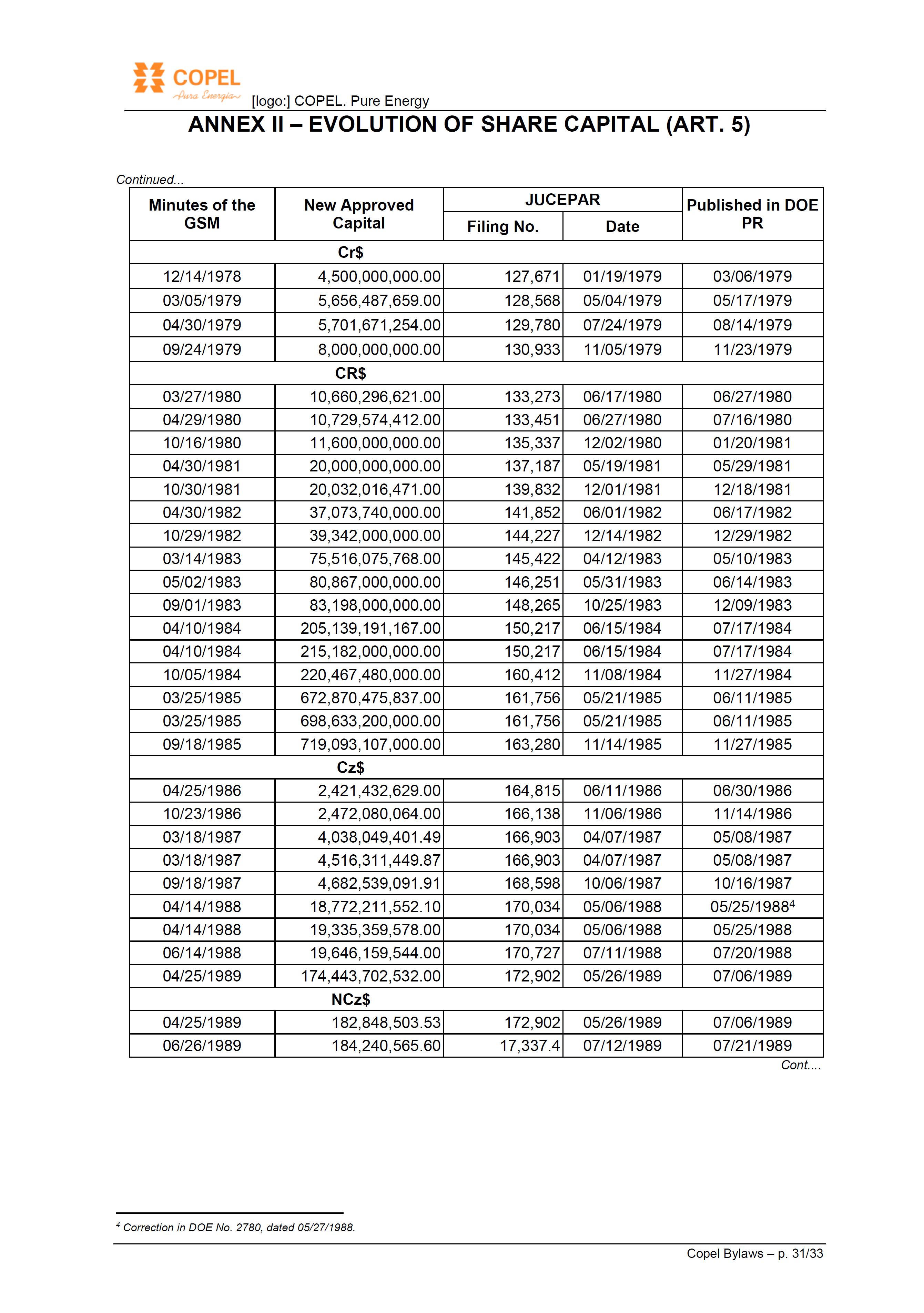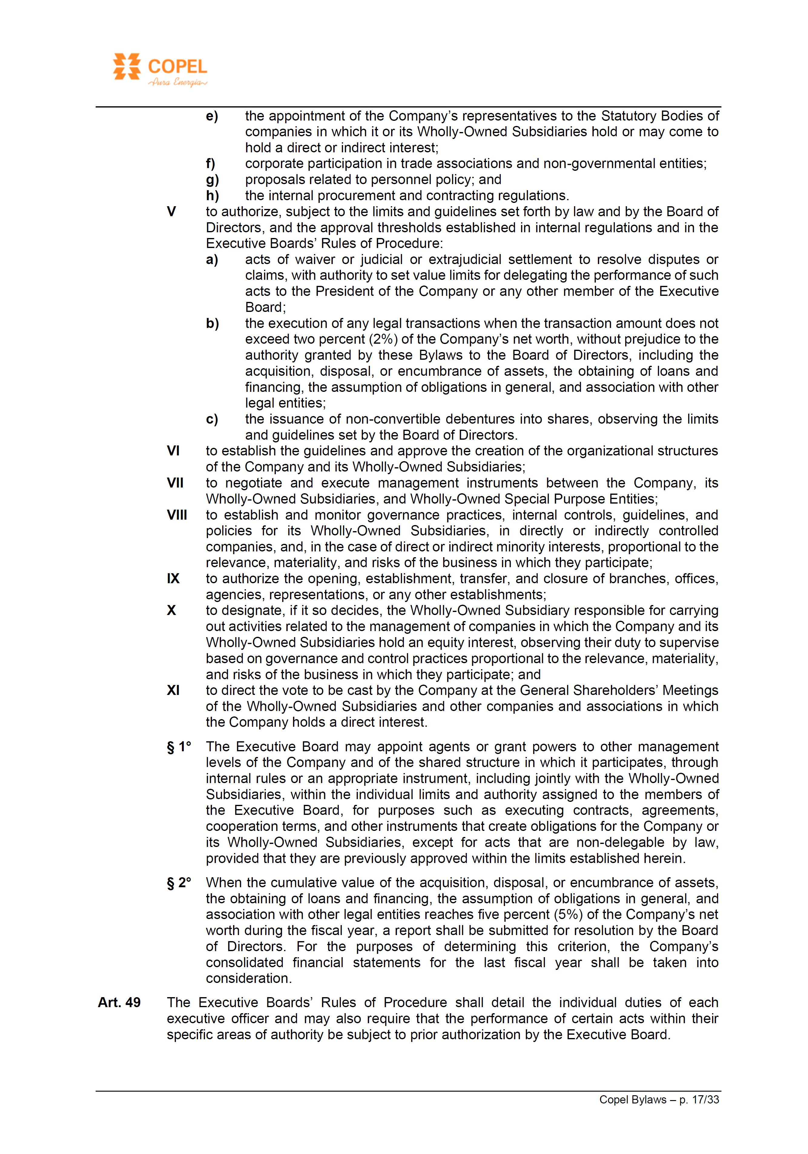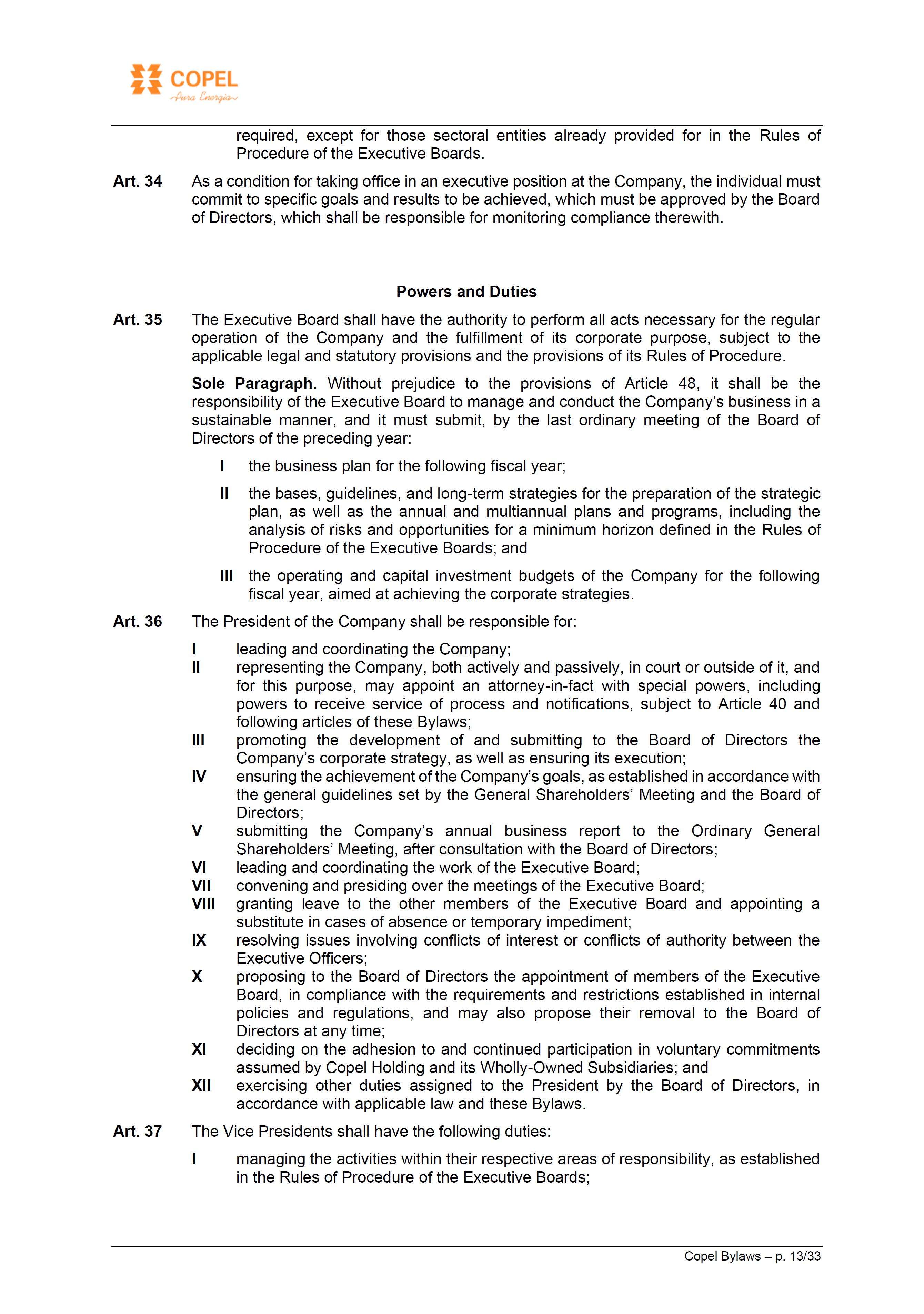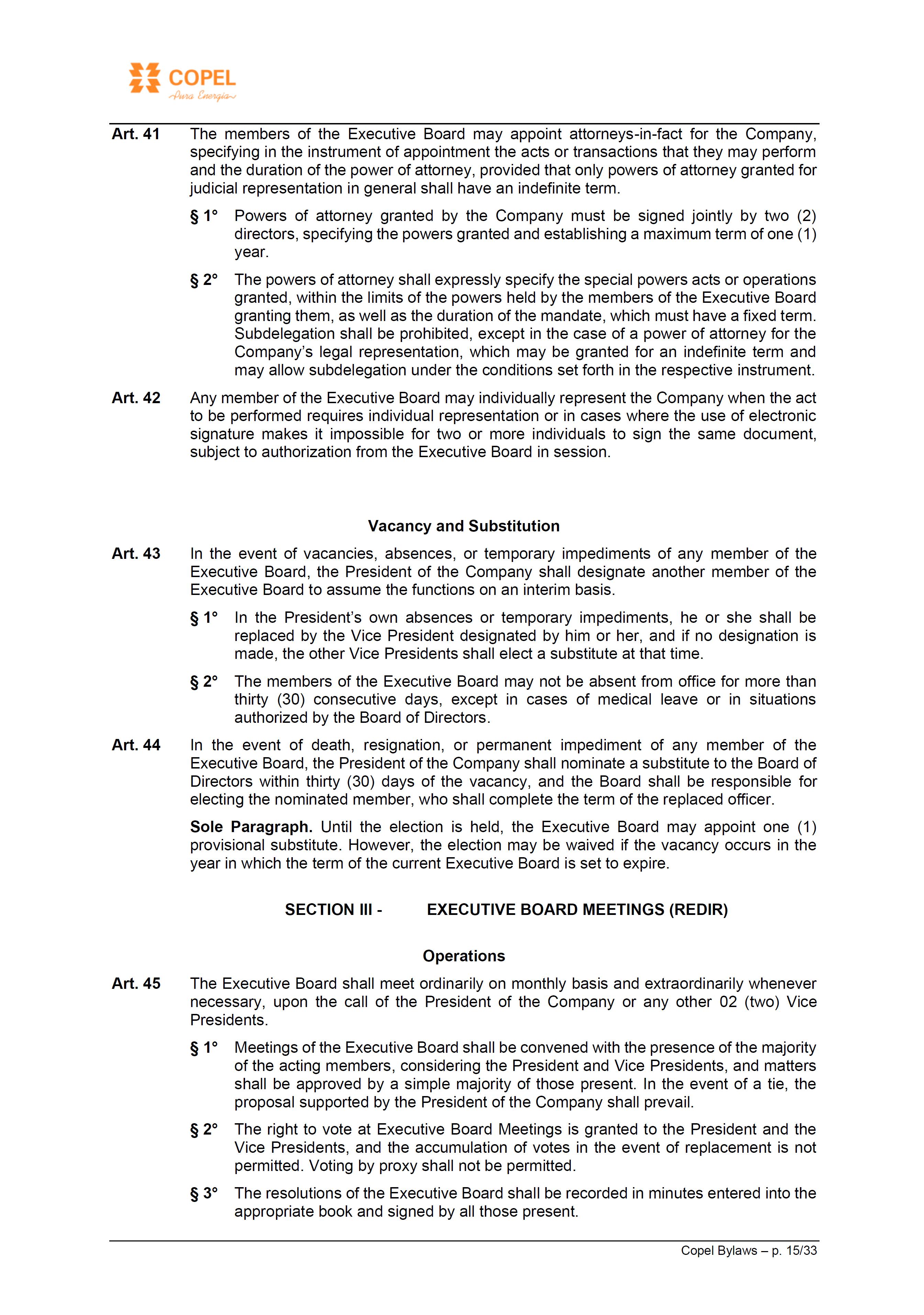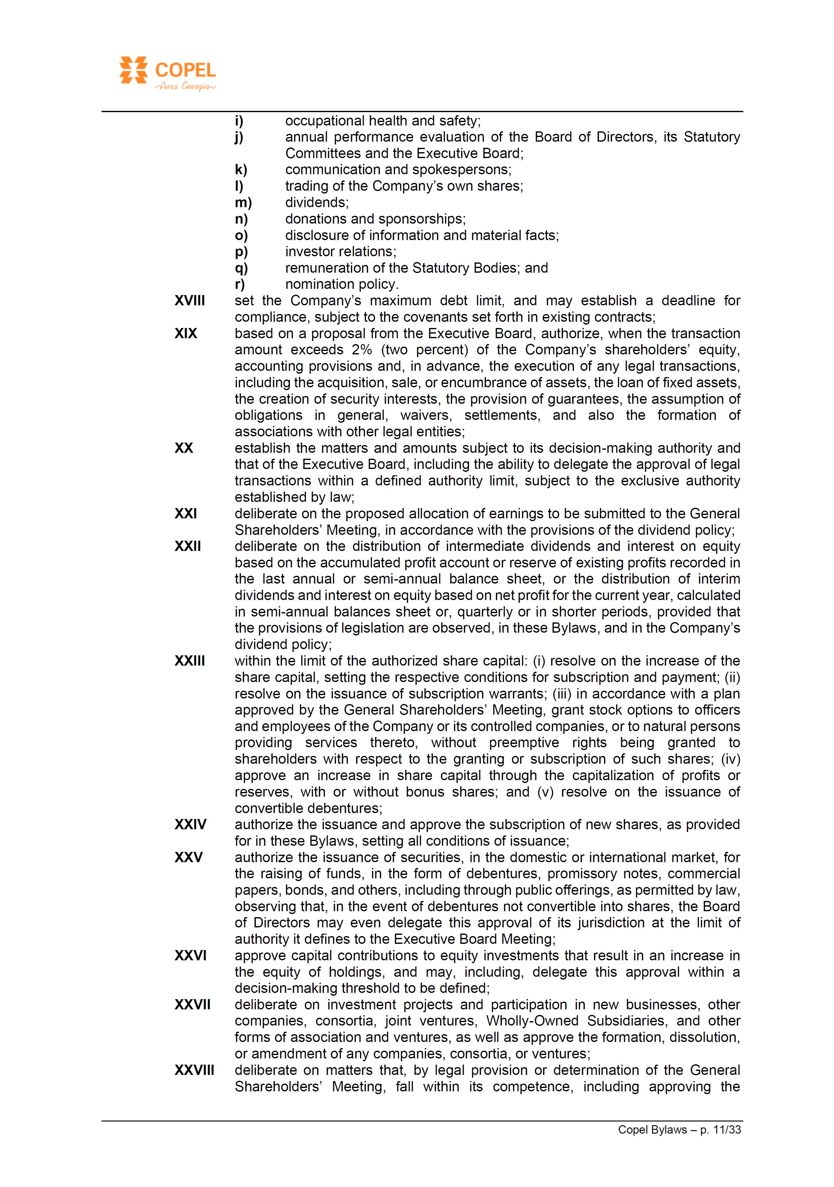 BYLAWS OF COMPANHIA PARANAENSE DE ENERGIA Approved and consolidated by the 212th Extraordinary General Meeting of Shareholders, held on 08/22/2025. CNPJ (Cadastro Nacional de Pessoas Jurídicas [National Registry of Legal Entities]): 76.483.817/0001-20 NIRE (Número de Identificação no Registro de Empresas [Company Register Identification Number]): 41300036535 CVM (Comissão de Valores Mobiliários [Securities and Exchange Commission]) Registration: 1431-1 Rua José Izidoro Biazetto, 158, Bloco A Curitiba - Paraná - Brazil ZIP Code: 81200-240 email: copel@copel.com Website: http://www.copel.com Phone: (41) 3310-5050 Fax: (41) 3331-4145 Copel Bylaws – p. 1/33 SUMMARY CHAPTER I - CORPORATE NAME, DURATION, HEADQUARTERS AND CORPORATE PURPOSE .............................................................................................................. 3 CHAPTER II - SHARE CAPITAL AND SHARES .......................................................................... 3 CHAPTER III - GENERAL SHAREHOLDERS’ MEETING (GSM) ................................................. 6 CHAPTER IV - MANAGEMENT OF THE COMPANY .................................................................... 8 SEÇÃO I - BOARD OF DIRECTORS (BOD) .................................................... 8 Composition, Appointment, and Term of Office ..................................................... 8 Vacancy and Substitutions ..................................................................................... 8 Operations .............................................................................................................. 9 Powers and Duties .................................................................................................. 9 SEÇÃO II - EXECUTIVE BOARD .................................................................... 12 Composition, Term, and Investiture ...................................................................... 12 Powers and Duties ................................................................................................ 13 Representation of the Company ........................................................................... 14 Vacancy and Substitution ..................................................................................... 15 SEÇÃO III - EXECUTIVE BOARD MEETINGS (REDIR) ................................. 15 Operations ............................................................................................................ 15 Powers and Duties ................................................................................................ 16 CHAPTER V - STATUTORY COMMITTEES ............................................................................... 18 SEÇÃO I - STATUTORY AUDIT COMMITTEE (CAE) ................................... 18 SEÇÃO II - INVESTMENT AND INNOVATION COMMITTEE (CII) ................ 19 SEÇÃO III - SUSTAINABLE DEVELOPMENT COMMITTEE (CDS) ............... 20 SEÇÃO IV - PEOPLE COMMITTEE (CDG, COMITÊ DE GENTE) .................. 21 CHAPTER VI - SUPERVISORY BOARD (SB) ............................................................................. 21 Composition and Operation .................................................................................. 21 Vacancy and Substitutions ................................................................................... 22 Representation and Opinions ............................................................................... 22 CHAPTER VII - COMMON RULES APPLICABLE TO THE STATUTORY BODIES ................... 22 Investiture, Impediments, and Restrictions .......................................................... 22 Compensation ....................................................................................................... 23 CHAPTER VIII - FISCAL YEAR, FINANCIAL STATEMENTS, PROFITS, RESERVES, AND DISTRIBUTION OF RESULTS ............................................................................ 24 CHAPTER IX - DISSOLUTION AND LIQUIDATION .................................................................... 25 CHAPTER X - DEFENSE MECHANISMS ................................................................................... 25 CHAPTER XI - CHANGE OF CONTROL AND EXIT FROM THE NOVO MERCADO ................ 26 CHAPTER XII - PROTECTION OF PUBLIC FLOAT ..................................................................... 26 CHAPTER XIII - DISPUTE RESOLUTION ..................................................................................... 27 CHAPTER XIV - GENERAL PROVISIONS ..................................................................................... 27 ANNEXES: I AMENDMENTS TO THE BYLAWS ............................ Erro! Indicador não definido. II EVOLUTION OF SHARE CAPITAL ........................... Erro! Indicador não definido. Copel Bylaws – p. 2/33 DEFINITIONS: GSM: GENERAL SHAREHOLDERS’ MEETING EGSM: EXTRAORDINARY GENERAL SHAREHOLDERS’ MEETING JUCEPAR: COMMERCIAL REGISTRY OF THE STATE OF PARANÁ (JUNTA COMERCIAL DO ESTADO DO PARANÁ) DOE PR: OFFICIAL GAZETTE OF THE STATE OF PARANÁ (DIÁRIO OFICIAL DO ESTADO DO PARANÁ) Note: The original text was filed with JUCEPAR under No. 17,340 (now 41300036535) on 06/16/1955 and published in the DOE PR dated 06/25/1955. Copel Bylaws – p. 3/33 CHAPTER I - CORPORATE NAME, DURATION, HEADQUARTERS AND CORPORATE PURPOSE Art. 1° Companhia Paranaense de Energia – Copel, hereinafter referred to as “Copel” or the “Company,” is a publicly held corporation, endowed with legal personality under private law, governed by these Bylaws and by the applicable legislation. § 1º The Company’s corporate name may not be altered. § 2º With the Company's entry into the Novo Mercado da B3 S.A. – Brazil, Bolsa, Balcão ("B3"), the Company, its shareholders, including controlling shareholders, administrators and members of the Supervisory Board, when installed, are subject to the provisions of the Novo Mercado Regulation. A