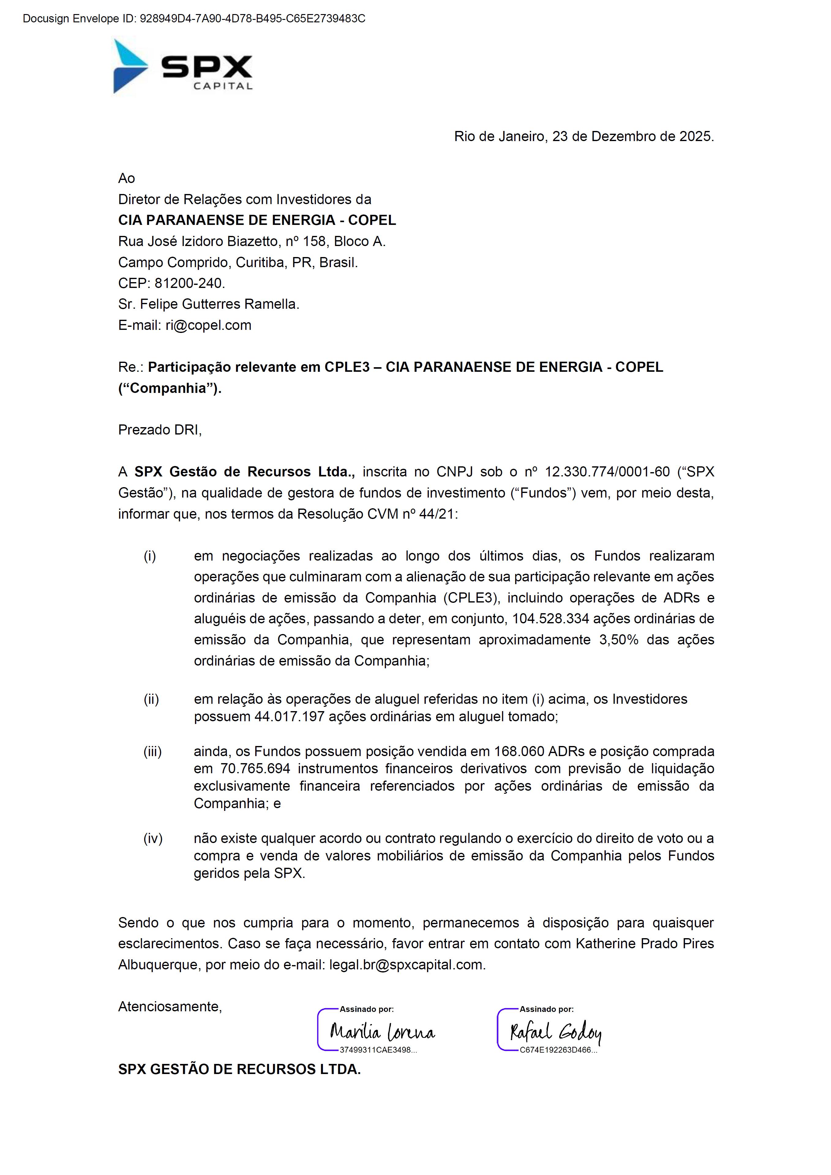 Rio de Janeiro, 23 de Dezembro de 2025. Ao Diretor de Relações com Investidores da CIA PARANAENSE DE ENERGIA - COPEL Rua José Izidoro Biazetto, nº 158, Bloco A. Campo Comprido, Curitiba, PR, Brasil. CEP: 81200-240. Sr. Felipe Gutterres Ramella. E-mail: ri@copel.com Re.: Participação relevante em CPLE3 – CIA PARANAENSE DE ENERGIA - COPEL (“Companhia”). Prezado DRI, A SPX Gestão de Recursos Ltda., inscrita no CNPJ sob o nº 12.330.774/0001-60 (“SPX Gestão”), na qualidade de gestora de fundos de investimento (“Fundos”) vem, por meio desta, informar que, nos termos da Resolução CVM nº 44/21: (i) em negociações realizadas ao longo dos últimos dias, os Fundos realizaram operações que culminaram com a alienação de sua participação relevante em ações ordinárias de emissão da Companhia (CPLE3), incluindo operações de ADRs e aluguéis de ações, passando a deter, em conjunto, 104.528.334 ações ordinárias de emissão da Companhia, que representam aproximadamente 3,50% das ações ordinárias de emissão da Companhia; (ii) em relação às operações de aluguel referidas no item (i) acima, os Investidores possuem 44.017.197 ações ordinárias em aluguel tomado; (iii) ainda, os Fundos possuem posição vendida em 168.060 ADRs e posição comprada em 70.765.694 instrumentos financeiros derivativos com previsão de liquidação exclusivamente financeira referenciados por ações ordinárias de emissão da Companhia; e (iv) não existe qualquer acordo ou contrato regulando o exercício do direito de voto ou a compra e venda de valores mobiliários de emissão da Companhia pelos Fundos geridos pela SPX. Sendo o que nos cumpria para o momento, permanecemos à disposição para quaisquer esclarecimentos. Caso se faça necessário, favor entrar em contato com Katherine Prado Pires Albuquerque, por meio do e-mail: legal.br@spxcapital.com. Atenciosamente, SPX GESTÃO DE RECURSOS LTDA. Docusign Envelope ID: 928949D4-7A90-4D78-B495-C65E2739483C
