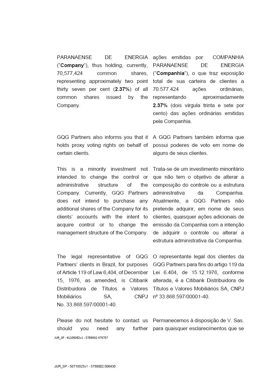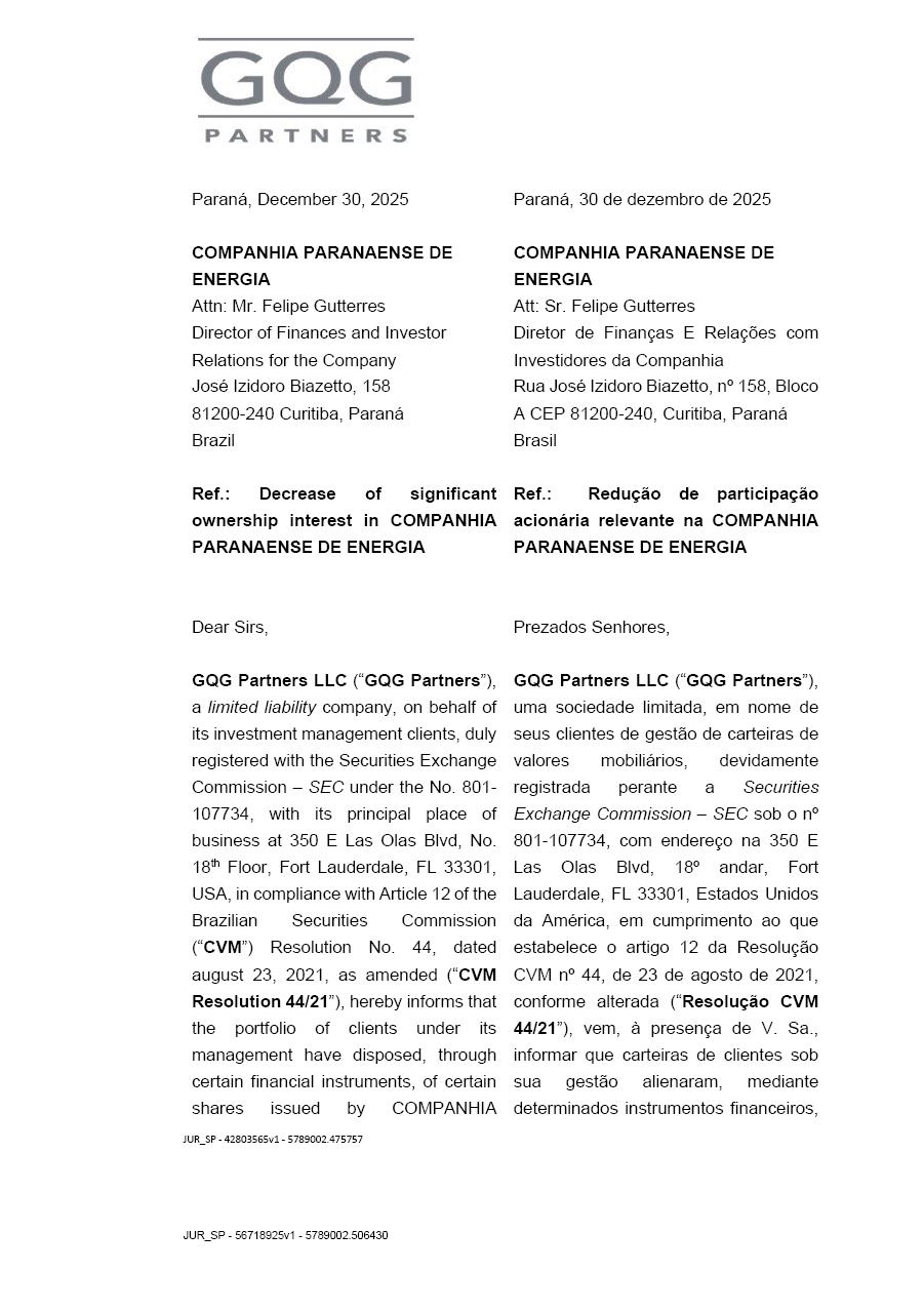 COPEL (the “Company”) hereby informs its shareholders and the market in general that, in compliance with CVM Resolution No. 44/2021, as amended by CVM Resolution No. 60/2022, it received a letter from GQG Partners LLC (“GQG Partners”) on January 05, 2026, informing it of the disposal of part of its shareholding in the Company, now holding a total of 70,577,424 (seventy million, five hundred seventy-seven thousand, four hundred twenty-four) common shares, representing approximately 2.37% of the total shares issued by Copel, as shown in the correspondence below.