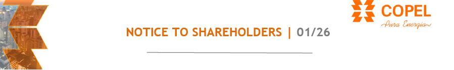 COMPANHIA PARANAENSE DE ENERGIA - COPEL ("Company"), in continuation and rectification of Notices to Shareholders 08/25, 09/25 and 10/25, informs its shareholders regarding the distribution of interest on equity, approved at the meeting of the Board of Directors held on November 18, 2025, in the total gross amount of R$ 1,100,000.000.00 (one billion, one hundred million reais) ("JCP") and the distribution of dividends, approved at the meeting of the Board of Directors held on December 10, 2025, in the total amount of R$ 1,350,000,000.00 (one billion, three hundred and fifty million reais) ("Dividends"), the updating of the amount of JCP and Dividends for each common, registered, book-entry share with no par value issued by the Company, as shown in the table below: