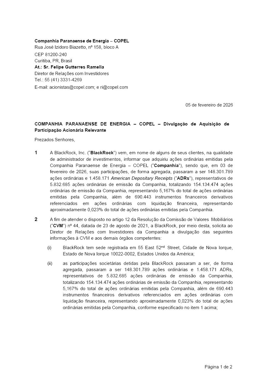 Página 1 de 2 Companhia Paranaense de Energia – COPEL Rua José Izidoro Biazetto, nº 158, bloco A CEP 81200-240 Curitiba, PR, Brasil At.: Sr. Felipe Gutterres Ramella Diretor de Relações com Investidores Tel.: 55 (41) 3331-4269 E-mail: acionistas@copel.com; e ri@copel.com 05 de fevereiro de 2026 COMPANHIA PARANAENSE DE ENERGIA – COPEL – Divulgação de Aquisição de Participação Acionária Relevante Prezados Senhores, 1 A BlackRock, Inc. (“BlackRock”) vem, em nome de alguns de seus clientes, na qualidade de administrador de investimentos, informar que adquiriu ações ordinárias emitidas pela Companhia Paranaense de Energia – COPEL (“Companhia”), sendo que, em 03 de fevereiro de 2026, suas participações, de forma agregada, passaram a ser 148.301.789 ações ordinárias e 1.458.171 American Depositary Receipts (“ADRs”), representativos de 5.832.685 ações ordinárias de emissão da Companhia, totalizando 154.134.474 ações ordinárias de emissão da Companhia, representando 5,167% do total de ações ordinárias emitidas pela Companhia, além de 690.443 instrumentos financeiros derivativos referenciados em ações ordinárias com liquidação financeira, representando aproximadamente 0,023% do total de ações ordinárias emitidas pela Companhia. 2 A fim de atender o disposto no artigo 12 da Resolução da Comissão de Valores Mobiliários (“CVM”) nº 44, datada de 23 de agosto de 2021, a BlackRock, por meio desta, solicita ao Diretor de Relações com Investidores da Companhia a divulgação das seguintes informações à CVM e aos demais órgãos competentes: (i) BlackRock tem sede registrada em 55 East 52nd Street, Cidade de Nova Iorque, Estado de Nova Iorque 10022-0002, Estados Unidos da América; (ii) as participações societárias detidas pela BlackRock passaram a ser, de forma agregada, passaram a ser 148.301.789 ações ordinárias e 1.458.171 ADRs, representativos de 5.832.685 ações ordinárias de emissão da Companhia, totalizando 154.134.474 ações ordinárias de emissão da Companhia, representando 5,167% do total de ações ordinárias emitidas pela Companhia, além de 690.443 instrumentos financeiros derivativos referenciados em ações ordinárias com liquidação financeira, representando aproximadamente 0,023% do total de ações ordinárias emitidas pela Companhia, conforme especificado no item 1 acima; Página 2 de 2 (iii) o objetivo das participações societárias acima mencionadas é estritamente de investimento, não objetivando alteração do controle acionário ou da estrutura administrativa da Companhia; e (iv) não foram celebrados, pela BlackRock, quaisquer contratos ou acordos que regulem o exercício de direito de voto ou a compra e venda de valores mobiliários emitidos pela Companhia. 3 Permanecemos à disposição para quaisquer esclarecimentos ou comentários adicionais que julguem necessários quanto ao assunto.