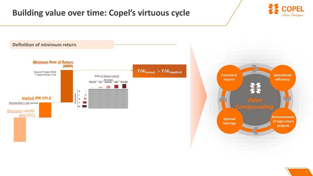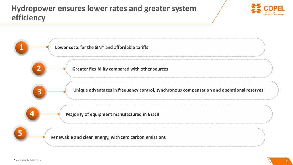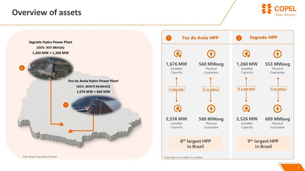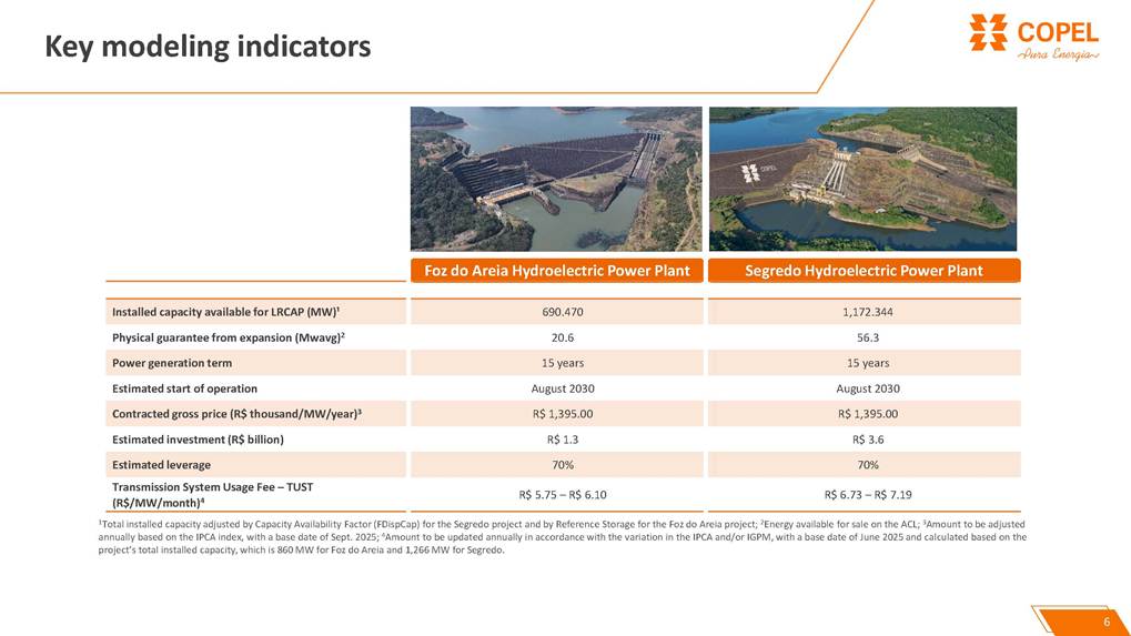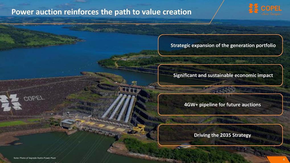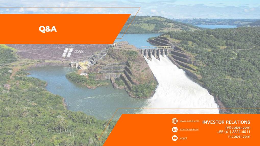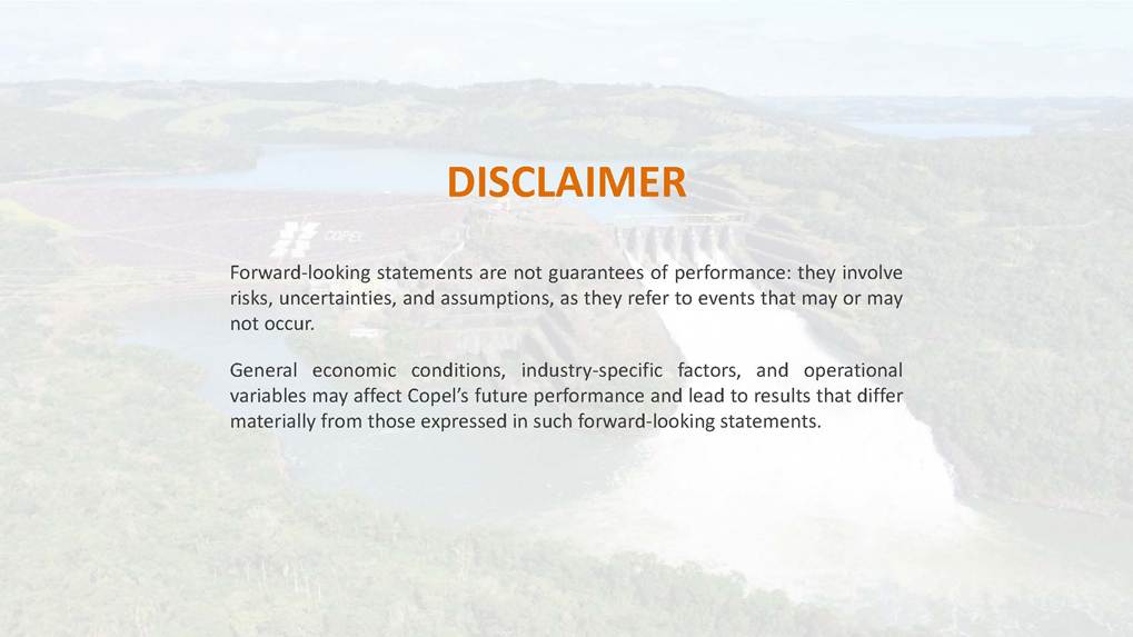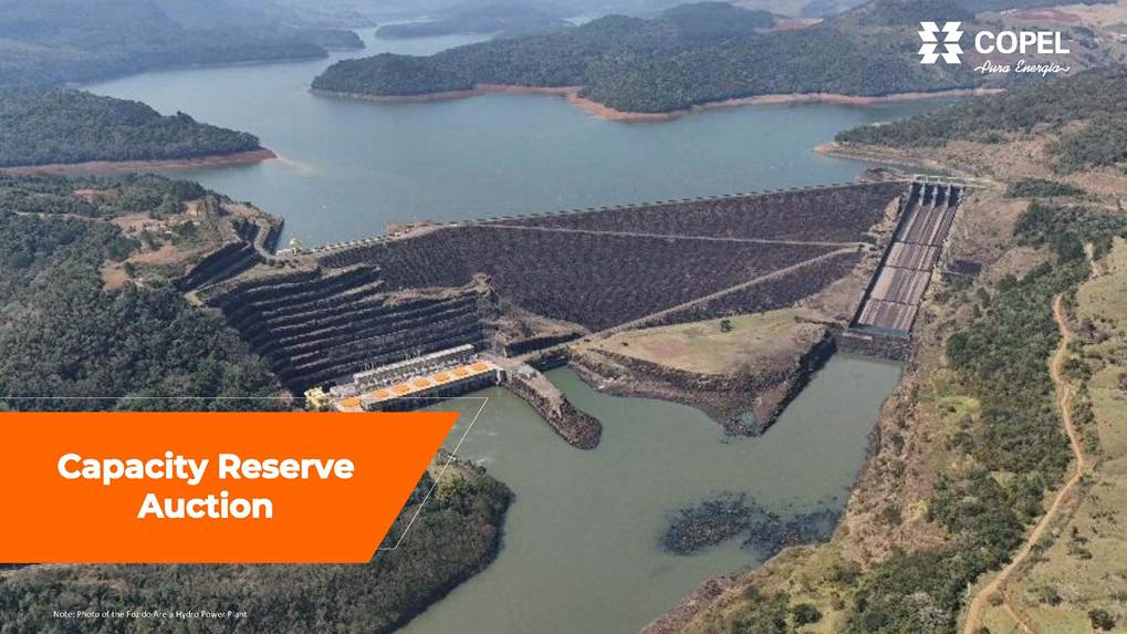 Capacity Reserve Auction Note: Photo of the Foz do Areia Hydro Power Plant 2 DISCLAIMER Forward-lookingstatementsarenotguaranteesofperformance:theyinvolverisks,uncertainties,andassumptions,astheyrefertoeventsthatmayormaynotoccur. Generaleconomicconditions,industry-specificfactors,andoperationalvariablesmayaffectCopel’sfutureperformanceandleadtoresultsthatdiffermateriallyfromthoseexpressedinsuchforward-lookingstatements. 3 Hydropower ensures lower rates and greater system efficiency 1 Lower costs for the SIN* and affordable tariffs Renewable and clean energy, with zero carbon emissions Greater flexibility compared with other sources 2 Unique advantages in frequency control, synchronous compensation and operational reserves 3 Majority of equipment manufactured in Brazil 4 5 * Integrated Electric System 4 Power auction reinforces the path to value creation Strategic expansion of the generation portfolio 4GW+ pipeline for future auctions Significant and sustainable economic impact Driving the 2035 Strategy Note: Photo of Segredo Hydro Power Plant 5 Foz do Areia HPP Segredo HPP 1 2 Overview of assets 1,260 MW Installed Capacity 1,676 MW Installed Capacity 568 MWavg Physical Guarantee 553 MWavg Physical Guarantee 2,526 MW Installed Capacity 2,536 MW Installed Capacity 588 MWavg Physical Guarantee 609 MWavg Physical Guarantee 9thlargest HPP in Brazil 8thlargest HPP in Brazil Foz do AreiaHydro Power Plant (GOV. BENTO MUNHOZ) 1,676 MW + 860 MW 1 Segredo Hydro Power Plant (GOV. NEY BRAGA) 1,260 MW + 1,266 MW 2 +860 MW +21 MWm +1,266 MW +56 MWm Note: figures are subject to rounding Note: Map of the state of Paraná 6 Foz do Areia Hydroelectric Power Plant Segredo Hydroelectric Power Plant Key modeling indicators InstalledcapacityavailableforLRCAP(MW)¹ 690.470 1,172.344 Physicalguaranteefromexpansion(Mwavg)2 20.6 56.3 Powergenerationterm 15 years 15 years Estimatedstartofoperation August 2030 August 2030 Contractedgrossprice(R$thousand/MW/year)3 R$ 1,395.00 R$ 1,395.00 Estimatedinvestment(R$billion) R$ 1.3 R$ 3.6 Estimatedleverage 70% 70% Transmission System Usage Fee –TUST (R$/MW/month)4 R$ 5.75 –R$ 6.10 R$ 6.73 –R$ 7.19 1Total installed capacity adjusted by Capacity Availability Factor (FDispCap) for the Segredo project and by Reference Storage for the Foz do Areia project; 2Energy available for sale on the ACL; 3Amount to be adjusted annually based on the IPCA index, with a base date of Sept. 2025; 4Amount to be updated annually in accordance with the variation in the IPCA and/or IGPM, with a base date of June 2025 and calculated based on the project’s total installed capacity, which is 860 MW for Foz do Areia and 1,266 MW for Segredo. 7 Building value over time: Copel’s virtuous cycle Operational efficiency Reinvestments of high-return projects Consistent returns Value Compounding Optimal leverage Definition of minimum return 8 Q&A INVESTOR RELATIONS ri@copel.com +55 (41) 3331-4011 ri.copel.com /company/copel /copel www.copel.com