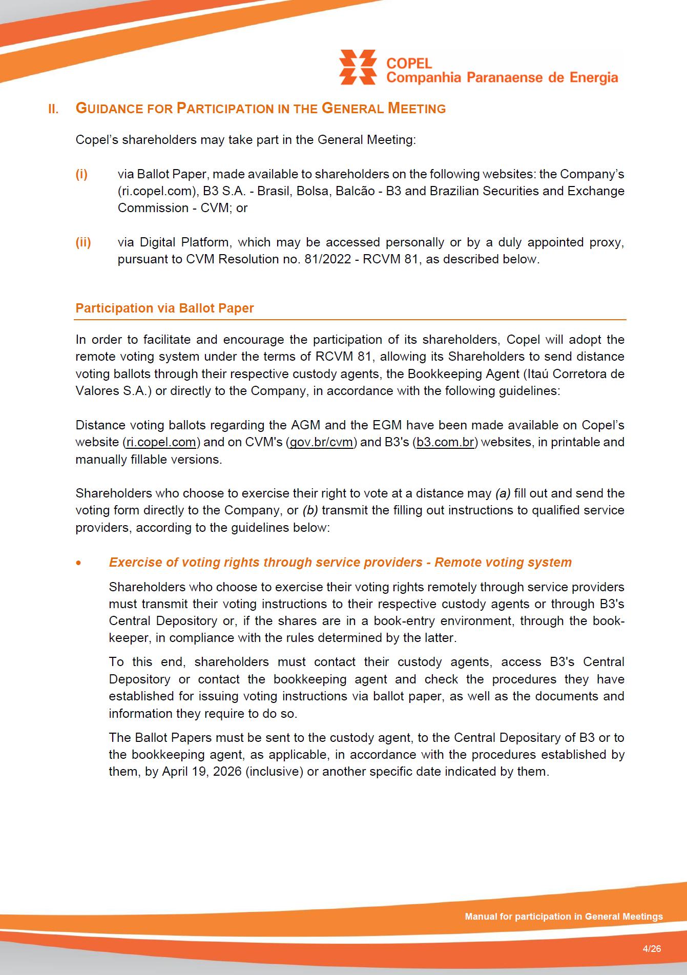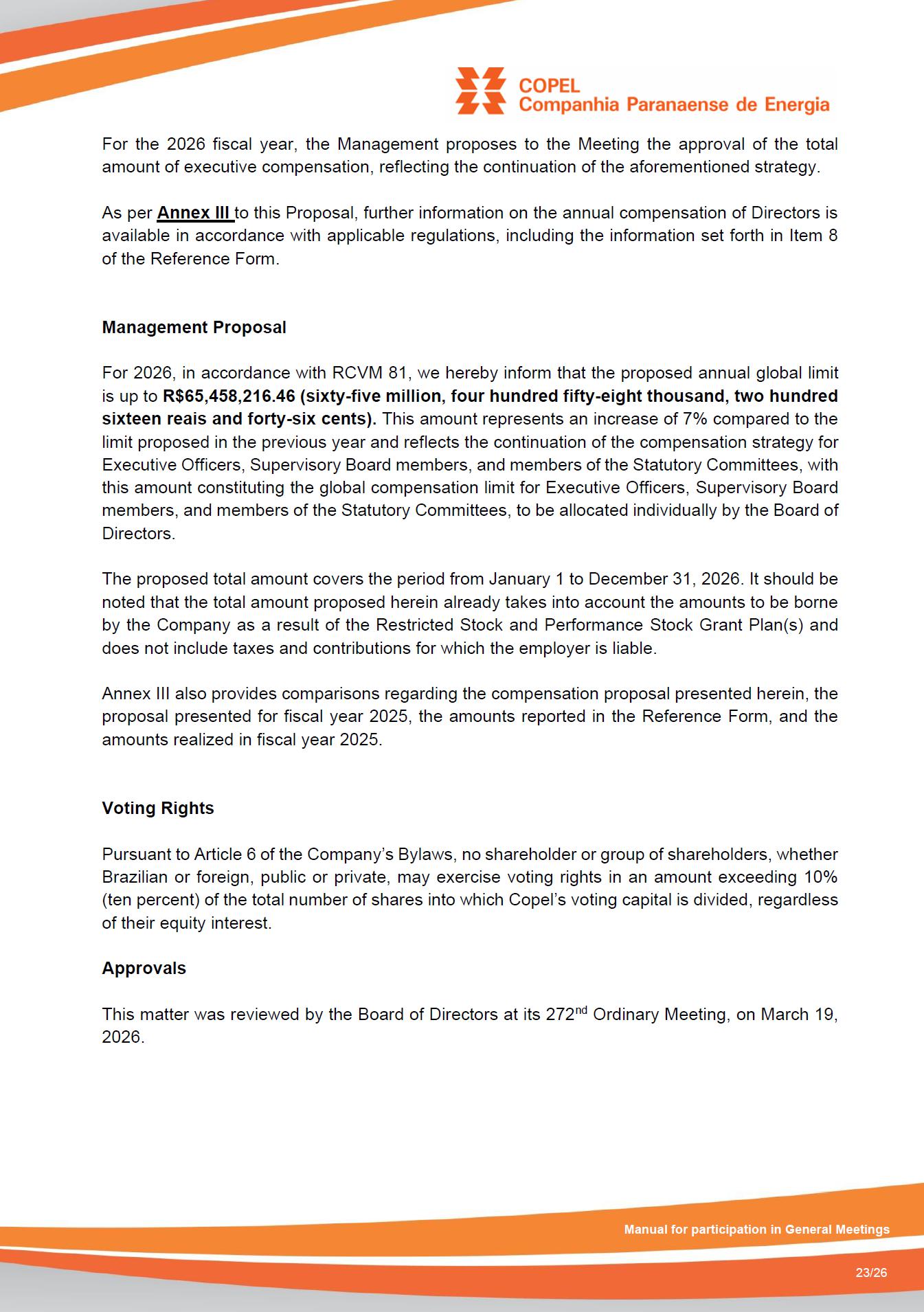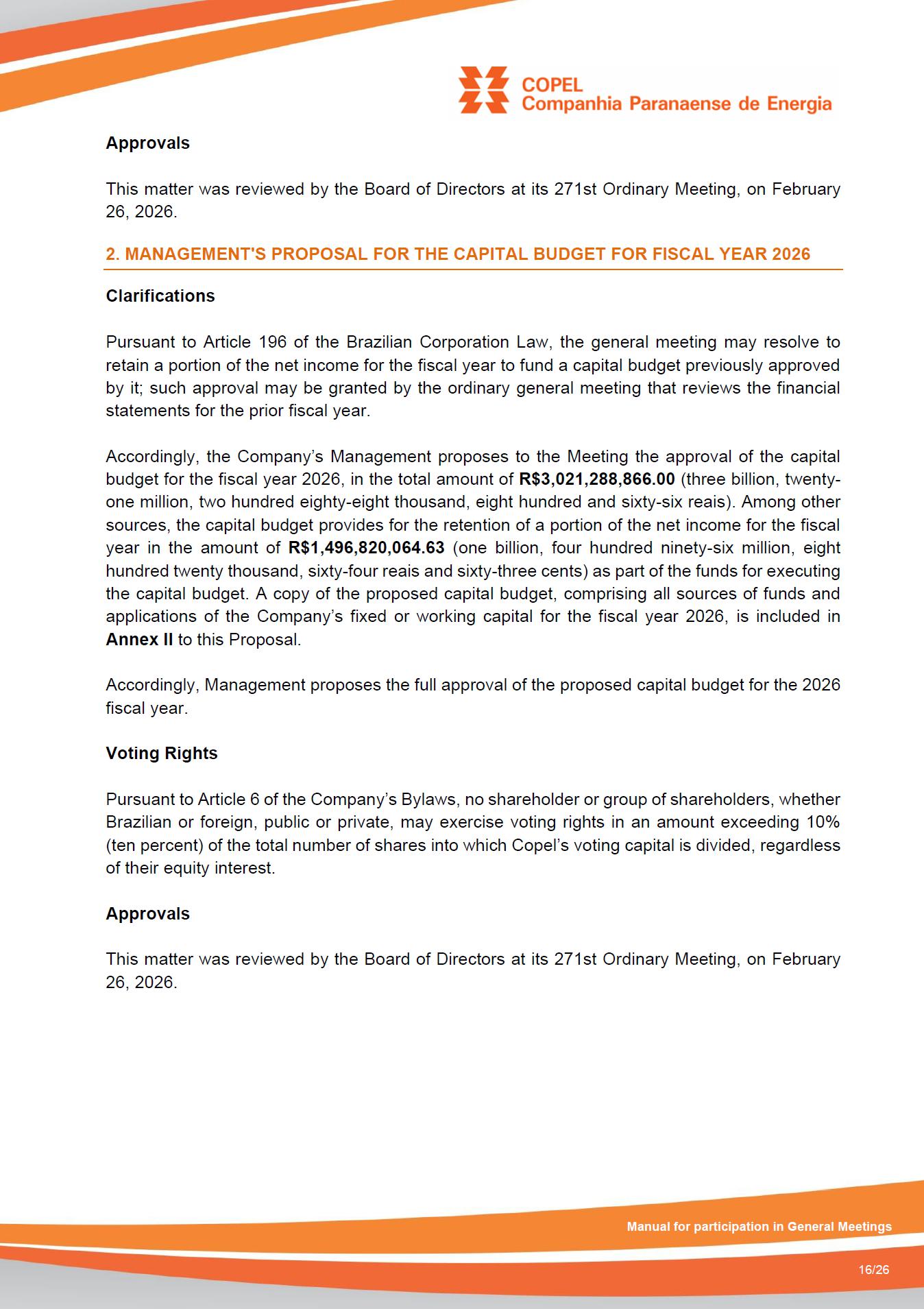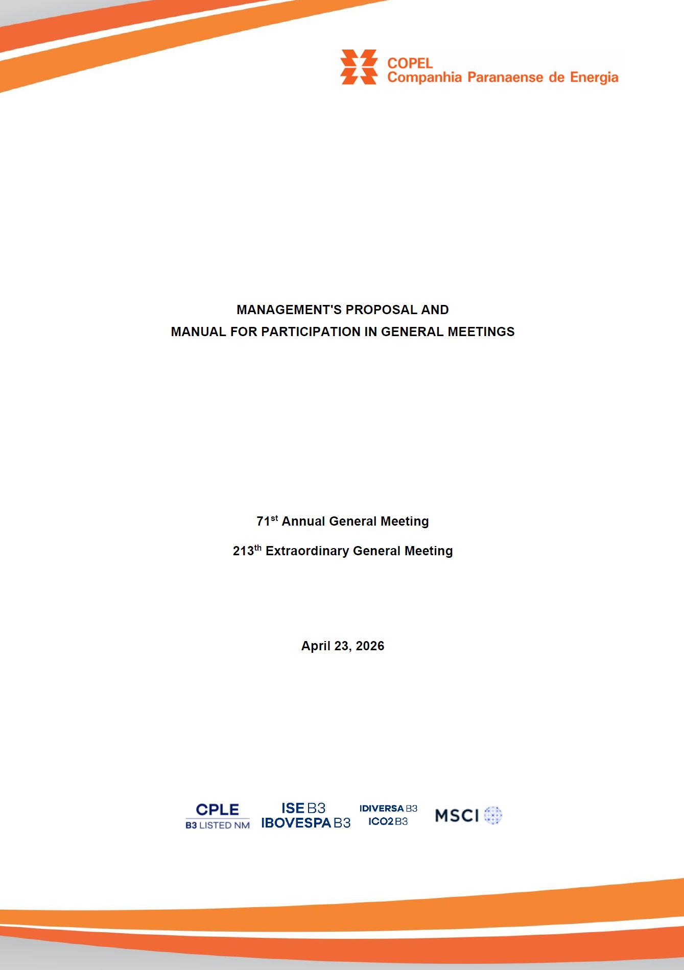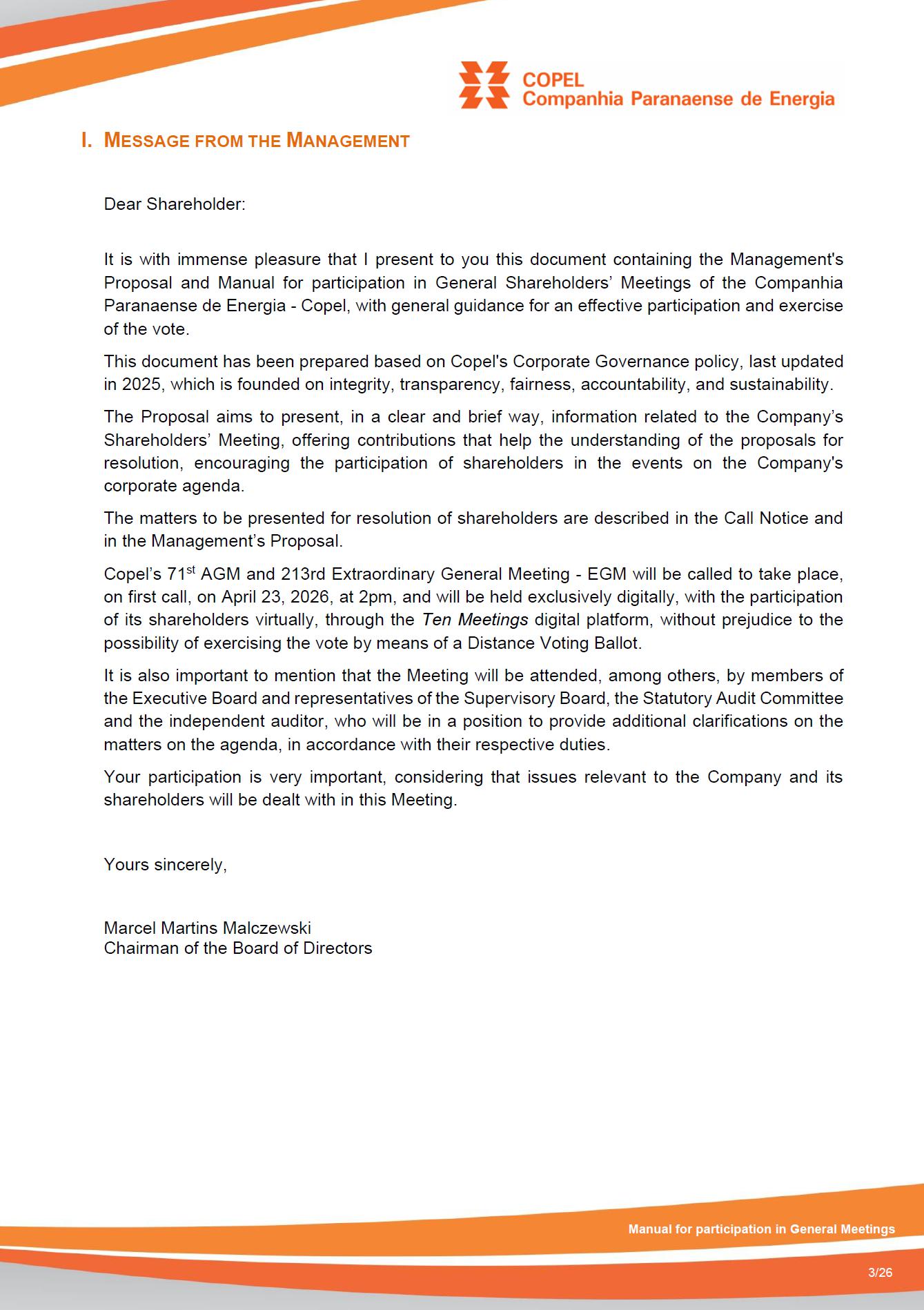 MANAGEMENT'S PROPOSAL AND MANUAL FOR PARTICIPATION IN GENERAL MEETINGS 71st Annual General Meeting 213th Extraordinary General Meeting April 23, 2026 Manual for participation in General Meetings 2/26 TABLE OF CONTENTS I. Message from the Management .............................................................................................. 3 II. Guidance for Participation in the General Meeting ................................................................ 4 Participation via Ballot Paper .................................................................................................. 4 Participation via Digital Platform ............................................................................................. 6 Holders of ADRs…………………………………………………………………………………………9 Convening of the General Meeting …………………………………………………………… . ……9 Voting Rights …….……………………………………………………………………………………. 10 Approval of the Matters on the Agenda …..…………………………………………………….…10 Final guidelines……………………………………………………………………………….………..10 III. Call Notice ............................................................................................................................... 11 IV. Management's Proposal ....................................................................................................... 14 V. Annex ..................................................................................................................................... 27 Manual for participation in General Meetings 3/26 I. MESSAGE FROM THE MANAGEMENT Dear Shareholder: It is with immense pleasure that I present to you this document containing the Management's Proposal and Manual for participation in General Shareholders’ Meetings of the Companhia Paranaense de Energia - Copel, with general guidance for an effective participation and exercise of the vote. This document has been prepared based on Copel's Corporate Governance policy, last updated in 2025, which is founded on integrity, transparency, fairness, accountability, and sustainability. The Proposal aims to present, in a clear and brief way, information related to the Company’s Shareholders’ Meeting, offering contributions that help the understanding of the proposals for resolution, encouraging the participation of shareholders in the events on the Company's corporate agenda. The matters to be presented for resolution of shareholders are described in the Call Notice and in the Management’s Proposal. Copel’s 71st AGM and 213rd Extraordinary General Meeting - EGM will be called to take place, on first call, on April 23, 2026, at 2pm, and will be held exclusively digitally, with the participation of its shareholders virtually, through the Ten Meetings digital platform, without prejudice to the possibility of exercising the vote by means of a Distance Voting Ballot. It is also important to mention that the Meeting will be attended, among others, by members of the Executive Board and representatives of the Supervisory Board, the Statutory Audit Committee and the independent auditor, who will be in a position to provide additional clarifications on the matters on the agenda, in accordance with their respective duties. Your participation is very important, considering that issues relevant to the Company and its shareholders will be dealt with in this Meeting. Yours sincerely, Marcel Martins Malczewski Chairman of the Board of Directors Manual for participation in General Meetings 4/26 II. GUIDANCE FOR PARTICIPATION IN THE GENERAL MEETING Copel’s shareholders may take part in the General Meeting: (i) via Ballot Paper, made available to shareholders on the following websites: the Company’s (ri.copel.com), B3 S.A. - Brasil, Bolsa, Balcão - B3 and Brazilian Securities and Exchange Commission - CVM; or (ii) via Digital Platform, which may be accessed personally or by a duly appointed proxy, pursuant to CVM Resolution no. 81/2022 - RCVM 81, as described below. Participation via Ballot Paper In order to facilitate and encourage the participation of its shareholders, Copel will adopt the remote voting system under the terms of RCVM 81, allowing its Shareholders to send distance voting ballots through their respective custody agents, the Bookkeeping Agent (Itaú Corretora de Valores S.A.) or directly to the Company, in accordance with the following guidelines: Distance voting ballots regarding the AGM and the EGM have been made available on Copel’s website (ri.copel.com) and on CVM's (gov.br/cvm) and B3's (b3.com.br) websites, in printable and manually fillable versions. Shareholders who choose to exercise their right to vote at a distance may (a) fill out and send the voting form directly to the Company, or (b) transmit the filling out instructions to qualified service providers, according to the guidelines below: • Exercise of voting rights through service providers - Remote voting system Shareholders who choose to exercise their voting rights remotely through service providers must transmit their voting instructions to their respective custody agents or through B3's Central Depository or, if the shares are in a book-entry environment, through the bookkeeper, in compliance with the rules determined by the latter. To this end, shareholders must contact their custody agents, access B3's Central Depository or contact the bookkeeping agent and check the procedures they have established for issuing voting instructions via ballot paper, as well as the documents and information they require to do so. The Ballot Papers must be sent to the custody agent, to the Central Depositary of B3 or to the bookkeeping agent, as applicable, in accordance with the procedures established by them, by April 19, 