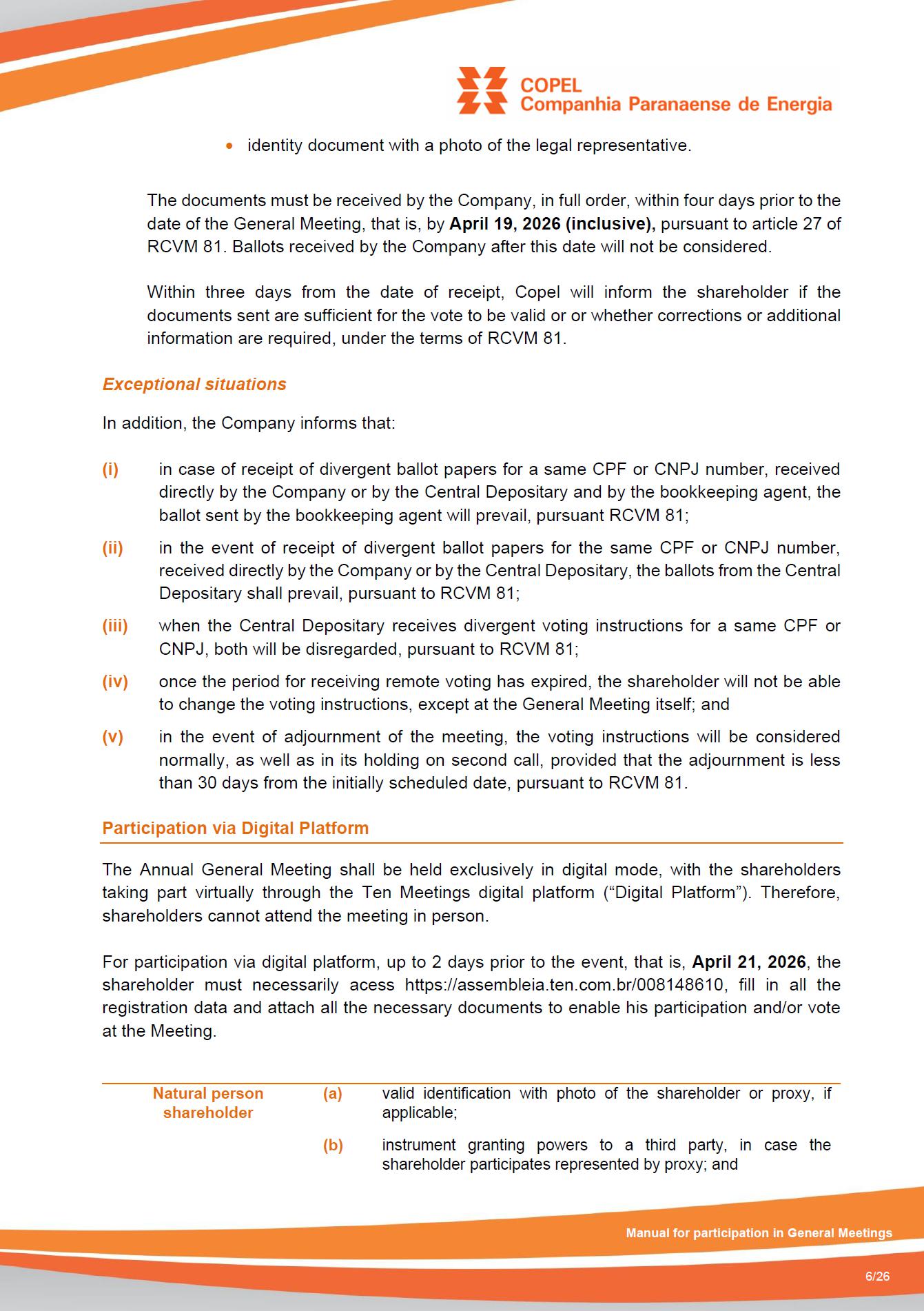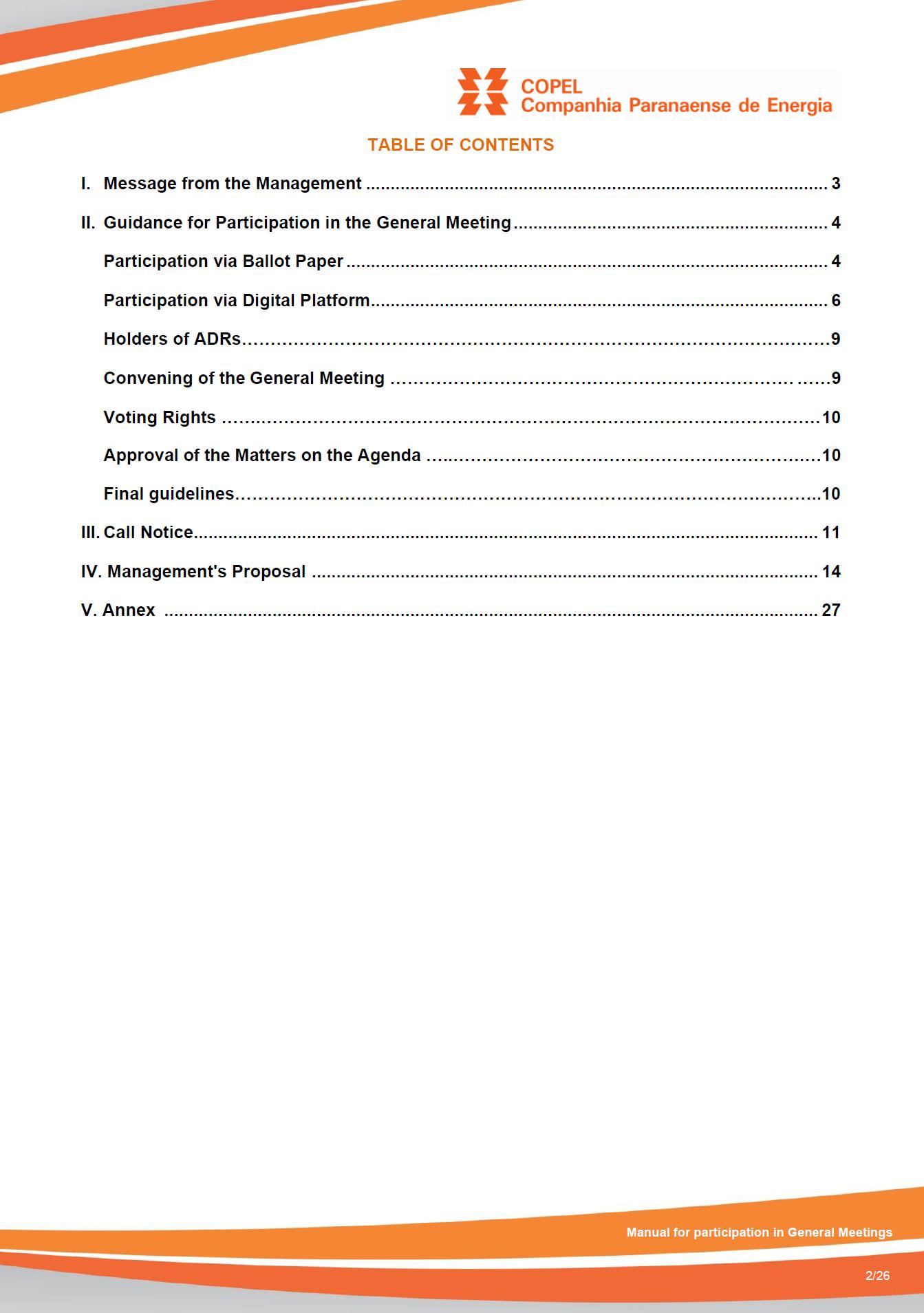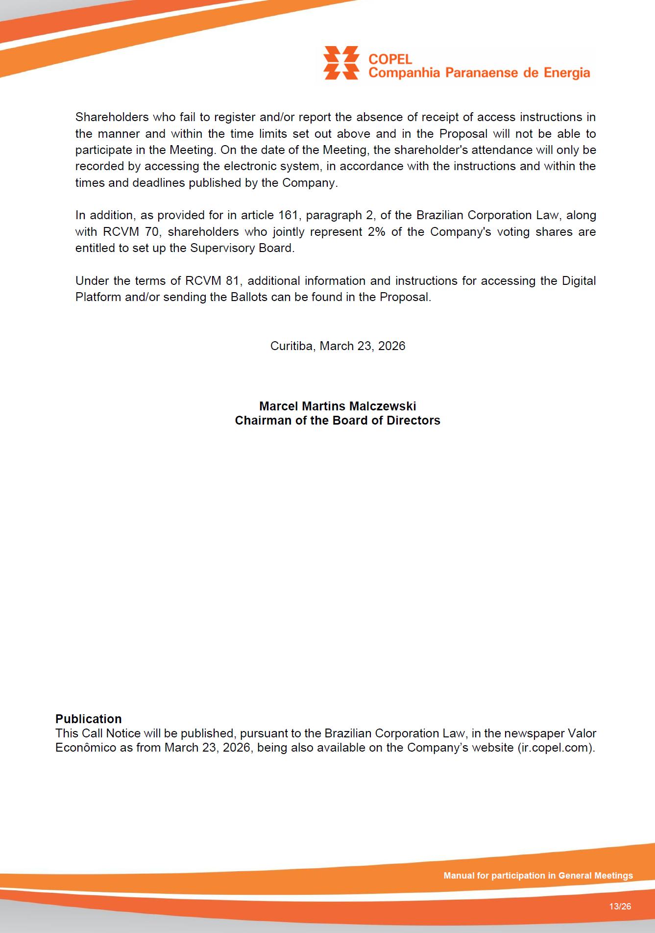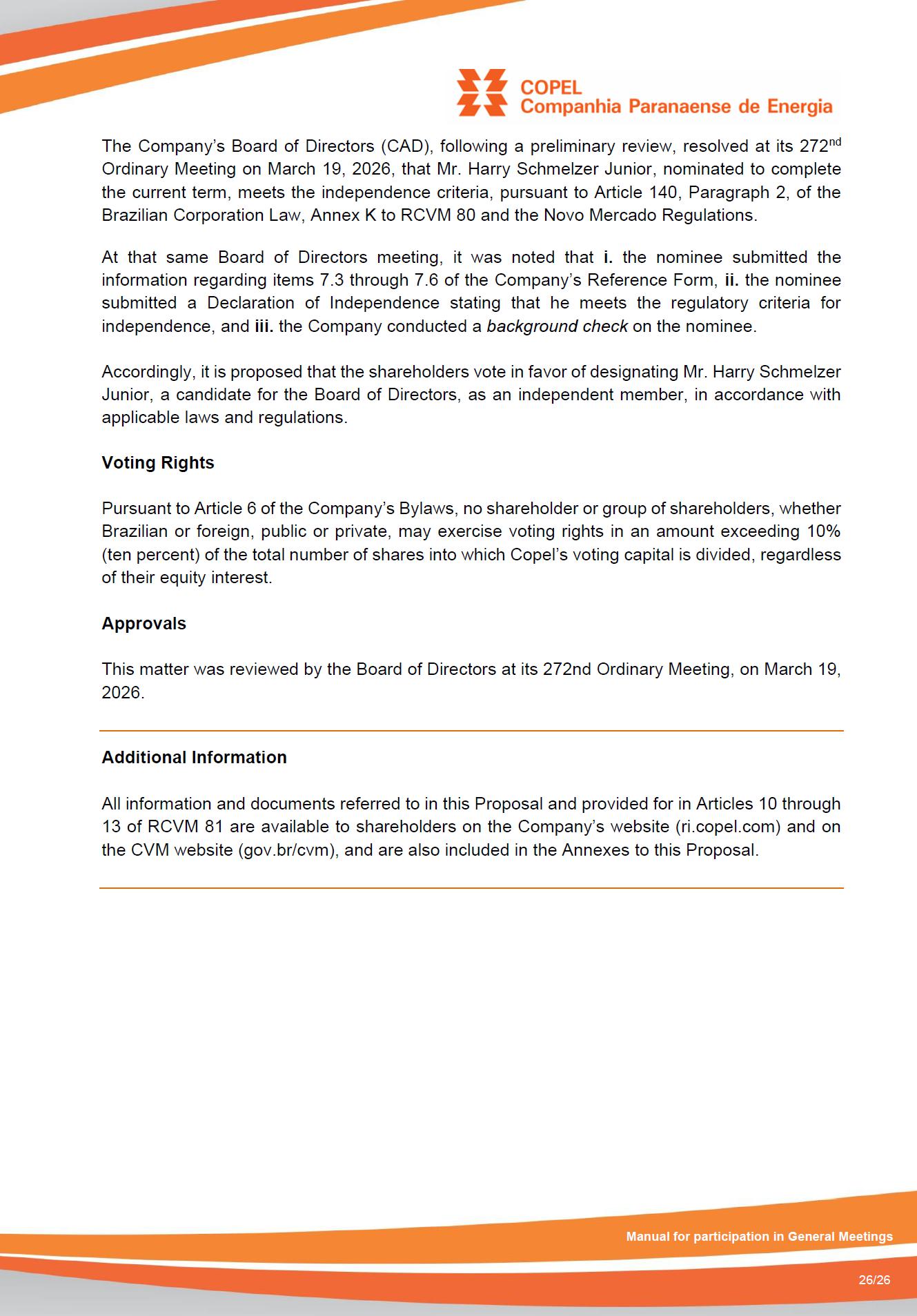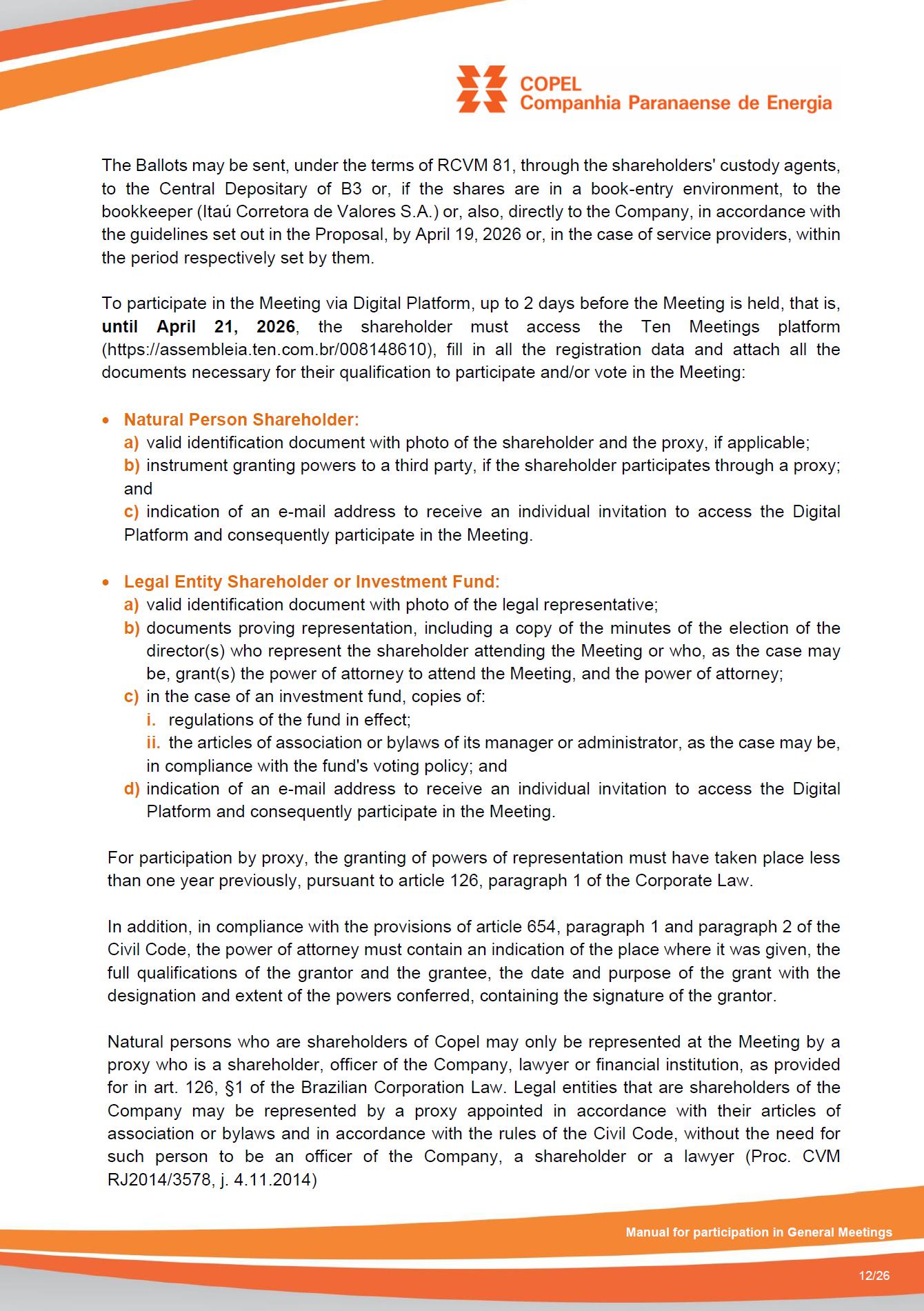 MANAGEMENT'S PROPOSAL AND MANUAL FOR PARTICIPATION IN GENERAL MEETINGS 71st Annual General Meeting 213th Extraordinary General Meeting April 23, 2026 Manual for participation in General Meetings 2/26 TABLE OF CONTENTS I. Message from the Management .............................................................................................. 3 II. Guidance for Participation in the General Meeting ................................................................ 4 Participation via Ballot Paper .................................................................................................. 4 Participation via Digital Platform ............................................................................................. 6 Holders of ADRs…………………………………………………………………………………………9 Convening of the General Meeting …………………………………………………………… . ……9 Voting Rights …….……………………………………………………………………………………. 10 Approval of the Matters on the Agenda …..…………………………………………………….…10 Final guidelines……………………………………………………………………………….………..10 III. Call Notice ............................................................................................................................... 11 IV. Management's Proposal ....................................................................................................... 14 V. Annex ..................................................................................................................................... 27 Manual for participation in General Meetings 3/26 I. MESSAGE FROM THE MANAGEMENT Dear Shareholder: It is with immense pleasure that I present to you this document containing the Management's Proposal and Manual for participation in General Shareholders’ Meetings of the Companhia Paranaense de Energia - Copel, with general guidance for an effective participation and exercise of the vote. This document has been prepared based on Copel's Corporate Governance policy, last updated in 2025, which is founded on integrity, transparency, fairness, accountability, and sustainability. The Proposal aims to present, in a clear and brief way, information related to the Company’s Shareholders’ Meeting, offering contributions that help the understanding of the proposals for resolution, encouraging the participation of shareholders in the events on the Company's corporate agenda. The matters to be presented for resolution of shareholders are described in the Call Notice and in the Management’s Proposal. Copel’s 71st AGM and 213rd Extraordinary General Meeting - EGM will be called to take place, on first call, on April 23, 2026, at 2pm, and will be held exclusively digitally, with the participation of its shareholders virtually, through the Ten Meetings digital platform, without prejudice to the possibility of exercising the vote by means of a Distance Voting Ballot. It is also important to mention that the Meeting will be attended, among others, by members of the Executive Board and representatives of the Supervisory Board, the Statutory Audit Committee and the independent auditor, who will be in a position to provide additional clarifications on the matters on the agenda, in accordance with their respective duties. Your participation is very important, considering that issues relevant to the Company and its shareholders will be dealt with in this Meeting. Yours sincerely, Marcel Martins Malczewski Chairman of the Board of Directors Manual for participation in General Meetings 4/26 II. GUIDANCE FOR PARTICIPATION IN THE GENERAL MEETING Copel’s shareholders may take part in the General Meeting: (i) via Ballot Paper, made available to shareholders on the following websites: the Company’s (ri.copel.com), B3 S.A. - Brasil, Bolsa, Balcão - B3 and Brazilian Securities and Exchange Commission - CVM; or (ii) via Digital Platform, which may be accessed personally or by a duly appointed proxy, pursuant to CVM Resolution no. 81/2022 - RCVM 81, as described below. Participation via Ballot Paper In order to facilitate and encourage the participation of its shareholders, Copel will adopt the remote voting system under the terms of RCVM 81, allowing its Shareholders to send distance voting ballots through their respective custody agents, the Bookkeeping Agent (Itaú Corretora de Valores S.A.) or directly to the Company, in accordance with the following guidelines: Distance voting ballots regarding the AGM and the EGM have been made available on Copel’s website (ri.copel.com) and on CVM's (gov.br/cvm) and B3's (b3.com.br) websites, in printable and manually fillable versions. Shareholders who choose to exercise their right to vote at a distance may (a) fill out and send the voting form directly to the Company, or (b) transmit the filling out instructions to qualified service providers, according to the guidelines below: • Exercise of voting rights through service providers - Remote voting system Shareholders who choose to exercise their voting rights remotely through service providers must transmit their voting instructions to their respective custody agents or through B3's Central Depository or, if the shares are in a book-entry environment, through the bookkeeper, in compliance with the rules determined by the latter. To this end, shareholders must contact their custody agents, access B3's Central Depository or contact the bookkeeping agent and check the procedures they have established for issuing voting instructions via ballot paper, as well as the documents and information they require to do so. The Ballot Papers must be sent to the custody agent, to the Central Depositary of B3 or to the bookkeeping agent, as applicable, in accordance with the procedures established by them, by April 19, 