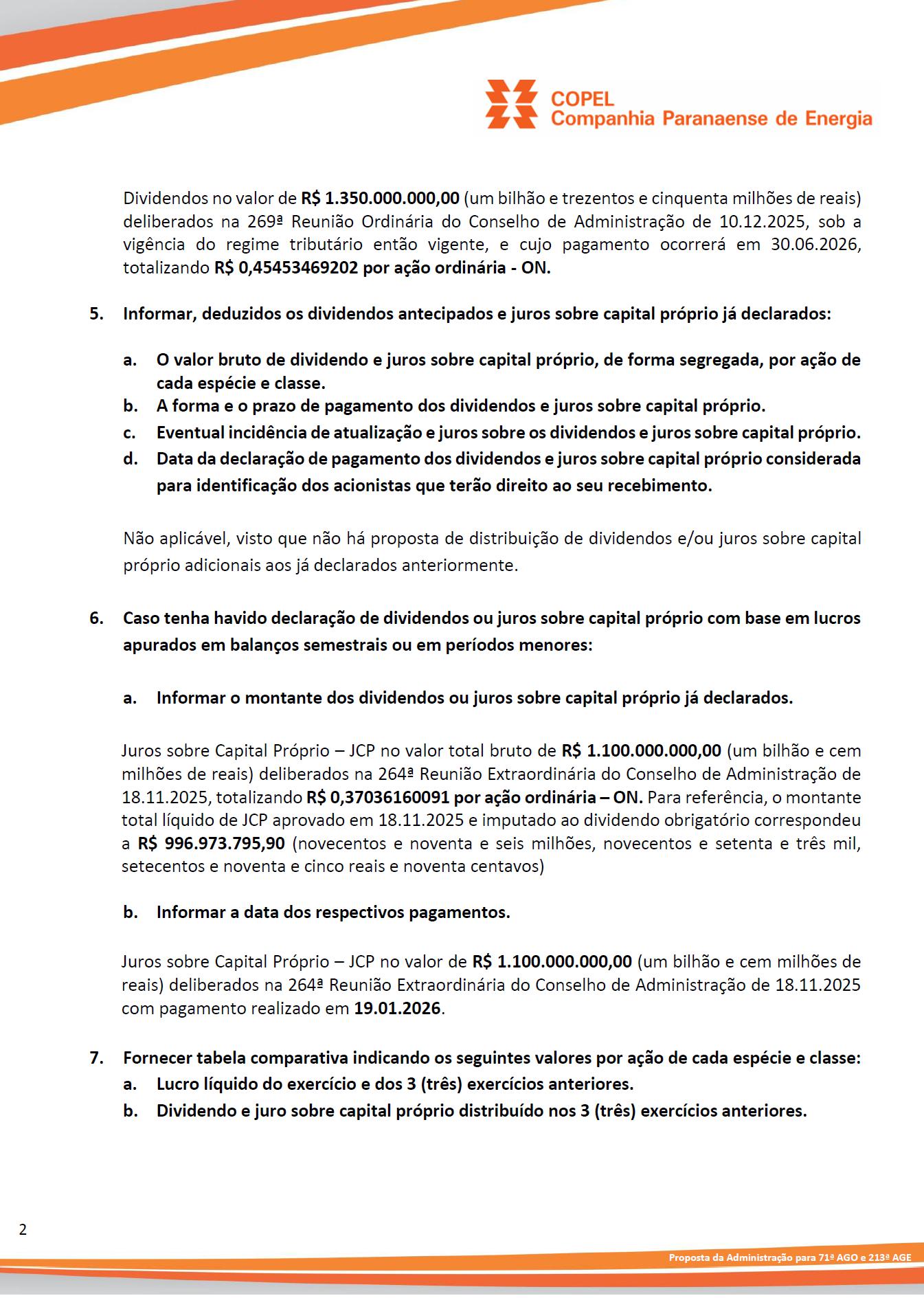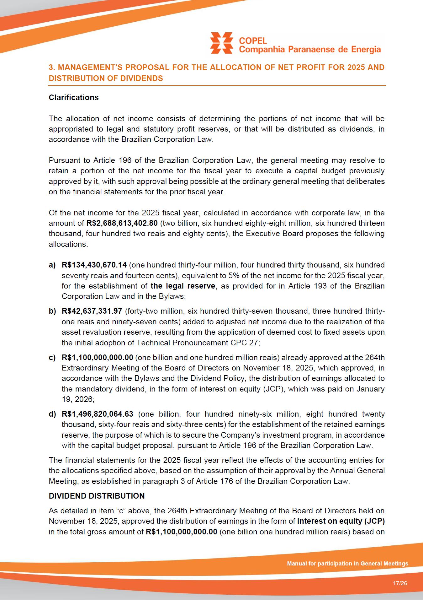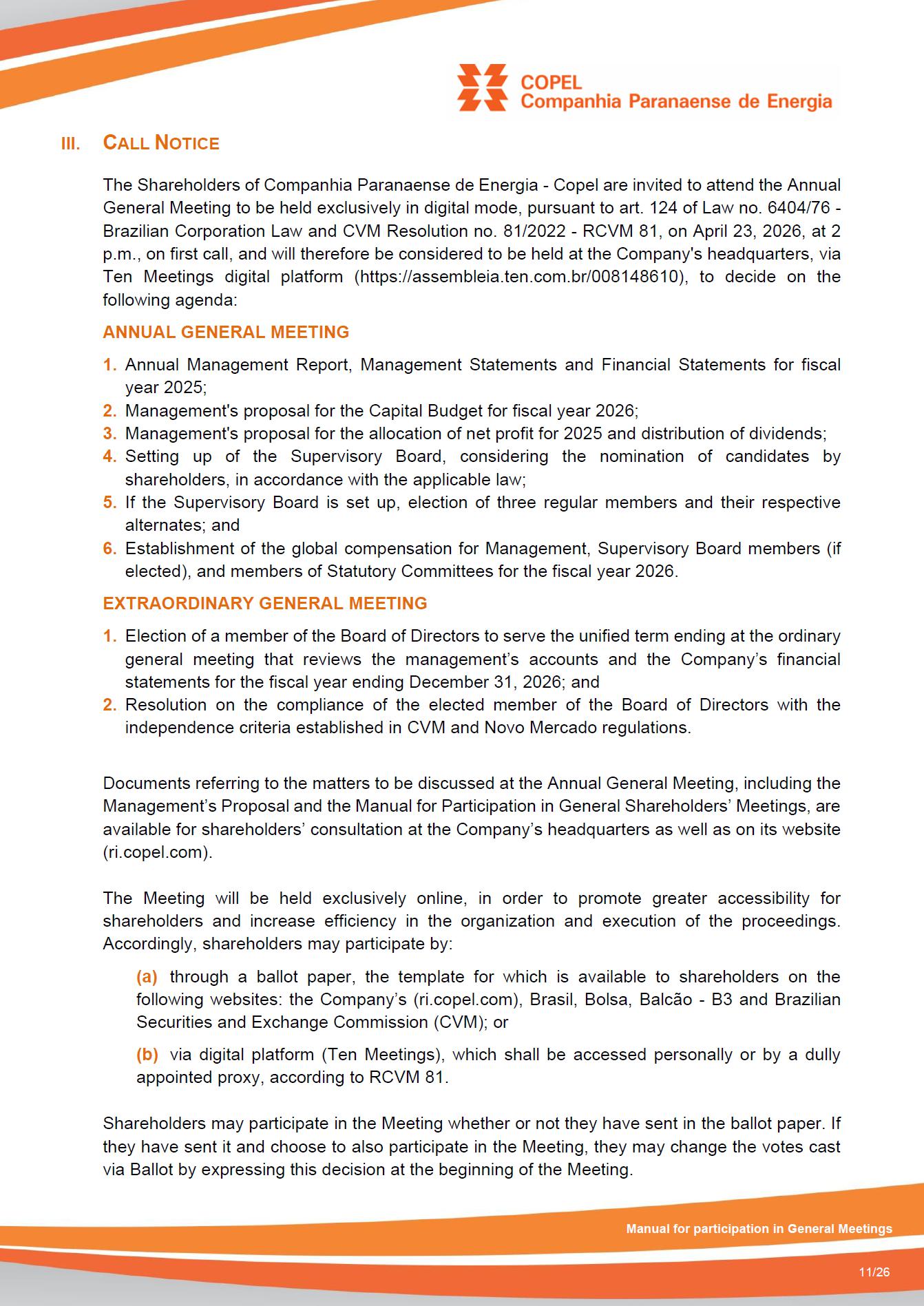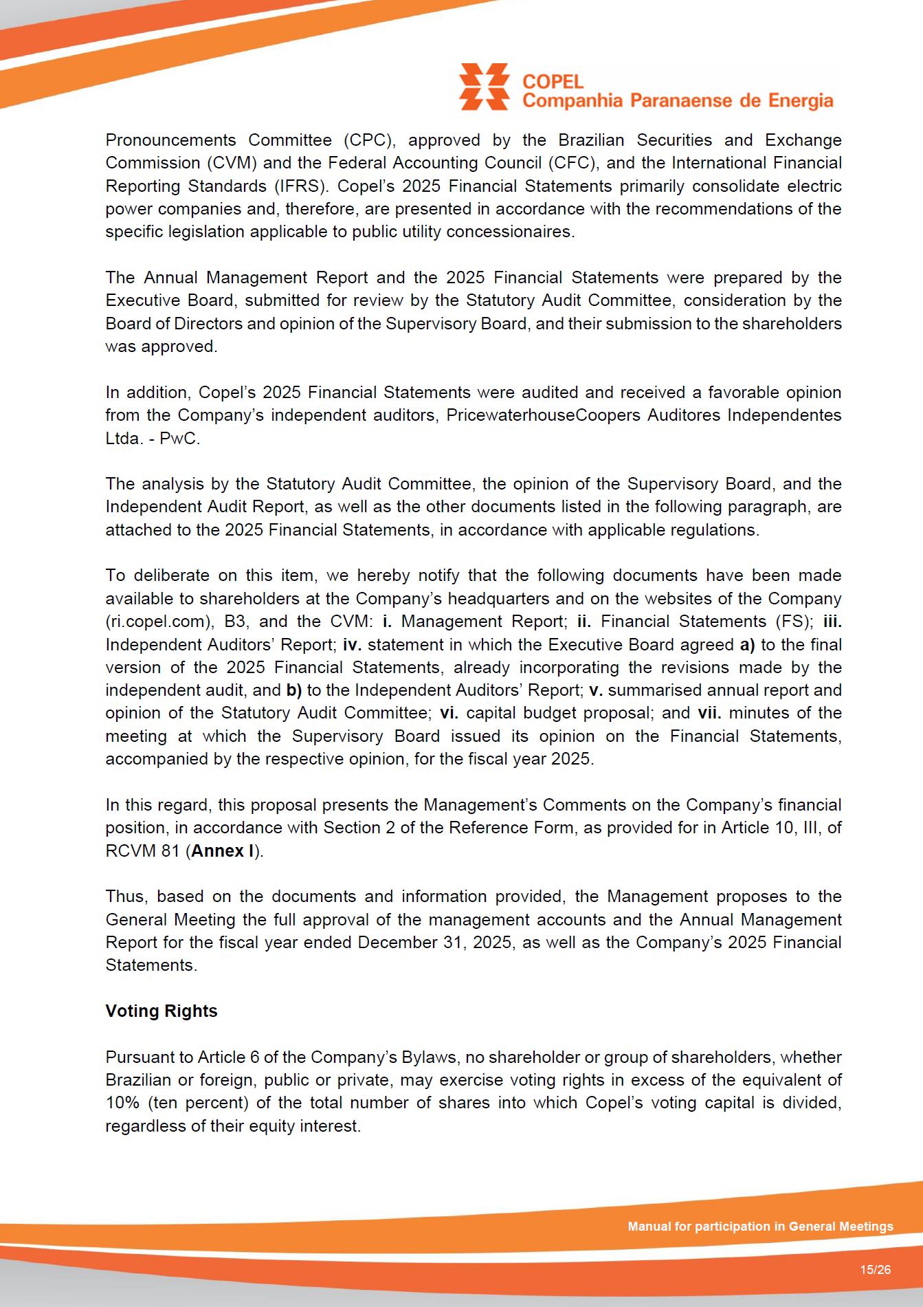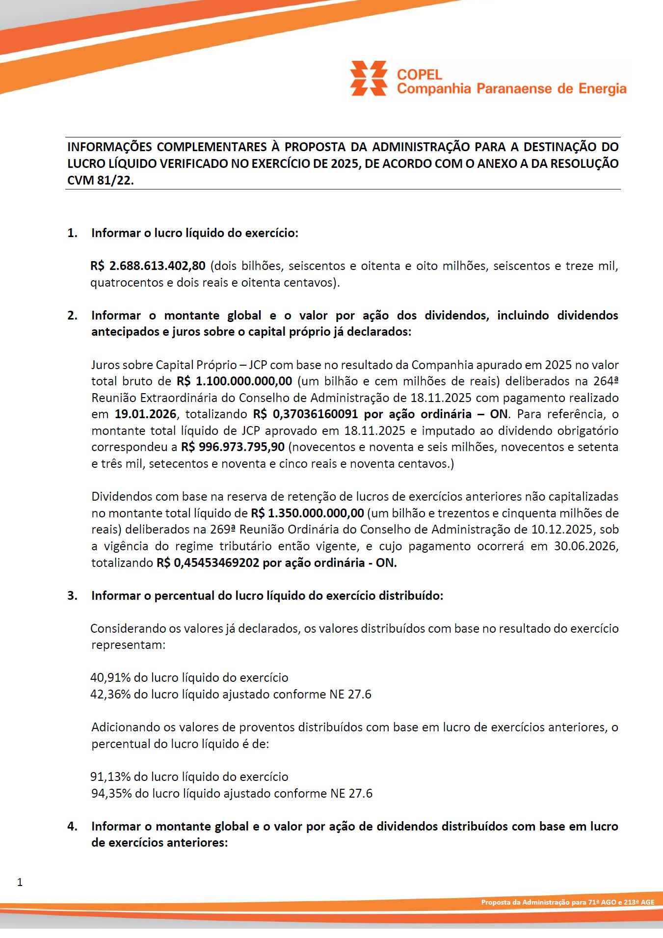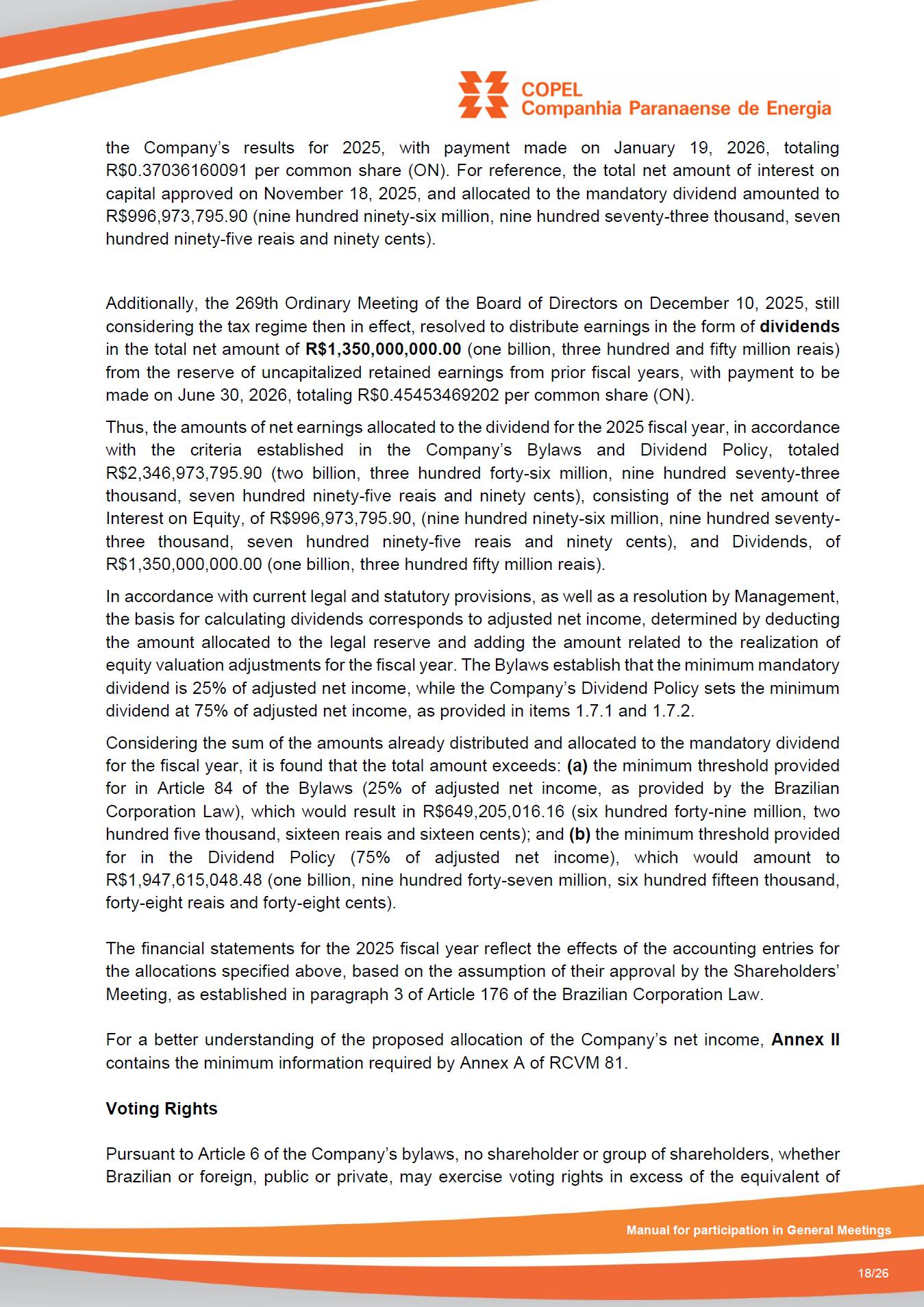 MANAGEMENT'S PROPOSAL AND MANUAL FOR PARTICIPATION IN GENERAL MEETINGS 71st Annual General Meeting 213th Extraordinary General Meeting April 23, 2026 Manual for participation in General Meetings 2/26 TABLE OF CONTENTS I. Message from the Management .............................................................................................. 3 II. Guidance for Participation in the General Meeting ................................................................ 4 Participation via Ballot Paper .................................................................................................. 4 Participation via Digital Platform ............................................................................................. 6 Holders of ADRs…………………………………………………………………………………………9 Convening of the General Meeting …………………………………………………………… . ……9 Voting Rights …….……………………………………………………………………………………. 10 Approval of the Matters on the Agenda …..…………………………………………………….…10 Final guidelines……………………………………………………………………………….………..10 III. Call Notice ............................................................................................................................... 11 IV. Management's Proposal ....................................................................................................... 14 V. Annex ..................................................................................................................................... 27 Manual for participation in General Meetings 3/26 I. MESSAGE FROM THE MANAGEMENT Dear Shareholder: It is with immense pleasure that I present to you this document containing the Management's Proposal and Manual for participation in General Shareholders’ Meetings of the Companhia Paranaense de Energia - Copel, with general guidance for an effective participation and exercise of the vote. This document has been prepared based on Copel's Corporate Governance policy, last updated in 2025, which is founded on integrity, transparency, fairness, accountability, and sustainability. The Proposal aims to present, in a clear and brief way, information related to the Company’s Shareholders’ Meeting, offering contributions that help the understanding of the proposals for resolution, encouraging the participation of shareholders in the events on the Company's corporate agenda. The matters to be presented for resolution of shareholders are described in the Call Notice and in the Management’s Proposal. Copel’s 71st AGM and 213rd Extraordinary General Meeting - EGM will be called to take place, on first call, on April 23, 2026, at 2pm, and will be held exclusively digitally, with the participation of its shareholders virtually, through the Ten Meetings digital platform, without prejudice to the possibility of exercising the vote by means of a Distance Voting Ballot. It is also important to mention that the Meeting will be attended, among others, by members of the Executive Board and representatives of the Supervisory Board, the Statutory Audit Committee and the independent auditor, who will be in a position to provide additional clarifications on the matters on the agenda, in accordance with their respective duties. Your participation is very important, considering that issues relevant to the Company and its shareholders will be dealt with in this Meeting. Yours sincerely, Marcel Martins Malczewski Chairman of the Board of Directors Manual for participation in General Meetings 4/26 II. GUIDANCE FOR PARTICIPATION IN THE GENERAL MEETING Copel’s shareholders may take part in the General Meeting: (i) via Ballot Paper, made available to shareholders on the following websites: the Company’s (ri.copel.com), B3 S.A. - Brasil, Bolsa, Balcão - B3 and Brazilian Securities and Exchange Commission - CVM; or (ii) via Digital Platform, which may be accessed personally or by a duly appointed proxy, pursuant to CVM Resolution no. 81/2022 - RCVM 81, as described below. Participation via Ballot Paper In order to facilitate and encourage the participation of its shareholders, Copel will adopt the remote voting system under the terms of RCVM 81, allowing its Shareholders to send distance voting ballots through their respective custody agents, the Bookkeeping Agent (Itaú Corretora de Valores S.A.) or directly to the Company, in accordance with the following guidelines: Distance voting ballots regarding the AGM and the EGM have been made available on Copel’s website (ri.copel.com) and on CVM's (gov.br/cvm) and B3's (b3.com.br) websites, in printable and manually fillable versions. Shareholders who choose to exercise their right to vote at a distance may (a) fill out and send the voting form directly to the Company, or (b) transmit the filling out instructions to qualified service providers, according to the guidelines below: • Exercise of voting rights through service providers - Remote voting system Shareholders who choose to exercise their voting rights remotely through service providers must transmit their voting instructions to their respective custody agents or through B3's Central Depository or, if the shares are in a book-entry environment, through the bookkeeper, in compliance with the rules determined by the latter. To this end, shareholders must contact their custody agents, access B3's Central Depository or contact the bookkeeping agent and check the procedures they have established for issuing voting instructions via ballot paper, as well as the documents and information they require to do so. The Ballot Papers must be sent to the custody agent, to the Central Depositary of B3 or to the bookkeeping agent, as applicable, in accordance with the procedures established by them, by April 19, 