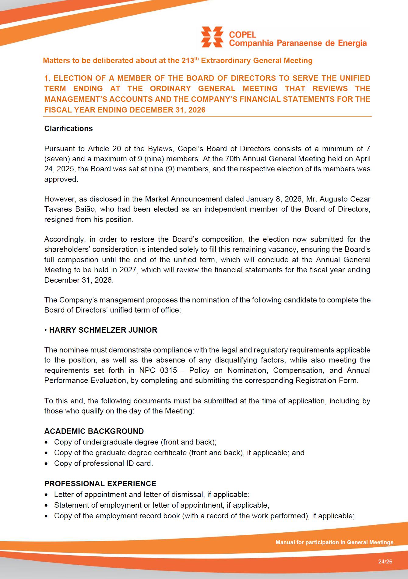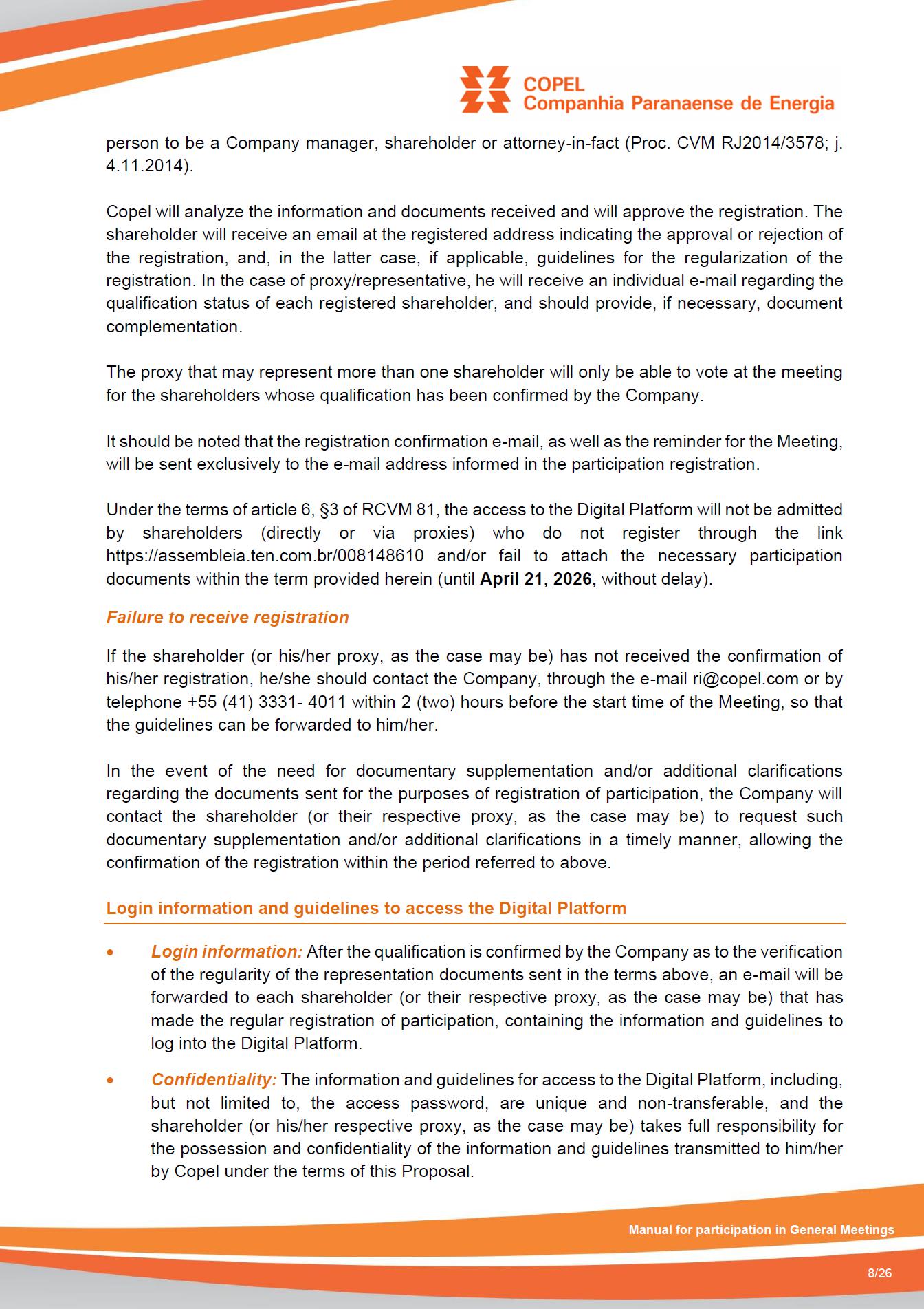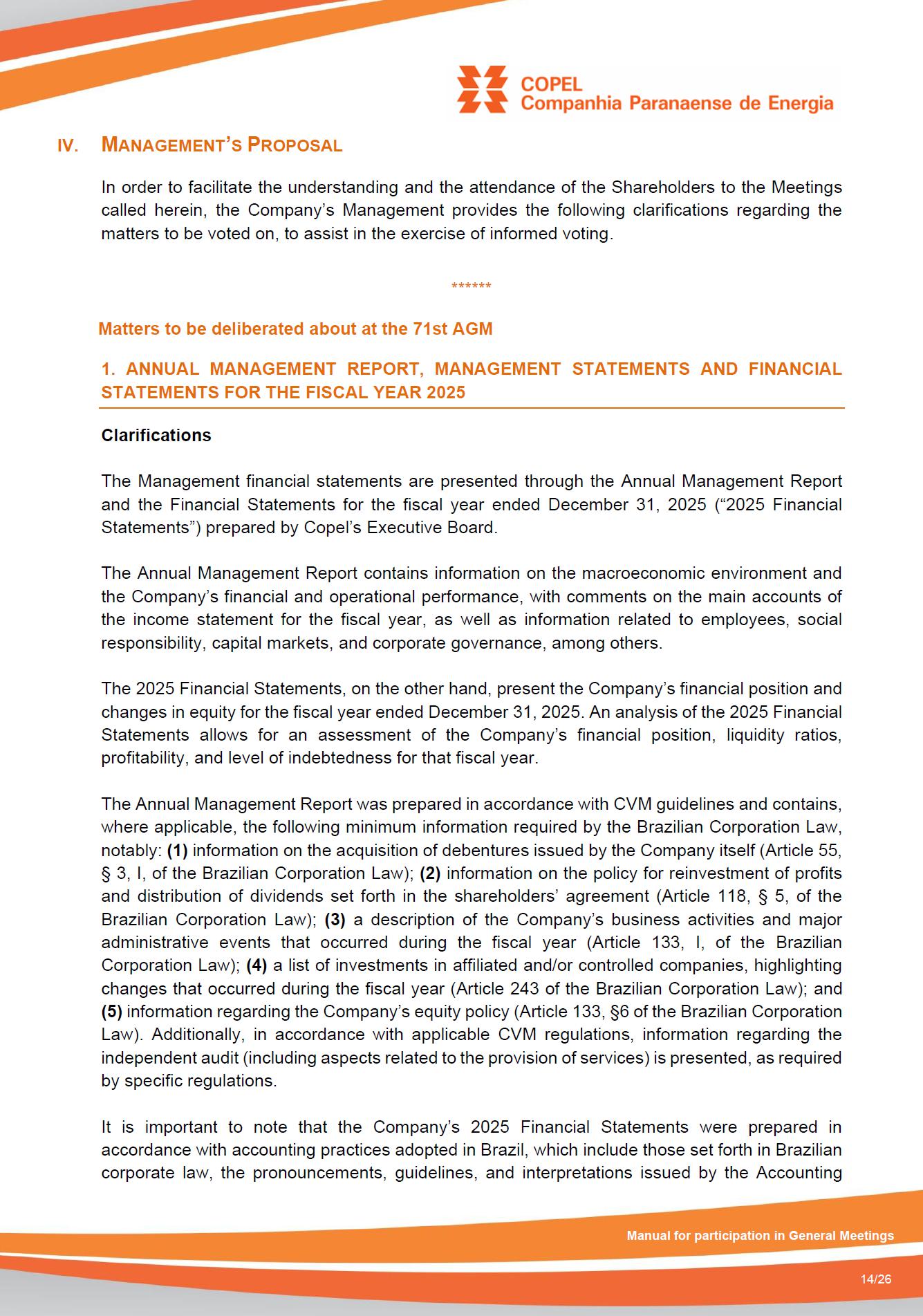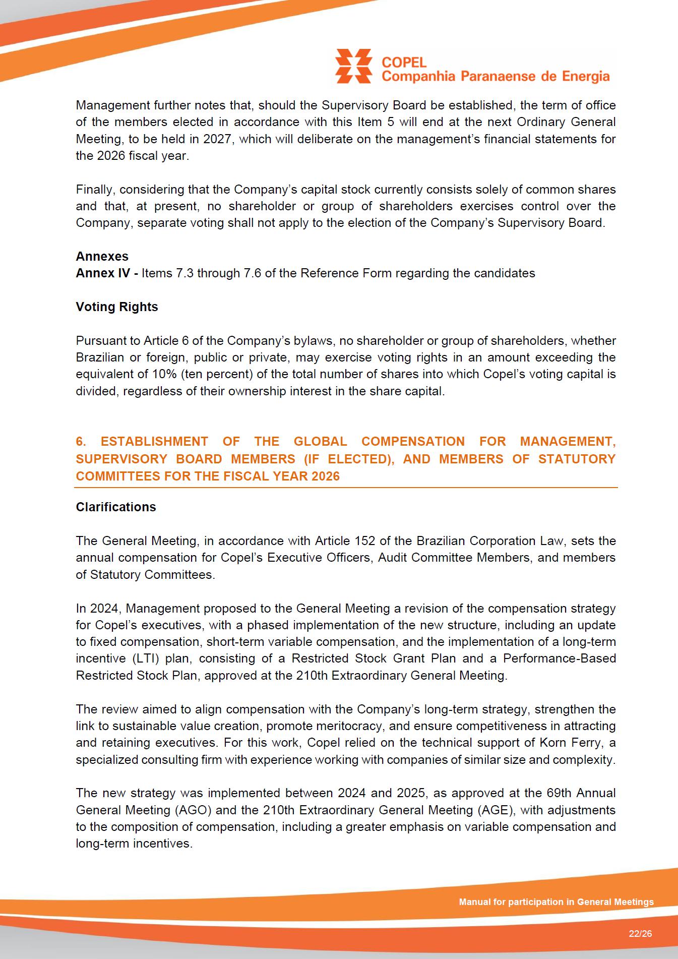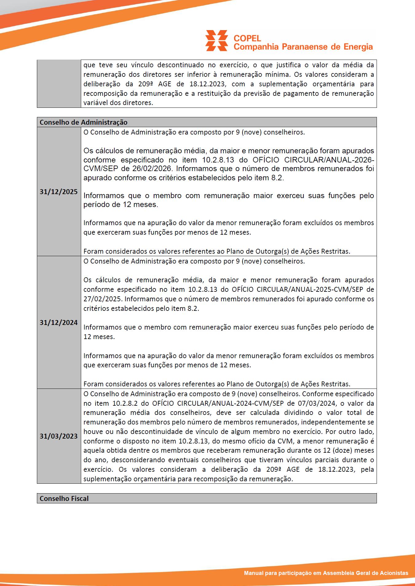 MANAGEMENT'S PROPOSAL AND MANUAL FOR PARTICIPATION IN GENERAL MEETINGS 71st Annual General Meeting 213th Extraordinary General Meeting April 23, 2026 Manual for participation in General Meetings 2/26 TABLE OF CONTENTS I. Message from the Management .............................................................................................. 3 II. Guidance for Participation in the General Meeting ................................................................ 4 Participation via Ballot Paper .................................................................................................. 4 Participation via Digital Platform ............................................................................................. 6 Holders of ADRs…………………………………………………………………………………………9 Convening of the General Meeting …………………………………………………………… . ……9 Voting Rights …….……………………………………………………………………………………. 10 Approval of the Matters on the Agenda …..…………………………………………………….…10 Final guidelines……………………………………………………………………………….………..10 III. Call Notice ............................................................................................................................... 11 IV. Management's Proposal ....................................................................................................... 14 V. Annex ..................................................................................................................................... 27 Manual for participation in General Meetings 3/26 I. MESSAGE FROM THE MANAGEMENT Dear Shareholder: It is with immense pleasure that I present to you this document containing the Management's Proposal and Manual for participation in General Shareholders’ Meetings of the Companhia Paranaense de Energia - Copel, with general guidance for an effective participation and exercise of the vote. This document has been prepared based on Copel's Corporate Governance policy, last updated in 2025, which is founded on integrity, transparency, fairness, accountability, and sustainability. The Proposal aims to present, in a clear and brief way, information related to the Company’s Shareholders’ Meeting, offering contributions that help the understanding of the proposals for resolution, encouraging the participation of shareholders in the events on the Company's corporate agenda. The matters to be presented for resolution of shareholders are described in the Call Notice and in the Management’s Proposal. Copel’s 71st AGM and 213rd Extraordinary General Meeting - EGM will be called to take place, on first call, on April 23, 2026, at 2pm, and will be held exclusively digitally, with the participation of its shareholders virtually, through the Ten Meetings digital platform, without prejudice to the possibility of exercising the vote by means of a Distance Voting Ballot. It is also important to mention that the Meeting will be attended, among others, by members of the Executive Board and representatives of the Supervisory Board, the Statutory Audit Committee and the independent auditor, who will be in a position to provide additional clarifications on the matters on the agenda, in accordance with their respective duties. Your participation is very important, considering that issues relevant to the Company and its shareholders will be dealt with in this Meeting. Yours sincerely, Marcel Martins Malczewski Chairman of the Board of Directors Manual for participation in General Meetings 4/26 II. GUIDANCE FOR PARTICIPATION IN THE GENERAL MEETING Copel’s shareholders may take part in the General Meeting: (i) via Ballot Paper, made available to shareholders on the following websites: the Company’s (ri.copel.com), B3 S.A. - Brasil, Bolsa, Balcão - B3 and Brazilian Securities and Exchange Commission - CVM; or (ii) via Digital Platform, which may be accessed personally or by a duly appointed proxy, pursuant to CVM Resolution no. 81/2022 - RCVM 81, as described below. Participation via Ballot Paper In order to facilitate and encourage the participation of its shareholders, Copel will adopt the remote voting system under the terms of RCVM 81, allowing its Shareholders to send distance voting ballots through their respective custody agents, the Bookkeeping Agent (Itaú Corretora de Valores S.A.) or directly to the Company, in accordance with the following guidelines: Distance voting ballots regarding the AGM and the EGM have been made available on Copel’s website (ri.copel.com) and on CVM's (gov.br/cvm) and B3's (b3.com.br) websites, in printable and manually fillable versions. Shareholders who choose to exercise their right to vote at a distance may (a) fill out and send the voting form directly to the Company, or (b) transmit the filling out instructions to qualified service providers, according to the guidelines below: • Exercise of voting rights through service providers - Remote voting system Shareholders who choose to exercise their voting rights remotely through service providers must transmit their voting instructions to their respective custody agents or through B3's Central Depository or, if the shares are in a book-entry environment, through the bookkeeper, in compliance with the rules determined by the latter. To this end, shareholders must contact their custody agents, access B3's Central Depository or contact the bookkeeping agent and check the procedures they have established for issuing voting instructions via ballot paper, as well as the documents and information they require to do so. The Ballot Papers must be sent to the custody agent, to the Central Depositary of B3 or to the bookkeeping agent, as applicable, in accordance with the procedures established by them, by April 19, 
