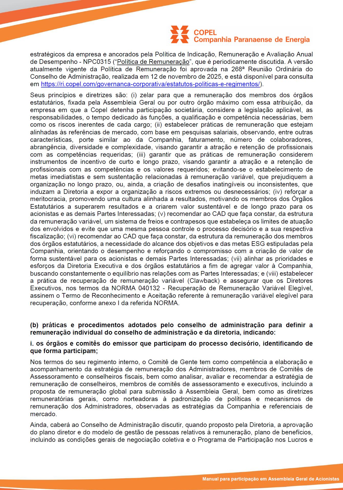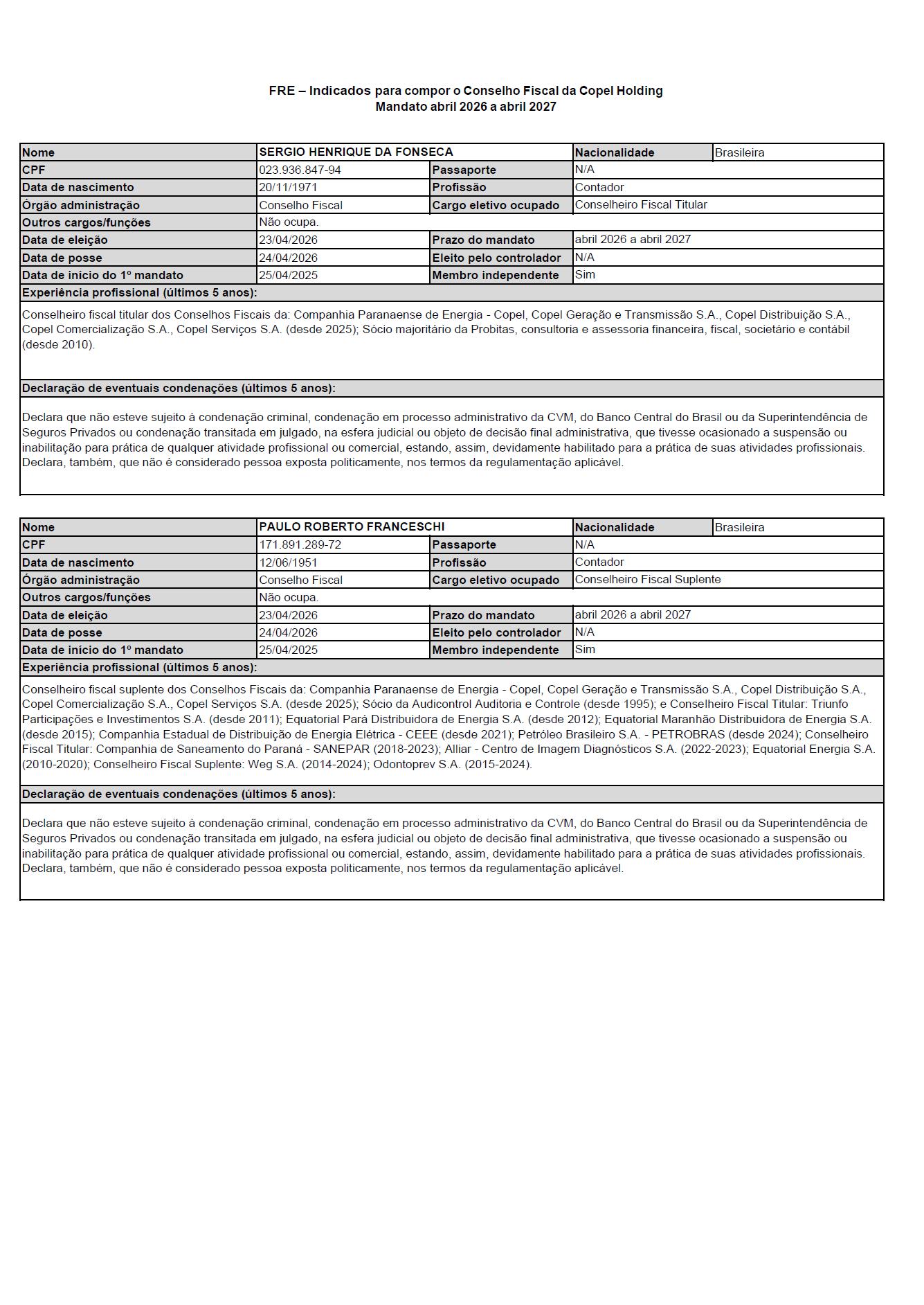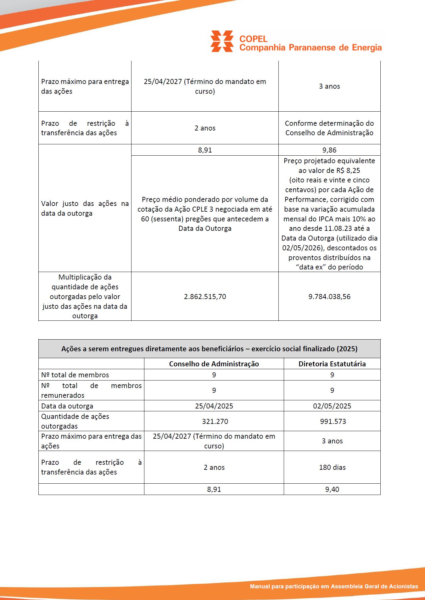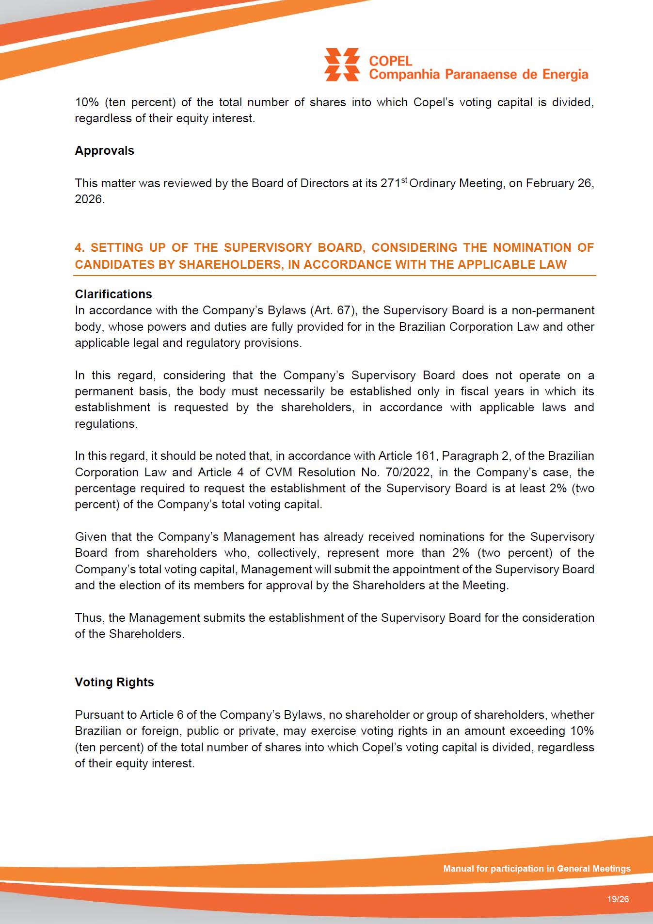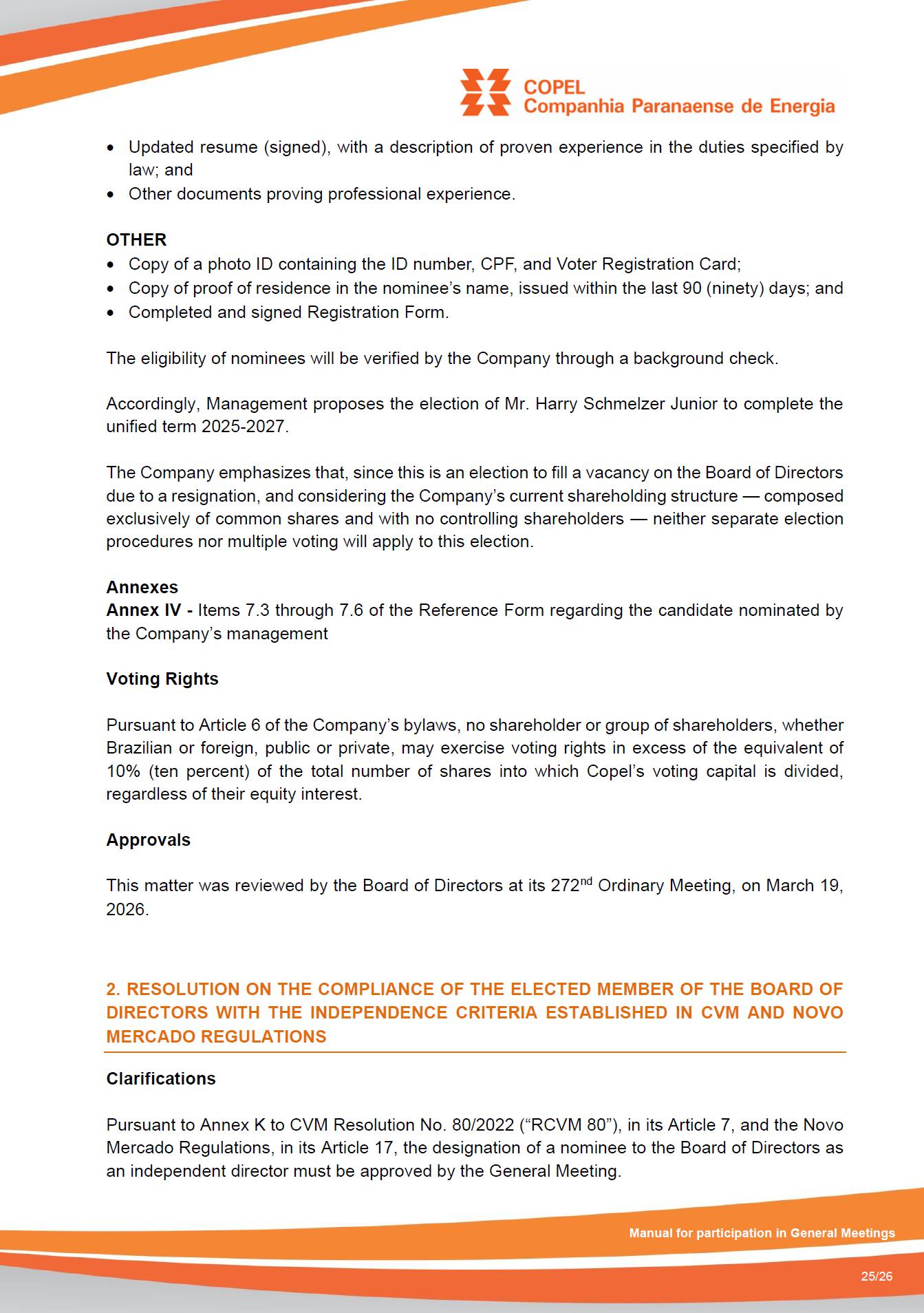 MANAGEMENT'S PROPOSAL AND MANUAL FOR PARTICIPATION IN GENERAL MEETINGS 71st Annual General Meeting 213th Extraordinary General Meeting April 23, 2026 Manual for participation in General Meetings 2/26 TABLE OF CONTENTS I. Message from the Management .............................................................................................. 3 II. Guidance for Participation in the General Meeting ................................................................ 4 Participation via Ballot Paper .................................................................................................. 4 Participation via Digital Platform ............................................................................................. 6 Holders of ADRs…………………………………………………………………………………………9 Convening of the General Meeting …………………………………………………………… . ……9 Voting Rights …….……………………………………………………………………………………. 10 Approval of the Matters on the Agenda …..…………………………………………………….…10 Final guidelines……………………………………………………………………………….………..10 III. Call Notice ............................................................................................................................... 11 IV. Management's Proposal ....................................................................................................... 14 V. Annex ..................................................................................................................................... 27 Manual for participation in General Meetings 3/26 I. MESSAGE FROM THE MANAGEMENT Dear Shareholder: It is with immense pleasure that I present to you this document containing the Management's Proposal and Manual for participation in General Shareholders’ Meetings of the Companhia Paranaense de Energia - Copel, with general guidance for an effective participation and exercise of the vote. This document has been prepared based on Copel's Corporate Governance policy, last updated in 2025, which is founded on integrity, transparency, fairness, accountability, and sustainability. The Proposal aims to present, in a clear and brief way, information related to the Company’s Shareholders’ Meeting, offering contributions that help the understanding of the proposals for resolution, encouraging the participation of shareholders in the events on the Company's corporate agenda. The matters to be presented for resolution of shareholders are described in the Call Notice and in the Management’s Proposal. Copel’s 71st AGM and 213rd Extraordinary General Meeting - EGM will be called to take place, on first call, on April 23, 2026, at 2pm, and will be held exclusively digitally, with the participation of its shareholders virtually, through the Ten Meetings digital platform, without prejudice to the possibility of exercising the vote by means of a Distance Voting Ballot. It is also important to mention that the Meeting will be attended, among others, by members of the Executive Board and representatives of the Supervisory Board, the Statutory Audit Committee and the independent auditor, who will be in a position to provide additional clarifications on the matters on the agenda, in accordance with their respective duties. Your participation is very important, considering that issues relevant to the Company and its shareholders will be dealt with in this Meeting. Yours sincerely, Marcel Martins Malczewski Chairman of the Board of Directors Manual for participation in General Meetings 4/26 II. GUIDANCE FOR PARTICIPATION IN THE GENERAL MEETING Copel’s shareholders may take part in the General Meeting: (i) via Ballot Paper, made available to shareholders on the following websites: the Company’s (ri.copel.com), B3 S.A. - Brasil, Bolsa, Balcão - B3 and Brazilian Securities and Exchange Commission - CVM; or (ii) via Digital Platform, which may be accessed personally or by a duly appointed proxy, pursuant to CVM Resolution no. 81/2022 - RCVM 81, as described below. Participation via Ballot Paper In order to facilitate and encourage the participation of its shareholders, Copel will adopt the remote voting system under the terms of RCVM 81, allowing its Shareholders to send distance voting ballots through their respective custody agents, the Bookkeeping Agent (Itaú Corretora de Valores S.A.) or directly to the Company, in accordance with the following guidelines: Distance voting ballots regarding the AGM and the EGM have been made available on Copel’s website (ri.copel.com) and on CVM's (gov.br/cvm) and B3's (b3.com.br) websites, in printable and manually fillable versions. Shareholders who choose to exercise their right to vote at a distance may (a) fill out and send the voting form directly to the Company, or (b) transmit the filling out instructions to qualified service providers, according to the guidelines below: • Exercise of voting rights through service providers - Remote voting system Shareholders who choose to exercise their voting rights remotely through service providers must transmit their voting instructions to their respective custody agents or through B3's Central Depository or, if the shares are in a book-entry environment, through the bookkeeper, in compliance with the rules determined by the latter. To this end, shareholders must contact their custody agents, access B3's Central Depository or contact the bookkeeping agent and check the procedures they have established for issuing voting instructions via ballot paper, as well as the documents and information they require to do so. The Ballot Papers must be sent to the custody agent, to the Central Depositary of B3 or to the bookkeeping agent, as applicable, in accordance with the procedures established by them, by April 19, 