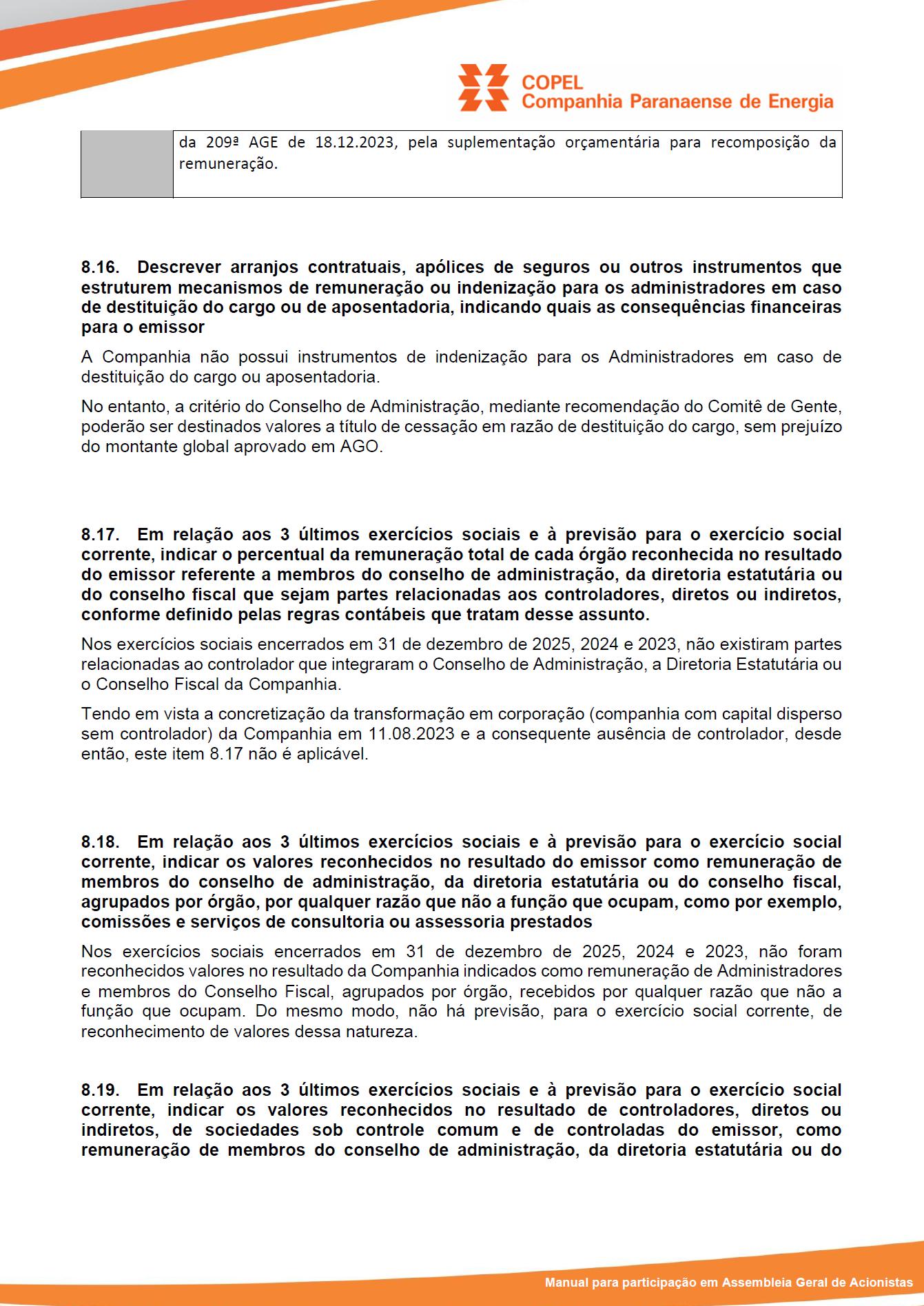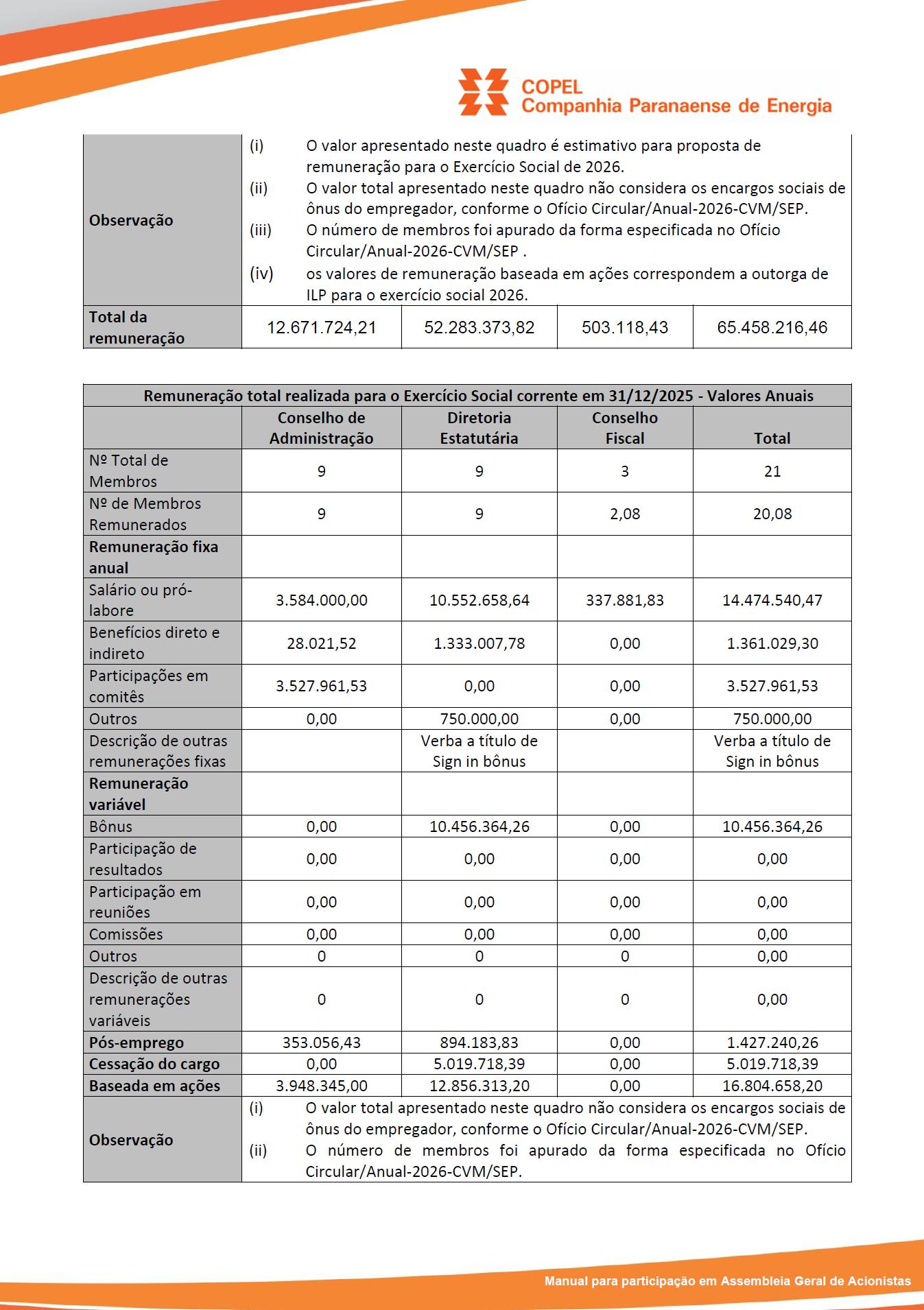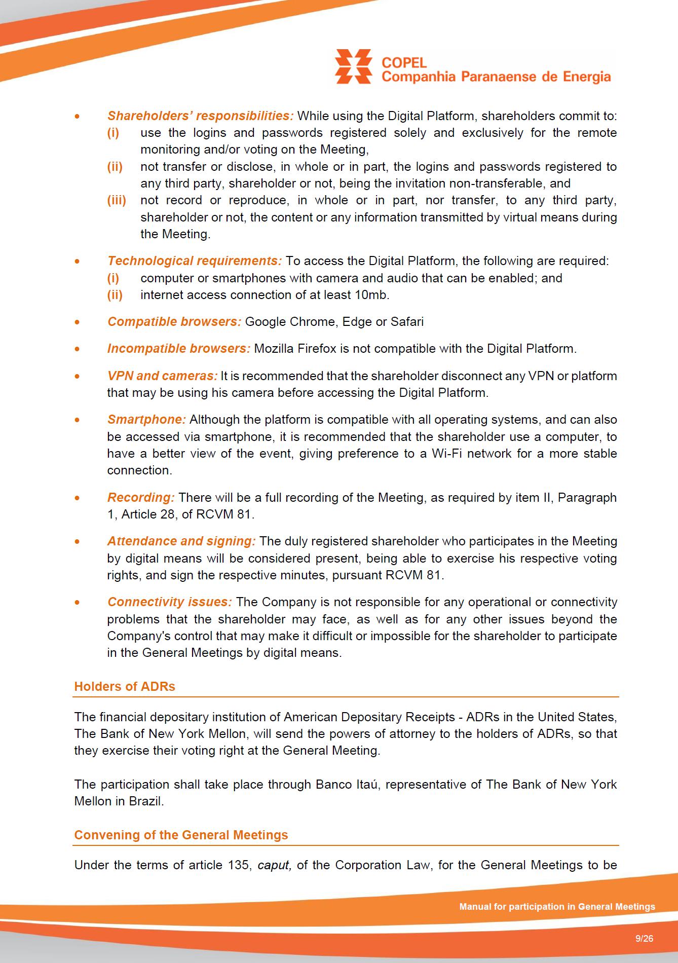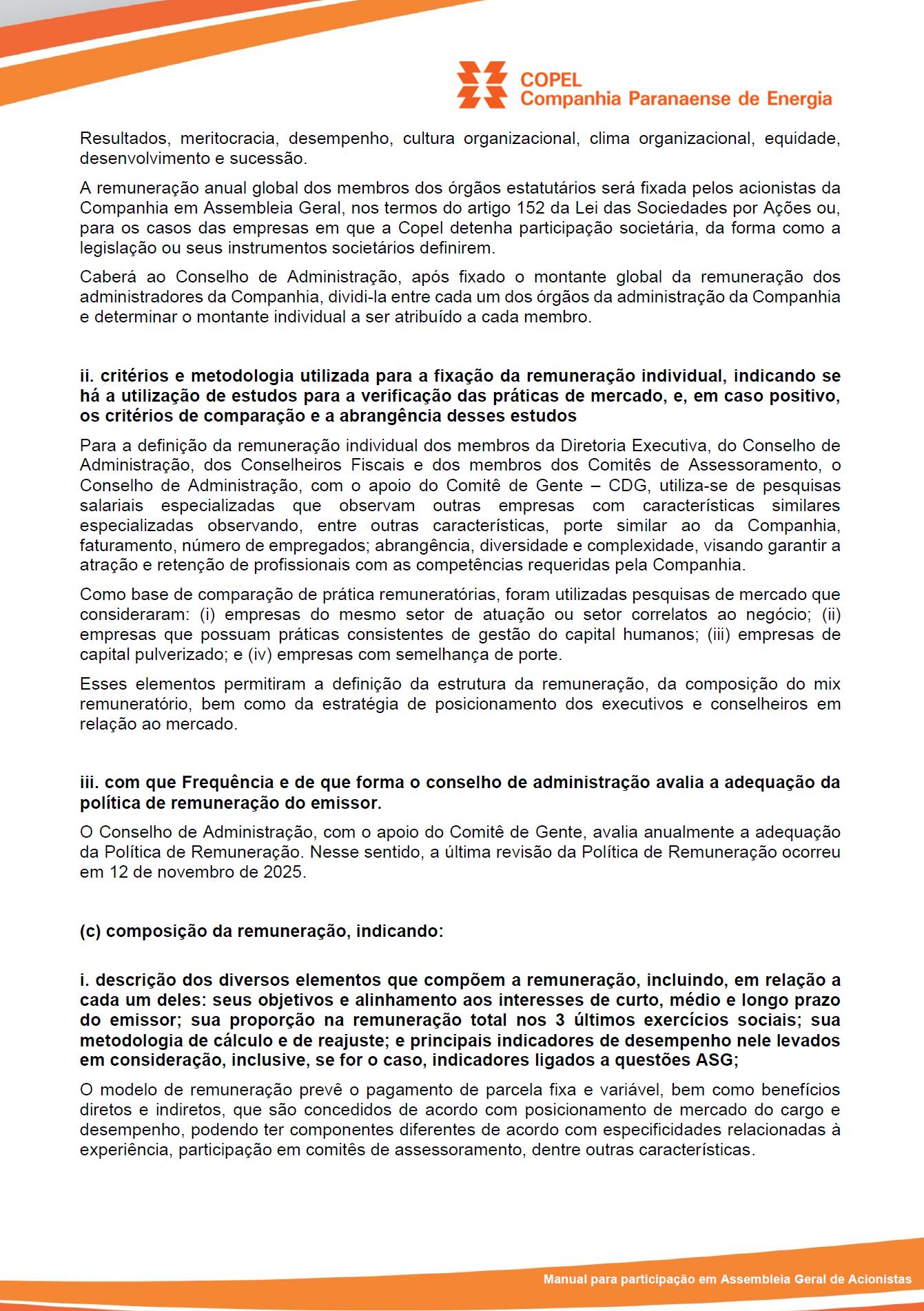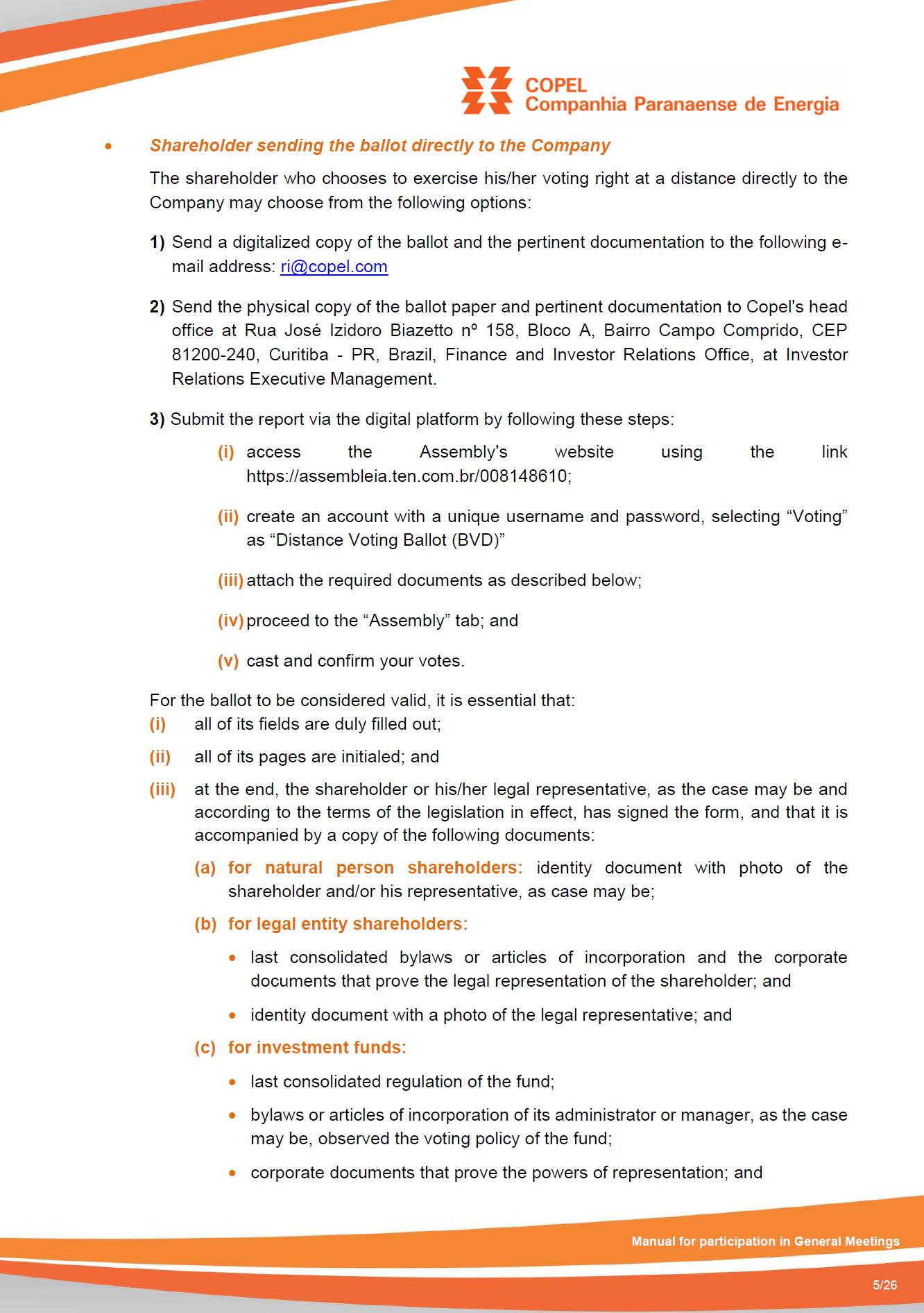 MANAGEMENT'S PROPOSAL AND MANUAL FOR PARTICIPATION IN GENERAL MEETINGS 71st Annual General Meeting 213th Extraordinary General Meeting April 23, 2026 Manual for participation in General Meetings 2/26 TABLE OF CONTENTS I. Message from the Management .............................................................................................. 3 II. Guidance for Participation in the General Meeting ................................................................ 4 Participation via Ballot Paper .................................................................................................. 4 Participation via Digital Platform ............................................................................................. 6 Holders of ADRs…………………………………………………………………………………………9 Convening of the General Meeting …………………………………………………………… . ……9 Voting Rights …….……………………………………………………………………………………. 10 Approval of the Matters on the Agenda …..…………………………………………………….…10 Final guidelines……………………………………………………………………………….………..10 III. Call Notice ............................................................................................................................... 11 IV. Management's Proposal ....................................................................................................... 14 V. Annex ..................................................................................................................................... 27 Manual for participation in General Meetings 3/26 I. MESSAGE FROM THE MANAGEMENT Dear Shareholder: It is with immense pleasure that I present to you this document containing the Management's Proposal and Manual for participation in General Shareholders’ Meetings of the Companhia Paranaense de Energia - Copel, with general guidance for an effective participation and exercise of the vote. This document has been prepared based on Copel's Corporate Governance policy, last updated in 2025, which is founded on integrity, transparency, fairness, accountability, and sustainability. The Proposal aims to present, in a clear and brief way, information related to the Company’s Shareholders’ Meeting, offering contributions that help the understanding of the proposals for resolution, encouraging the participation of shareholders in the events on the Company's corporate agenda. The matters to be presented for resolution of shareholders are described in the Call Notice and in the Management’s Proposal. Copel’s 71st AGM and 213rd Extraordinary General Meeting - EGM will be called to take place, on first call, on April 23, 2026, at 2pm, and will be held exclusively digitally, with the participation of its shareholders virtually, through the Ten Meetings digital platform, without prejudice to the possibility of exercising the vote by means of a Distance Voting Ballot. It is also important to mention that the Meeting will be attended, among others, by members of the Executive Board and representatives of the Supervisory Board, the Statutory Audit Committee and the independent auditor, who will be in a position to provide additional clarifications on the matters on the agenda, in accordance with their respective duties. Your participation is very important, considering that issues relevant to the Company and its shareholders will be dealt with in this Meeting. Yours sincerely, Marcel Martins Malczewski Chairman of the Board of Directors Manual for participation in General Meetings 4/26 II. GUIDANCE FOR PARTICIPATION IN THE GENERAL MEETING Copel’s shareholders may take part in the General Meeting: (i) via Ballot Paper, made available to shareholders on the following websites: the Company’s (ri.copel.com), B3 S.A. - Brasil, Bolsa, Balcão - B3 and Brazilian Securities and Exchange Commission - CVM; or (ii) via Digital Platform, which may be accessed personally or by a duly appointed proxy, pursuant to CVM Resolution no. 81/2022 - RCVM 81, as described below. Participation via Ballot Paper In order to facilitate and encourage the participation of its shareholders, Copel will adopt the remote voting system under the terms of RCVM 81, allowing its Shareholders to send distance voting ballots through their respective custody agents, the Bookkeeping Agent (Itaú Corretora de Valores S.A.) or directly to the Company, in accordance with the following guidelines: Distance voting ballots regarding the AGM and the EGM have been made available on Copel’s website (ri.copel.com) and on CVM's (gov.br/cvm) and B3's (b3.com.br) websites, in printable and manually fillable versions. Shareholders who choose to exercise their right to vote at a distance may (a) fill out and send the voting form directly to the Company, or (b) transmit the filling out instructions to qualified service providers, according to the guidelines below: • Exercise of voting rights through service providers - Remote voting system Shareholders who choose to exercise their voting rights remotely through service providers must transmit their voting instructions to their respective custody agents or through B3's Central Depository or, if the shares are in a book-entry environment, through the bookkeeper, in compliance with the rules determined by the latter. To this end, shareholders must contact their custody agents, access B3's Central Depository or contact the bookkeeping agent and check the procedures they have established for issuing voting instructions via ballot paper, as well as the documents and information they require to do so. The Ballot Papers must be sent to the custody agent, to the Central Depositary of B3 or to the bookkeeping agent, as applicable, in accordance with the procedures established by them, by April 19, 