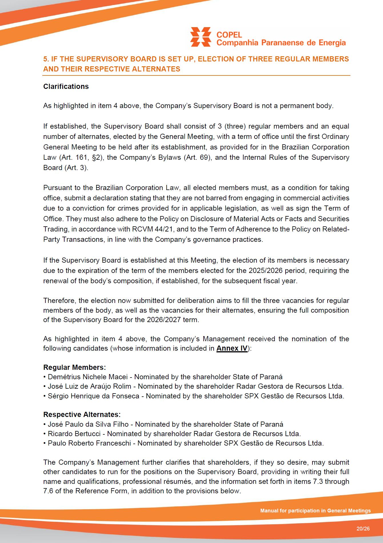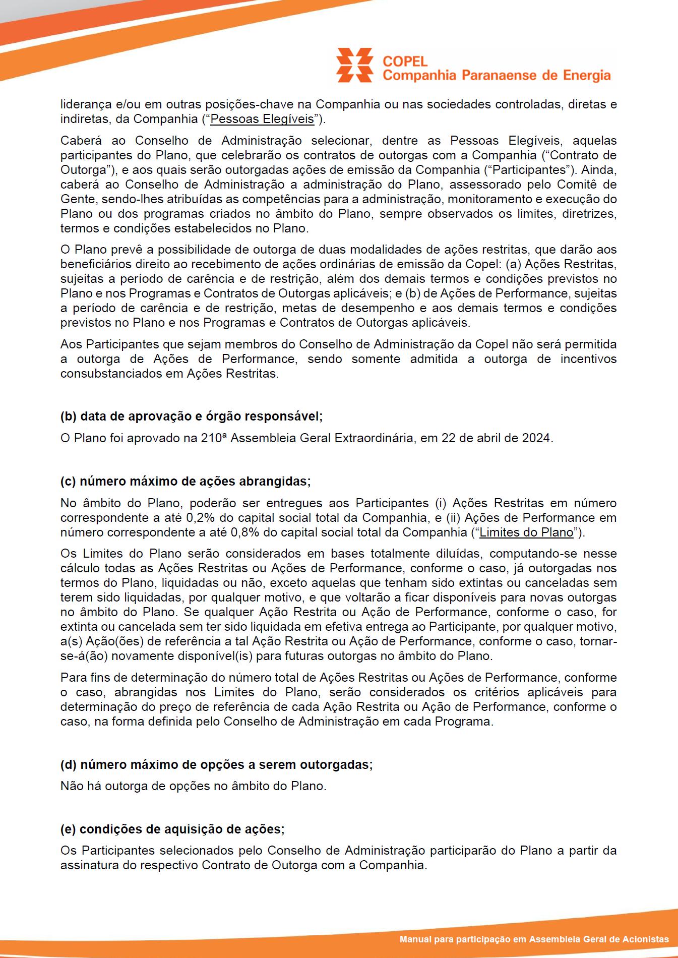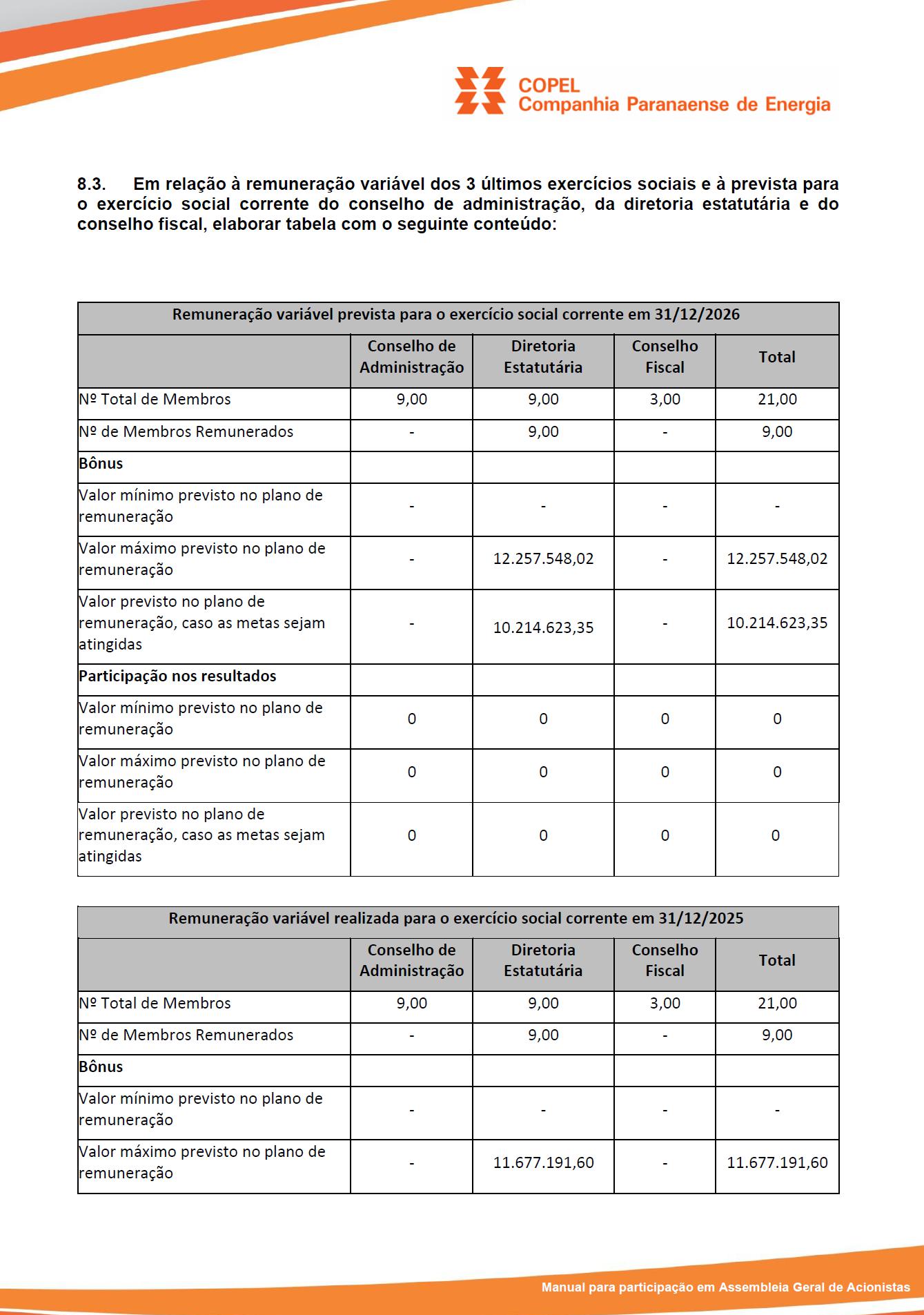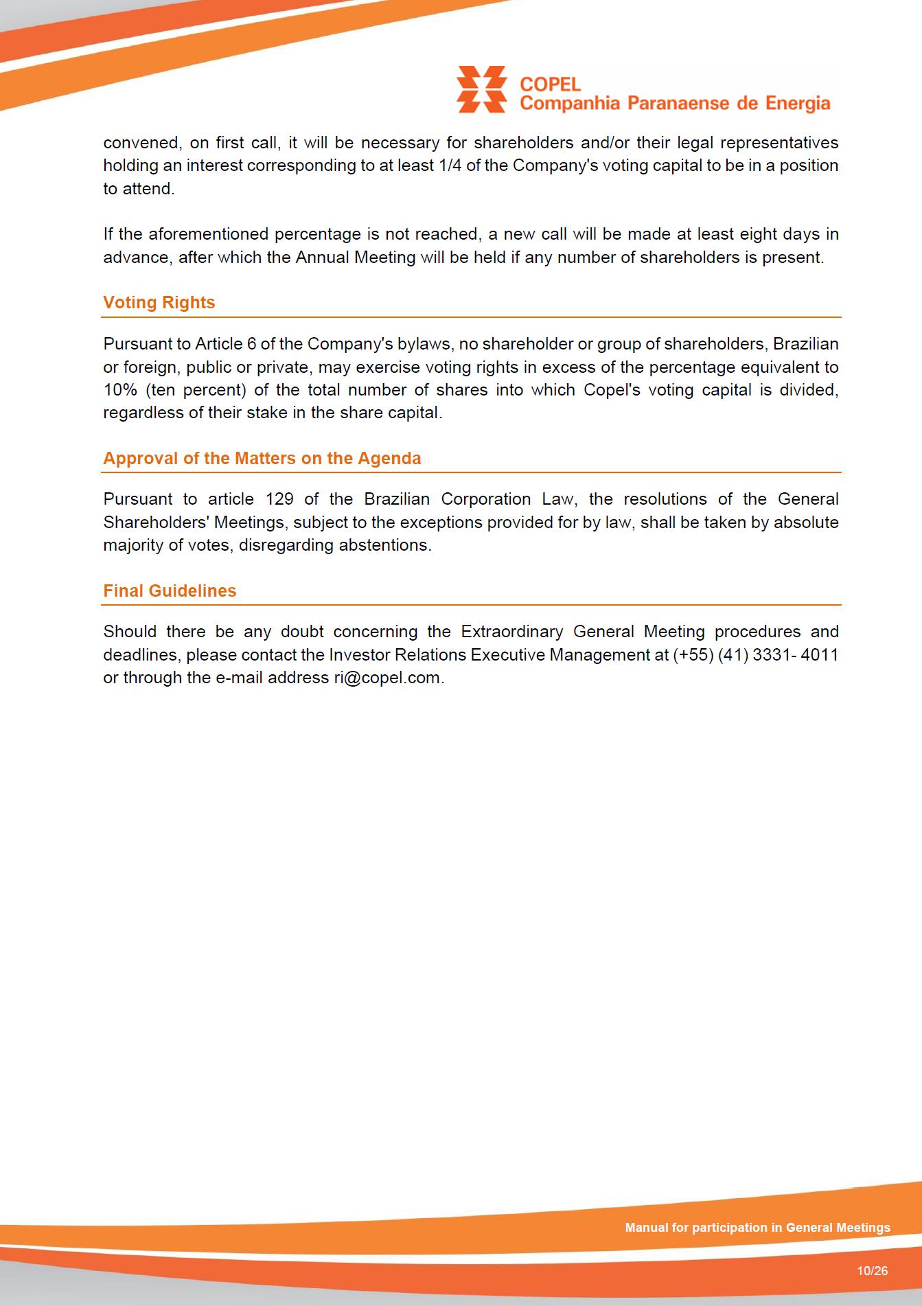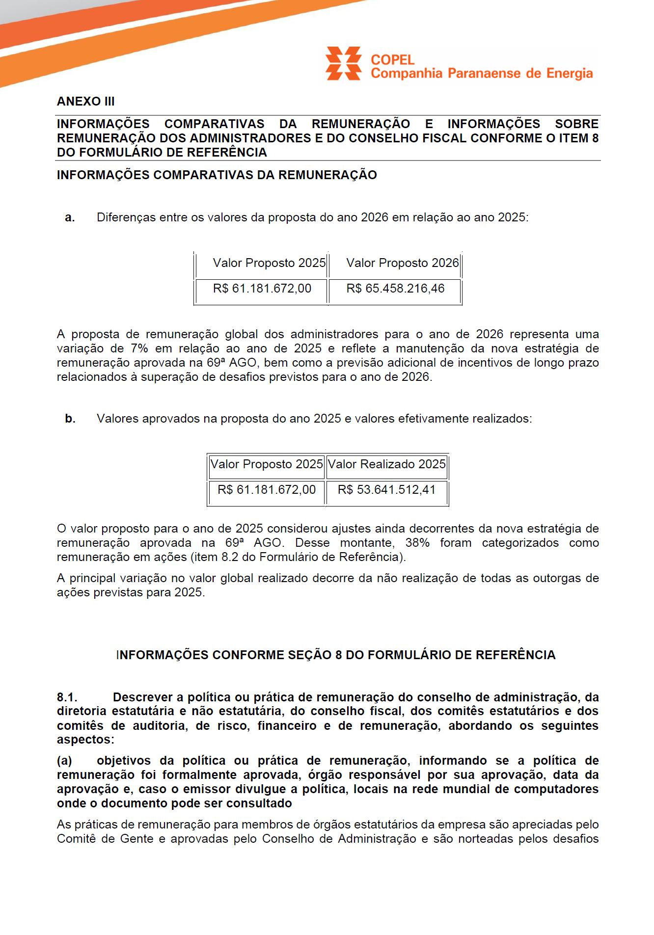 MANAGEMENT'S PROPOSAL AND MANUAL FOR PARTICIPATION IN GENERAL MEETINGS 71st Annual General Meeting 213th Extraordinary General Meeting April 23, 2026 Manual for participation in General Meetings 2/26 TABLE OF CONTENTS I. Message from the Management .............................................................................................. 3 II. Guidance for Participation in the General Meeting ................................................................ 4 Participation via Ballot Paper .................................................................................................. 4 Participation via Digital Platform ............................................................................................. 6 Holders of ADRs…………………………………………………………………………………………9 Convening of the General Meeting …………………………………………………………… . ……9 Voting Rights …….……………………………………………………………………………………. 10 Approval of the Matters on the Agenda …..…………………………………………………….…10 Final guidelines……………………………………………………………………………….………..10 III. Call Notice ............................................................................................................................... 11 IV. Management's Proposal ....................................................................................................... 14 V. Annex ..................................................................................................................................... 27 Manual for participation in General Meetings 3/26 I. MESSAGE FROM THE MANAGEMENT Dear Shareholder: It is with immense pleasure that I present to you this document containing the Management's Proposal and Manual for participation in General Shareholders’ Meetings of the Companhia Paranaense de Energia - Copel, with general guidance for an effective participation and exercise of the vote. This document has been prepared based on Copel's Corporate Governance policy, last updated in 2025, which is founded on integrity, transparency, fairness, accountability, and sustainability. The Proposal aims to present, in a clear and brief way, information related to the Company’s Shareholders’ Meeting, offering contributions that help the understanding of the proposals for resolution, encouraging the participation of shareholders in the events on the Company's corporate agenda. The matters to be presented for resolution of shareholders are described in the Call Notice and in the Management’s Proposal. Copel’s 71st AGM and 213rd Extraordinary General Meeting - EGM will be called to take place, on first call, on April 23, 2026, at 2pm, and will be held exclusively digitally, with the participation of its shareholders virtually, through the Ten Meetings digital platform, without prejudice to the possibility of exercising the vote by means of a Distance Voting Ballot. It is also important to mention that the Meeting will be attended, among others, by members of the Executive Board and representatives of the Supervisory Board, the Statutory Audit Committee and the independent auditor, who will be in a position to provide additional clarifications on the matters on the agenda, in accordance with their respective duties. Your participation is very important, considering that issues relevant to the Company and its shareholders will be dealt with in this Meeting. Yours sincerely, Marcel Martins Malczewski Chairman of the Board of Directors Manual for participation in General Meetings 4/26 II. GUIDANCE FOR PARTICIPATION IN THE GENERAL MEETING Copel’s shareholders may take part in the General Meeting: (i) via Ballot Paper, made available to shareholders on the following websites: the Company’s (ri.copel.com), B3 S.A. - Brasil, Bolsa, Balcão - B3 and Brazilian Securities and Exchange Commission - CVM; or (ii) via Digital Platform, which may be accessed personally or by a duly appointed proxy, pursuant to CVM Resolution no. 81/2022 - RCVM 81, as described below. Participation via Ballot Paper In order to facilitate and encourage the participation of its shareholders, Copel will adopt the remote voting system under the terms of RCVM 81, allowing its Shareholders to send distance voting ballots through their respective custody agents, the Bookkeeping Agent (Itaú Corretora de Valores S.A.) or directly to the Company, in accordance with the following guidelines: Distance voting ballots regarding the AGM and the EGM have been made available on Copel’s website (ri.copel.com) and on CVM's (gov.br/cvm) and B3's (b3.com.br) websites, in printable and manually fillable versions. Shareholders who choose to exercise their right to vote at a distance may (a) fill out and send the voting form directly to the Company, or (b) transmit the filling out instructions to qualified service providers, according to the guidelines below: • Exercise of voting rights through service providers - Remote voting system Shareholders who choose to exercise their voting rights remotely through service providers must transmit their voting instructions to their respective custody agents or through B3's Central Depository or, if the shares are in a book-entry environment, through the bookkeeper, in compliance with the rules determined by the latter. To this end, shareholders must contact their custody agents, access B3's Central Depository or contact the bookkeeping agent and check the procedures they have established for issuing voting instructions via ballot paper, as well as the documents and information they require to do so. The Ballot Papers must be sent to the custody agent, to the Central Depositary of B3 or to the bookkeeping agent, as applicable, in accordance with the procedures established by them, by April 19, 