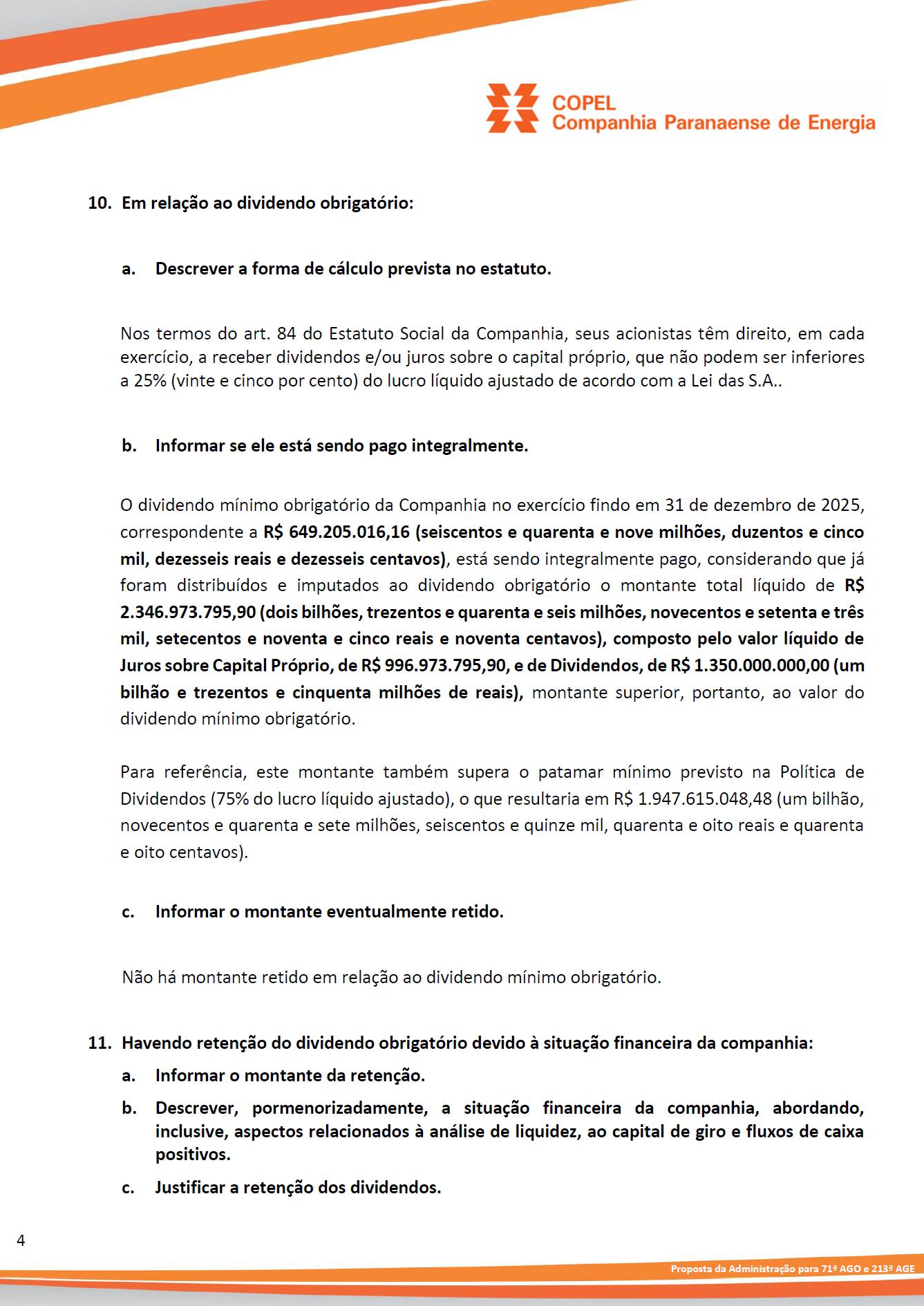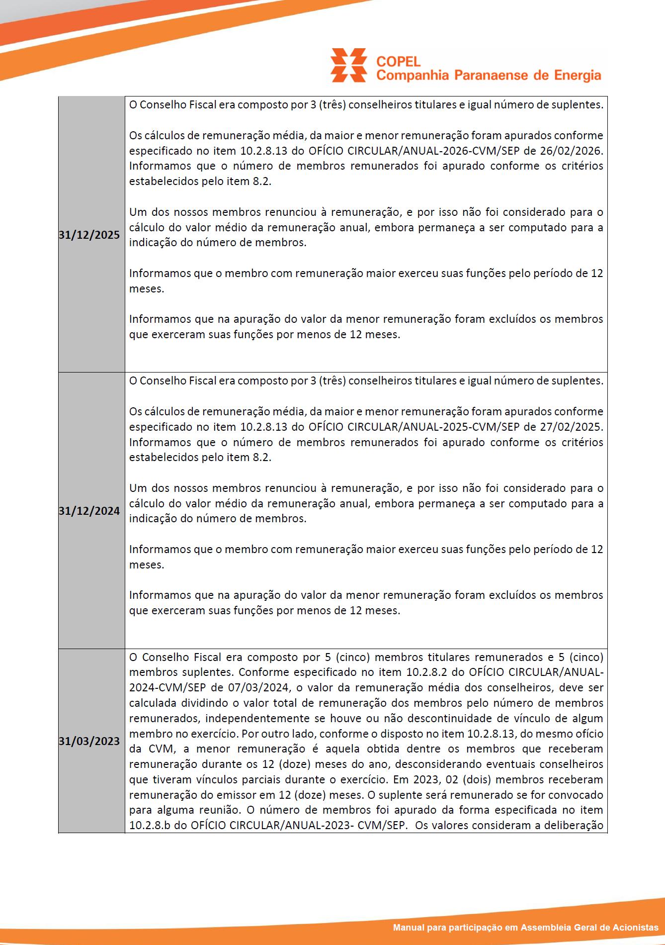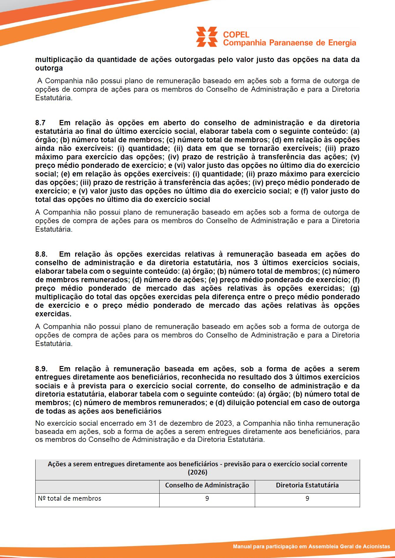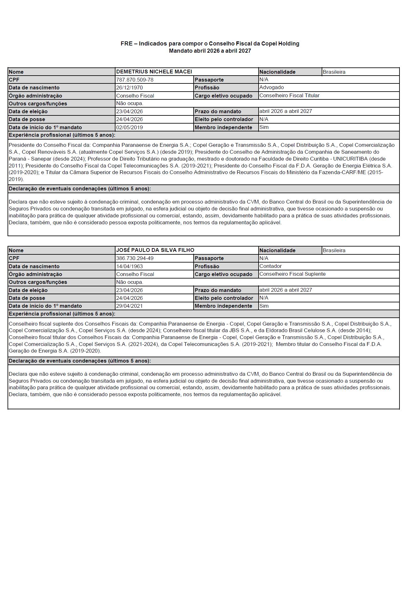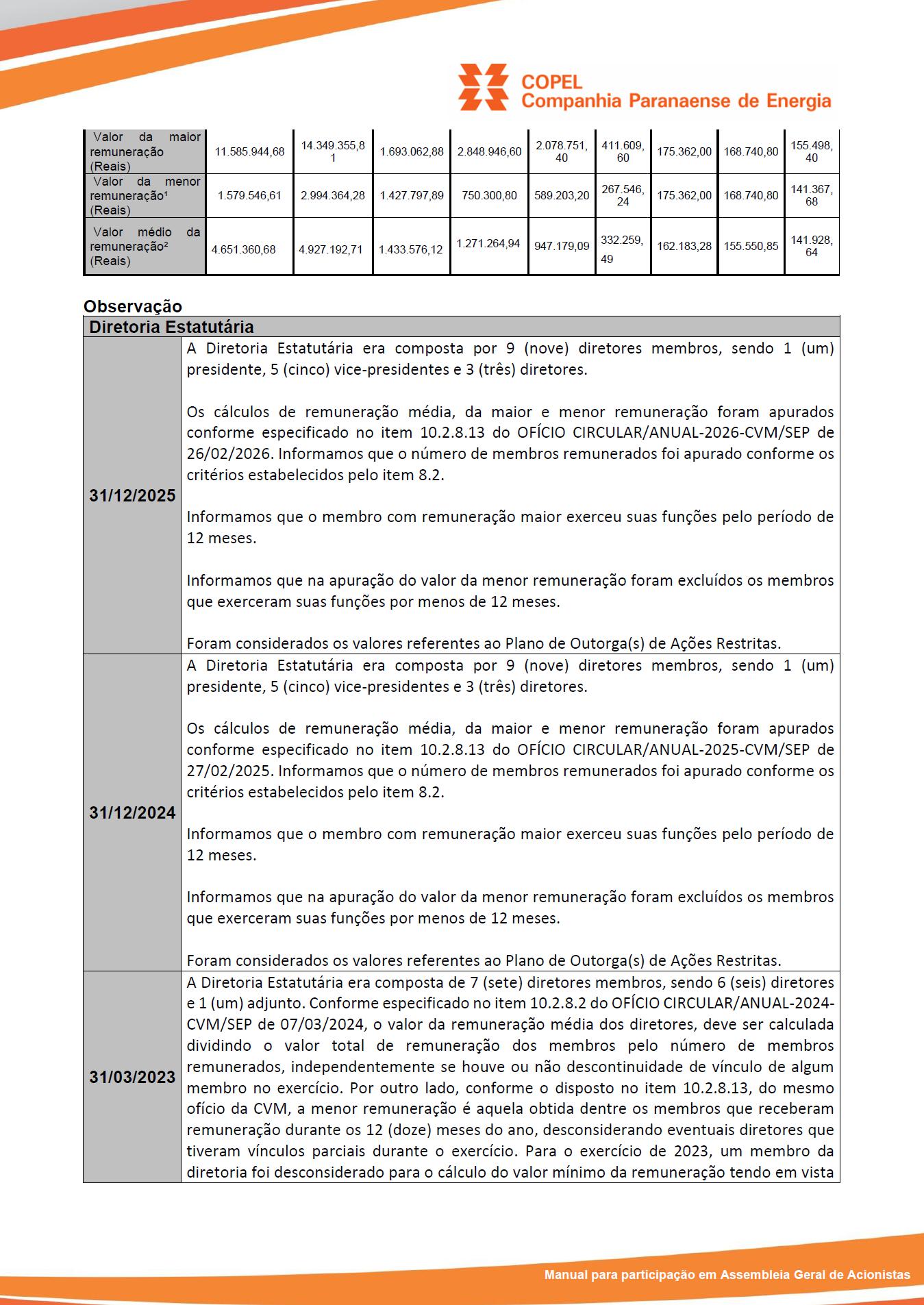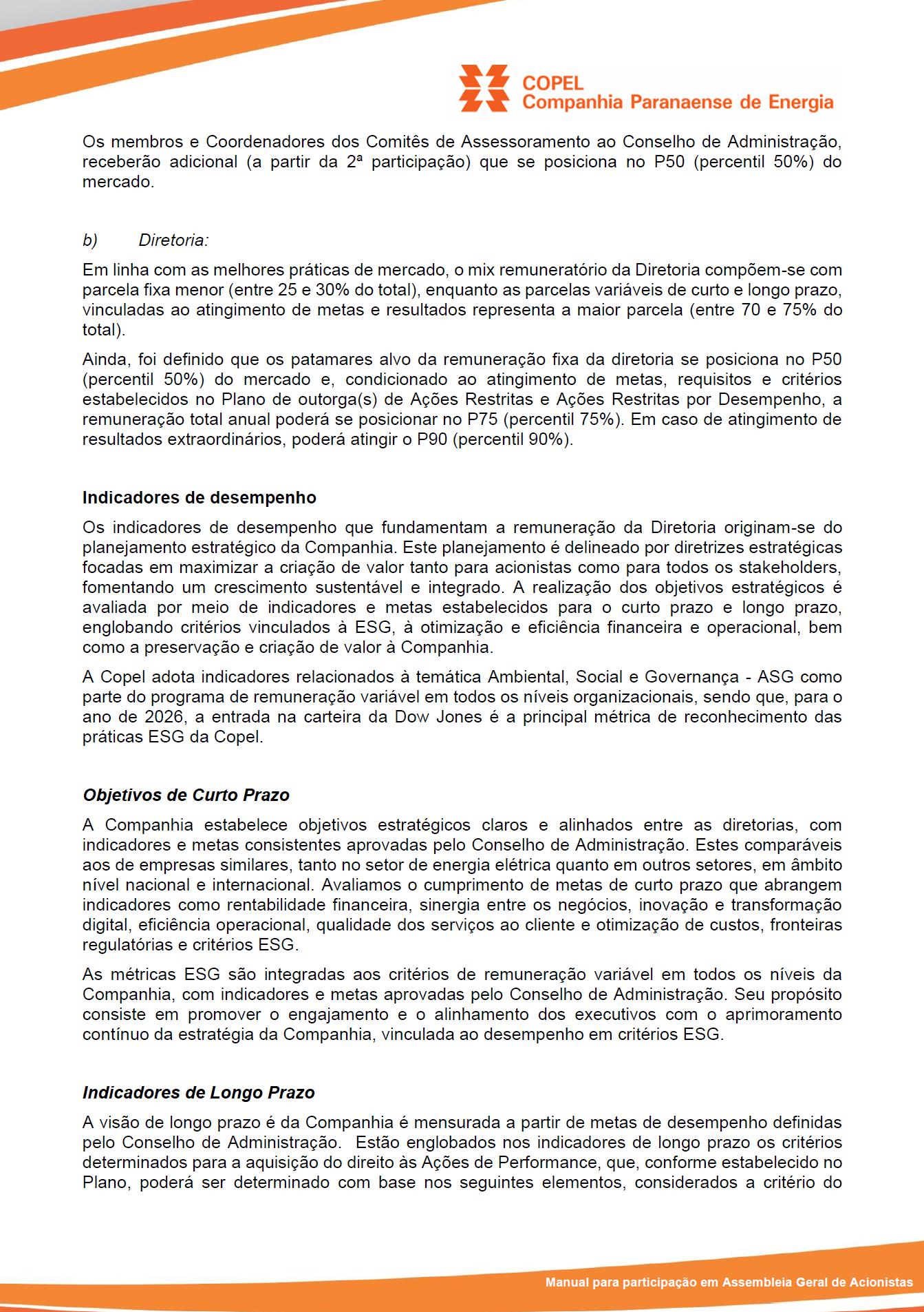 MANAGEMENT'S PROPOSAL AND MANUAL FOR PARTICIPATION IN GENERAL MEETINGS 71st Annual General Meeting 213th Extraordinary General Meeting April 23, 2026 Manual for participation in General Meetings 2/26 TABLE OF CONTENTS I. Message from the Management .............................................................................................. 3 II. Guidance for Participation in the General Meeting ................................................................ 4 Participation via Ballot Paper .................................................................................................. 4 Participation via Digital Platform ............................................................................................. 6 Holders of ADRs…………………………………………………………………………………………9 Convening of the General Meeting …………………………………………………………… . ……9 Voting Rights …….……………………………………………………………………………………. 10 Approval of the Matters on the Agenda …..…………………………………………………….…10 Final guidelines……………………………………………………………………………….………..10 III. Call Notice ............................................................................................................................... 11 IV. Management's Proposal ....................................................................................................... 14 V. Annex ..................................................................................................................................... 27 Manual for participation in General Meetings 3/26 I. MESSAGE FROM THE MANAGEMENT Dear Shareholder: It is with immense pleasure that I present to you this document containing the Management's Proposal and Manual for participation in General Shareholders’ Meetings of the Companhia Paranaense de Energia - Copel, with general guidance for an effective participation and exercise of the vote. This document has been prepared based on Copel's Corporate Governance policy, last updated in 2025, which is founded on integrity, transparency, fairness, accountability, and sustainability. The Proposal aims to present, in a clear and brief way, information related to the Company’s Shareholders’ Meeting, offering contributions that help the understanding of the proposals for resolution, encouraging the participation of shareholders in the events on the Company's corporate agenda. The matters to be presented for resolution of shareholders are described in the Call Notice and in the Management’s Proposal. Copel’s 71st AGM and 213rd Extraordinary General Meeting - EGM will be called to take place, on first call, on April 23, 2026, at 2pm, and will be held exclusively digitally, with the participation of its shareholders virtually, through the Ten Meetings digital platform, without prejudice to the possibility of exercising the vote by means of a Distance Voting Ballot. It is also important to mention that the Meeting will be attended, among others, by members of the Executive Board and representatives of the Supervisory Board, the Statutory Audit Committee and the independent auditor, who will be in a position to provide additional clarifications on the matters on the agenda, in accordance with their respective duties. Your participation is very important, considering that issues relevant to the Company and its shareholders will be dealt with in this Meeting. Yours sincerely, Marcel Martins Malczewski Chairman of the Board of Directors Manual for participation in General Meetings 4/26 II. GUIDANCE FOR PARTICIPATION IN THE GENERAL MEETING Copel’s shareholders may take part in the General Meeting: (i) via Ballot Paper, made available to shareholders on the following websites: the Company’s (ri.copel.com), B3 S.A. - Brasil, Bolsa, Balcão - B3 and Brazilian Securities and Exchange Commission - CVM; or (ii) via Digital Platform, which may be accessed personally or by a duly appointed proxy, pursuant to CVM Resolution no. 81/2022 - RCVM 81, as described below. Participation via Ballot Paper In order to facilitate and encourage the participation of its shareholders, Copel will adopt the remote voting system under the terms of RCVM 81, allowing its Shareholders to send distance voting ballots through their respective custody agents, the Bookkeeping Agent (Itaú Corretora de Valores S.A.) or directly to the Company, in accordance with the following guidelines: Distance voting ballots regarding the AGM and the EGM have been made available on Copel’s website (ri.copel.com) and on CVM's (gov.br/cvm) and B3's (b3.com.br) websites, in printable and manually fillable versions. Shareholders who choose to exercise their right to vote at a distance may (a) fill out and send the voting form directly to the Company, or (b) transmit the filling out instructions to qualified service providers, according to the guidelines below: • Exercise of voting rights through service providers - Remote voting system Shareholders who choose to exercise their voting rights remotely through service providers must transmit their voting instructions to their respective custody agents or through B3's Central Depository or, if the shares are in a book-entry environment, through the bookkeeper, in compliance with the rules determined by the latter. To this end, shareholders must contact their custody agents, access B3's Central Depository or contact the bookkeeping agent and check the procedures they have established for issuing voting instructions via ballot paper, as well as the documents and information they require to do so. The Ballot Papers must be sent to the custody agent, to the Central Depositary of B3 or to the bookkeeping agent, as applicable, in accordance with the procedures established by them, by April 19, 