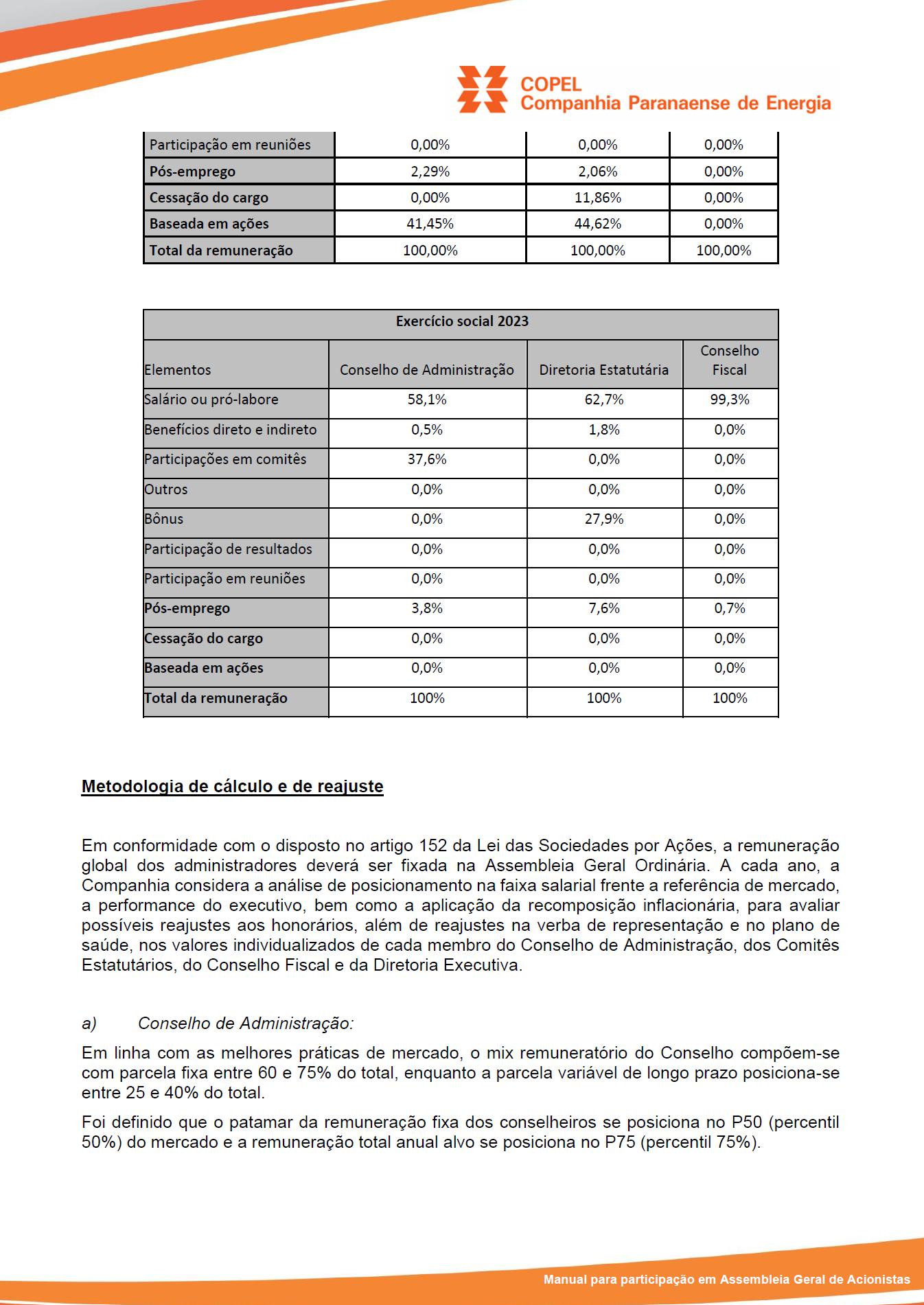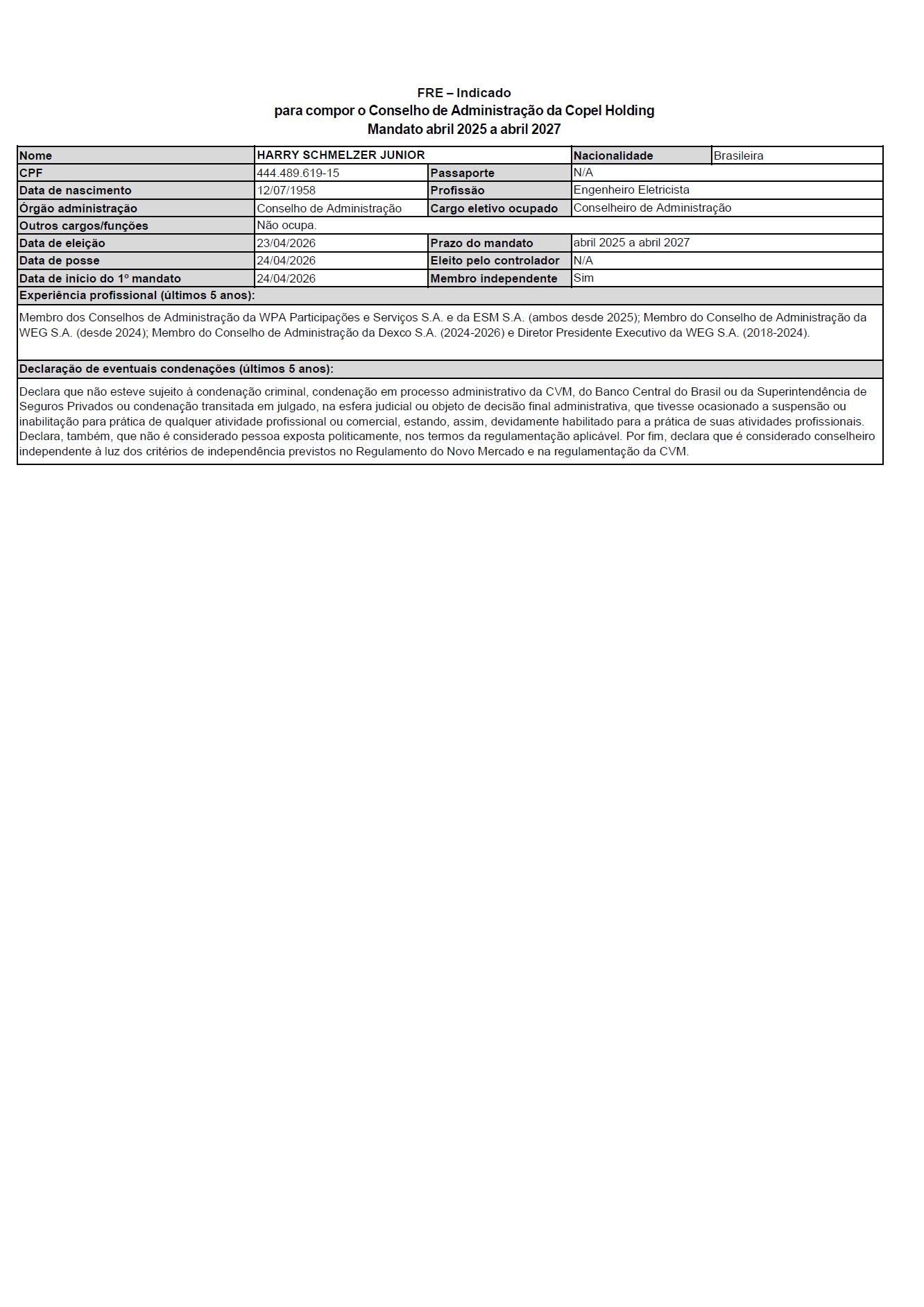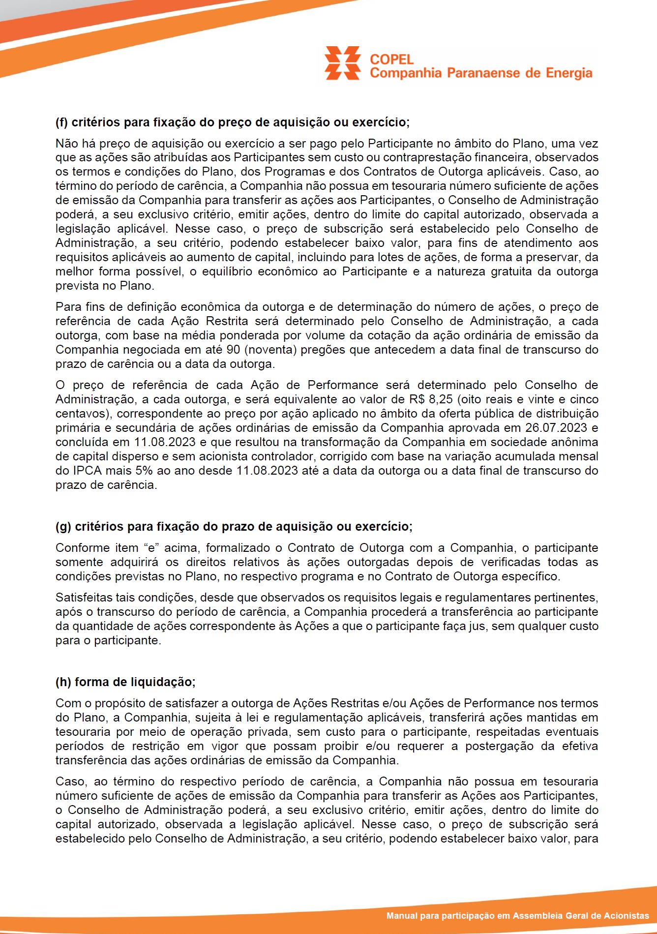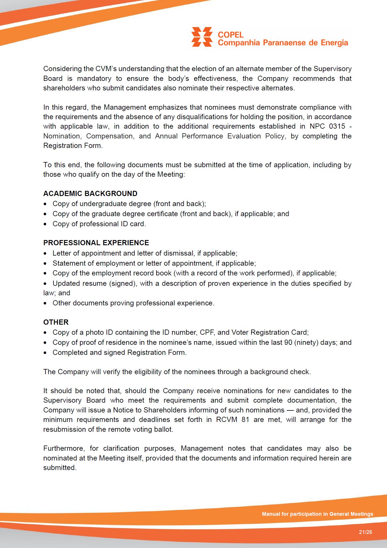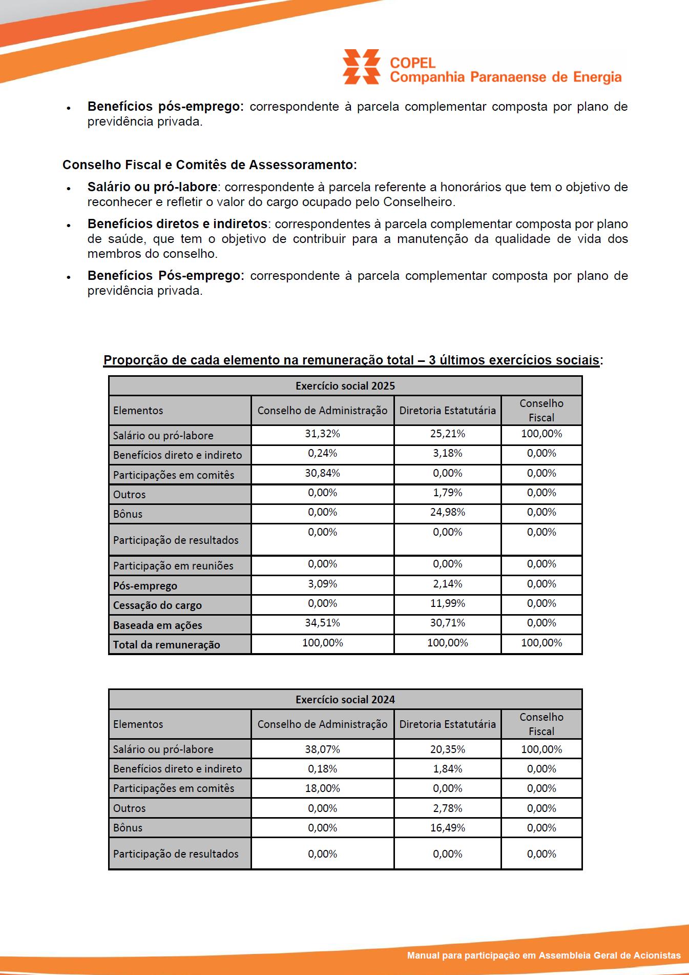 MANAGEMENT'S PROPOSAL AND MANUAL FOR PARTICIPATION IN GENERAL MEETINGS 71st Annual General Meeting 213th Extraordinary General Meeting April 23, 2026 Manual for participation in General Meetings 2/26 TABLE OF CONTENTS I. Message from the Management .............................................................................................. 3 II. Guidance for Participation in the General Meeting ................................................................ 4 Participation via Ballot Paper .................................................................................................. 4 Participation via Digital Platform ............................................................................................. 6 Holders of ADRs…………………………………………………………………………………………9 Convening of the General Meeting …………………………………………………………… . ……9 Voting Rights …….……………………………………………………………………………………. 10 Approval of the Matters on the Agenda …..…………………………………………………….…10 Final guidelines……………………………………………………………………………….………..10 III. Call Notice ............................................................................................................................... 11 IV. Management's Proposal ....................................................................................................... 14 V. Annex ..................................................................................................................................... 27 Manual for participation in General Meetings 3/26 I. MESSAGE FROM THE MANAGEMENT Dear Shareholder: It is with immense pleasure that I present to you this document containing the Management's Proposal and Manual for participation in General Shareholders’ Meetings of the Companhia Paranaense de Energia - Copel, with general guidance for an effective participation and exercise of the vote. This document has been prepared based on Copel's Corporate Governance policy, last updated in 2025, which is founded on integrity, transparency, fairness, accountability, and sustainability. The Proposal aims to present, in a clear and brief way, information related to the Company’s Shareholders’ Meeting, offering contributions that help the understanding of the proposals for resolution, encouraging the participation of shareholders in the events on the Company's corporate agenda. The matters to be presented for resolution of shareholders are described in the Call Notice and in the Management’s Proposal. Copel’s 71st AGM and 213rd Extraordinary General Meeting - EGM will be called to take place, on first call, on April 23, 2026, at 2pm, and will be held exclusively digitally, with the participation of its shareholders virtually, through the Ten Meetings digital platform, without prejudice to the possibility of exercising the vote by means of a Distance Voting Ballot. It is also important to mention that the Meeting will be attended, among others, by members of the Executive Board and representatives of the Supervisory Board, the Statutory Audit Committee and the independent auditor, who will be in a position to provide additional clarifications on the matters on the agenda, in accordance with their respective duties. Your participation is very important, considering that issues relevant to the Company and its shareholders will be dealt with in this Meeting. Yours sincerely, Marcel Martins Malczewski Chairman of the Board of Directors Manual for participation in General Meetings 4/26 II. GUIDANCE FOR PARTICIPATION IN THE GENERAL MEETING Copel’s shareholders may take part in the General Meeting: (i) via Ballot Paper, made available to shareholders on the following websites: the Company’s (ri.copel.com), B3 S.A. - Brasil, Bolsa, Balcão - B3 and Brazilian Securities and Exchange Commission - CVM; or (ii) via Digital Platform, which may be accessed personally or by a duly appointed proxy, pursuant to CVM Resolution no. 81/2022 - RCVM 81, as described below. Participation via Ballot Paper In order to facilitate and encourage the participation of its shareholders, Copel will adopt the remote voting system under the terms of RCVM 81, allowing its Shareholders to send distance voting ballots through their respective custody agents, the Bookkeeping Agent (Itaú Corretora de Valores S.A.) or directly to the Company, in accordance with the following guidelines: Distance voting ballots regarding the AGM and the EGM have been made available on Copel’s website (ri.copel.com) and on CVM's (gov.br/cvm) and B3's (b3.com.br) websites, in printable and manually fillable versions. Shareholders who choose to exercise their right to vote at a distance may (a) fill out and send the voting form directly to the Company, or (b) transmit the filling out instructions to qualified service providers, according to the guidelines below: • Exercise of voting rights through service providers - Remote voting system Shareholders who choose to exercise their voting rights remotely through service providers must transmit their voting instructions to their respective custody agents or through B3's Central Depository or, if the shares are in a book-entry environment, through the bookkeeper, in compliance with the rules determined by the latter. To this end, shareholders must contact their custody agents, access B3's Central Depository or contact the bookkeeping agent and check the procedures they have established for issuing voting instructions via ballot paper, as well as the documents and information they require to do so. The Ballot Papers must be sent to the custody agent, to the Central Depositary of B3 or to the bookkeeping agent, as applicable, in accordance with the procedures established by them, by April 19, 