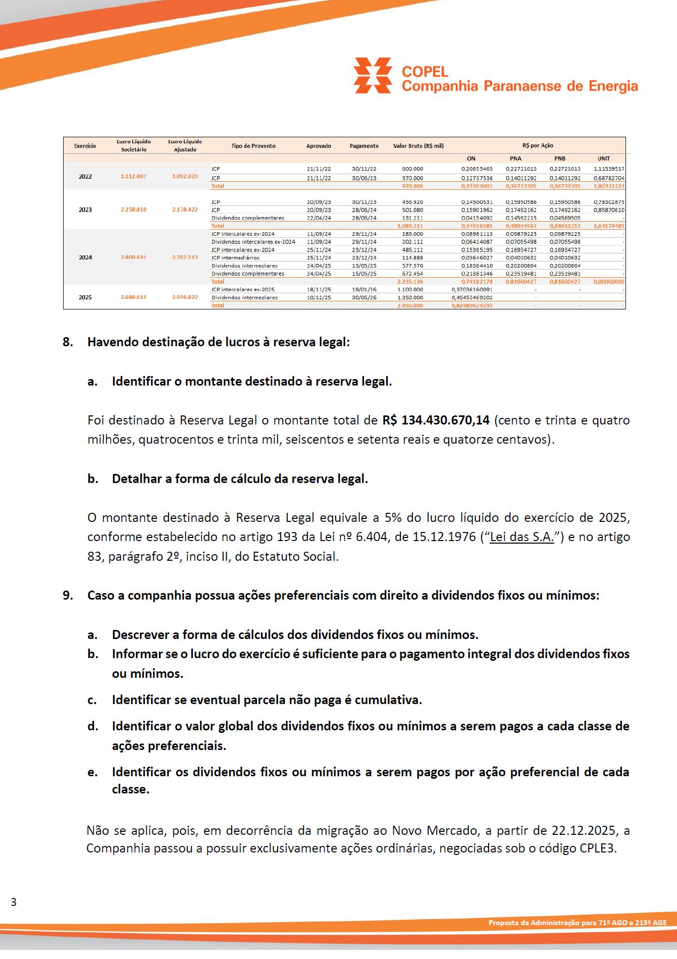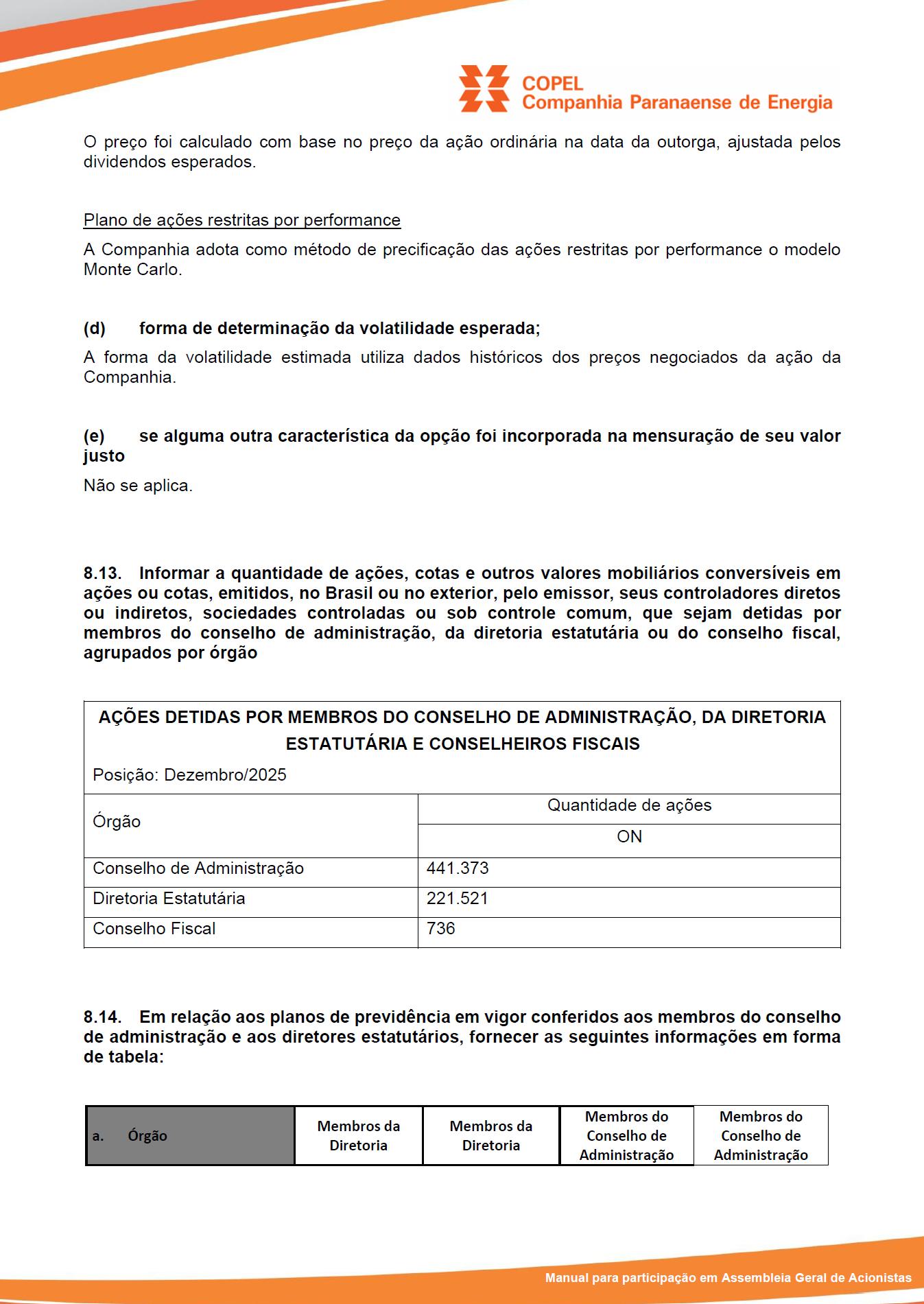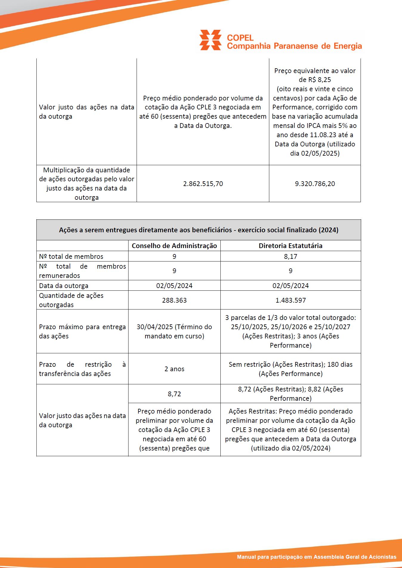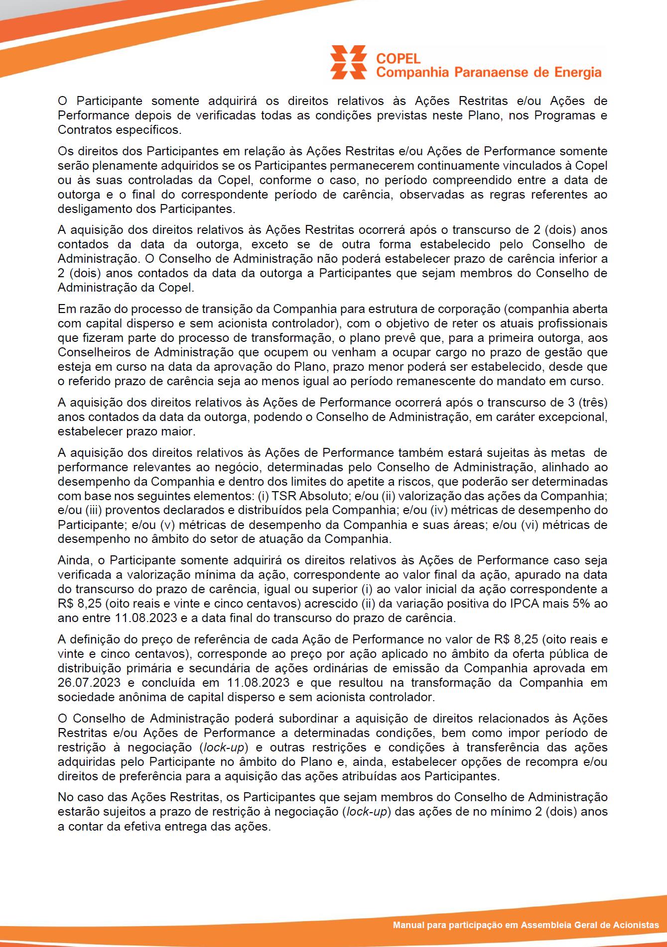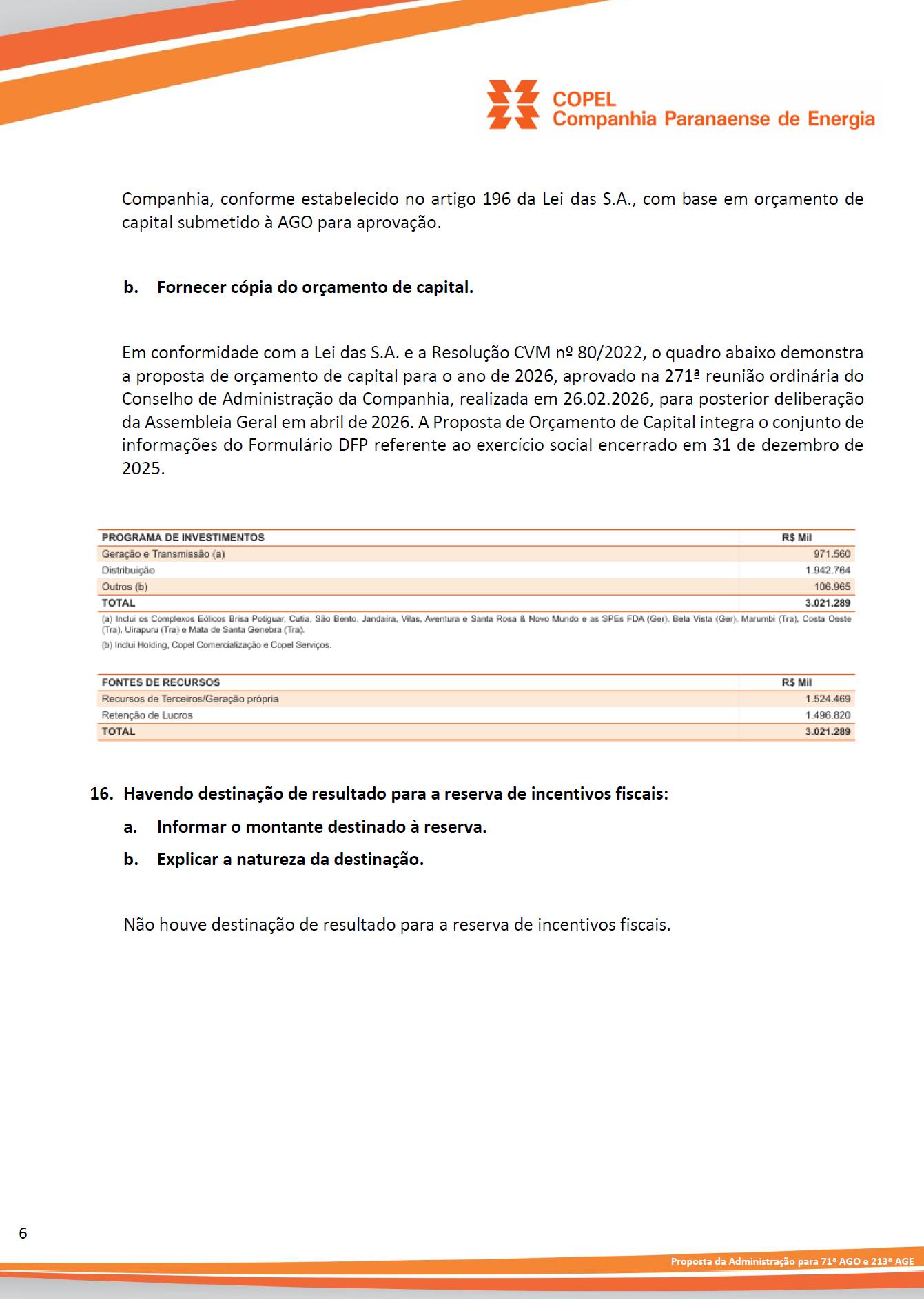 MANAGEMENT'S PROPOSAL AND MANUAL FOR PARTICIPATION IN GENERAL MEETINGS 71st Annual General Meeting 213th Extraordinary General Meeting April 23, 2026 Manual for participation in General Meetings 2/26 TABLE OF CONTENTS I. Message from the Management .............................................................................................. 3 II. Guidance for Participation in the General Meeting ................................................................ 4 Participation via Ballot Paper .................................................................................................. 4 Participation via Digital Platform ............................................................................................. 6 Holders of ADRs…………………………………………………………………………………………9 Convening of the General Meeting …………………………………………………………… . ……9 Voting Rights …….……………………………………………………………………………………. 10 Approval of the Matters on the Agenda …..…………………………………………………….…10 Final guidelines……………………………………………………………………………….………..10 III. Call Notice ............................................................................................................................... 11 IV. Management's Proposal ....................................................................................................... 14 V. Annex ..................................................................................................................................... 27 Manual for participation in General Meetings 3/26 I. MESSAGE FROM THE MANAGEMENT Dear Shareholder: It is with immense pleasure that I present to you this document containing the Management's Proposal and Manual for participation in General Shareholders’ Meetings of the Companhia Paranaense de Energia - Copel, with general guidance for an effective participation and exercise of the vote. This document has been prepared based on Copel's Corporate Governance policy, last updated in 2025, which is founded on integrity, transparency, fairness, accountability, and sustainability. The Proposal aims to present, in a clear and brief way, information related to the Company’s Shareholders’ Meeting, offering contributions that help the understanding of the proposals for resolution, encouraging the participation of shareholders in the events on the Company's corporate agenda. The matters to be presented for resolution of shareholders are described in the Call Notice and in the Management’s Proposal. Copel’s 71st AGM and 213rd Extraordinary General Meeting - EGM will be called to take place, on first call, on April 23, 2026, at 2pm, and will be held exclusively digitally, with the participation of its shareholders virtually, through the Ten Meetings digital platform, without prejudice to the possibility of exercising the vote by means of a Distance Voting Ballot. It is also important to mention that the Meeting will be attended, among others, by members of the Executive Board and representatives of the Supervisory Board, the Statutory Audit Committee and the independent auditor, who will be in a position to provide additional clarifications on the matters on the agenda, in accordance with their respective duties. Your participation is very important, considering that issues relevant to the Company and its shareholders will be dealt with in this Meeting. Yours sincerely, Marcel Martins Malczewski Chairman of the Board of Directors Manual for participation in General Meetings 4/26 II. GUIDANCE FOR PARTICIPATION IN THE GENERAL MEETING Copel’s shareholders may take part in the General Meeting: (i) via Ballot Paper, made available to shareholders on the following websites: the Company’s (ri.copel.com), B3 S.A. - Brasil, Bolsa, Balcão - B3 and Brazilian Securities and Exchange Commission - CVM; or (ii) via Digital Platform, which may be accessed personally or by a duly appointed proxy, pursuant to CVM Resolution no. 81/2022 - RCVM 81, as described below. Participation via Ballot Paper In order to facilitate and encourage the participation of its shareholders, Copel will adopt the remote voting system under the terms of RCVM 81, allowing its Shareholders to send distance voting ballots through their respective custody agents, the Bookkeeping Agent (Itaú Corretora de Valores S.A.) or directly to the Company, in accordance with the following guidelines: Distance voting ballots regarding the AGM and the EGM have been made available on Copel’s website (ri.copel.com) and on CVM's (gov.br/cvm) and B3's (b3.com.br) websites, in printable and manually fillable versions. Shareholders who choose to exercise their right to vote at a distance may (a) fill out and send the voting form directly to the Company, or (b) transmit the filling out instructions to qualified service providers, according to the guidelines below: • Exercise of voting rights through service providers - Remote voting system Shareholders who choose to exercise their voting rights remotely through service providers must transmit their voting instructions to their respective custody agents or through B3's Central Depository or, if the shares are in a book-entry environment, through the bookkeeper, in compliance with the rules determined by the latter. To this end, shareholders must contact their custody agents, access B3's Central Depository or contact the bookkeeping agent and check the procedures they have established for issuing voting instructions via ballot paper, as well as the documents and information they require to do so. The Ballot Papers must be sent to the custody agent, to the Central Depositary of B3 or to the bookkeeping agent, as applicable, in accordance with the procedures established by them, by April 19, 