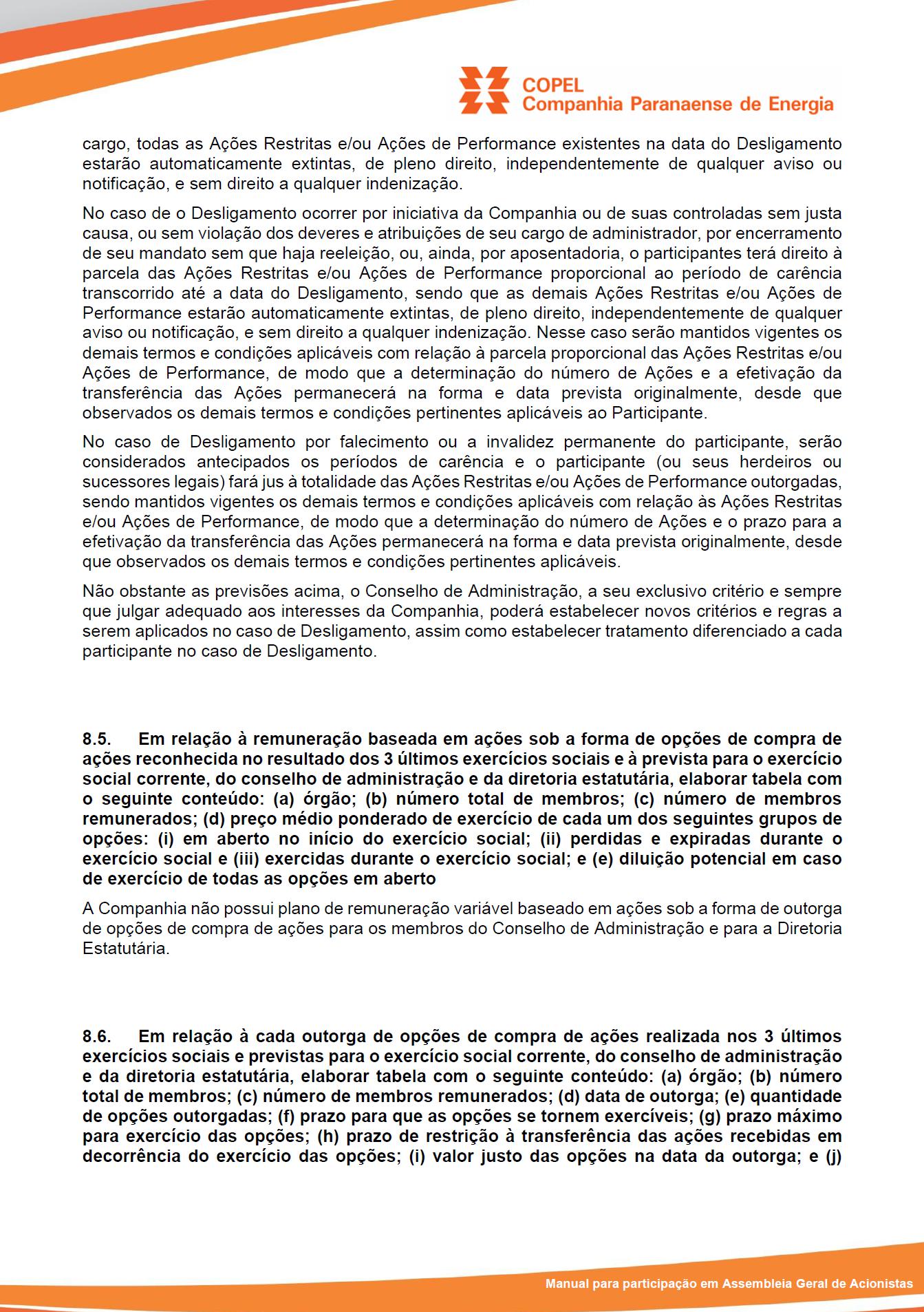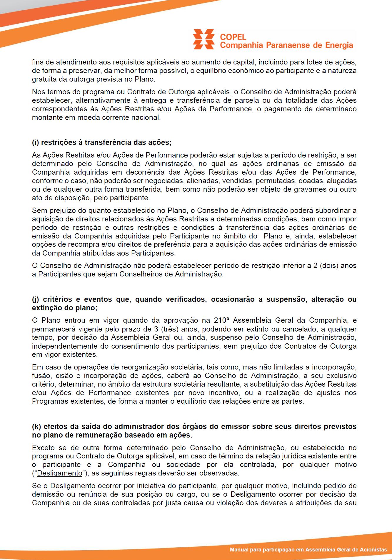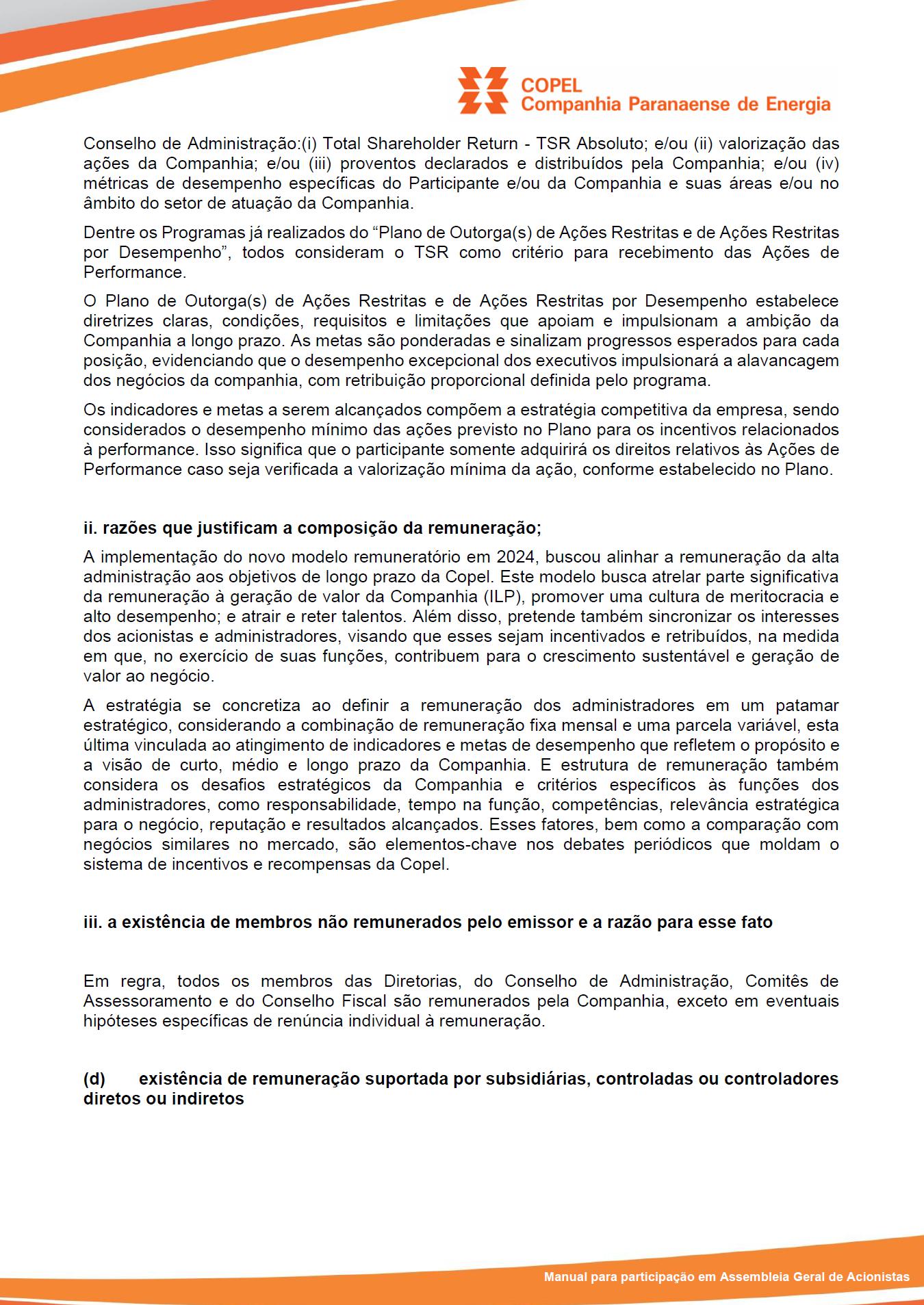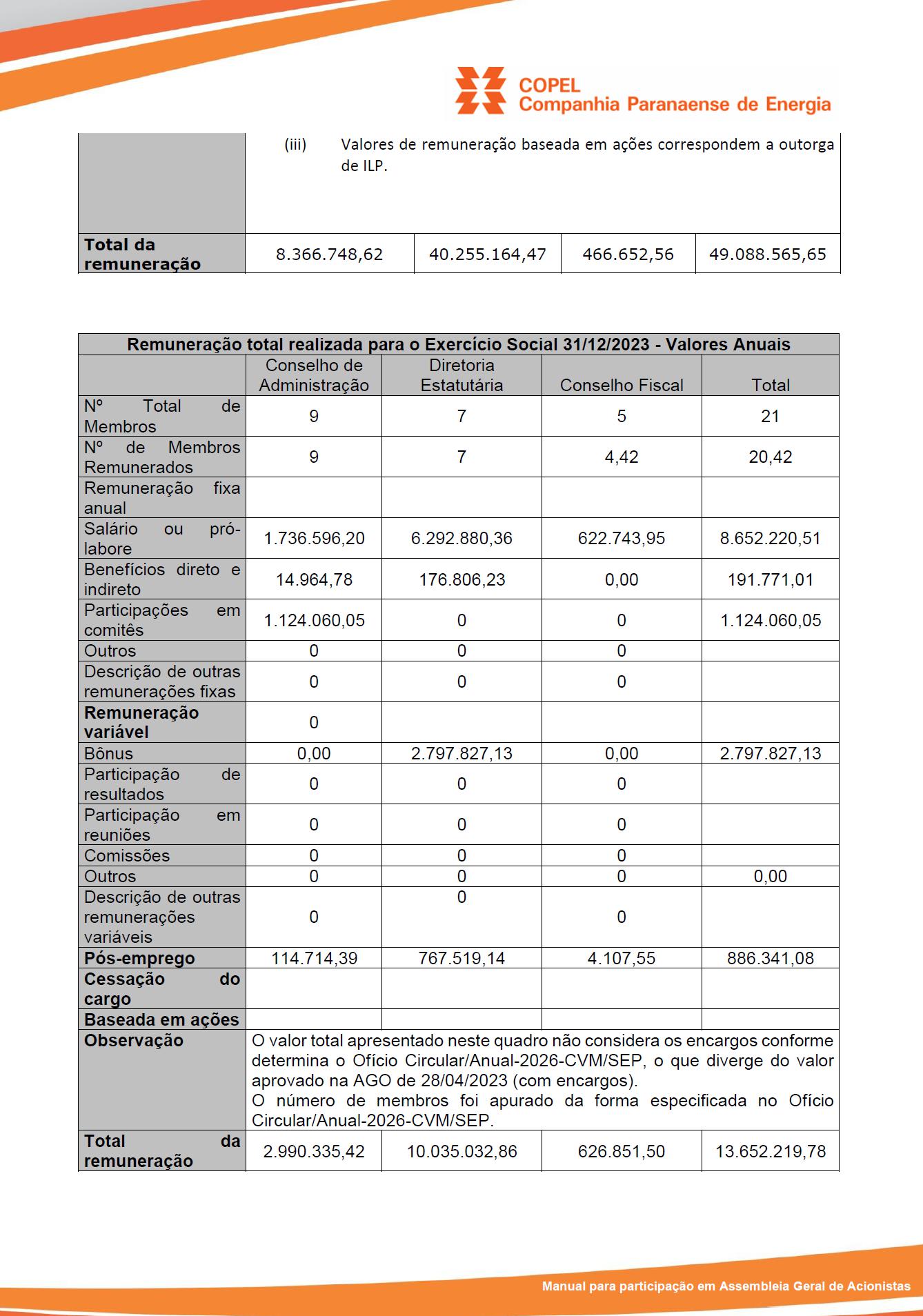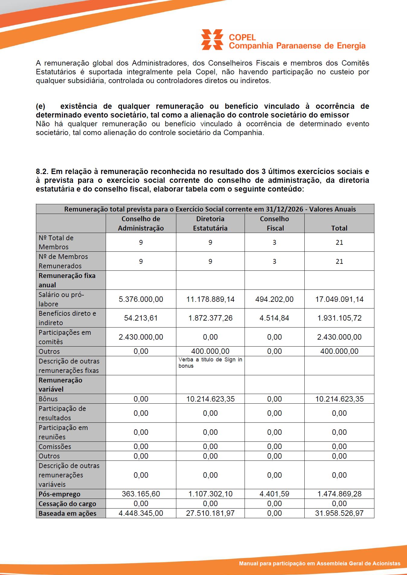 MANAGEMENT'S PROPOSAL AND MANUAL FOR PARTICIPATION IN GENERAL MEETINGS 71st Annual General Meeting 213th Extraordinary General Meeting April 23, 2026 Manual for participation in General Meetings 2/26 TABLE OF CONTENTS I. Message from the Management .............................................................................................. 3 II. Guidance for Participation in the General Meeting ................................................................ 4 Participation via Ballot Paper .................................................................................................. 4 Participation via Digital Platform ............................................................................................. 6 Holders of ADRs…………………………………………………………………………………………9 Convening of the General Meeting …………………………………………………………… . ……9 Voting Rights …….……………………………………………………………………………………. 10 Approval of the Matters on the Agenda …..…………………………………………………….…10 Final guidelines……………………………………………………………………………….………..10 III. Call Notice ............................................................................................................................... 11 IV. Management's Proposal ....................................................................................................... 14 V. Annex ..................................................................................................................................... 27 Manual for participation in General Meetings 3/26 I. MESSAGE FROM THE MANAGEMENT Dear Shareholder: It is with immense pleasure that I present to you this document containing the Management's Proposal and Manual for participation in General Shareholders’ Meetings of the Companhia Paranaense de Energia - Copel, with general guidance for an effective participation and exercise of the vote. This document has been prepared based on Copel's Corporate Governance policy, last updated in 2025, which is founded on integrity, transparency, fairness, accountability, and sustainability. The Proposal aims to present, in a clear and brief way, information related to the Company’s Shareholders’ Meeting, offering contributions that help the understanding of the proposals for resolution, encouraging the participation of shareholders in the events on the Company's corporate agenda. The matters to be presented for resolution of shareholders are described in the Call Notice and in the Management’s Proposal. Copel’s 71st AGM and 213rd Extraordinary General Meeting - EGM will be called to take place, on first call, on April 23, 2026, at 2pm, and will be held exclusively digitally, with the participation of its shareholders virtually, through the Ten Meetings digital platform, without prejudice to the possibility of exercising the vote by means of a Distance Voting Ballot. It is also important to mention that the Meeting will be attended, among others, by members of the Executive Board and representatives of the Supervisory Board, the Statutory Audit Committee and the independent auditor, who will be in a position to provide additional clarifications on the matters on the agenda, in accordance with their respective duties. Your participation is very important, considering that issues relevant to the Company and its shareholders will be dealt with in this Meeting. Yours sincerely, Marcel Martins Malczewski Chairman of the Board of Directors Manual for participation in General Meetings 4/26 II. GUIDANCE FOR PARTICIPATION IN THE GENERAL MEETING Copel’s shareholders may take part in the General Meeting: (i) via Ballot Paper, made available to shareholders on the following websites: the Company’s (ri.copel.com), B3 S.A. - Brasil, Bolsa, Balcão - B3 and Brazilian Securities and Exchange Commission - CVM; or (ii) via Digital Platform, which may be accessed personally or by a duly appointed proxy, pursuant to CVM Resolution no. 81/2022 - RCVM 81, as described below. Participation via Ballot Paper In order to facilitate and encourage the participation of its shareholders, Copel will adopt the remote voting system under the terms of RCVM 81, allowing its Shareholders to send distance voting ballots through their respective custody agents, the Bookkeeping Agent (Itaú Corretora de Valores S.A.) or directly to the Company, in accordance with the following guidelines: Distance voting ballots regarding the AGM and the EGM have been made available on Copel’s website (ri.copel.com) and on CVM's (gov.br/cvm) and B3's (b3.com.br) websites, in printable and manually fillable versions. Shareholders who choose to exercise their right to vote at a distance may (a) fill out and send the voting form directly to the Company, or (b) transmit the filling out instructions to qualified service providers, according to the guidelines below: • Exercise of voting rights through service providers - Remote voting system Shareholders who choose to exercise their voting rights remotely through service providers must transmit their voting instructions to their respective custody agents or through B3's Central Depository or, if the shares are in a book-entry environment, through the bookkeeper, in compliance with the rules determined by the latter. To this end, shareholders must contact their custody agents, access B3's Central Depository or contact the bookkeeping agent and check the procedures they have established for issuing voting instructions via ballot paper, as well as the documents and information they require to do so. The Ballot Papers must be sent to the custody agent, to the Central Depositary of B3 or to the bookkeeping agent, as applicable, in accordance with the procedures established by them, by April 19, 
