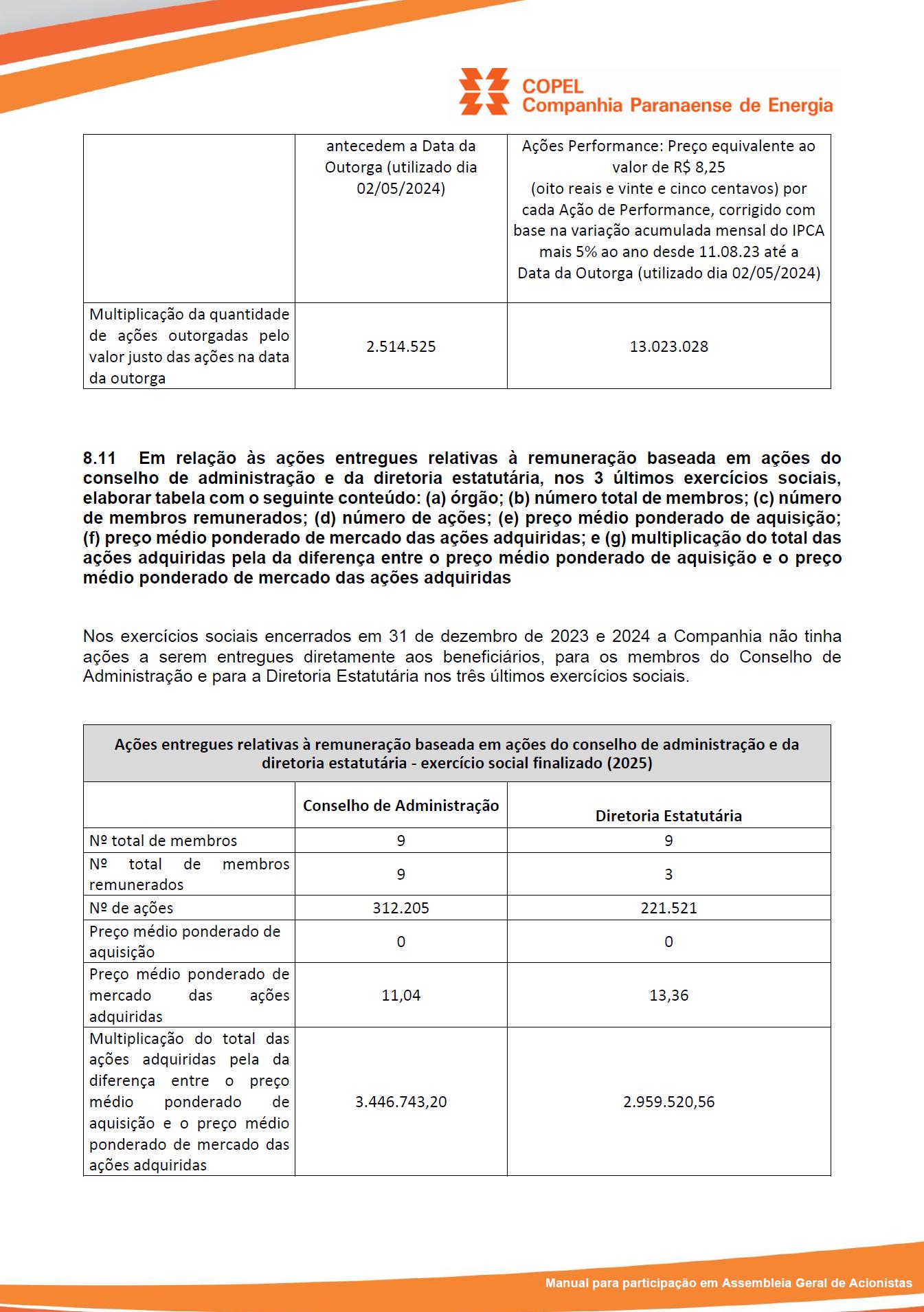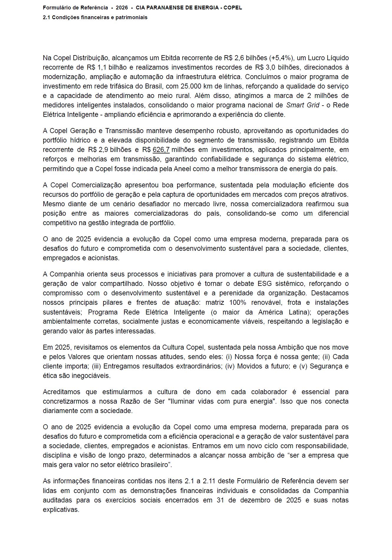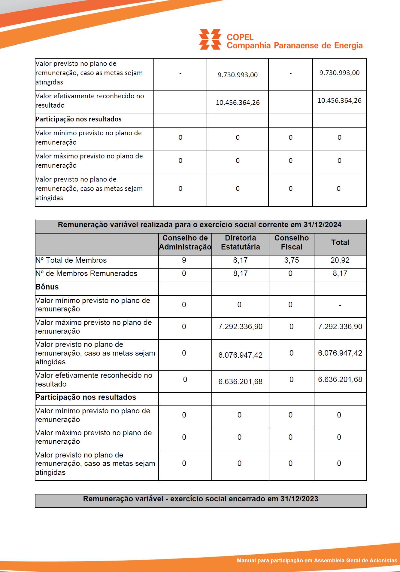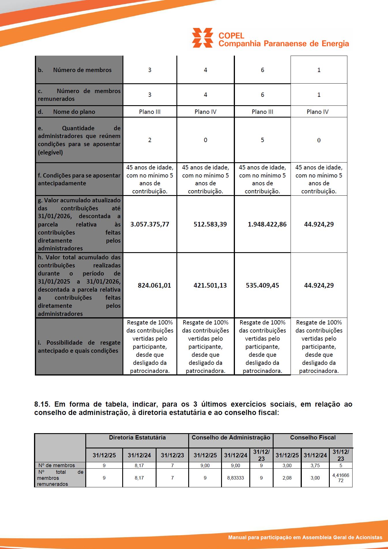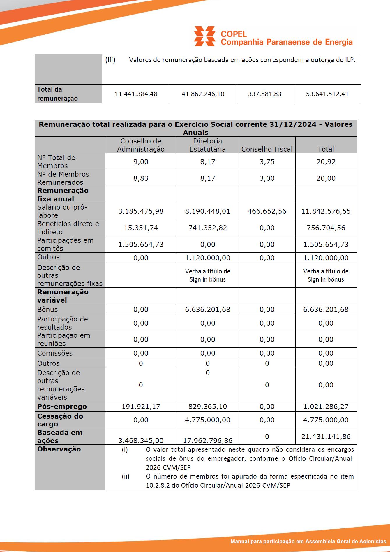 MANAGEMENT'S PROPOSAL AND MANUAL FOR PARTICIPATION IN GENERAL MEETINGS 71st Annual General Meeting 213th Extraordinary General Meeting April 23, 2026 Manual for participation in General Meetings 2/26 TABLE OF CONTENTS I. Message from the Management .............................................................................................. 3 II. Guidance for Participation in the General Meeting ................................................................ 4 Participation via Ballot Paper .................................................................................................. 4 Participation via Digital Platform ............................................................................................. 6 Holders of ADRs…………………………………………………………………………………………9 Convening of the General Meeting …………………………………………………………… . ……9 Voting Rights …….……………………………………………………………………………………. 10 Approval of the Matters on the Agenda …..…………………………………………………….…10 Final guidelines……………………………………………………………………………….………..10 III. Call Notice ............................................................................................................................... 11 IV. Management's Proposal ....................................................................................................... 14 V. Annex ..................................................................................................................................... 27 Manual for participation in General Meetings 3/26 I. MESSAGE FROM THE MANAGEMENT Dear Shareholder: It is with immense pleasure that I present to you this document containing the Management's Proposal and Manual for participation in General Shareholders’ Meetings of the Companhia Paranaense de Energia - Copel, with general guidance for an effective participation and exercise of the vote. This document has been prepared based on Copel's Corporate Governance policy, last updated in 2025, which is founded on integrity, transparency, fairness, accountability, and sustainability. The Proposal aims to present, in a clear and brief way, information related to the Company’s Shareholders’ Meeting, offering contributions that help the understanding of the proposals for resolution, encouraging the participation of shareholders in the events on the Company's corporate agenda. The matters to be presented for resolution of shareholders are described in the Call Notice and in the Management’s Proposal. Copel’s 71st AGM and 213rd Extraordinary General Meeting - EGM will be called to take place, on first call, on April 23, 2026, at 2pm, and will be held exclusively digitally, with the participation of its shareholders virtually, through the Ten Meetings digital platform, without prejudice to the possibility of exercising the vote by means of a Distance Voting Ballot. It is also important to mention that the Meeting will be attended, among others, by members of the Executive Board and representatives of the Supervisory Board, the Statutory Audit Committee and the independent auditor, who will be in a position to provide additional clarifications on the matters on the agenda, in accordance with their respective duties. Your participation is very important, considering that issues relevant to the Company and its shareholders will be dealt with in this Meeting. Yours sincerely, Marcel Martins Malczewski Chairman of the Board of Directors Manual for participation in General Meetings 4/26 II. GUIDANCE FOR PARTICIPATION IN THE GENERAL MEETING Copel’s shareholders may take part in the General Meeting: (i) via Ballot Paper, made available to shareholders on the following websites: the Company’s (ri.copel.com), B3 S.A. - Brasil, Bolsa, Balcão - B3 and Brazilian Securities and Exchange Commission - CVM; or (ii) via Digital Platform, which may be accessed personally or by a duly appointed proxy, pursuant to CVM Resolution no. 81/2022 - RCVM 81, as described below. Participation via Ballot Paper In order to facilitate and encourage the participation of its shareholders, Copel will adopt the remote voting system under the terms of RCVM 81, allowing its Shareholders to send distance voting ballots through their respective custody agents, the Bookkeeping Agent (Itaú Corretora de Valores S.A.) or directly to the Company, in accordance with the following guidelines: Distance voting ballots regarding the AGM and the EGM have been made available on Copel’s website (ri.copel.com) and on CVM's (gov.br/cvm) and B3's (b3.com.br) websites, in printable and manually fillable versions. Shareholders who choose to exercise their right to vote at a distance may (a) fill out and send the voting form directly to the Company, or (b) transmit the filling out instructions to qualified service providers, according to the guidelines below: • Exercise of voting rights through service providers - Remote voting system Shareholders who choose to exercise their voting rights remotely through service providers must transmit their voting instructions to their respective custody agents or through B3's Central Depository or, if the shares are in a book-entry environment, through the bookkeeper, in compliance with the rules determined by the latter. To this end, shareholders must contact their custody agents, access B3's Central Depository or contact the bookkeeping agent and check the procedures they have established for issuing voting instructions via ballot paper, as well as the documents and information they require to do so. The Ballot Papers must be sent to the custody agent, to the Central Depositary of B3 or to the bookkeeping agent, as applicable, in accordance with the procedures established by them, by April 19, 