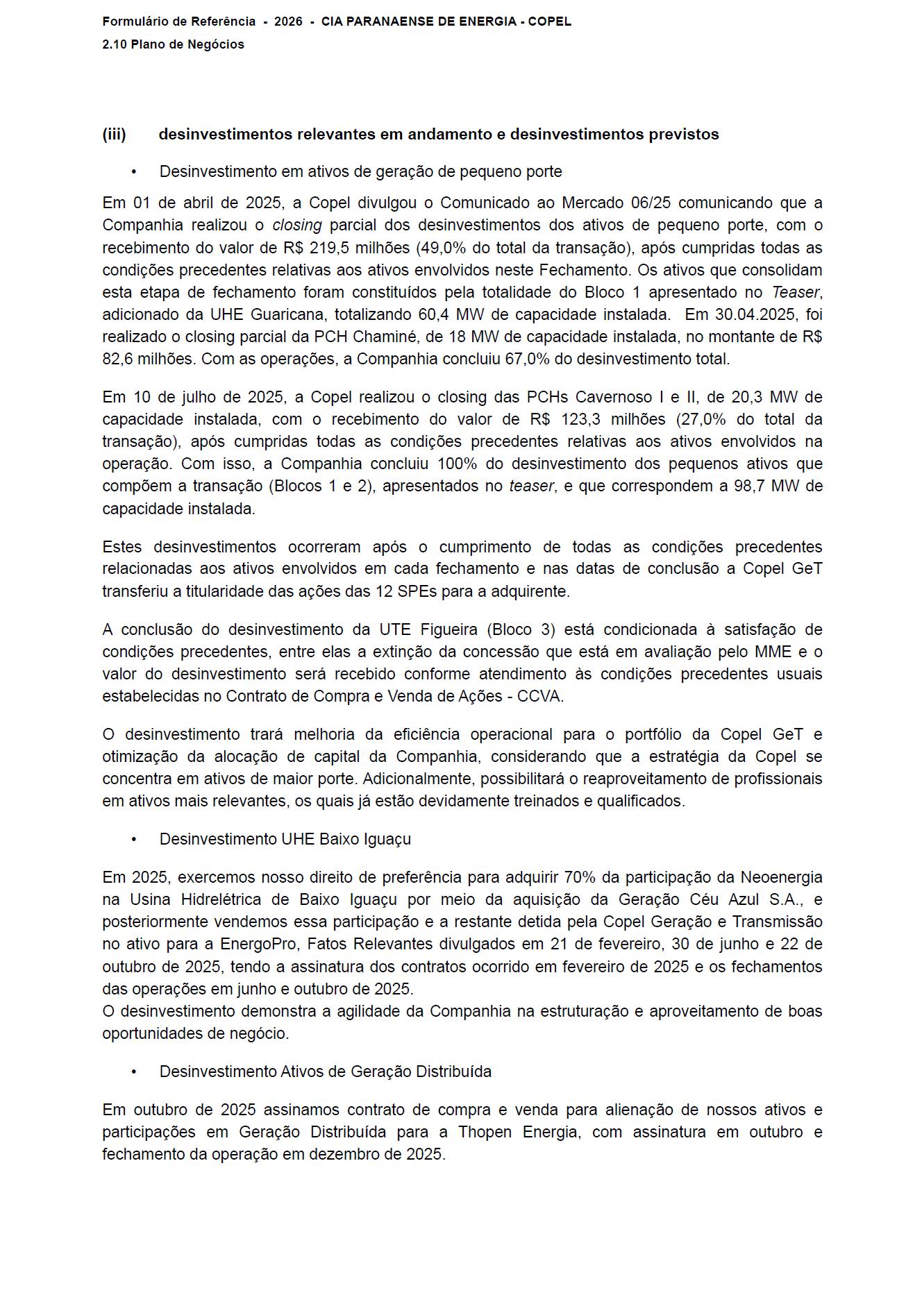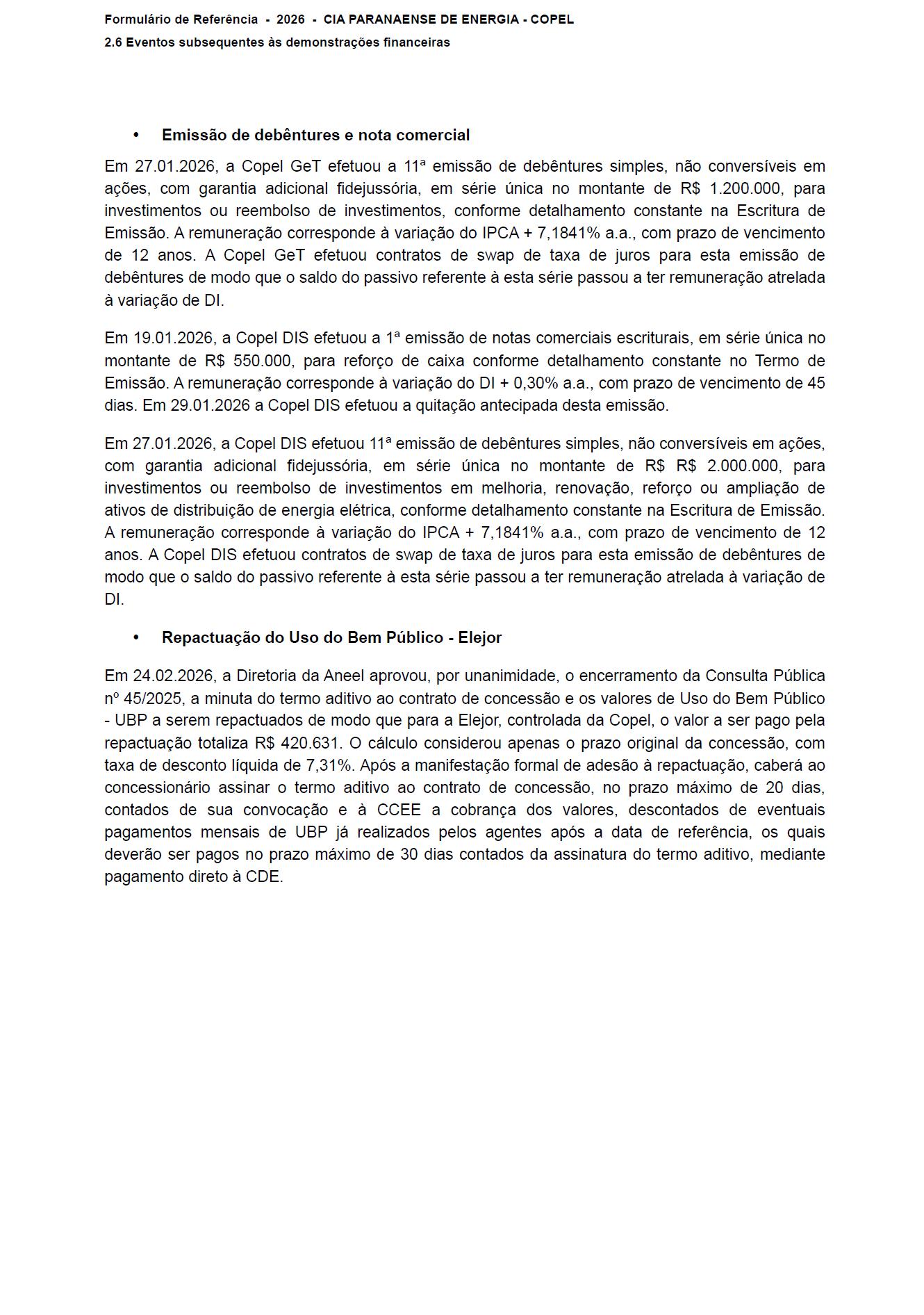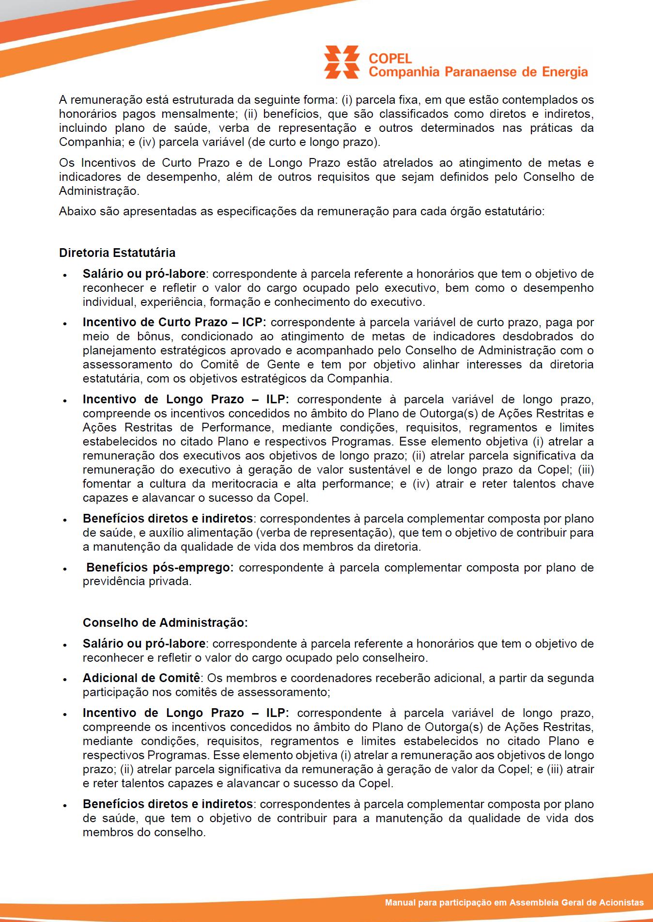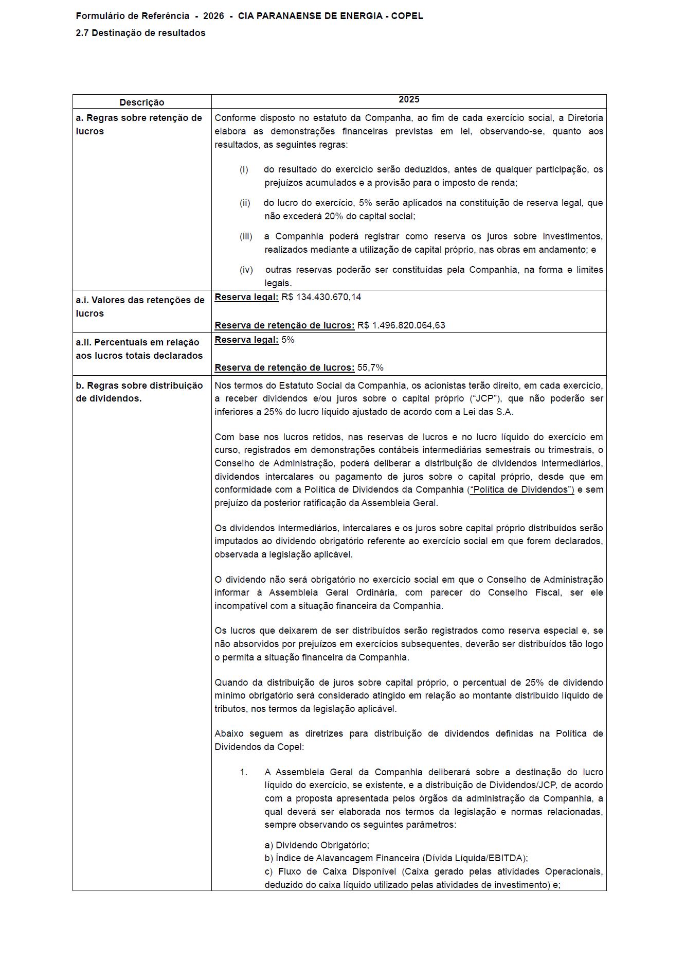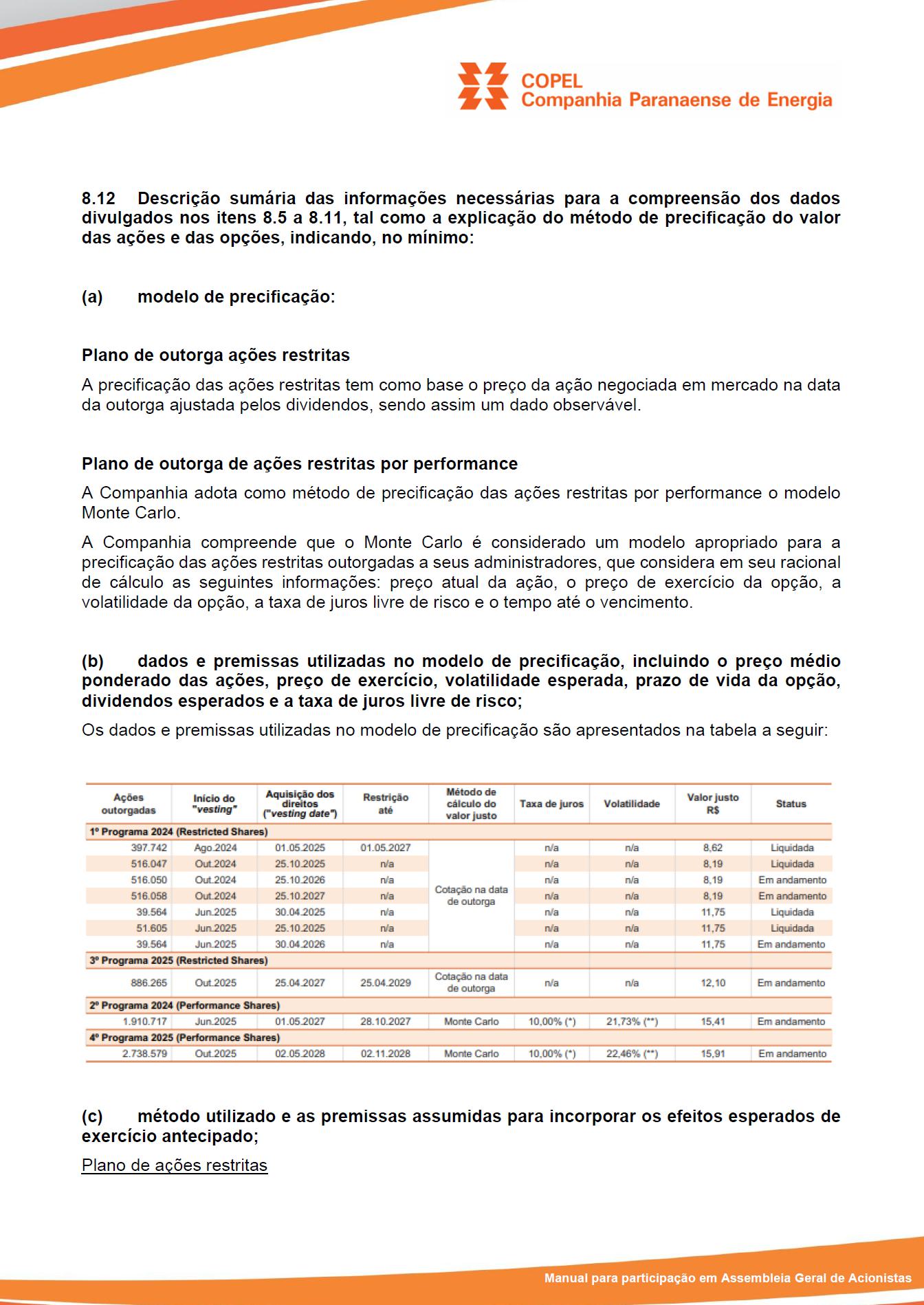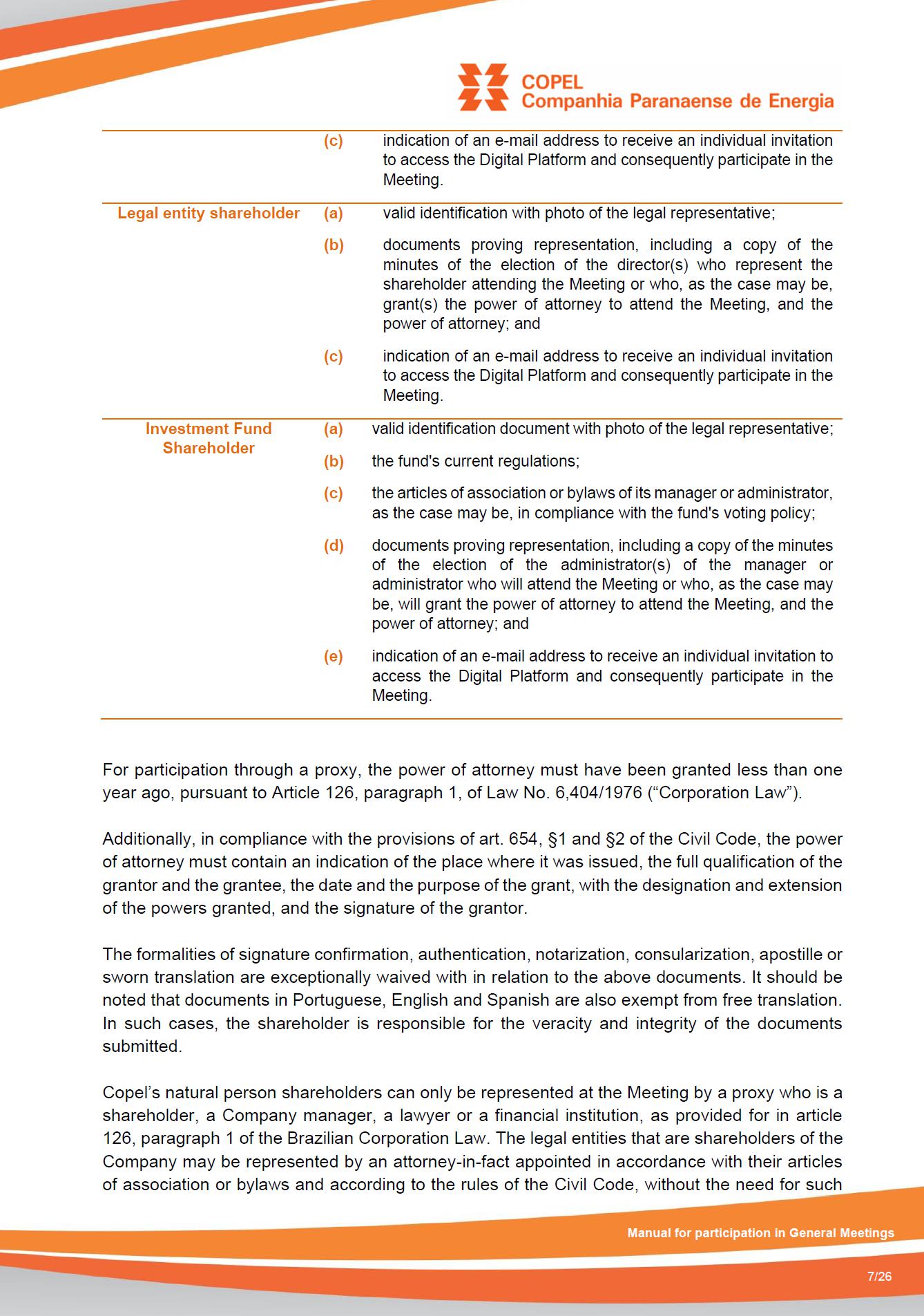 MANAGEMENT'S PROPOSAL AND MANUAL FOR PARTICIPATION IN GENERAL MEETINGS 71st Annual General Meeting 213th Extraordinary General Meeting April 23, 2026 Manual for participation in General Meetings 2/26 TABLE OF CONTENTS I. Message from the Management .............................................................................................. 3 II. Guidance for Participation in the General Meeting ................................................................ 4 Participation via Ballot Paper .................................................................................................. 4 Participation via Digital Platform ............................................................................................. 6 Holders of ADRs…………………………………………………………………………………………9 Convening of the General Meeting …………………………………………………………… . ……9 Voting Rights …….……………………………………………………………………………………. 10 Approval of the Matters on the Agenda …..…………………………………………………….…10 Final guidelines……………………………………………………………………………….………..10 III. Call Notice ............................................................................................................................... 11 IV. Management's Proposal ....................................................................................................... 14 V. Annex ..................................................................................................................................... 27 Manual for participation in General Meetings 3/26 I. MESSAGE FROM THE MANAGEMENT Dear Shareholder: It is with immense pleasure that I present to you this document containing the Management's Proposal and Manual for participation in General Shareholders’ Meetings of the Companhia Paranaense de Energia - Copel, with general guidance for an effective participation and exercise of the vote. This document has been prepared based on Copel's Corporate Governance policy, last updated in 2025, which is founded on integrity, transparency, fairness, accountability, and sustainability. The Proposal aims to present, in a clear and brief way, information related to the Company’s Shareholders’ Meeting, offering contributions that help the understanding of the proposals for resolution, encouraging the participation of shareholders in the events on the Company's corporate agenda. The matters to be presented for resolution of shareholders are described in the Call Notice and in the Management’s Proposal. Copel’s 71st AGM and 213rd Extraordinary General Meeting - EGM will be called to take place, on first call, on April 23, 2026, at 2pm, and will be held exclusively digitally, with the participation of its shareholders virtually, through the Ten Meetings digital platform, without prejudice to the possibility of exercising the vote by means of a Distance Voting Ballot. It is also important to mention that the Meeting will be attended, among others, by members of the Executive Board and representatives of the Supervisory Board, the Statutory Audit Committee and the independent auditor, who will be in a position to provide additional clarifications on the matters on the agenda, in accordance with their respective duties. Your participation is very important, considering that issues relevant to the Company and its shareholders will be dealt with in this Meeting. Yours sincerely, Marcel Martins Malczewski Chairman of the Board of Directors Manual for participation in General Meetings 4/26 II. GUIDANCE FOR PARTICIPATION IN THE GENERAL MEETING Copel’s shareholders may take part in the General Meeting: (i) via Ballot Paper, made available to shareholders on the following websites: the Company’s (ri.copel.com), B3 S.A. - Brasil, Bolsa, Balcão - B3 and Brazilian Securities and Exchange Commission - CVM; or (ii) via Digital Platform, which may be accessed personally or by a duly appointed proxy, pursuant to CVM Resolution no. 81/2022 - RCVM 81, as described below. Participation via Ballot Paper In order to facilitate and encourage the participation of its shareholders, Copel will adopt the remote voting system under the terms of RCVM 81, allowing its Shareholders to send distance voting ballots through their respective custody agents, the Bookkeeping Agent (Itaú Corretora de Valores S.A.) or directly to the Company, in accordance with the following guidelines: Distance voting ballots regarding the AGM and the EGM have been made available on Copel’s website (ri.copel.com) and on CVM's (gov.br/cvm) and B3's (b3.com.br) websites, in printable and manually fillable versions. Shareholders who choose to exercise their right to vote at a distance may (a) fill out and send the voting form directly to the Company, or (b) transmit the filling out instructions to qualified service providers, according to the guidelines below: • Exercise of voting rights through service providers - Remote voting system Shareholders who choose to exercise their voting rights remotely through service providers must transmit their voting instructions to their respective custody agents or through B3's Central Depository or, if the shares are in a book-entry environment, through the bookkeeper, in compliance with the rules determined by the latter. To this end, shareholders must contact their custody agents, access B3's Central Depository or contact the bookkeeping agent and check the procedures they have established for issuing voting instructions via ballot paper, as well as the documents and information they require to do so. The Ballot Papers must be sent to the custody agent, to the Central Depositary of B3 or to the bookkeeping agent, as applicable, in accordance with the procedures established by them, by April 19, 