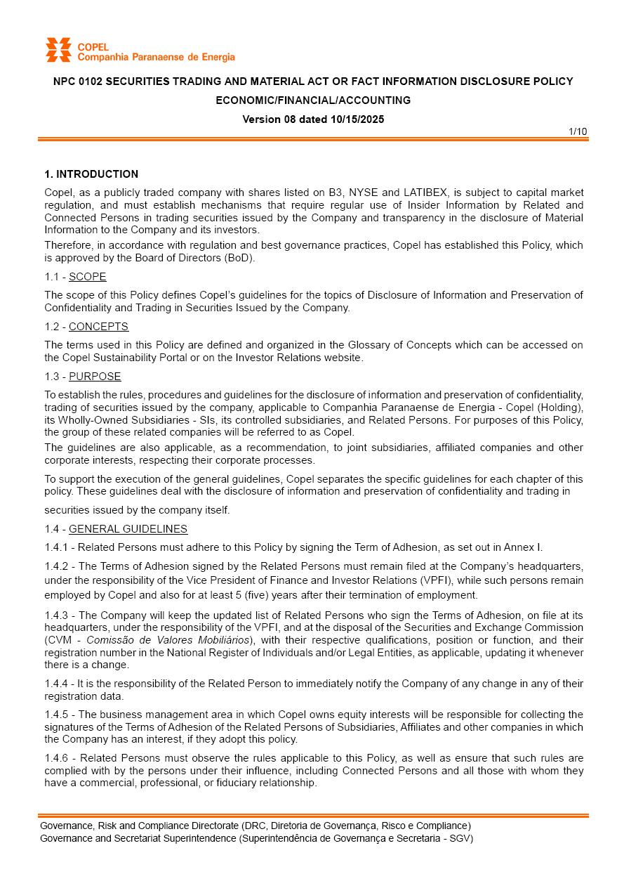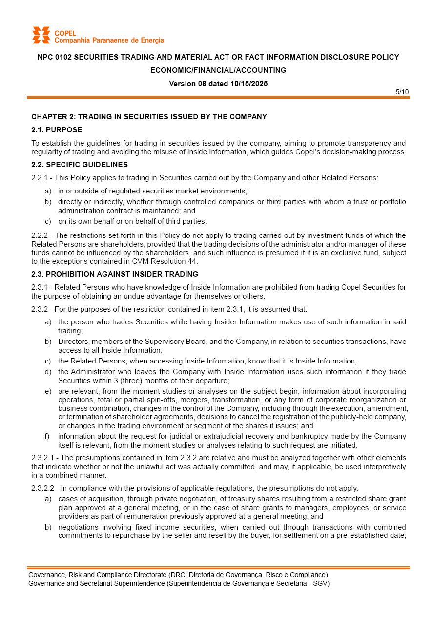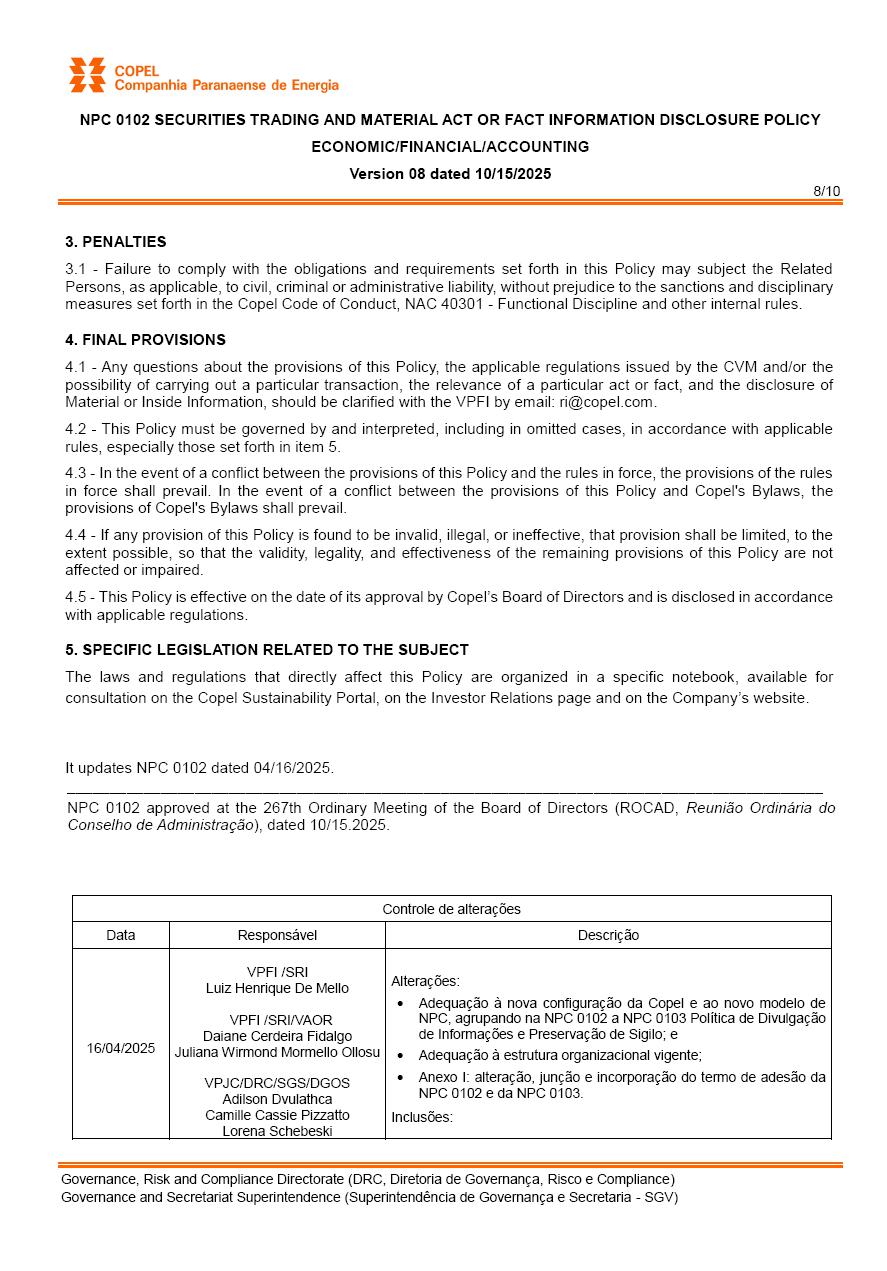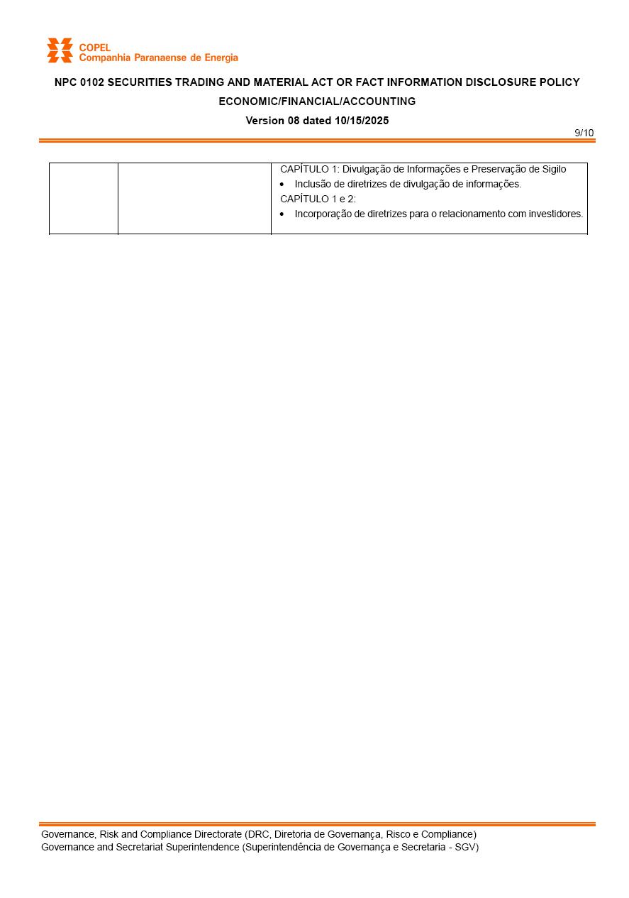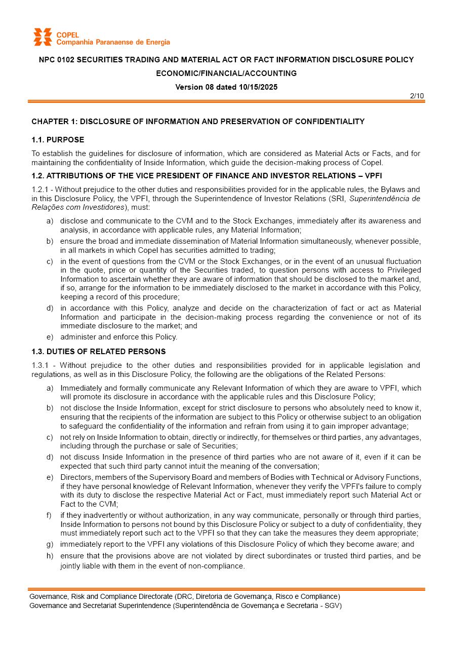 NPC 0102 SECURITIES TRADING AND MATERIAL ACT OR FACT INFORMATION DISCLOSURE POLICY ECONOMIC/FINANCIAL/ACCOUNTING Version 08 dated 10/15/2025 1/10 Governance, Risk and Compliance Directorate (DRC, Diretoria de Governança, Risco e Compliance) Governance and Secretariat Superintendence (Superintendência de Governança e Secretaria - SGV) 1. INTRODUCTION Copel, as a publicly traded company with shares listed on B3, NYSE and LATIBEX, is subject to capital market regulation, and must establish mechanisms that require regular use of Insider Information by Related and Connected Persons in trading securities issued by the Company and transparency in the disclosure of Material Information to the Company and its investors. Therefore, in accordance with regulation and best governance practices, Copel has established this Policy, which is approved by the Board of Directors (BoD). 1.1 - SCOPE The scope of this Policy defines Copel’s guidelines for the topics of Disclosure of Information and Preservation of Confidentiality and Trading in Securities Issued by the Company. 1.2 - CONCEPTS The terms used in this Policy are defined and organized in the Glossary of Concepts which can be accessed on the Copel Sustainability Portal or on the Investor Relations website. 1.3 - PURPOSE To establish the rules, procedures and guidelines for the disclosure of information and preservation of confidentiality, trading of securities issued by the company, applicable to Companhia Paranaense de Energia - Copel (Holding), its Wholly-Owned Subsidiaries - SIs, its controlled subsidiaries, and Related Persons. For purposes of this Policy, the group of these related companies will be referred to as Copel. The guidelines are also applicable, as a recommendation, to joint subsidiaries, affiliated companies and other corporate interests, respecting their corporate processes. To support the execution of the general guidelines, Copel separates the specific guidelines for each chapter of this policy. These guidelines deal with the disclosure of information and preservation of confidentiality and trading in securities issued by the company itself. 1.4 - GENERAL GUIDELINES 1.4.1 - Related Persons must adhere to this Policy by signing the Term of Adhesion, as set out in Annex I. 1.4.2 - The Terms of Adhesion signed by the Related Persons must remain filed at the Company’s headquarters, under the responsibility of the Vice President of Finance and Investor Relations (VPFI), while such persons remain employed by Copel and also for at least 5 (five) years after their termination of employment. 1.4.3 - The Company will keep the updated list of Related Persons who sign the Terms of Adhesion, on file at its headquarters, under the responsibility of the VPFI, and at the disposal of the Securities and Exchange Commission (CVM - Comissão de Valores Mobiliários), with their respective qualifications, position or function, and their registration number in the National Register of Individuals and/or Legal Entities, as applicable, updating it whenever there is a change. 1.4.4 - It is the responsibility of the Related Person to immediately notify the Company of any change in any of their registration data. 1.4.5 - The business management area in which Copel owns equity interests will be responsible for collecting the signatures of the Terms of Adhesion of the Related Persons of Subsidiaries, Affiliates and other companies in which the Company has an interest, if they adopt this policy. 1.4.6 - Related Persons must observe the rules applicable to this Policy, as well as ensure that such rules are complied with by the persons under their influence, including Connected Persons and all those with whom they have a commercial, professional, or fiduciary relationship. NPC 0102 SECURITIES TRADING AND MATERIAL ACT OR FACT INFORMATION DISCLOSURE POLICY ECONOMIC/FINANCIAL/ACCOUNTING Version 08 dated 10/15/2025 2/10 Governance, Risk and Compliance Directorate (DRC, Diretoria de Governança, Risco e Compliance) Governance and Secretariat Superintendence (Superintendência de Governança e Secretaria - SGV) CHAPTER 1: DISCLOSURE OF INFORMATION AND PRESERVATION OF CONFIDENTIALITY 1.1. PURPOSE To establish the guidelines for disclosure of information, which are considered as Material Acts or Facts, and for maintaining the confidentiality of Inside Information, which guide the decision-making process of Copel. 1.2. ATTRIBUTIONS OF THE VICE PRESIDENT OF FINANCE AND INVESTOR RELATIONS – VPFI 1.2.1 - Without prejudice to the other duties and responsibilities provided for in the applicable rules, the Bylaws and in this Disclosure Policy, the VPFI, through the Superintendence of Investor Relations (SRI, Superintendência de Relações com Investidores), must: a) disclose and communicate to the CVM and to the Stock Exchanges, immediately after its awareness and analysis, in accordance with applicable rules, any Material Information; b) ensure the broad and immediate dissemination of Material Information simultaneously, whenever possible, in all markets in which Copel has securities admitted to trading; c) in the event of questions from the CVM or the Stock Exchanges, or in the event of an unusual fluctuation in the quote, price or quantity of the Securities traded, to question persons with access to Privileged Information to ascertain whether they are aware of information that should be disclosed to the market and, if so, arrange for the information to be immediately disclosed to the market in accordance with this Policy, keeping a record of this procedure; d) in accordance with this Policy, analyze and decide on the characterization of fact or act as Material Information and participate in the decision-making process regarding the convenience or not of its immediate disclosure to the market; and e) administer and enforce this Policy. 1.3. DUTIES OF RELATED PERSONS 1.3.1 - Without prejudice to the other duties and responsibilities provided for in applicable legi