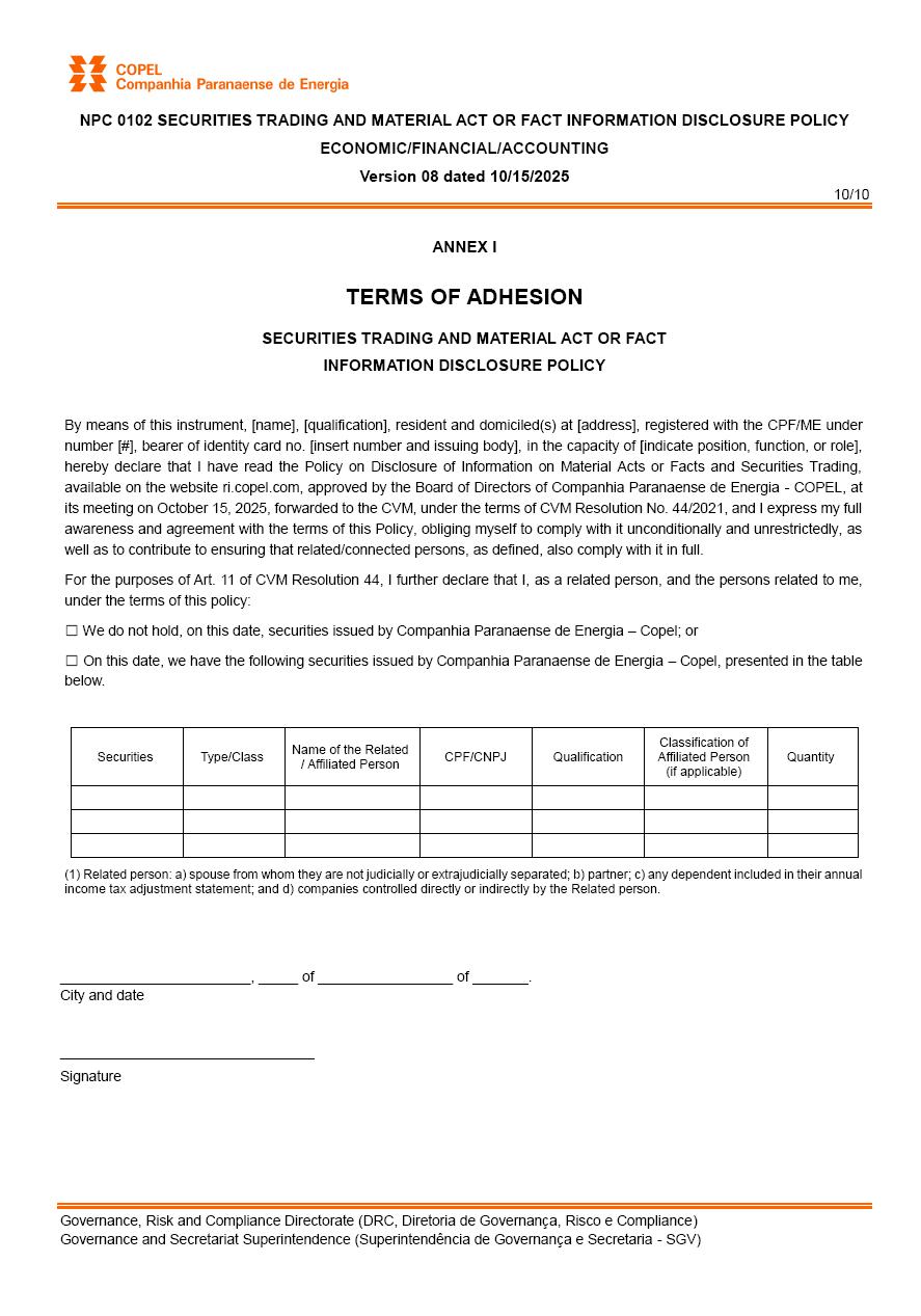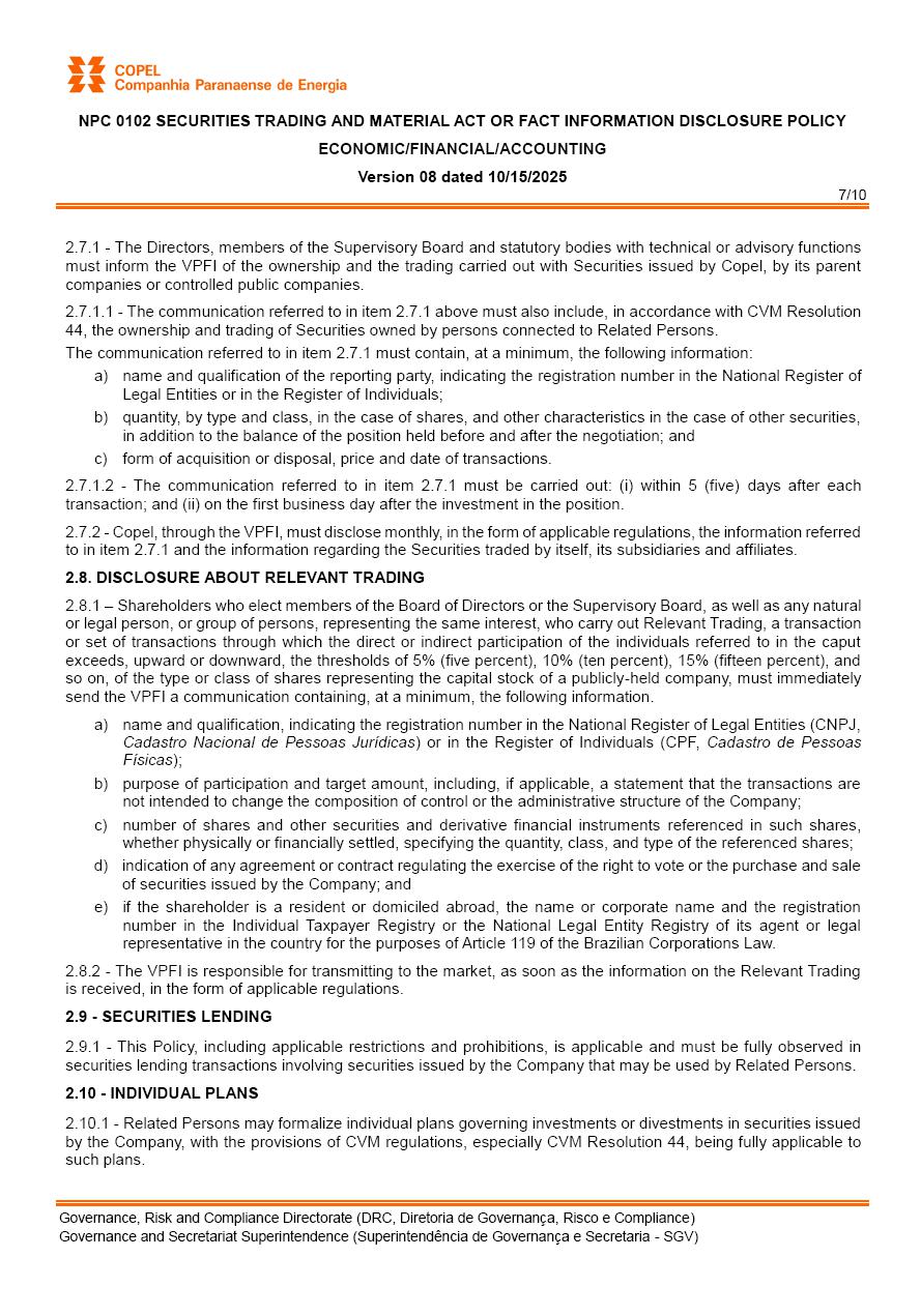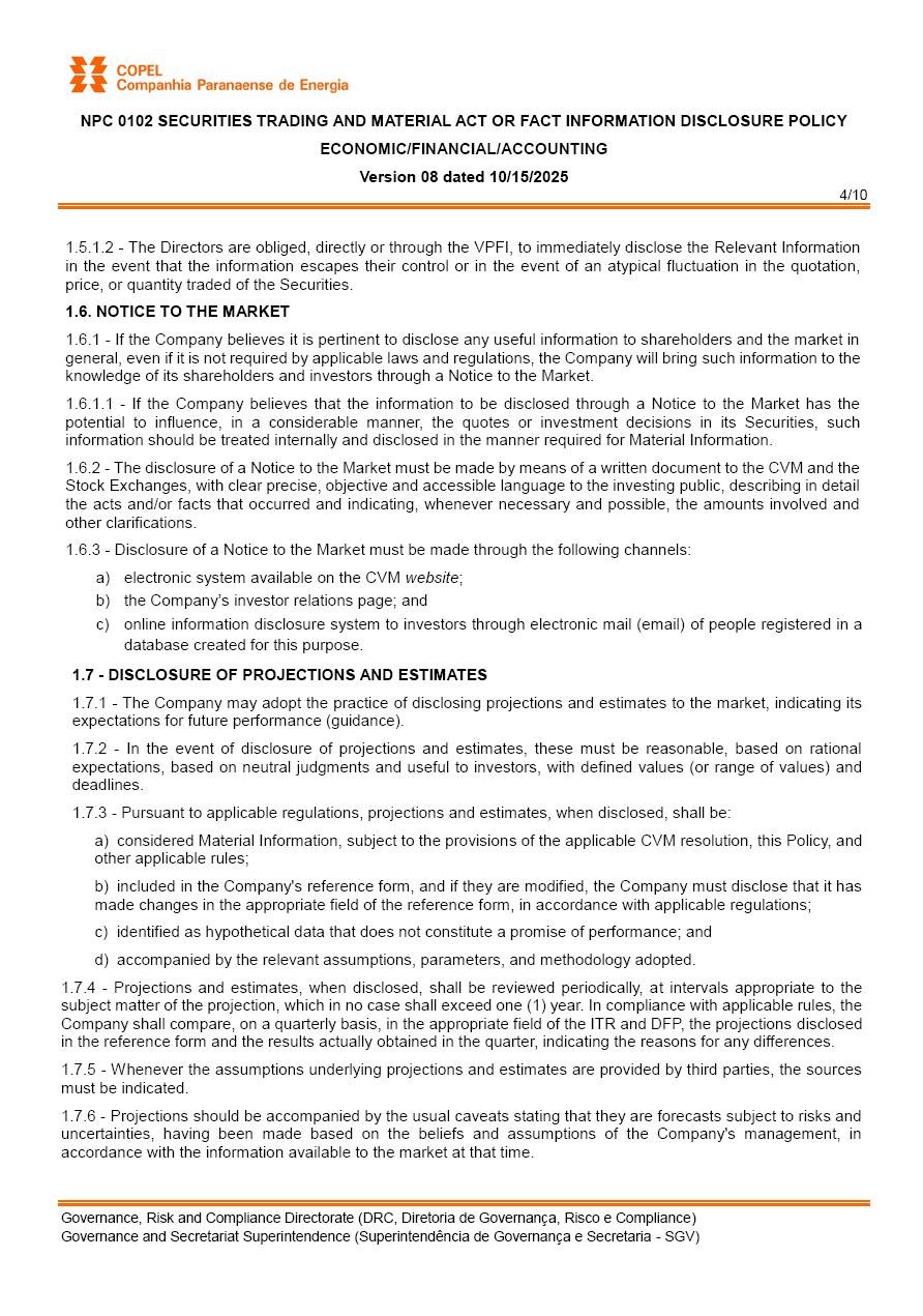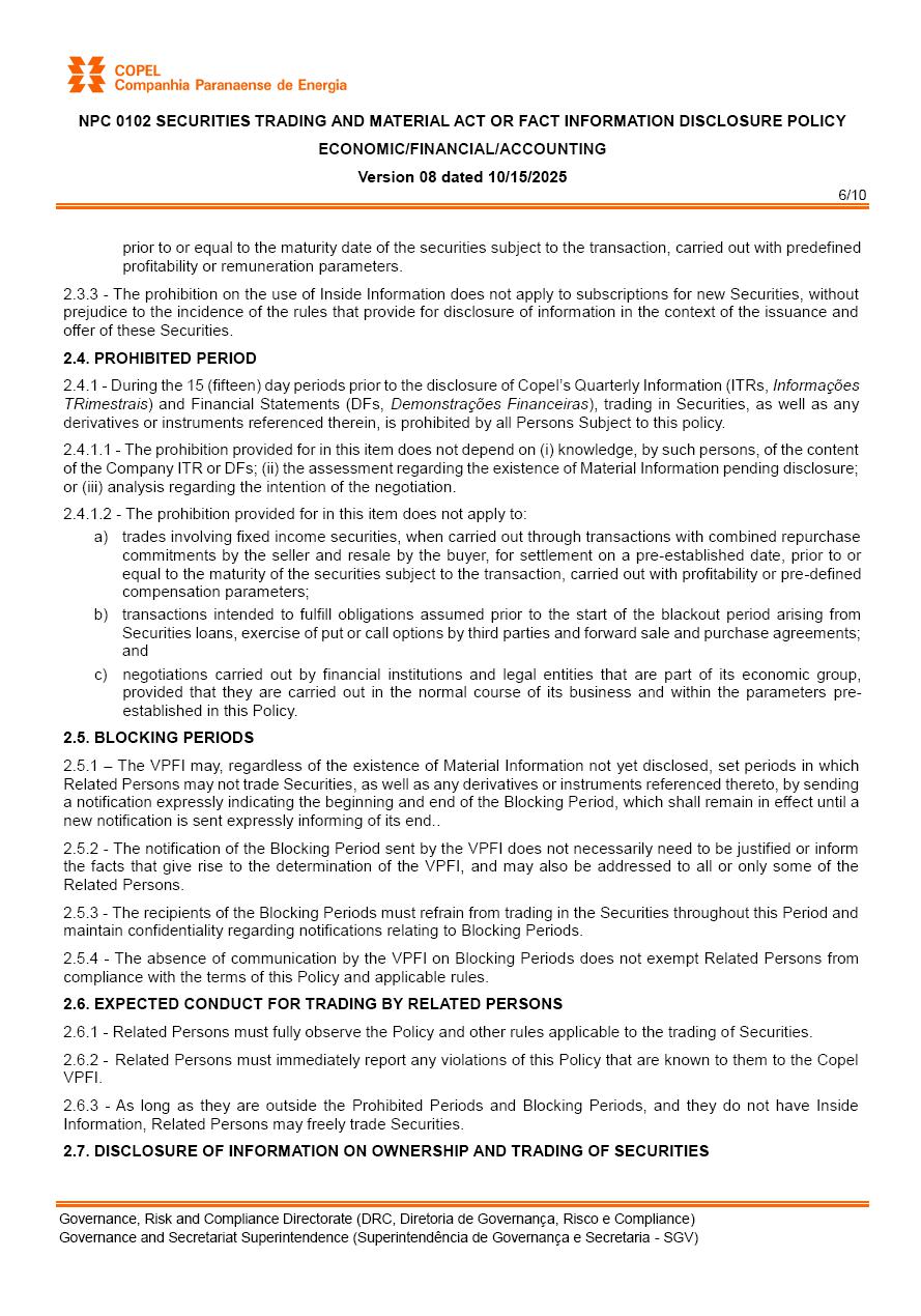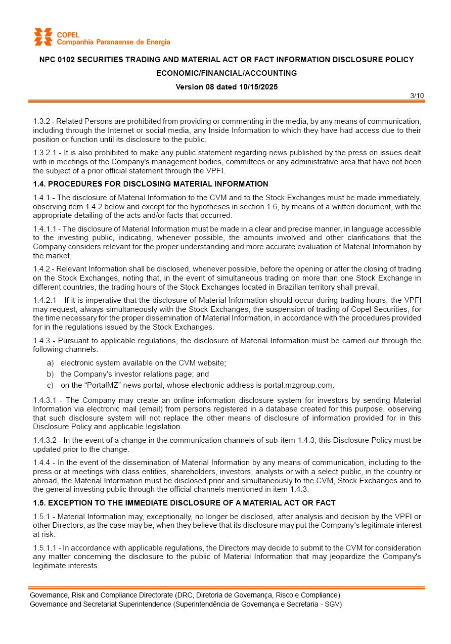NPC 0102 SECURITIES TRADING AND MATERIAL ACT OR FACT INFORMATION DISCLOSURE POLICY ECONOMIC/FINANCIAL/ACCOUNTING Version 08 dated 10/15/2025 1/10 Governance, Risk and Compliance Directorate (DRC, Diretoria de Governança, Risco e Compliance) Governance and Secretariat Superintendence (Superintendência de Governança e Secretaria - SGV) 1. INTRODUCTION Copel, as a publicly traded company with shares listed on B3, NYSE and LATIBEX, is subject to capital market regulation, and must establish mechanisms that require regular use of Insider Information by Related and Connected Persons in trading securities issued by the Company and transparency in the disclosure of Material Information to the Company and its investors. Therefore, in accordance with regulation and best governance practices, Copel has established this Policy, which is approved by the Board of Directors (BoD). 1.1 - SCOPE The scope of this Policy defines Copel’s guidelines for the topics of Disclosure of Information and Preservation of Confidentiality and Trading in Securities Issued by the Company. 1.2 - CONCEPTS The terms used in this Policy are defined and organized in the Glossary of Concepts which can be accessed on the Copel Sustainability Portal or on the Investor Relations website. 1.3 - PURPOSE To establish the rules, procedures and guidelines for the disclosure of information and preservation of confidentiality, trading of securities issued by the company, applicable to Companhia Paranaense de Energia - Copel (Holding), its Wholly-Owned Subsidiaries - SIs, its controlled subsidiaries, and Related Persons. For purposes of this Policy, the group of these related companies will be referred to as Copel. The guidelines are also applicable, as a recommendation, to joint subsidiaries, affiliated companies and other corporate interests, respecting their corporate processes. To support the execution of the general guidelines, Copel separates the specific guidelines for each chapter of this policy. These guidelines deal with the disclosure of information and preservation of confidentiality and trading in securities issued by the company itself. 1.4 - GENERAL GUIDELINES 1.4.1 - Related Persons must adhere to this Policy by signing the Term of Adhesion, as set out in Annex I. 1.4.2 - The Terms of Adhesion signed by the Related Persons must remain filed at the Company’s headquarters, under the responsibility of the Vice President of Finance and Investor Relations (VPFI), while such persons remain employed by Copel and also for at least 5 (five) years after their termination of employment. 1.4.3 - The Company will keep the updated list of Related Persons who sign the Terms of Adhesion, on file at its headquarters, under the responsibility of the VPFI, and at the disposal of the Securities and Exchange Commission (CVM - Comissão de Valores Mobiliários), with their respective qualifications, position or function, and their registration number in the National Register of Individuals and/or Legal Entities, as applicable, updating it whenever there is a change. 1.4.4 - It is the responsibility of the Related Person to immediately notify the Company of any change in any of their registration data. 1.4.5 - The business management area in which Copel owns equity interests will be responsible for collecting the signatures of the Terms of Adhesion of the Related Persons of Subsidiaries, Affiliates and other companies in which the Company has an interest, if they adopt this policy. 1.4.6 - Related Persons must observe the rules applicable to this Policy, as well as ensure that such rules are complied with by the persons under their influence, including Connected Persons and all those with whom they have a commercial, professional, or fiduciary relationship. NPC 0102 SECURITIES TRADING AND MATERIAL ACT OR FACT INFORMATION DISCLOSURE POLICY ECONOMIC/FINANCIAL/ACCOUNTING Version 08 dated 10/15/2025 2/10 Governance, Risk and Compliance Directorate (DRC, Diretoria de Governança, Risco e Compliance) Governance and Secretariat Superintendence (Superintendência de Governança e Secretaria - SGV) CHAPTER 1: DISCLOSURE OF INFORMATION AND PRESERVATION OF CONFIDENTIALITY 1.1. PURPOSE To establish the guidelines for disclosure of information, which are considered as Material Acts or Facts, and for maintaining the confidentiality of Inside Information, which guide the decision-making process of Copel. 1.2. ATTRIBUTIONS OF THE VICE PRESIDENT OF FINANCE AND INVESTOR RELATIONS – VPFI 1.2.1 - Without prejudice to the other duties and responsibilities provided for in the applicable rules, the Bylaws and in this Disclosure Policy, the VPFI, through the Superintendence of Investor Relations (SRI, Superintendência de Relações com Investidores), must: a) disclose and communicate to the CVM and to the Stock Exchanges, immediately after its awareness and analysis, in accordance with applicable rules, any Material Information; b) ensure the broad and immediate dissemination of Material Information simultaneously, whenever possible, in all markets in which Copel has securities admitted to trading; c) in the event of questions from the CVM or the Stock Exchanges, or in the event of an unusual fluctuation in the quote, price or quantity of the Securities traded, to question persons with access to Privileged Information to ascertain whether they are aware of information that should be disclosed to the market and, if so, arrange for the information to be immediately disclosed to the market in accordance with this Policy, keeping a record of this procedure; d) in accordance with this Policy, analyze and decide on the characterization of fact or act as Material Information and participate in the decision-making process regarding the convenience or not of its immediate disclosure to the market; and e) administer and enforce this Policy. 1.3. DUTIES OF RELATED PERSONS 1.3.1 - Without prejudice to the other duties and responsibilities provided for in applicable legi