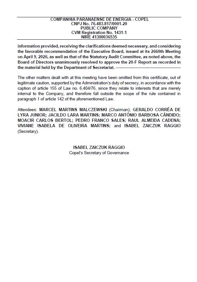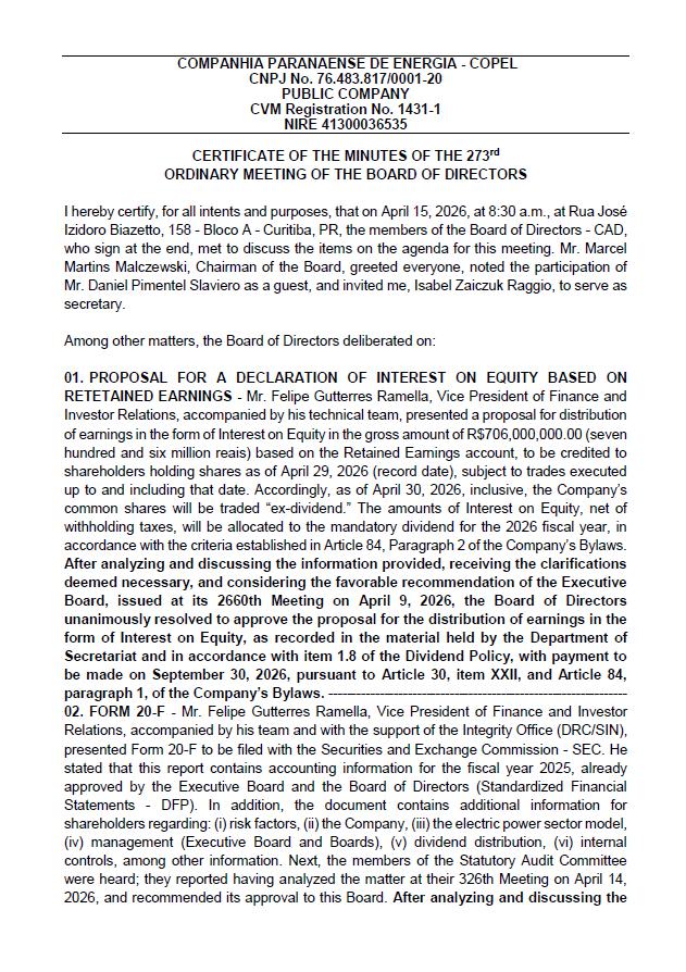COMPANHIA PARANAENSE DE ENERGIA - COPEL CNPJ No. 76.483.817/0001-20 PUBLIC COMPANY CVM Registration No. 1431-1 NIRE 41300036535 CERTIFICATE OF THE MINUTES OF THE 273rd ORDINARY MEETING OF THE BOARD OF DIRECTORS I hereby certify, for all intents and purposes, that on April 15, 2026, at 8:30 a.m., at Rua José Izidoro Biazetto, 158 - Bloco A - Curitiba, PR, the members of the Board of Directors - CAD, who sign at the end, met to discuss the items on the agenda for this meeting. Mr. Marcel Martins Malczewski, Chairman of the Board, greeted everyone, noted the participation of Mr. Daniel Pimentel Slaviero as a guest, and invited me, Isabel Zaiczuk Raggio, to serve as secretary. Among other matters, the Board of Directors deliberated on: 01. PROPOSAL FOR A DECLARATION OF INTEREST ON EQUITY BASED ON RETETAINED EARNINGS - Mr. Felipe Gutterres Ramella, Vice President of Finance and Investor Relations, accompanied by his technical team, presented a proposal for distribution of earnings in the form of Interest on Equity in the gross amount of R$706,000,000.00 (seven hundred and six million reais) based on the Retained Earnings account, to be credited to shareholders holding shares as of April 29, 2026 (record date), subject to trades executed up to and including that date. Accordingly, as of April 30, 2026, inclusive, the Company’s common shares will be traded “ex-dividend.” The amounts of Interest on Equity, net of withholding taxes, will be allocated to the mandatory dividend for the 2026 fiscal year, in accordance with the criteria established in Article 84, Paragraph 2 of the Company’s Bylaws. After analyzing and discussing the information provided, receiving the clarifications deemed necessary, and considering the favorable recommendation of the Executive Board, issued at its 2660th Meeting on April 9, 2026, the Board of Directors unanimously resolved to approve the proposal for the distribution of earnings in the form of Interest on Equity, as recorded in the material held by the Department of Secretariat and in accordance with item 1.8 of the Dividend Policy, with payment to be made on September 30, 2026, pursuant to Article 30, item XXII, and Article 84, paragraph 1, of the Company’s Bylaws. ---------------------------------------------------------------- 02. FORM 20-F - Mr. Felipe Gutterres Ramella, Vice President of Finance and Investor Relations, accompanied by his team and with the support of the Integrity Office (DRC/SIN), presented Form 20-F to be filed with the Securities and Exchange Commission - SEC. He stated that this report contains accounting information for the fiscal year 2025, already approved by the Executive Board and the Board of Directors (Standardized Financial Statements - DFP). In addition, the document contains additional information for shareholders regarding: (i) risk factors, (ii) the Company, (iii) the electric power sector model, (iv) management (Executive Board and Boards), (v) dividend distribution, (vi) internal controls, among other information. Next, the members of the Statutory Audit Committee were heard; they reported having analyzed the matter at their 326th Meeting on April 14, 2026, and recommended its approval to this Board. After analyzing and discussing the COMPANHIA PARANAENSE DE ENERGIA - COPEL CNPJ No. 76.483.817/0001-20 PUBLIC COMPANY CVM Registration No. 1431-1 NIRE 41300036535 information provided, receiving the clarifications deemed necessary, and considering the favorable recommendation of the Executive Board, issued at its 2660th Meeting on April 9, 2026, as well as that of the Statutory Audit Committee, as noted above, the Board of Directors unanimously resolved to approve the 20-F Report as recorded in the material held by the Department of Secretariat. ------------------------------------------------ The other matters dealt with at this meeting have been omitted from this certificate, out of legitimate caution, supported by the Administration’s duty of secrecy, in accordance with the caption of article 155 of Law no. 6.404/76, since they relate to interests that are merely internal to the Company, and therefore fall outside the scope of the rule contained in paragraph 1 of article 142 of the aforementioned Law. Attendees: MARCEL MARTINS MALCZEWSKI (Chairman); GERALDO CORRÊA DE LYRA JUNIOR; JACILDO LARA MARTINS; MARCO ANTÔNIO BARBOSA CÂNDIDO; MOACIR CARLOS BERTOL; PEDRO FRANCO SALES; RAUL ALMEIDA CADENA; VIVIANE ISABELA DE OLIVEIRA MARTINS; and ISABEL ZAICZUK RAGGIO (Secretary). ISABEL ZAICZUK RAGGIO Copel’s Secretary of Governance
