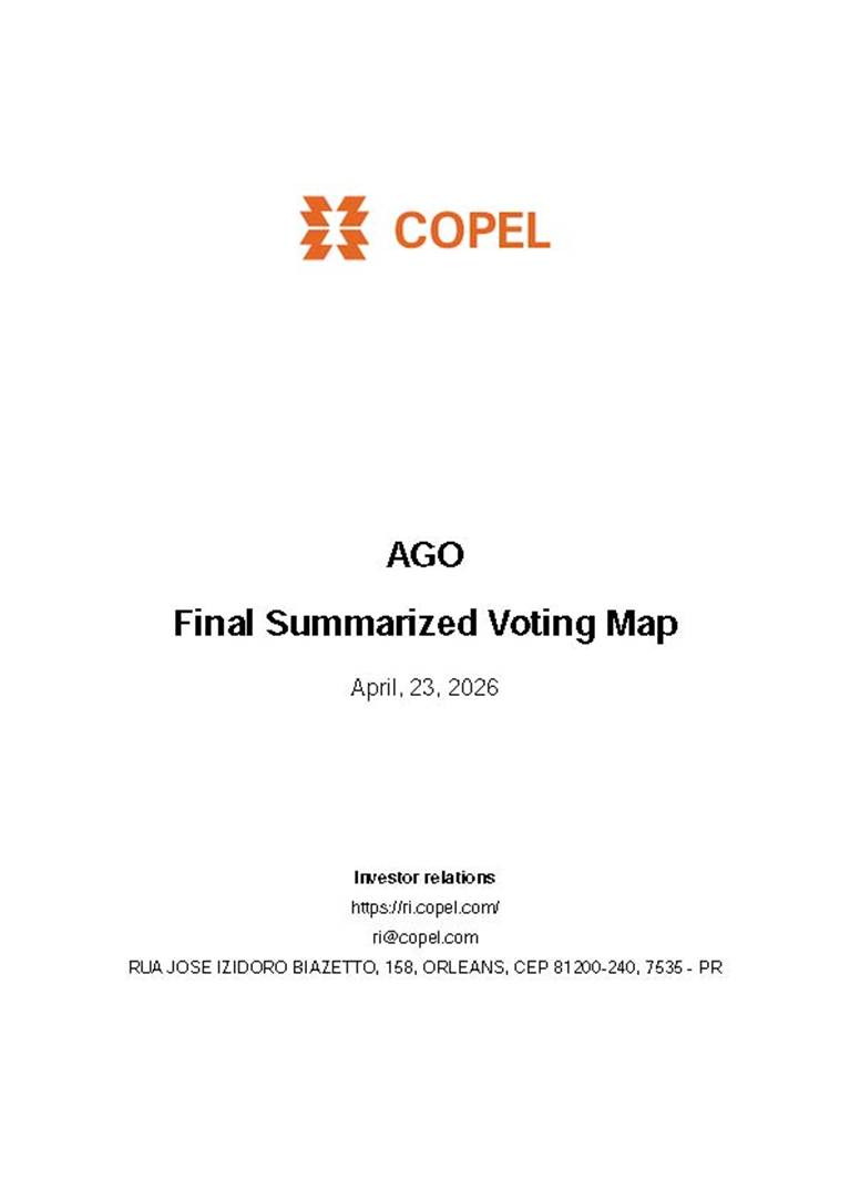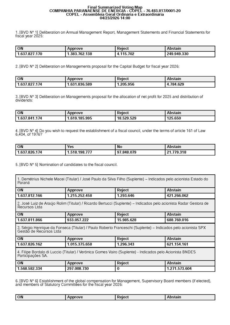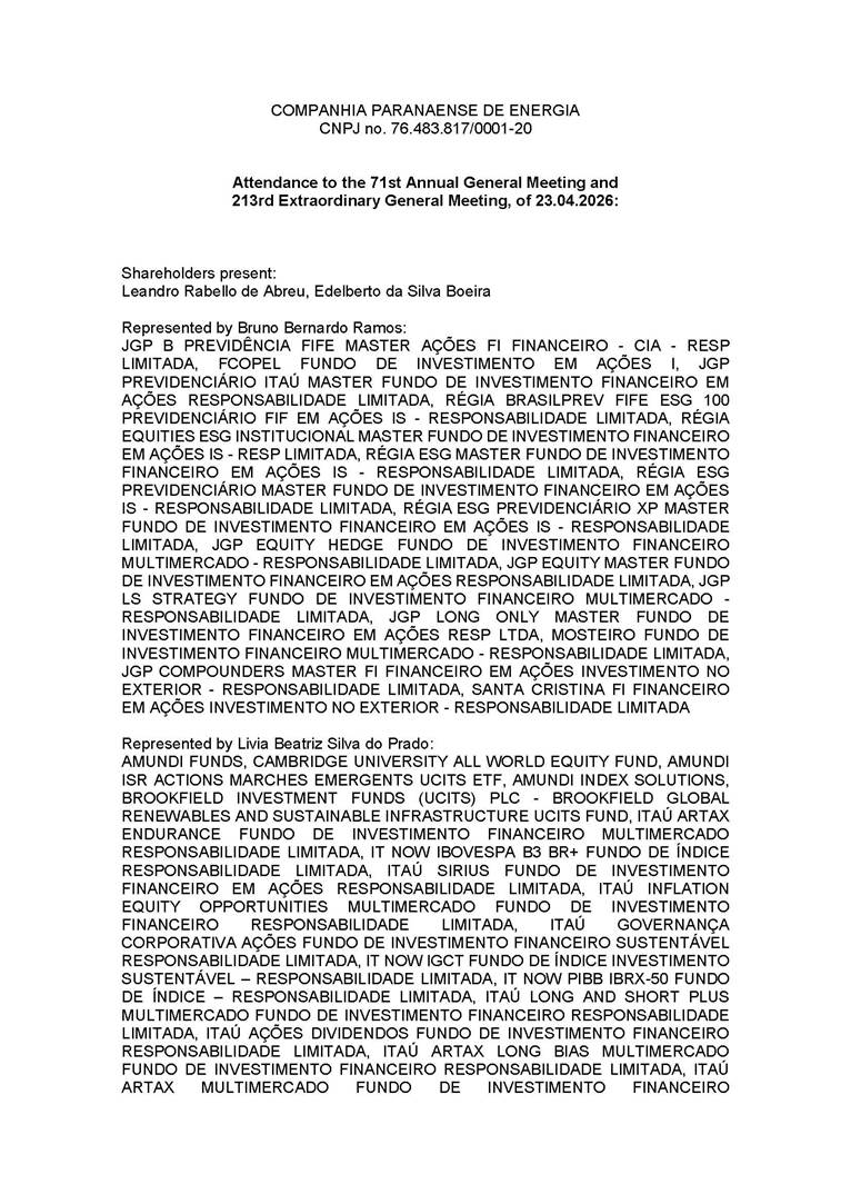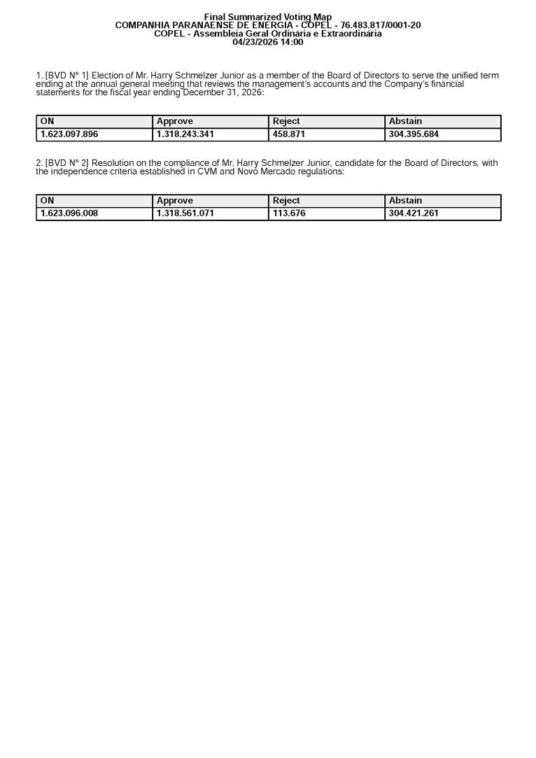 COMPANHIA PARANAENSE DE ENERGIA - COPEL Corporate Tax ID No. 76.483.817/0001-20 PUBLIC COMPANY CVM Registration no. 1431-1 MINUTES OF THE 71ST ANNUAL GENERAL MEETING AND THE 213TH EXTRAORDINARY GENERAL MEETING 1. DATE, TIME, AND PLACE: Held on April 23, 2026, at 2:00 p.m., exclusively in digital format, and therefore in accordance with Article 5, Paragraph 3, of CVM Resolution no. 81, dated March 29, 2022, held at the Company’s registered office, located in the City of Curitiba, State of Paraná, at Rua José Izidoro Biazetto no. 158, Bloco A, Orleans, ZIP Code 81200-240. 2. CALL: The first call notice was published in accordance with Article 124 of Federal Law no. 6,404, dated December 15, 1976 (“Corporations Law”), in the March 23, 24, and 25, 2026 editions of the newspaper “Valor Econômico,” on pages C5, A8, and A13, respectively, with the documents made available on the newspaper’s website, pursuant to Article 289, I, of the Brazilian Corporations Law. 3. QUORUM FOR CONVENING: Present: (A) At the Annual General Meeting: shareholders holding 1,637,841,174 common, registered, book-entry, and no-par-value shares issued by the Company, excluding treasury shares, representing approximately 68.93% of the voting capital; and (B) At the Extraordinary General Meeting: shareholders holding 1,623,097,896 common, registered, book-entry, and no-par-value shares issued by the Company, excluding treasury shares, representing approximately 68.31% of the voting capital, as evidenced by the signatures in the Company’s Shareholder Attendance Book. 4. ATTENDANCE: Present were Mr. Demetrius Nichele Macei, Chairman of the Supervisory Board, Mr. Marco Antônio Barbosa Cândido, Coordinator of the Statutory Audit Committee; Mr. Daniel Pimentel Slaviero, President of the Company; Mr. Felipe Gutterres Ramella, Vice President of Finance and Investor Relations, Ms. Márcia Cristine Ribeirete Baena, Vice President of People and Management, Mr. Vicente Loiácono Neto, Director of Governance, Risk, and Compliance, and Mr. Guilherme Valle, representative of the external auditor, PricewaterhouseCoopers Auditores Independentes Ltda. 5. PRESIDING BOARD: The meeting was chaired by Mr. Marcel Martins Malczewski, Chairman of the Company’s Board of Directors, pursuant to Article 12 of the bylaws, and recorded by Ms. Isabel Zaiczuk Raggio, who was also responsible for signing the copy of the minutes to be submitted to the Board of Trade. 6. PUBLICATIONS AND DISCLOSURE: In accordance with Article 133 of the Brazilian Corporations Law, the Company’s Management Report and Financial Statements for the fiscal year ended December 31, 2025, accompanied by the respective notes to the financial statements and other relevant documents were published in the newspaper “Valor Econômico,” in a special supplement to the February 27, 2026 edition, with the full text of the document made available on the newspaper’s website, pursuant to Article 289, I, of the Brazilian Corporations Law. The above documents and other documents relevant to matters on the agenda, including the management’s proposal for the general meeting, were also made available to shareholders at the Company’s headquarters and published on the websites of CVM, B3 S.A. - Brasil, Bolsa, Balcão (“B3”) and the Company’s websites, more than one (1) month prior to the date of this Meeting, in accordance with the Brazilian Corporations Law and applicable CVM regulations. 7. AGENDA: To examine, discuss, and vote on the following agenda: 7.1. ANNUAL GENERAL MEETING: COMPANHIA PARANAENSE DE ENERGIA - COPEL Corporate Tax ID No. 76.483.817/0001-20 PUBLIC COMPANY CVM Registration no. 1431-1 7.1.1. Annual Management Report, Management Statements and Financial Statements for fiscal year 2025; 7.1.2. Management's proposal for the Capital Budget for fiscal year 2026; 7.1.3. Management's proposal for the allocation of net profit for 2025 and distribution of dividends; 7.1.4 Setting up of the Supervisory Board, considering the nomination of candidates by shareholders, in accordance with the applicable law; 7.1.5 If the Supervisory Board is set up, election of three regular members and their respective alternates; and 7.1.6 Establishment of the global compensation for Management, Supervisory Board members (if elected), and members of Statutory Committees for the fiscal year 2026. 7.2. EXTRAORDINARY GENERAL MEETING: 7.2.1. Election of a member of the Board of Directors to serve the unified term ending at the annual general meeting that reviews the management’s accounts and the Company’s financial statements for the fiscal year ending December 31, 2026; and 7.2.2. Resolution on the compliance of the elected member of the Board of Directors with the independence criteria established in CVM and Novo Mercado regulations. 8. RESOLUTIONS: Once the meeting was convened and following the review and discussion of the items on the agenda, the shareholders present resolved as follows: At the Annual General Meeting: 8.1. To approve, in accordance with the votes recorded in the voting map contained in Annex I, the Annual Management Report, Management Statements and Financial Statements for fiscal year 2025; 8.2. To approve, in accordance with the votes recorded in the voting map contained in Annex I, the proposed Capital Budget for the fiscal year 2026, in the total amount of R$3,021,288,866.00 (three billion, twenty-one million, two hundred eighty-eight thousand, eight hundred sixty-six reais); 8.3. To approve, in accordance with the votes recorded in the voting map contained in Annex I, the management’s proposal for the allocation of net income for the 2025 fiscal year, in the amount of R$2,688,613,402.80 (two billion, six hundred eighty-eight million, six hundred thirteen thousand, four hundred two reais and eighty cents), as follows: a) R$134,430,670.14 (one hundred thirty-four million, four hundred thirty thousand, six hundred seventy reais and fourteen centa