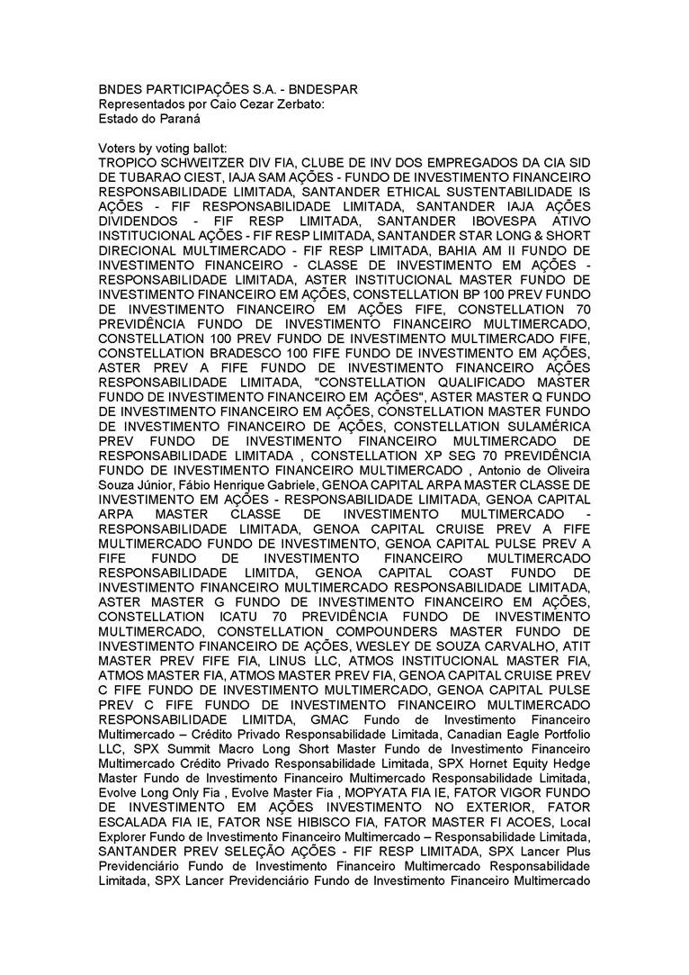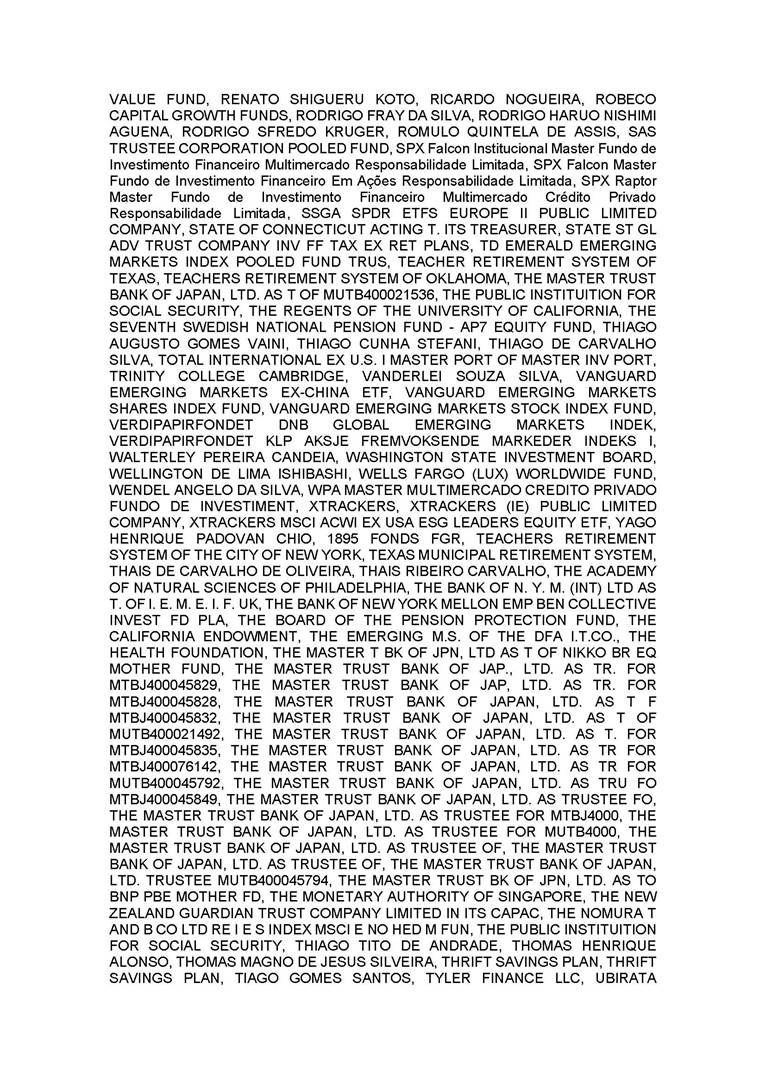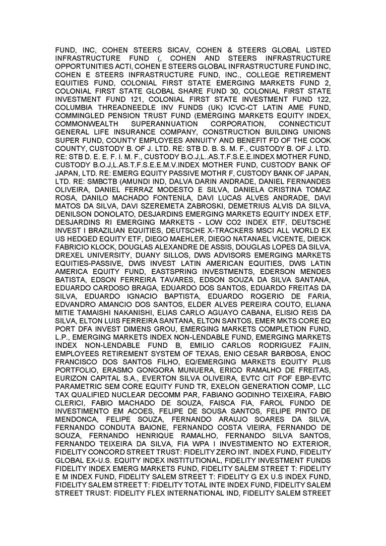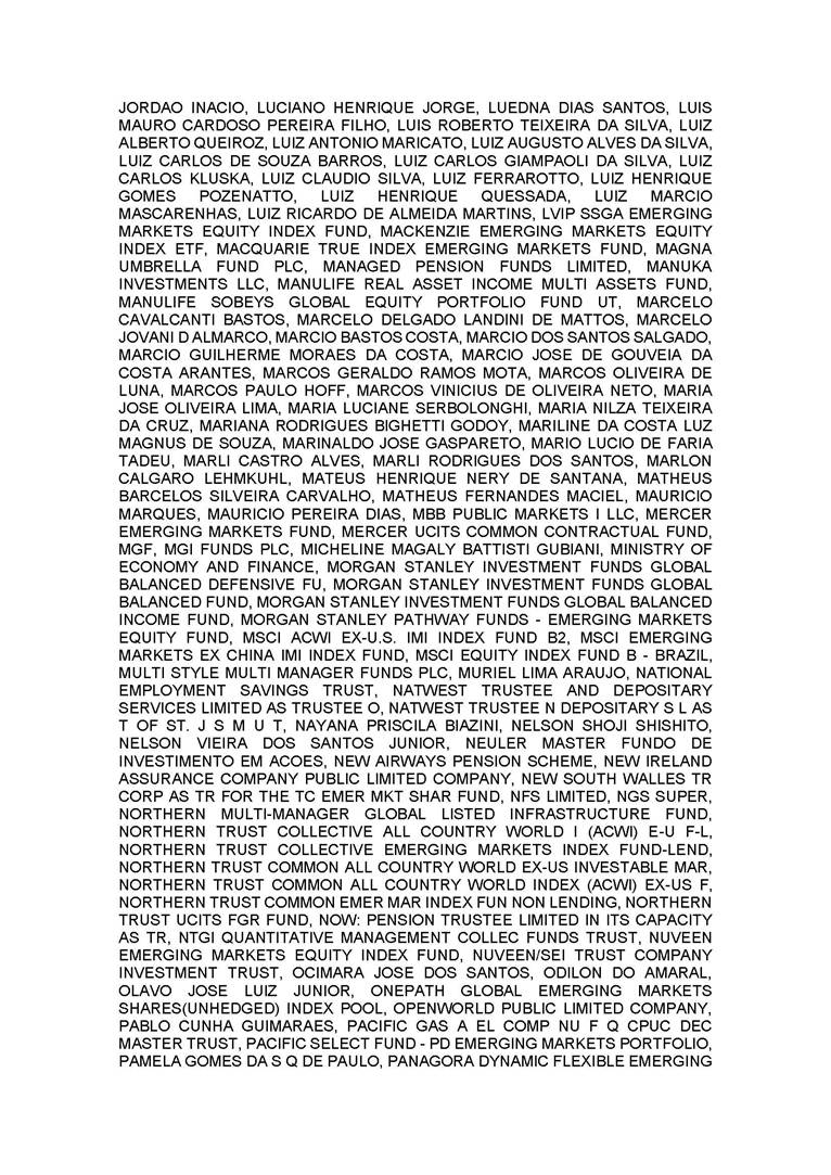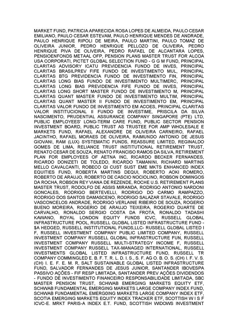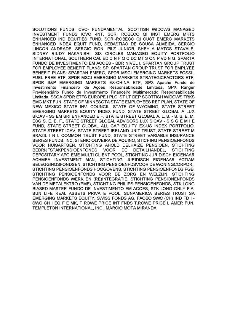 3.       QUORUM FOR CONVENING: Present: (A) At the Annual General Meeting: shareholders holding 1,637,841,174 common, registered, book-entry, and no-par-value shares issued by the Company, excluding treasury shares, representing approximately 68.93% of the voting capital; and (B) At the Extraordinary General Meeting: shareholders holding 1,623,097,896 common, registered, book-entry, and no-par-value shares issued by the Company, excluding treasury shares, representing approximately 68.31% of the voting capital, as evidenced by the signatures in the Company’s Shareholder Attendance Book.