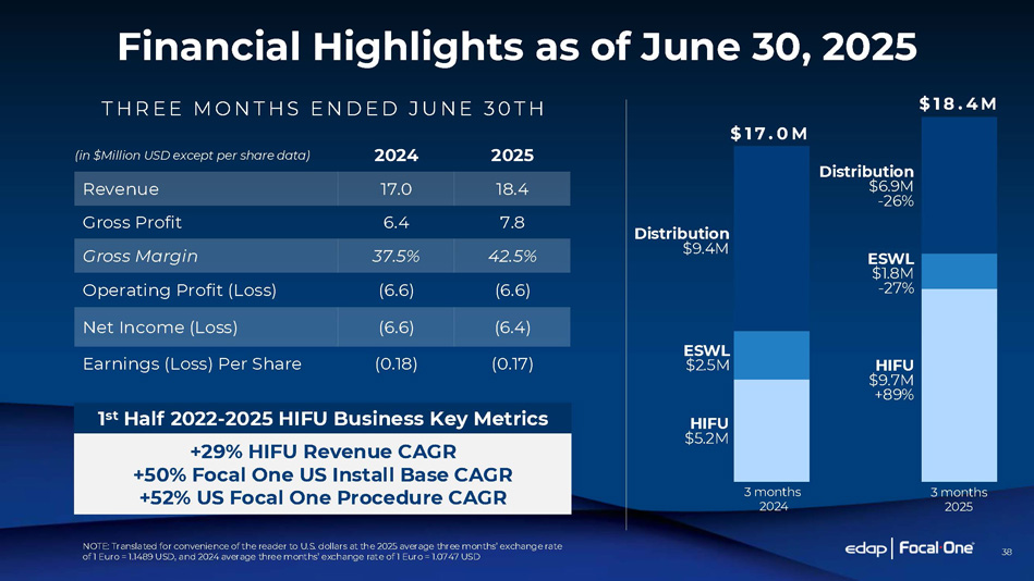 T HR E E M O N T HS E N D E D J U N E 3 0 T H 2025 2024 (in $Million USD except per share data) 18.4 17.0 Revenue 7.8 6.4 Gross Profit 42.5% 37.5% Gross Margin (6.6) (6.6) Operating Profit (Loss) (6.4) (6.6) Net Income (Loss) (0.17) (0.18) Earnings (Loss) Per Share HIFU $5.2M ESWL $2.5M Distribution $9.4M HIFU $9.7M +89% ESWL $1.8M - 27% 3 months 2024 3 months 2025 $ 1 7 . 0 M Distribution $6.9M - 26% NOTE: Translated for convenience of the reader to U.S. dollars at the 2025 average three months’ exchange rate of 1 Euro = 1.1489 USD, and 2024 average three months’ exchange rate of 1 Euro = 1.0747 USD 38 $ 1 8 . 4 M Financial Highlights as of June 30, 2025 +29% HIFU Revenue CAGR +50% Focal One US Install Base CAGR +52% US Focal One Procedure CAGR 1 st Half 2022 - 2025 HIFU Business Key Metrics
