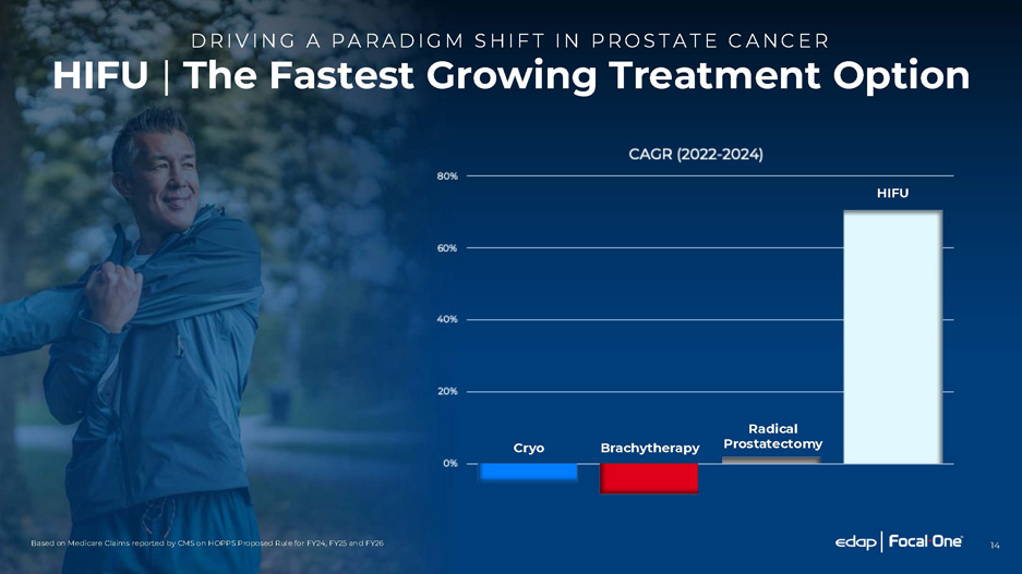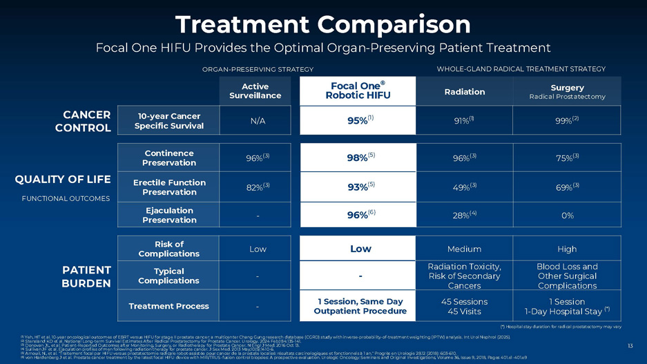 13 CANCER CONTROL PATIENT BURDEN Treatment Comparison Focal One HIFU Provides the Optimal Organ - Preserving Patient Treatment ORGAN - PRESERVING STRATEGY WHOLE - GLAND RADICAL TREATMENT STRATEGY QUALITY OF LIFE FUNCTIONAL OUTCOMES 96% (3) Continence Preservation 82% (3) Erectile Function Preservation - Ejaculation Preservation Low Risk of Complications - Typical Complications - Treatment Process Active Surveillance N/A 10 - year Cancer Specific Survival (*) Hospital stay duration for radical prostatectomy may vary (1) Yeh, HT et al. 10 - year oncological outcomes of EBRT versus HIFU for stage II prostate cancer: a multicenter Chang Gung research database (CGRD) study wi th inverse - probability - of - treatment weighting (IPTW) analysis. Int Urol Nephrol (2025). (2) Stensland KD et al. National Long - term Survival Estimates After Radical Prostatectomy for Prostate Cancer. Urology. 2024 Feb;184:135 - 141. (3) Donovan JL, et al. Patient - Reported Outcomes after Monitoring, Surgery, or Radiotherapy for Prostate Cancer. N Engl J Med. 2016 Oct 13. (4) Sullivan JF et al. Ejaculation profiles of men following radiation therapy for prostate cancer. J Sex Med. 2013 May;10(5):1410 - 6. (5) Arnouil, N., et al. "Traitement focal par HIFU versus prostatectomie radicale robot - assistée pour cancer de la prostate localisé: résultats carcinol ogiques et fonctionnels à 1 an." Progrès en Urologie 28.12 (2018): 603 - 610. (6) von Hardenberg J et al. Prostate cancer treatment by the latest focal HIFU device with MRI/TRUS - fusion control biopsies: A prospective evaluation. Urologic Oncology: Seminars and Original Investigations, Volume 36, Issue 9, 2018, Pages 401.e1 - 401.e9 75% (3) 96% (3) 98% (5) 69% (3) 49% (3) 93% (5) 0% 28% (4) 96% (6) High Medium Low Blood Loss and Other Surgical Complications Radiation Toxicity, Risk of Secondary Cancers - 1 Session 1 - Day Hospital Stay (*) 45 Sessions 45 Visits 1 Session, Same Day Outpatient Procedure Radiation Surgery Radical Prostatectomy Focal One ® Robotic HIFU 99% (2) 91% (1) 95% (1)