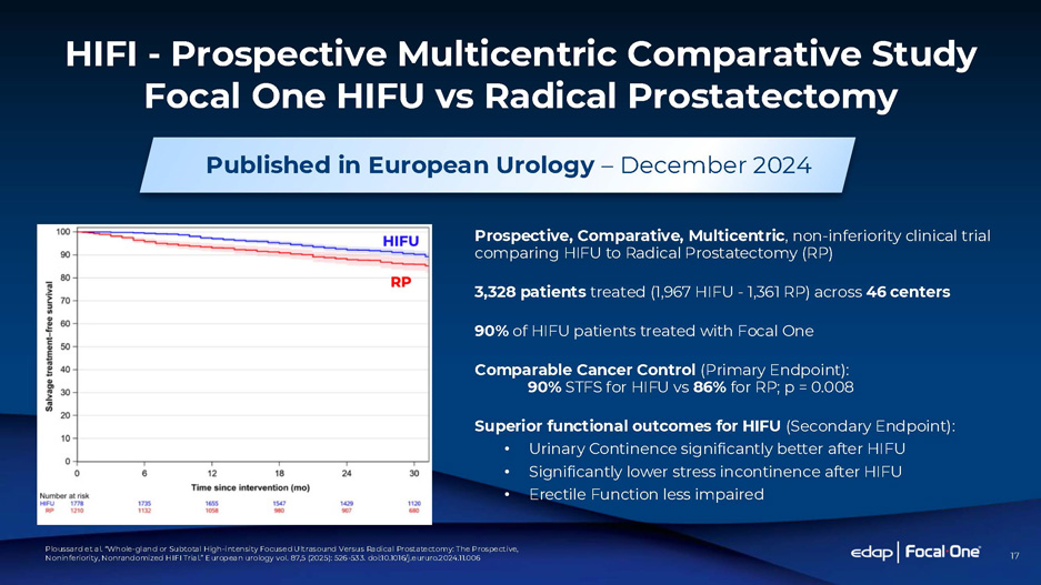 16 Proven Clinical Evidence Supporting Focal One Robotic HIFU 3. Preserve Sexual Function 2. Maintain Urinary Control 1. Cancer Control 1000+ Peer - Reviewed Publications Supporting HIFU in the Treatment of Prostate Cancer (1) Optimizing Trifecta Outcomes for Prostate Cancer (1) PubMed Database search of “HIFU Prostate Cancer” Functional Outcomes 16