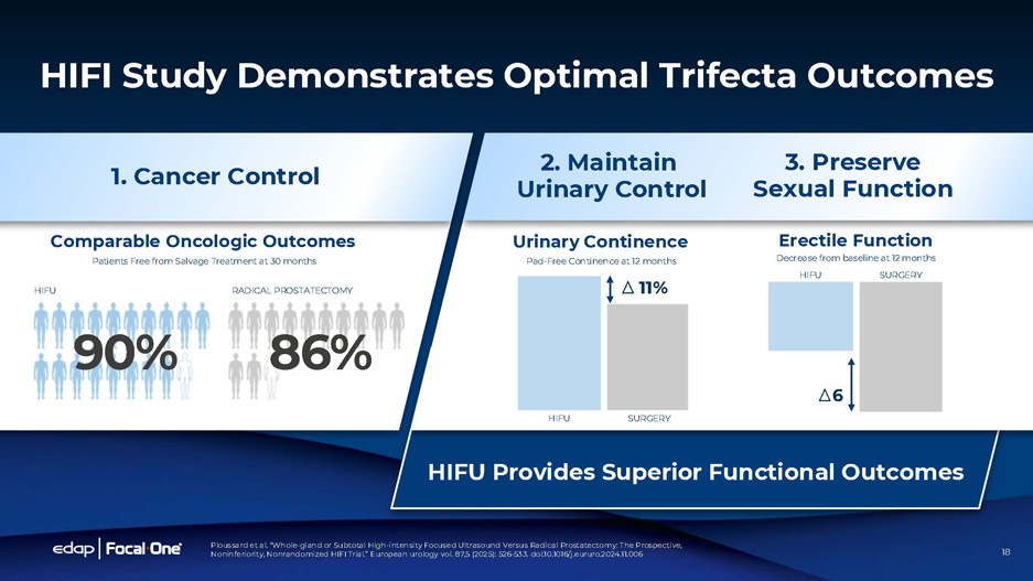 17 HIFI - Prospective Multicentric Comparative Study Focal One HIFU vs Radical Prostatectomy Prospective, Comparative, Multicentric , non - inferiority clinical trial comparing HIFU to Radical Prostatectomy (RP) 3,328 patients treated (1,967 HIFU - 1,361 RP) across 46 centers 90% of HIFU patients treated with Focal One Comparable Cancer Control (Primary Endpoint): 90% STFS for HIFU vs 86% for RP; p = 0.008 Superior functional outcomes for HIFU (Secondary Endpoint): • Urinary Continence significantly better after HIFU • Significantly lower stress incontinence after HIFU • Erectile Function less impaired Published in European Urology – December 2024 Ploussard et al. “Whole - gland or Subtotal High - intensity Focused Ultrasound Versus Radical Prostatectomy: The Prospective, Noninferiority, Nonrandomized HIFI Trial.” European urology vol. 87,5 (2025): 526 - 533. doi:10.1016/j.eururo.2 024.11.006