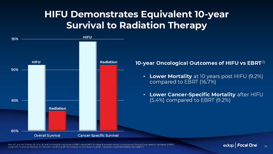 20 HIFU Demonstrates Equivalent 10 - year Survival to Radiation Therapy 10 - year Oncological Outcomes of HIFU vs EBRT (1) • Lower Mortality at 10 years post HIFU (9.2%) compared to EBRT (16.7%) • Lower Cancer - Specific Mortality after HIFU (5.4%) compared to EBRT (9.2%) Yeh, HT., Liu, YY., Chang, Y.L. et al. 10 - year oncological outcomes of EBRT versus HIFU for stage II prostate cancer: a multicenter Chang G ung research database (CGRD) study with inverse - probability - of - treatment weighting (IPTW) analysis. Int Urol Nephrol (2025 ). https://doi.org/10.1007/s112 55 - 025 - 04805 - 7 Radiation HIFU HIFU Radiation