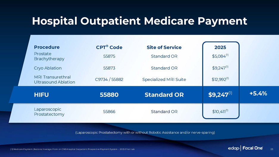 23 Hospital Outpatient Medicare Payment (Laparoscopic Prostatectomy with or without Robotic Assistance and/or nerve - sparing) ( 1) Medicare Payment (National Average. From on CMS Hospital Outpatient Prospective Payment System – 2025 Final rule 2025 Site of Service CPT ® Code Procedure $5,084 (1) Standard OR 55875 Prostate Brachytherapy $9,247 (1) Standard OR 55873 Cryo Ablation $12,992 (1) Specialized MRI Suite C9734 / 55882 MRI Transurethral Ultrasound Ablation $9,247 (1) Standard OR 55880 HIFU $10,411 (1) Standard OR 55866 Laparoscopic Prostatectomy +5.4%